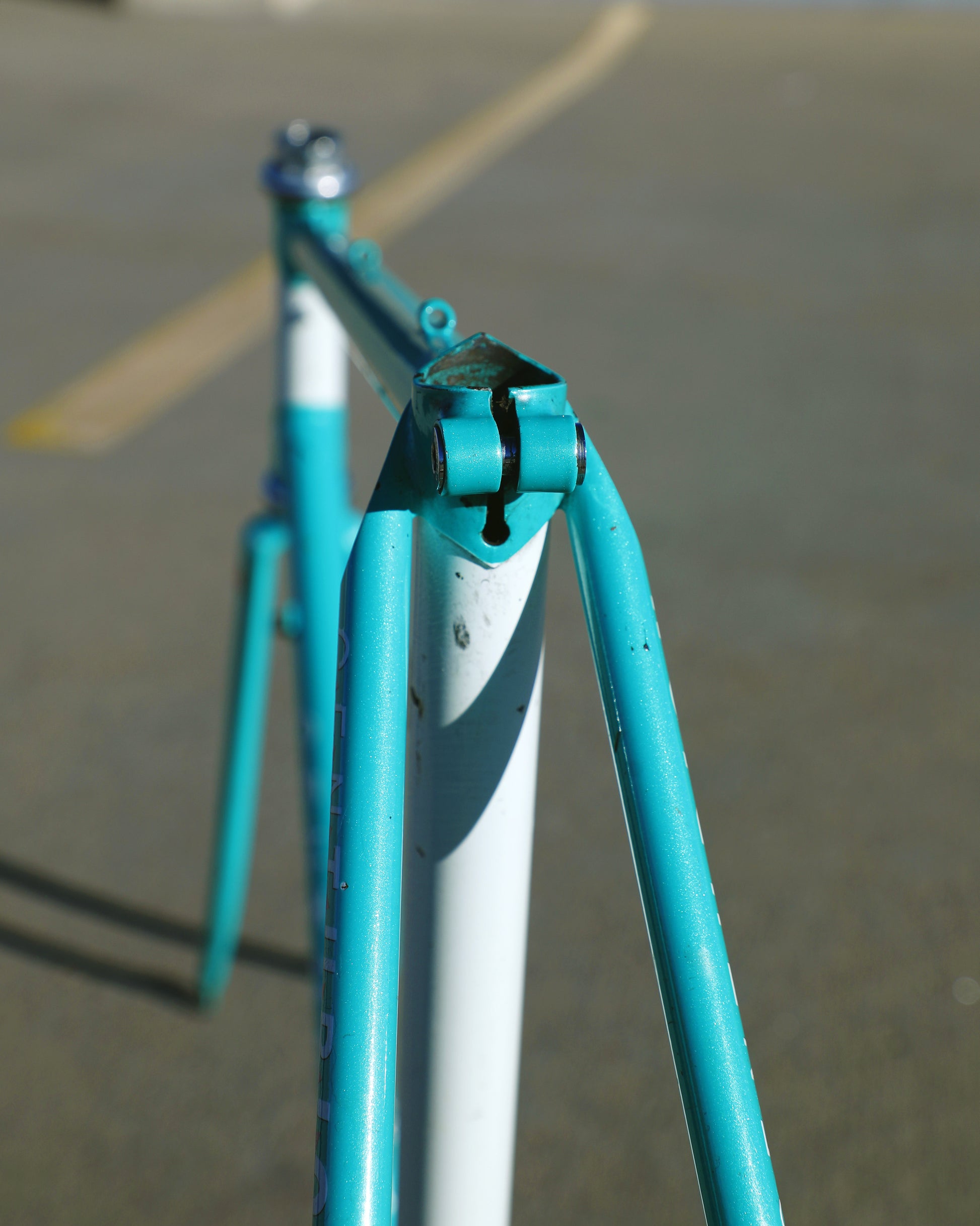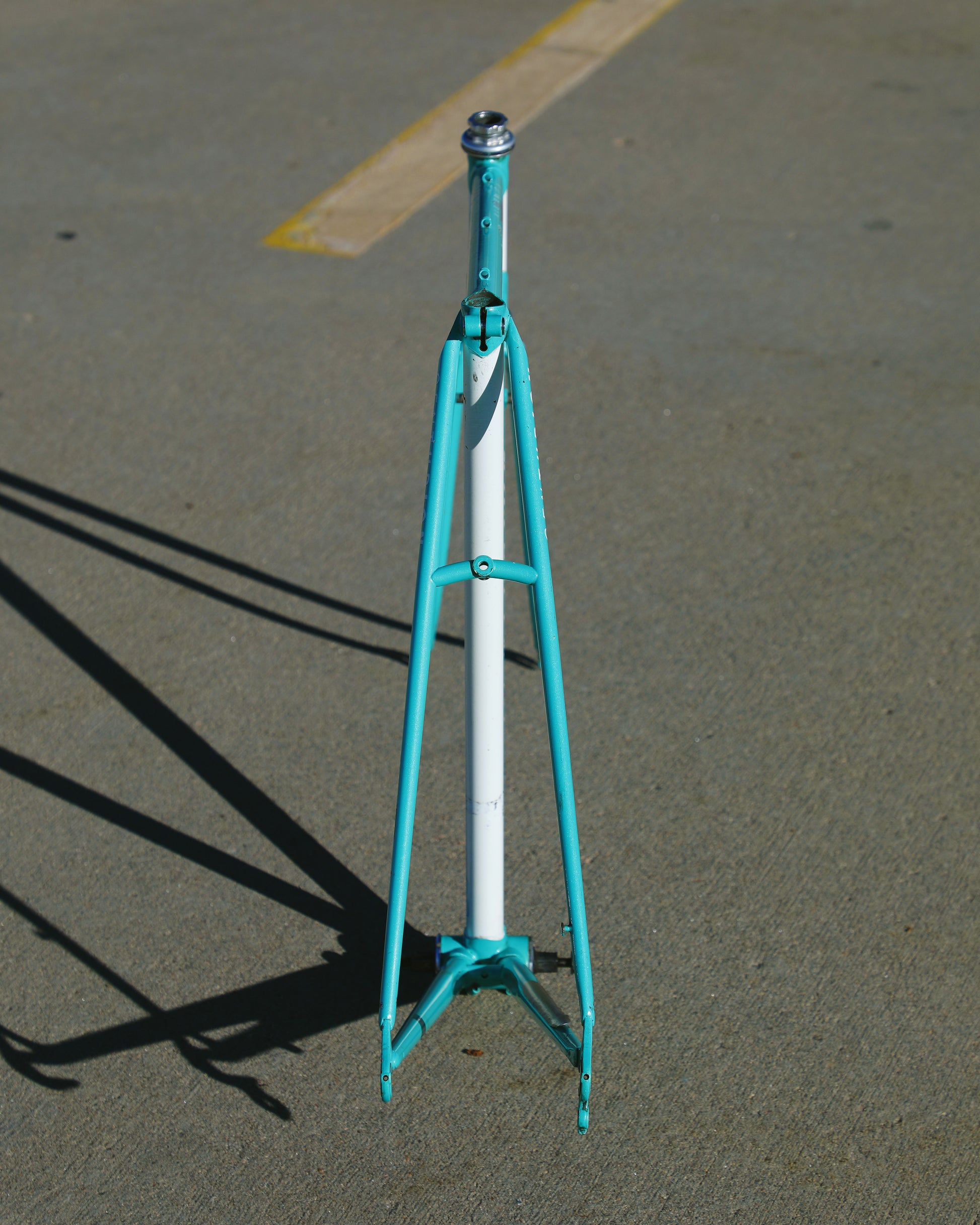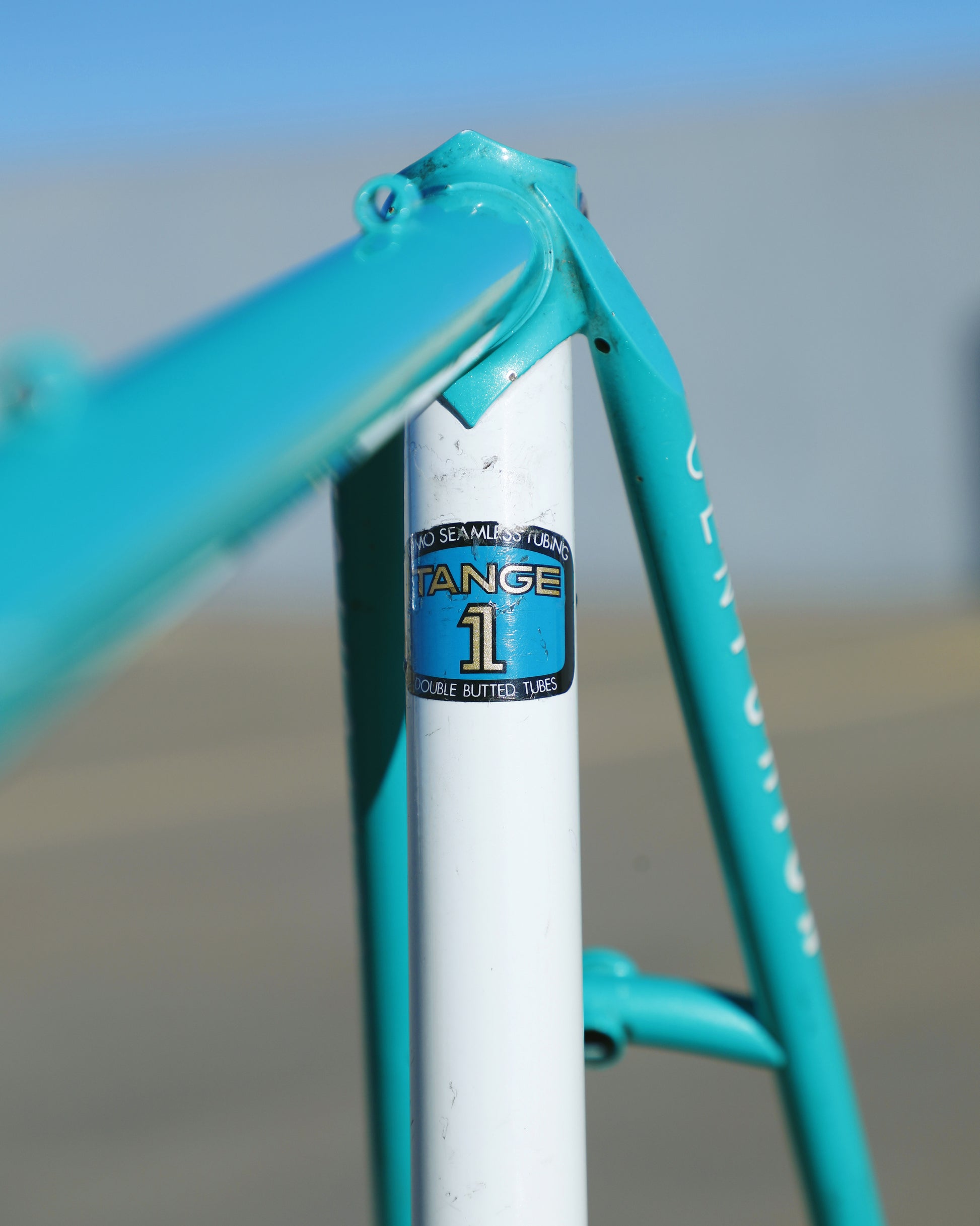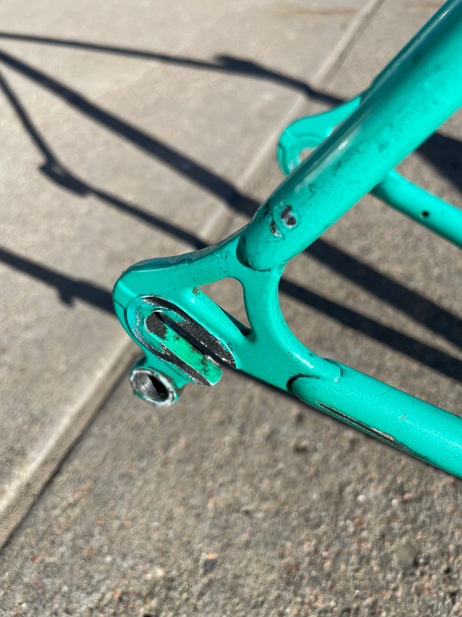 This centurion frame is in good condition but shows sign of use. There is a large scrape on the top tube (drive side). Someone also ingraved there name into the paint on the bottom of he down tube. Some other paint chips here and there but no dents, bends, or cracks. Bottom bracket and headset included (have not been serviced). It's a great looking frame made with renowned Tange 1 tubing.