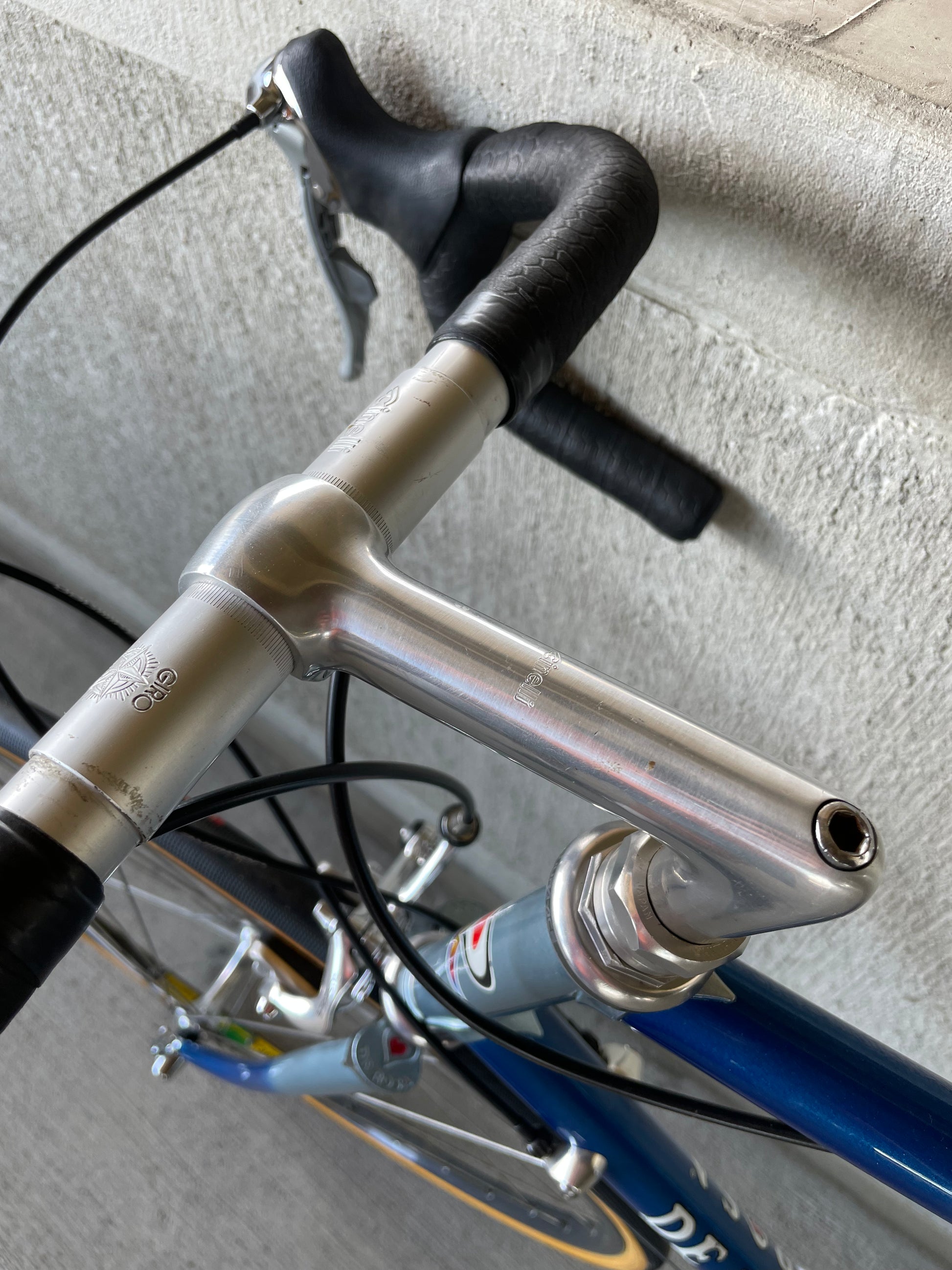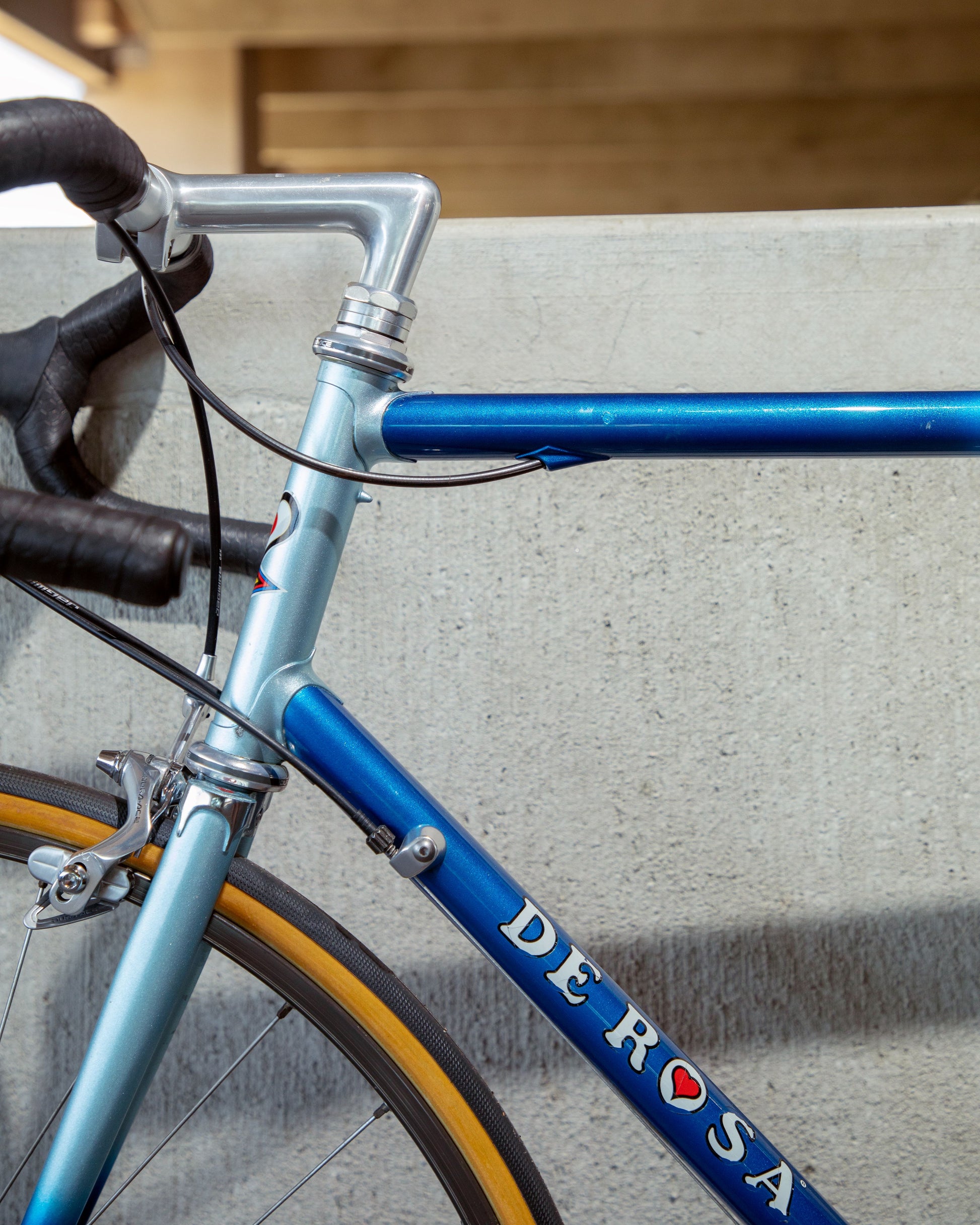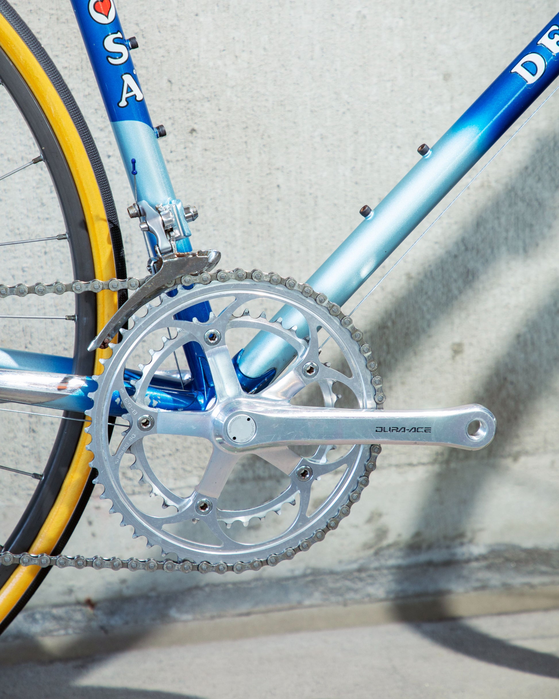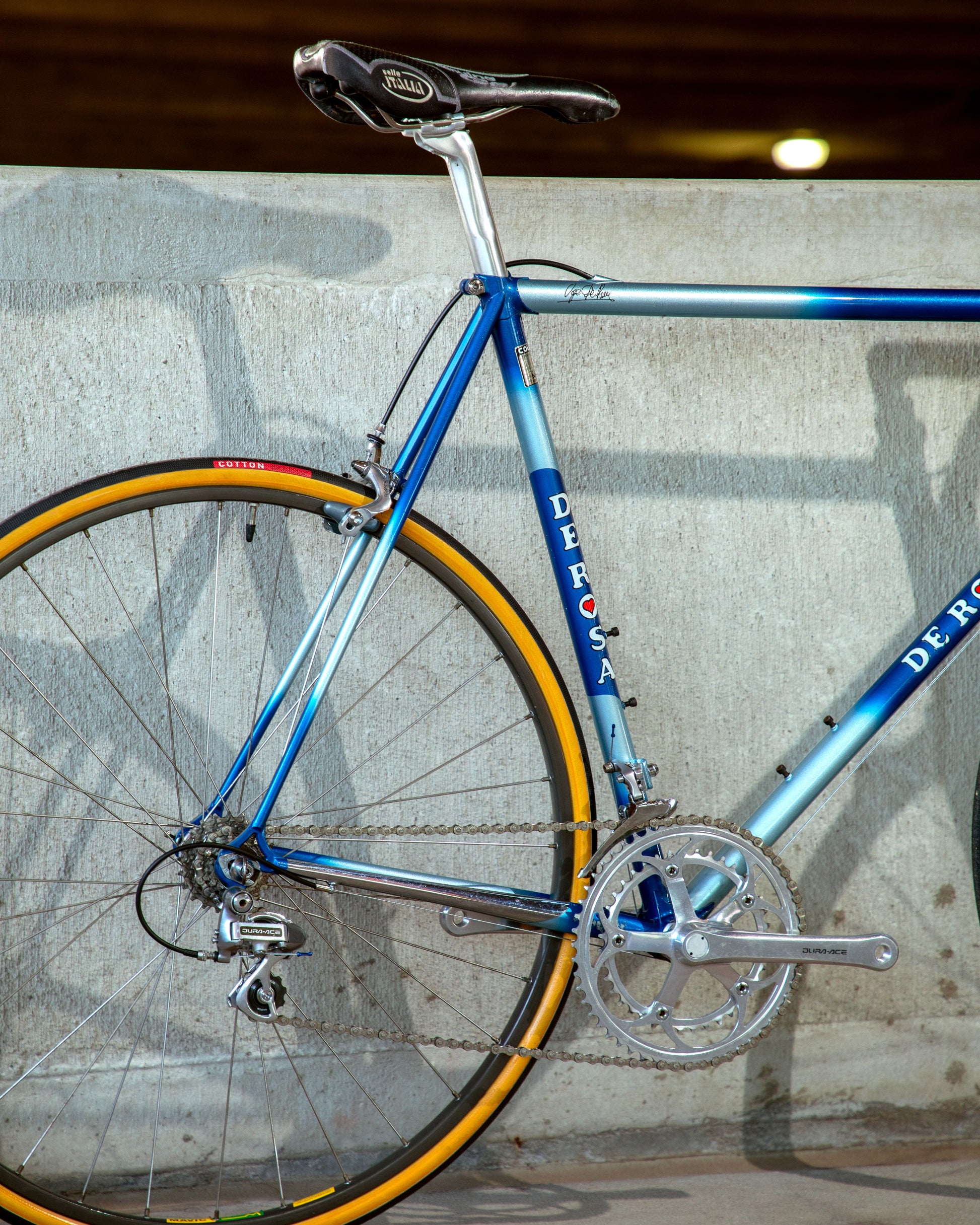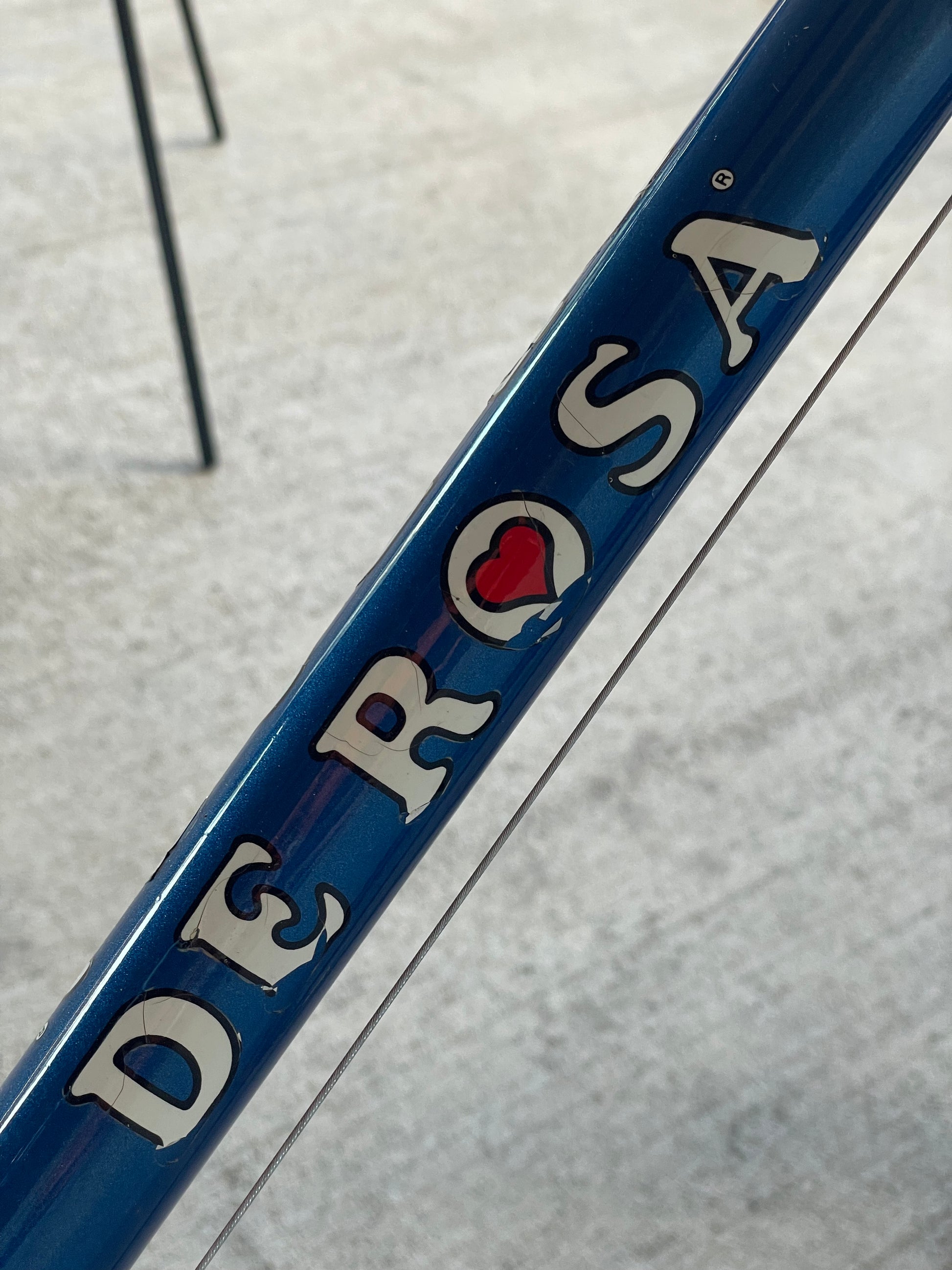 This early 1990's De Rosa Giro D'Italia is stunning! It comes equipped with a complete Shimano Dura-Ace 7400 group with a Cinelli bar and stem that feels snappy and precise. Brand new Specialized Turbo Cotton tires have been installed along with new bar tape and cables/housing. It's in overall great condition but shows sign of use. It has some paint chips but no dents or cracks. When I got the bike, the fork dropouts were pretty badly bent but they were re-aligned. You can see in the upper part of the fork that the paint splintered from whatever bent the dropouts (I assume). It's a great riding bike that is bound to turn heads!