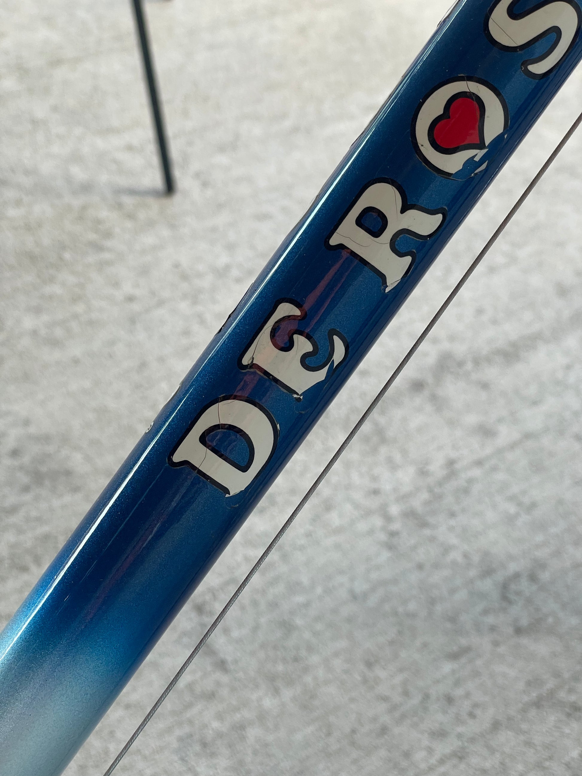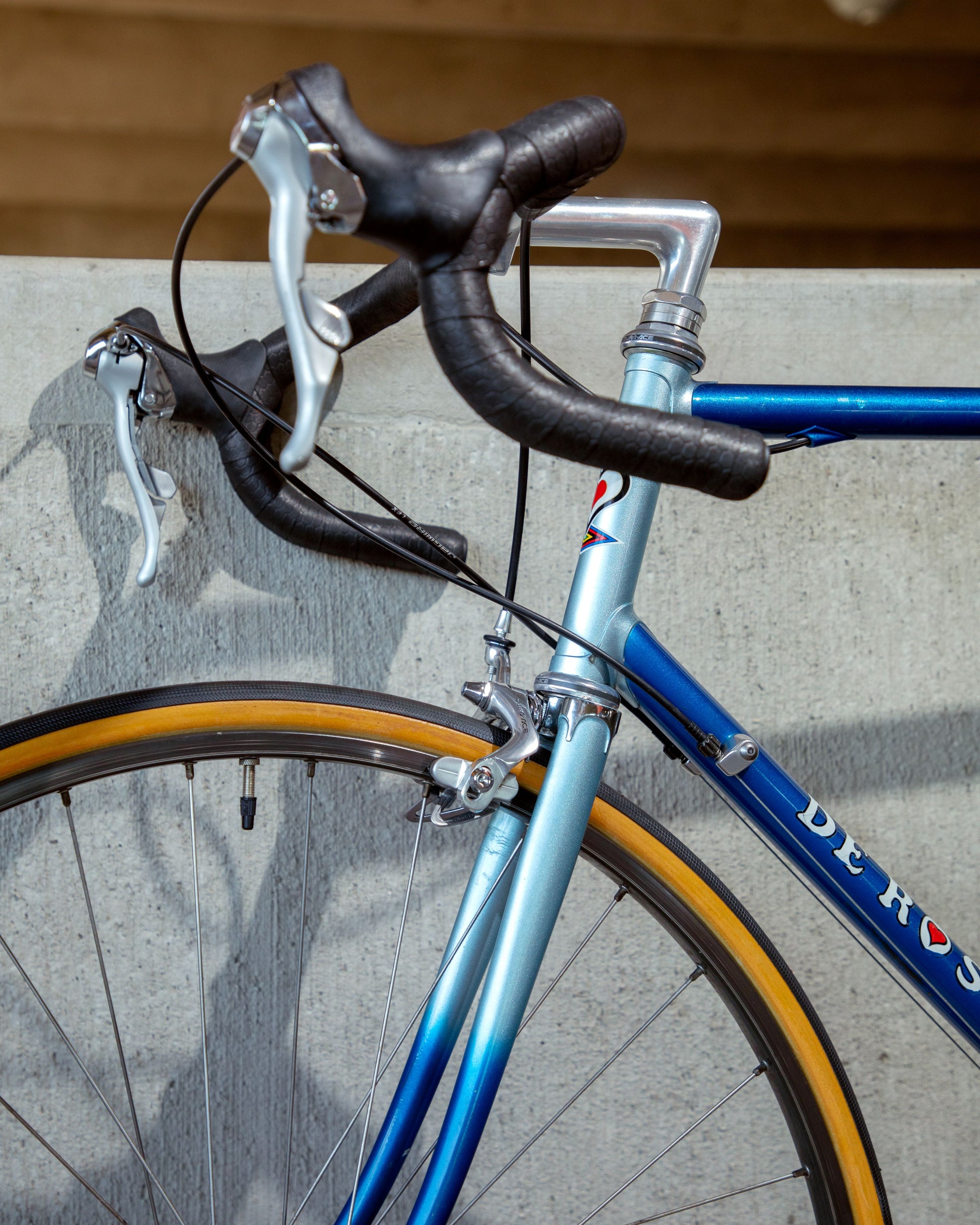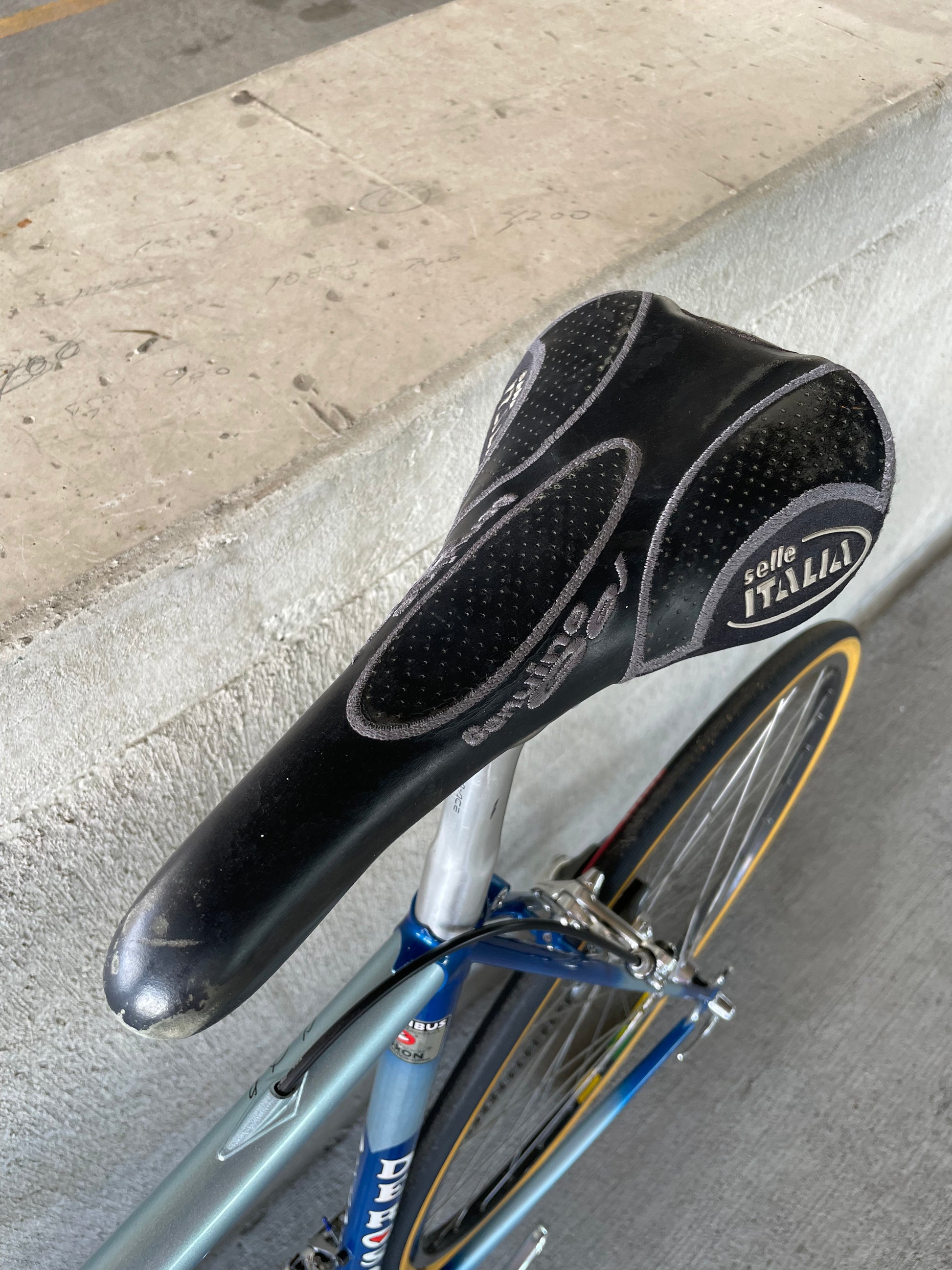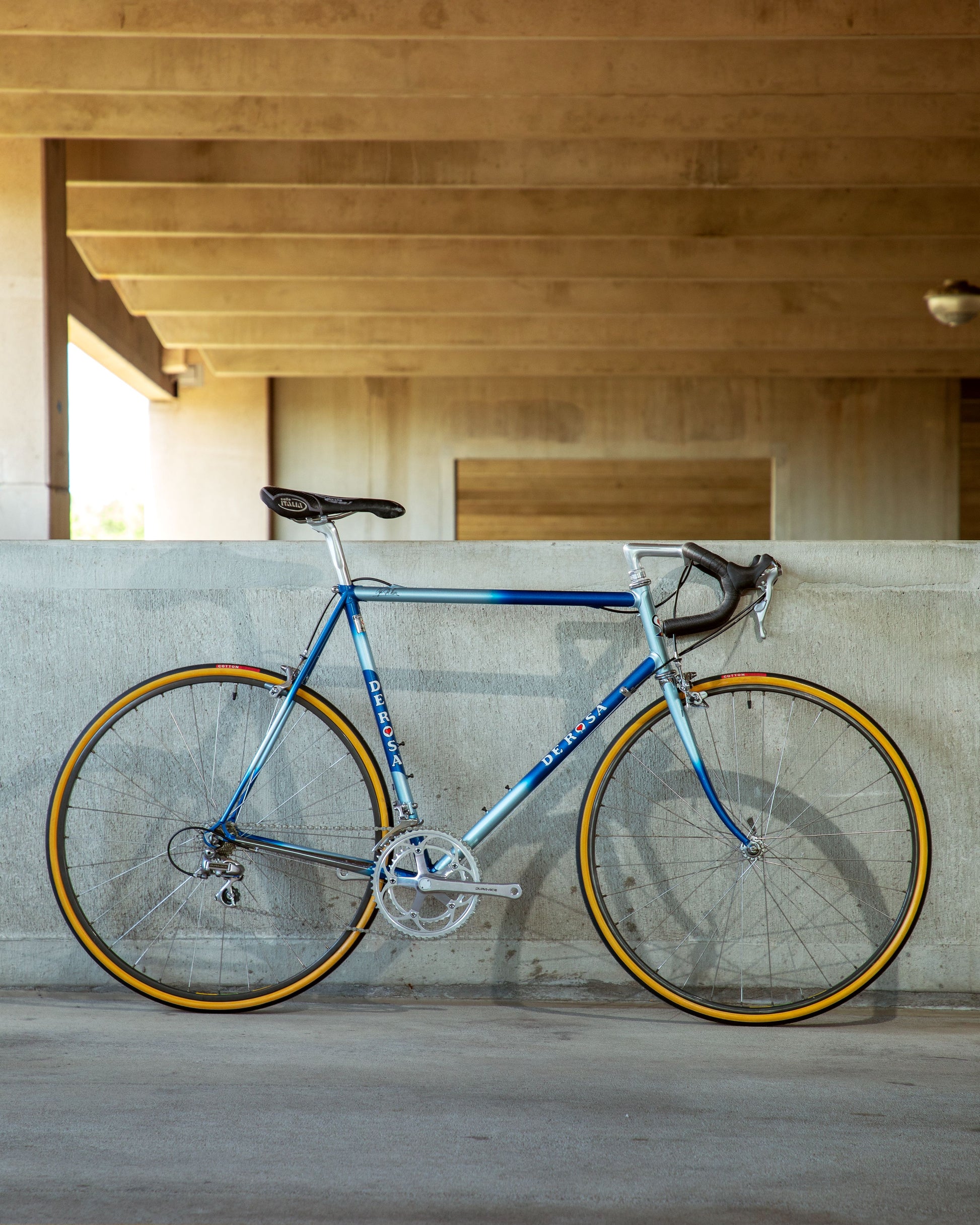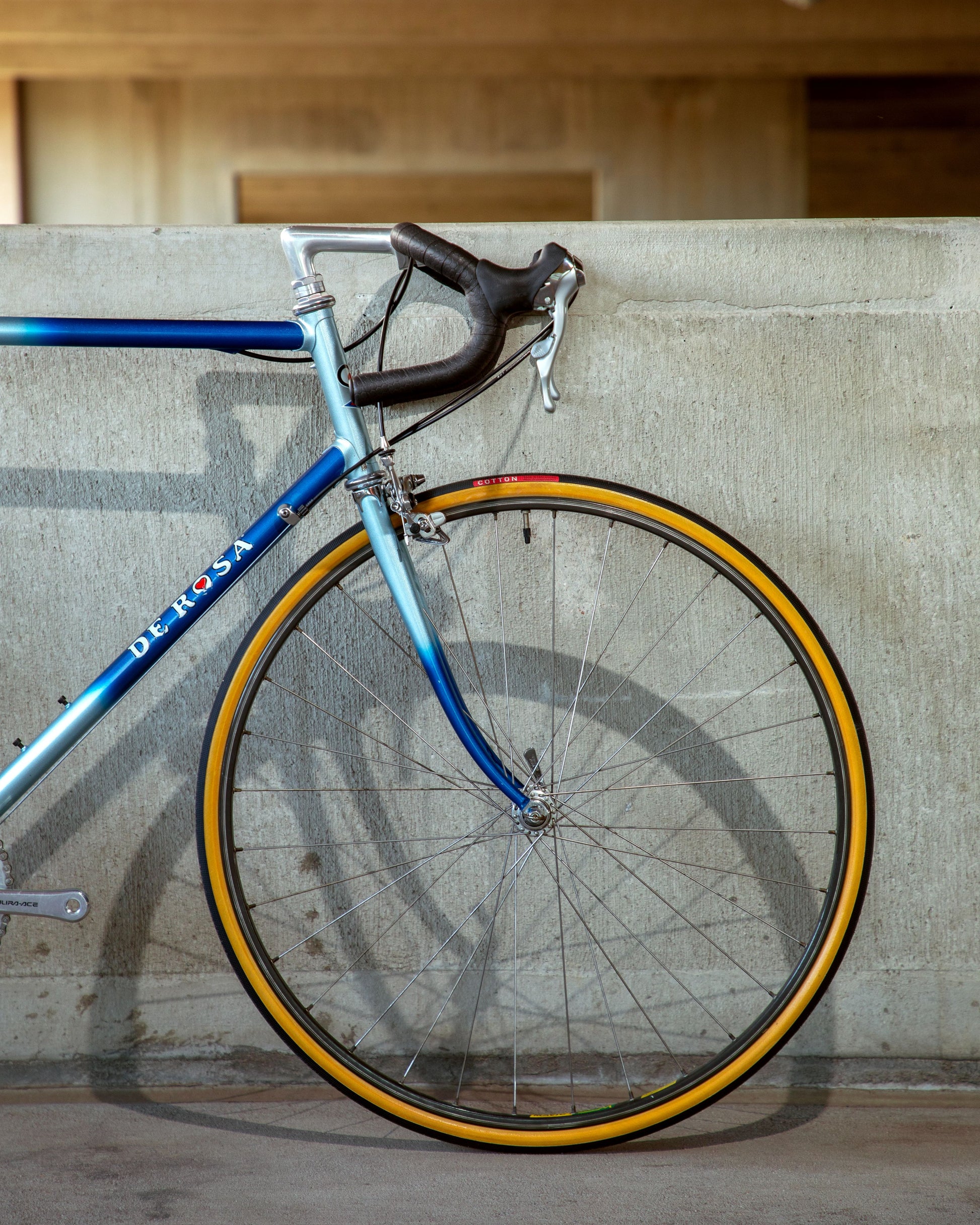This early 1990's De Rosa Giro D'Italia is stunning! It comes equipped with a complete Shimano Dura-Ace 7400 group with a Cinelli bar and stem that feels snappy and precise. Brand new Specialized Turbo Cotton tires have been installed along with new bar tape and cables/housing. It's in overall great condition but shows sign of use. It has some paint chips but no dents or cracks. When I got the bike, the fork dropouts were pretty badly bent but they were re-aligned. You can see in the upper part of the fork that the paint splintered from whatever bent the dropouts (I assume). It's a great riding bike that is bound to turn heads!