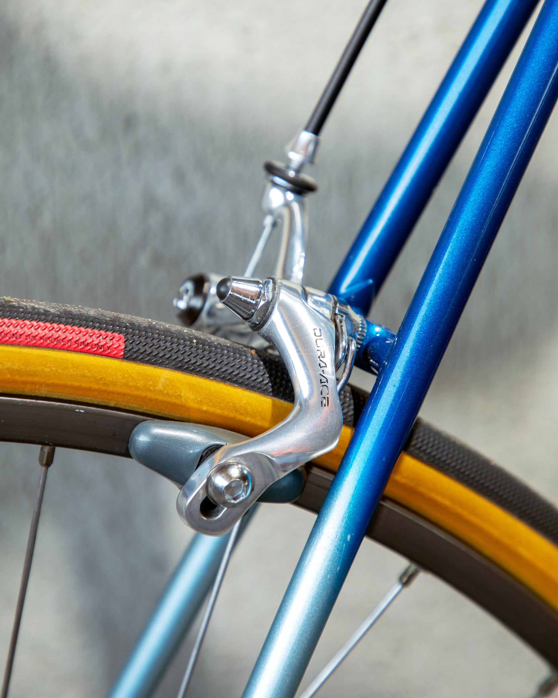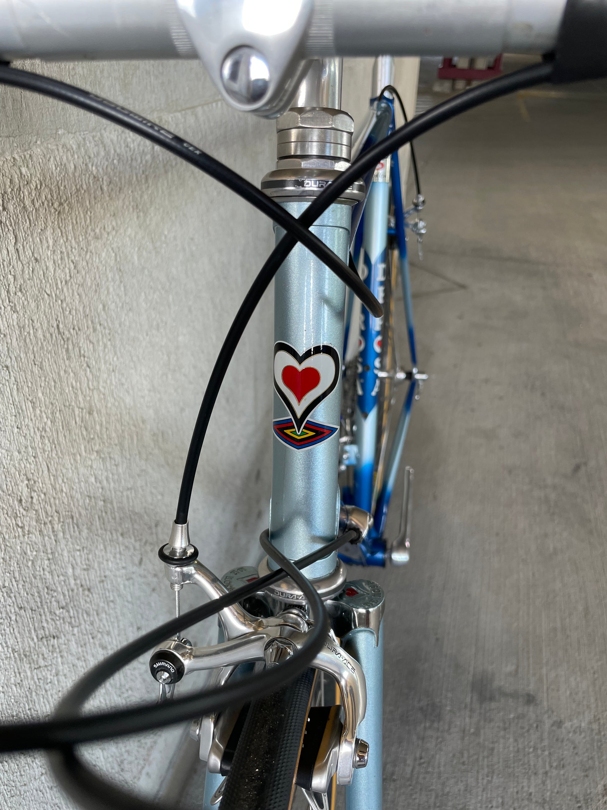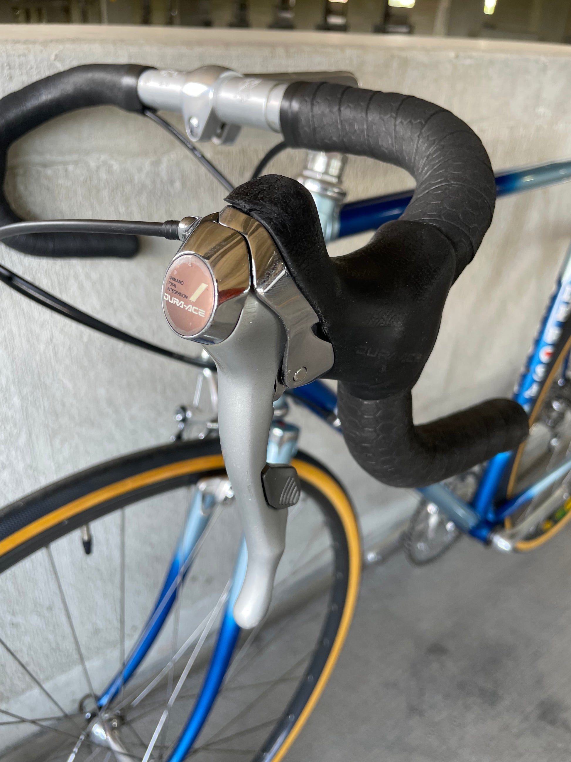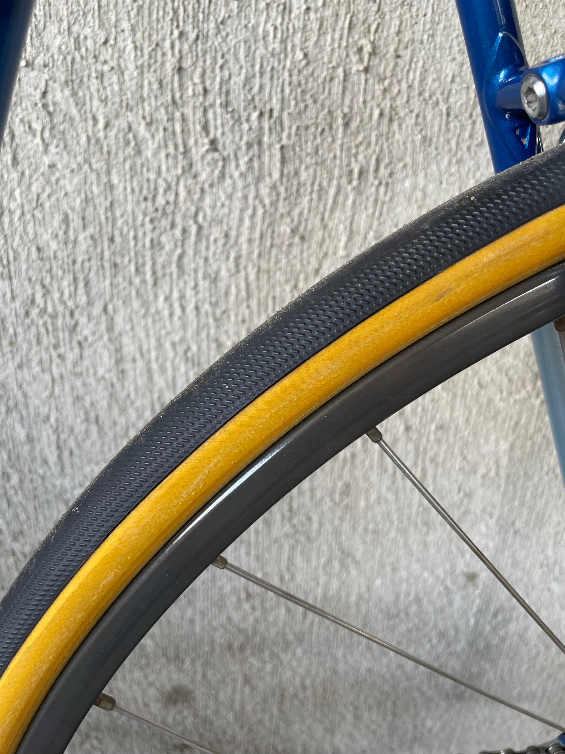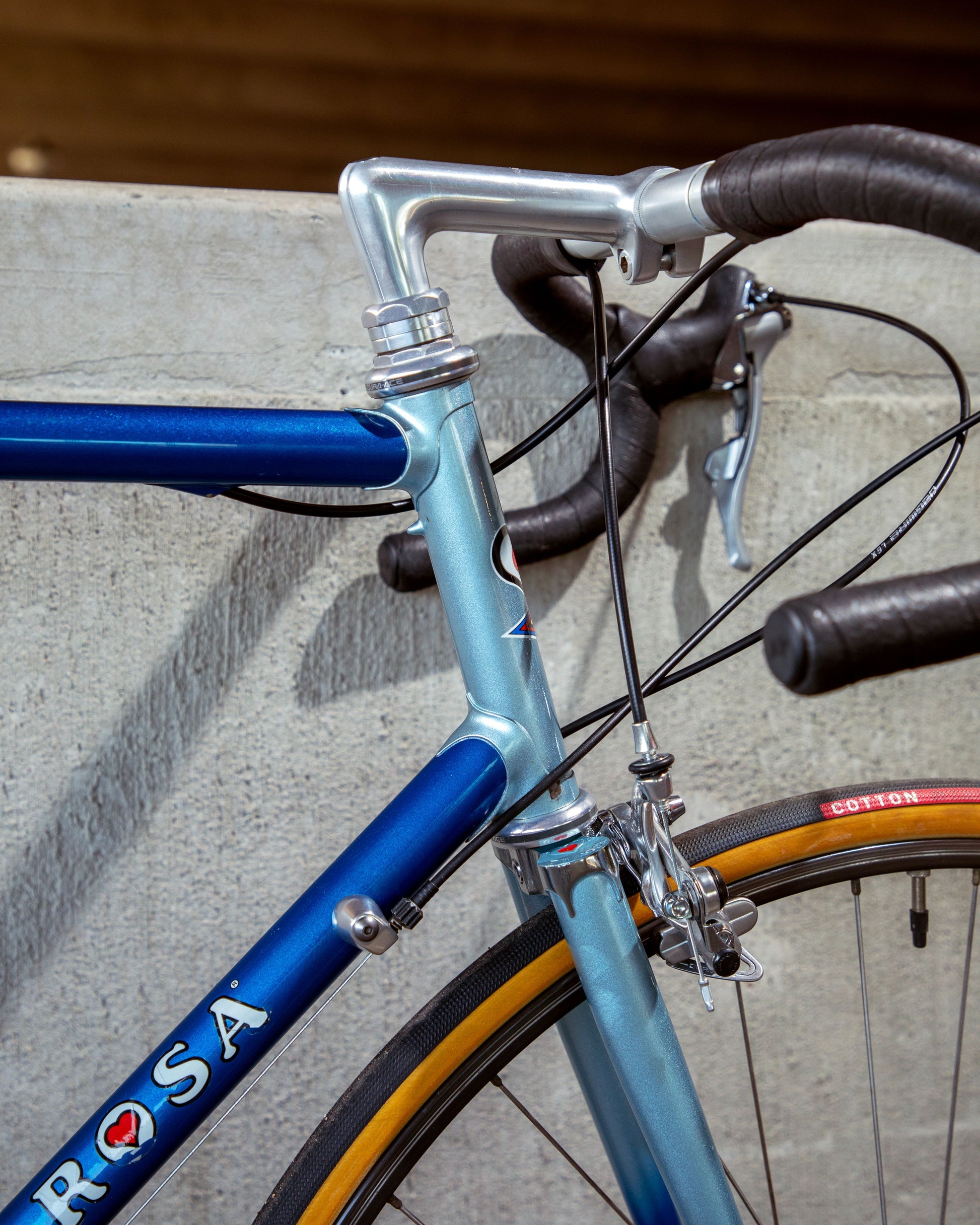 This early 1990's De Rosa Giro D'Italia is stunning! It comes equipped with a complete Shimano Dura-Ace 7400 group with a Cinelli bar and stem that feels snappy and precise. Brand new Specialized Turbo Cotton tires have been installed along with new bar tape and cables/housing. It's in overall great condition but shows sign of use. It has some paint chips but no dents or cracks. When I got the bike, the fork dropouts were pretty badly bent but they were re-aligned. You can see in the upper part of the fork that the paint splintered from whatever bent the dropouts (I assume). It's a great riding bike that is bound to turn heads!