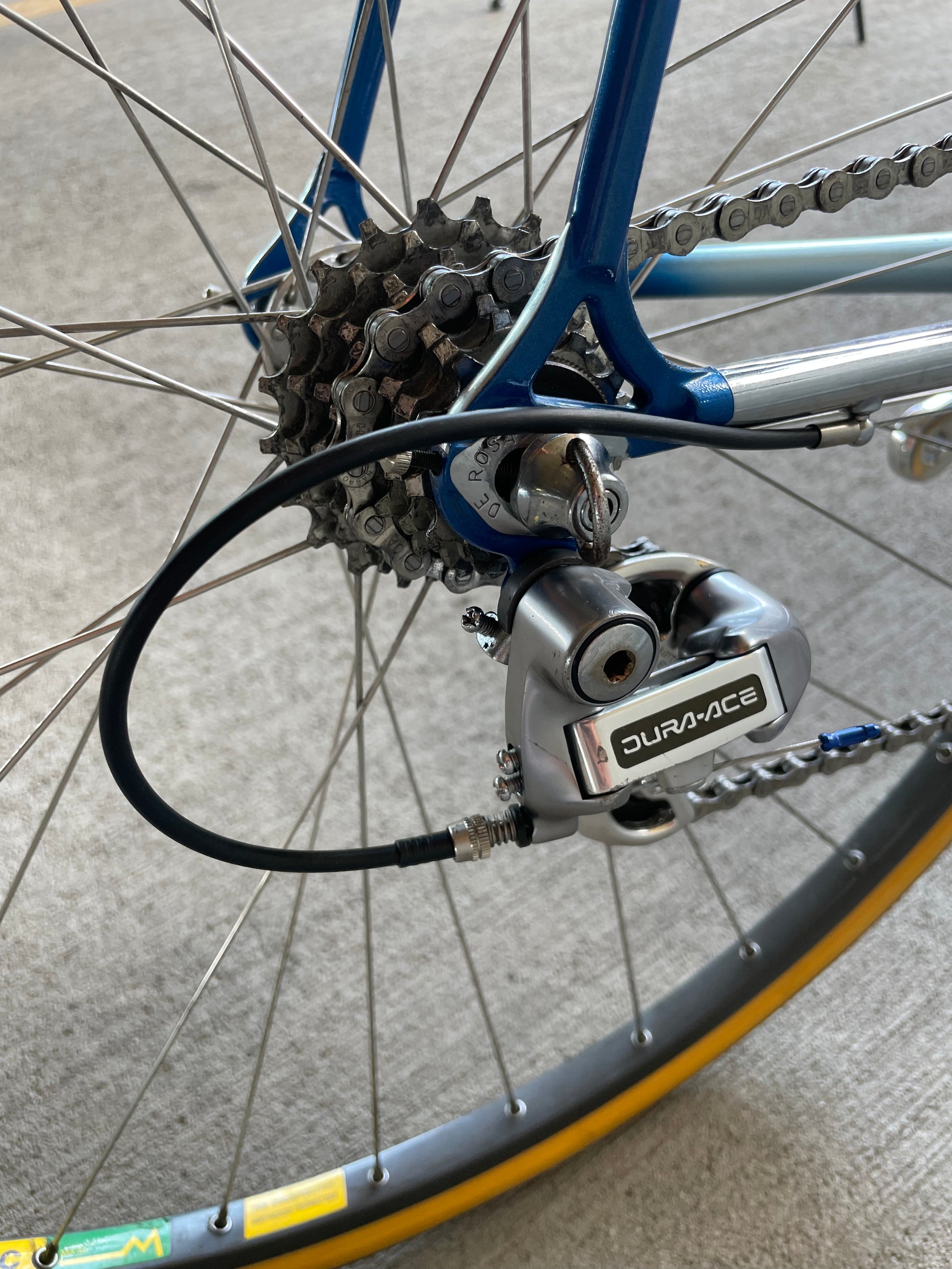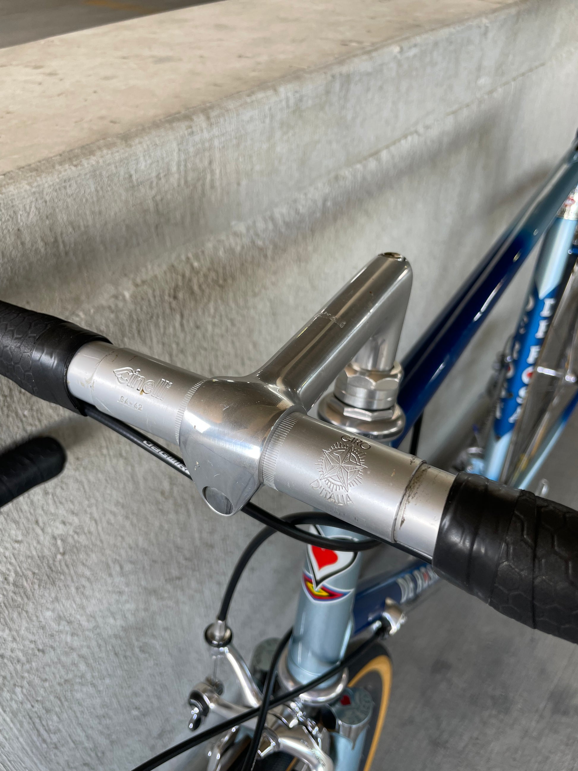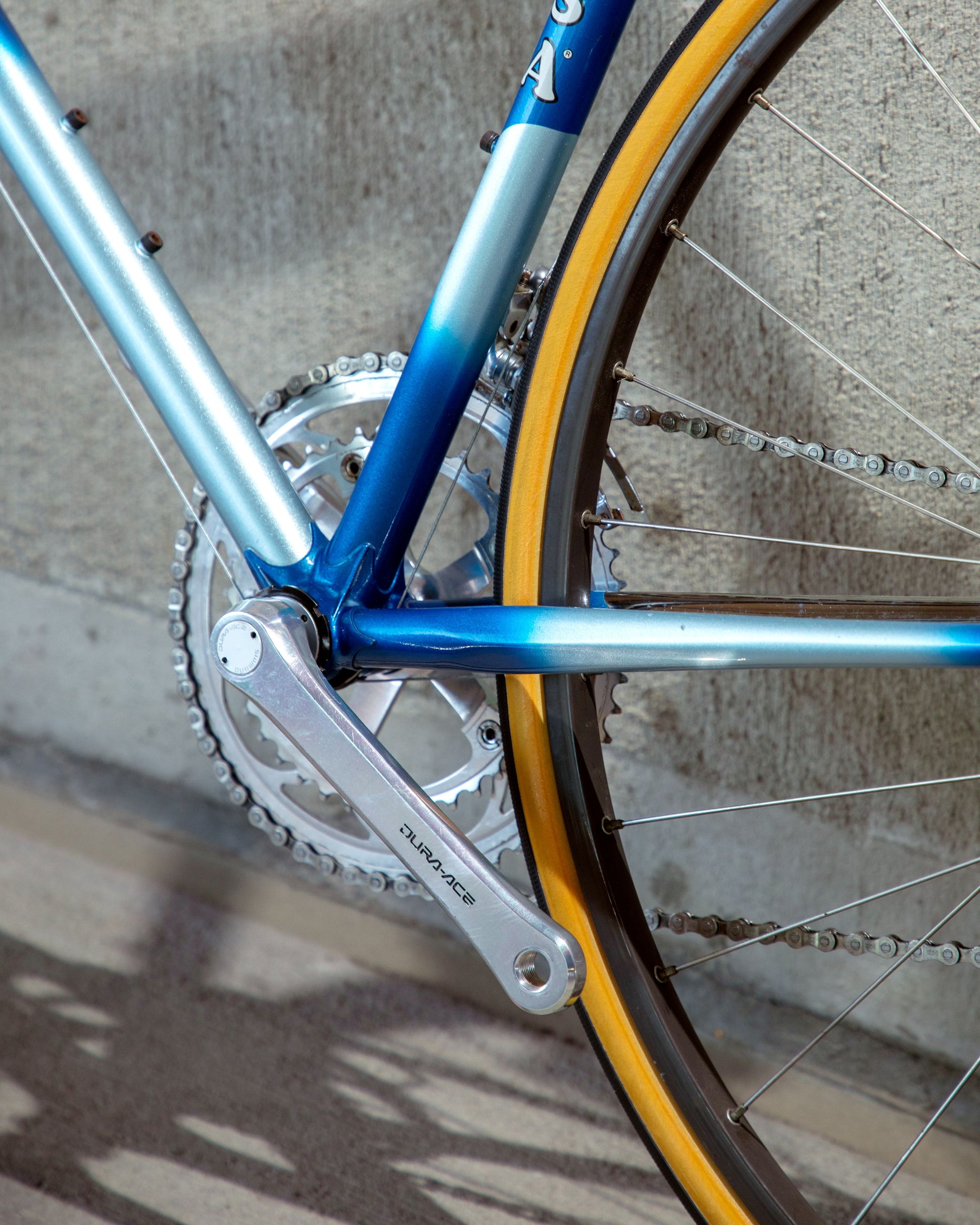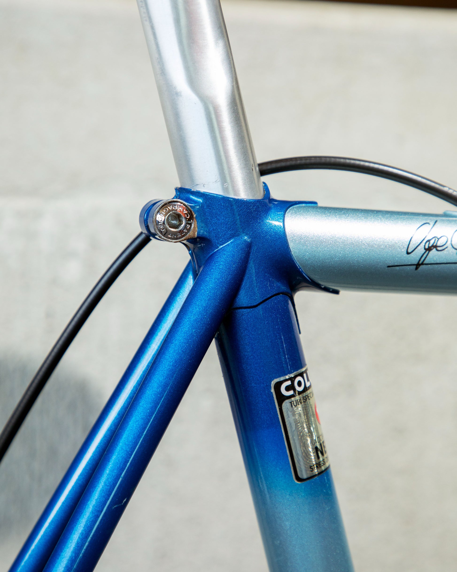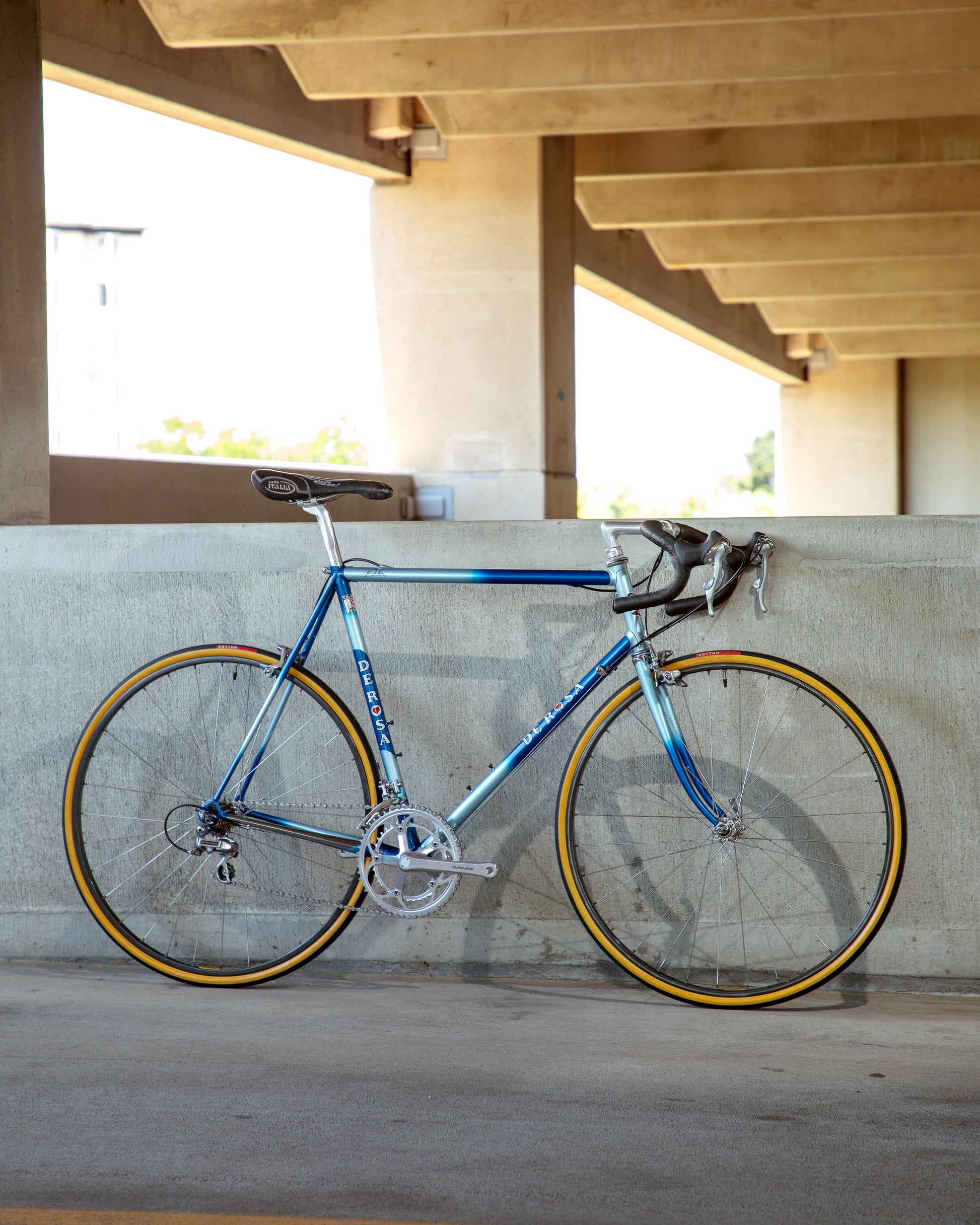 This early 1990's De Rosa Giro D'Italia is stunning! It comes equipped with a complete Shimano Dura-Ace 7400 group with a Cinelli bar and stem that feels snappy and precise. Brand new Specialized Turbo Cotton tires have been installed along with new bar tape and cables/housing. It's in overall great condition but shows sign of use. It has some paint chips but no dents or cracks. When I got the bike, the fork dropouts were pretty badly bent but they were re-aligned. You can see in the upper part of the fork that the paint splintered from whatever bent the dropouts (I assume). It's a great riding bike that is bound to turn heads!