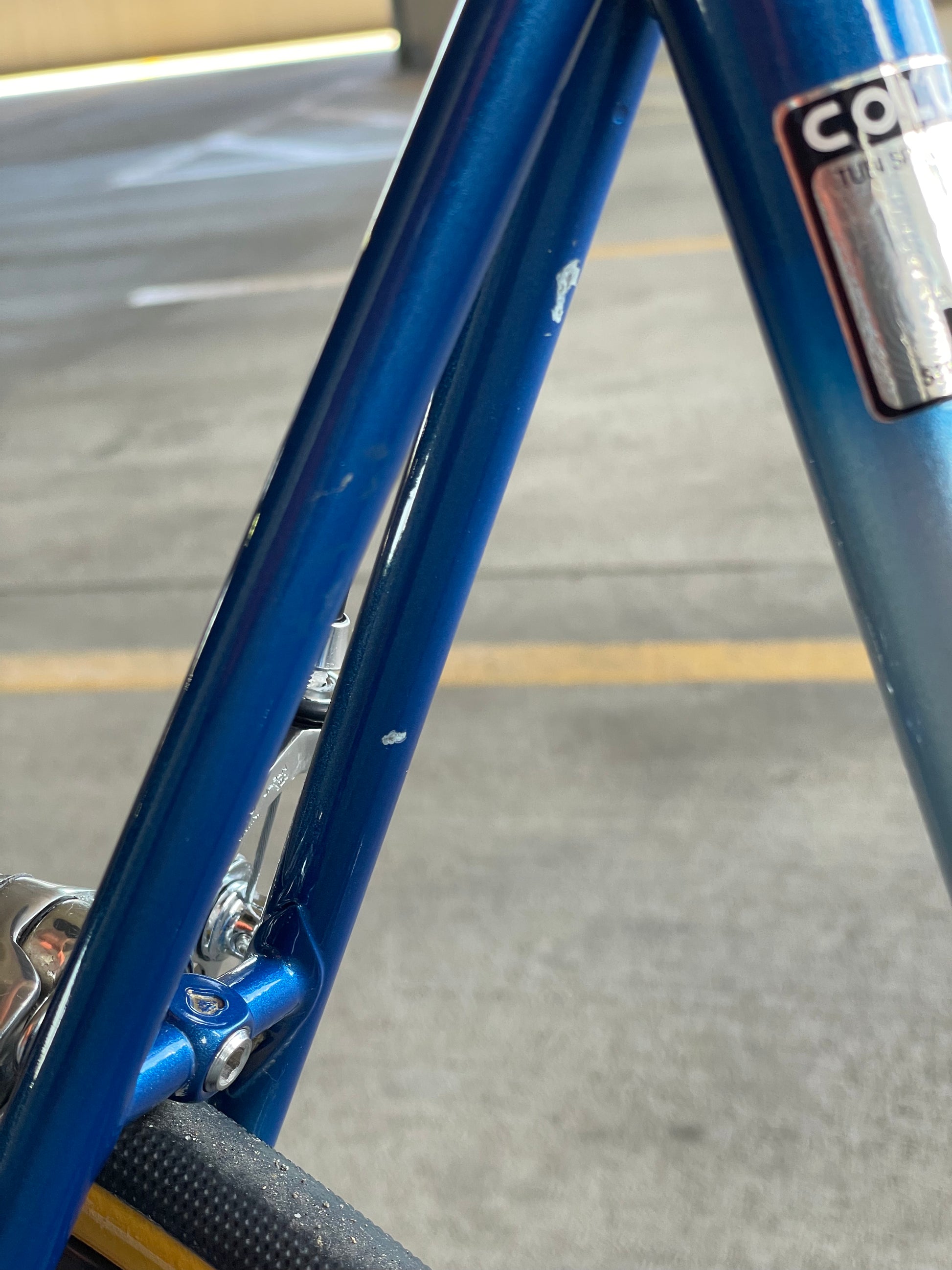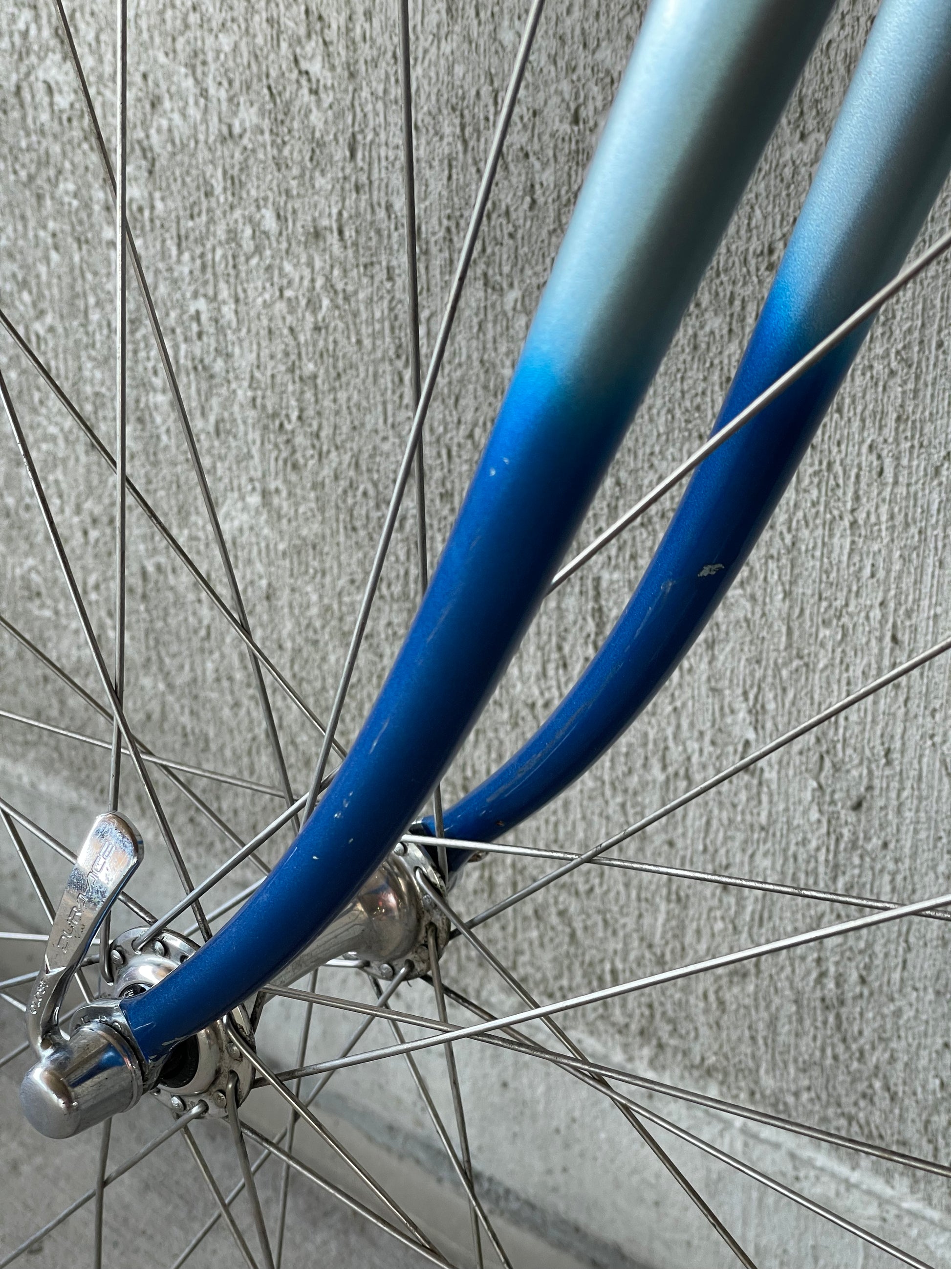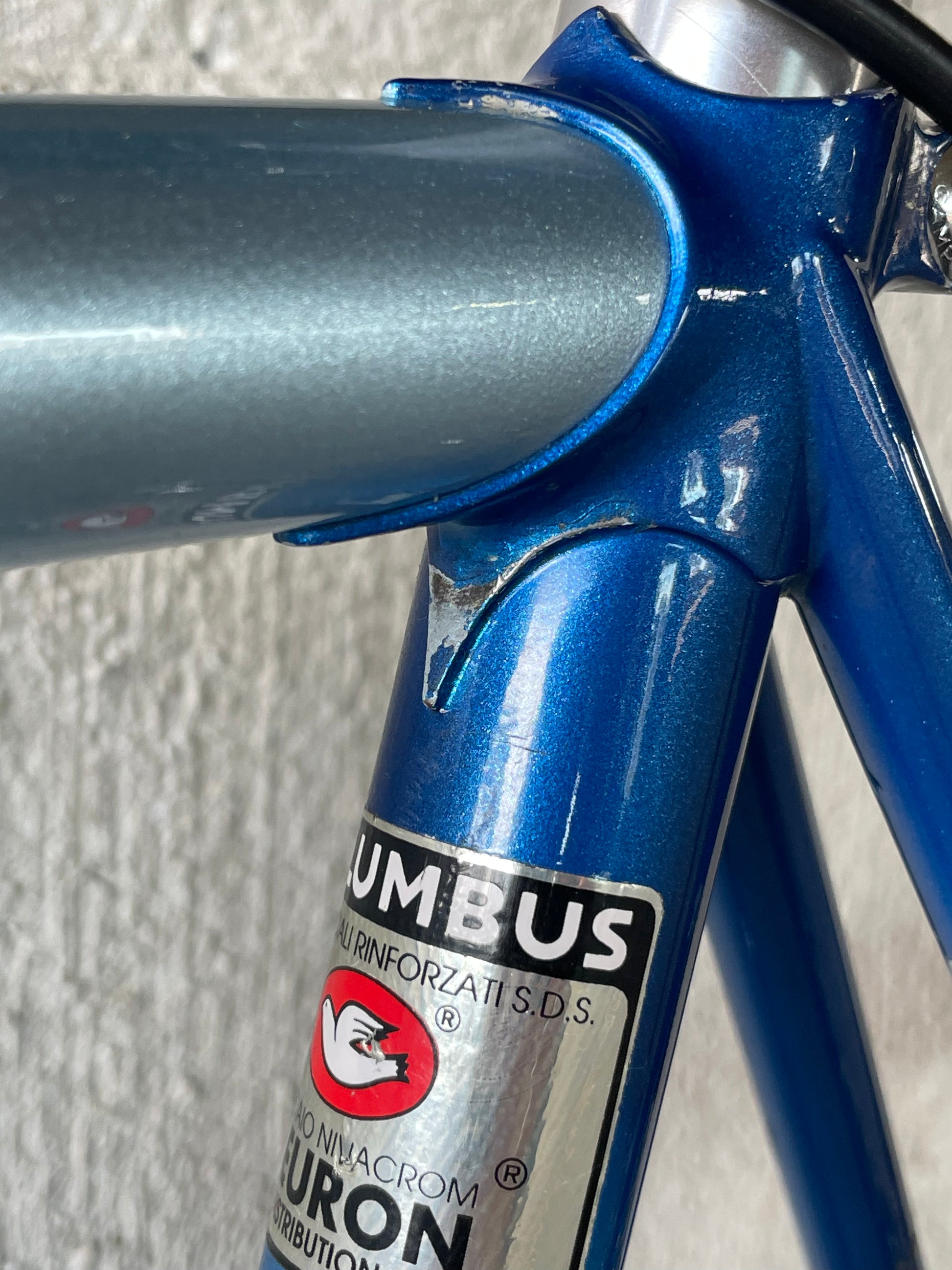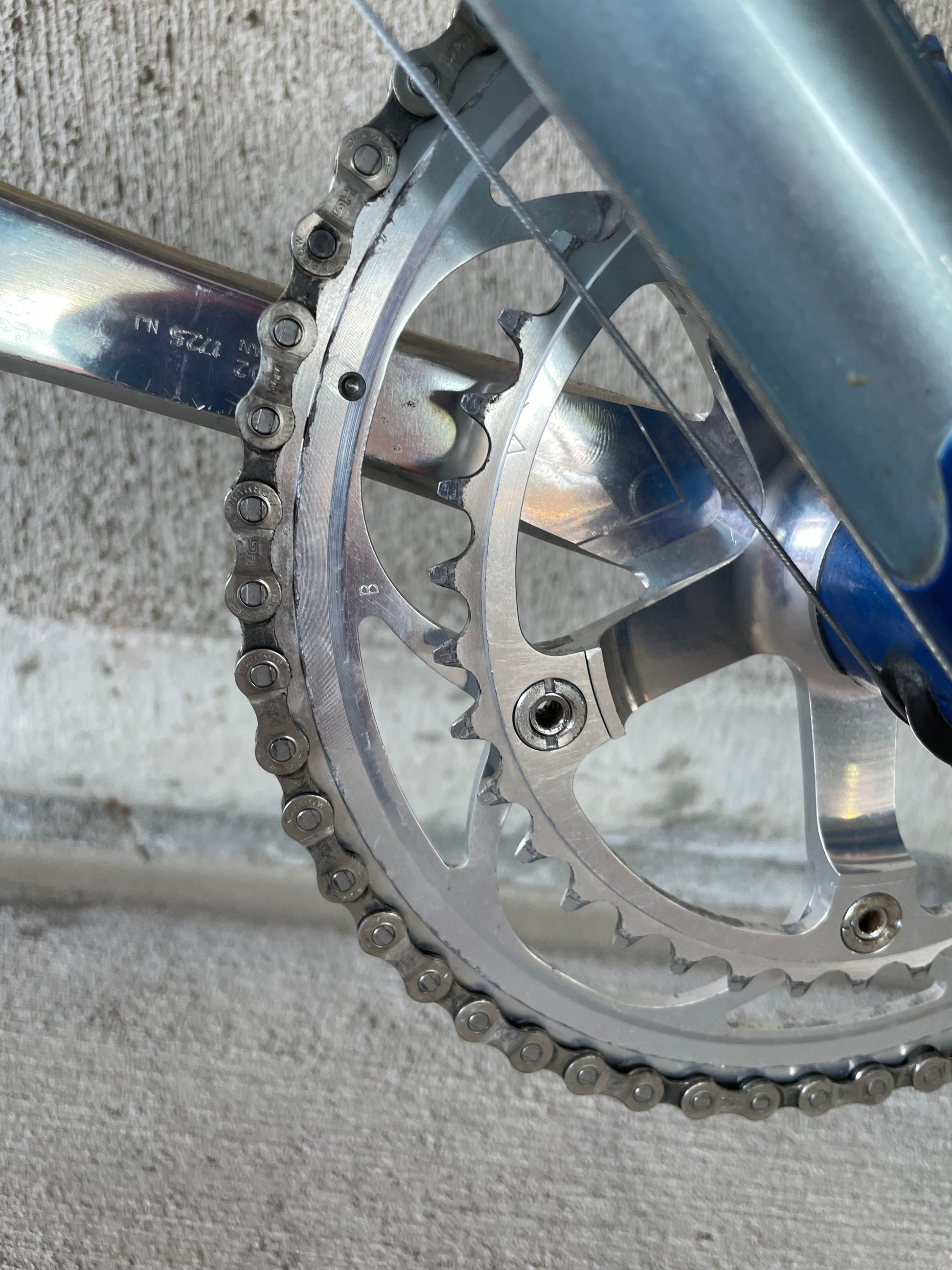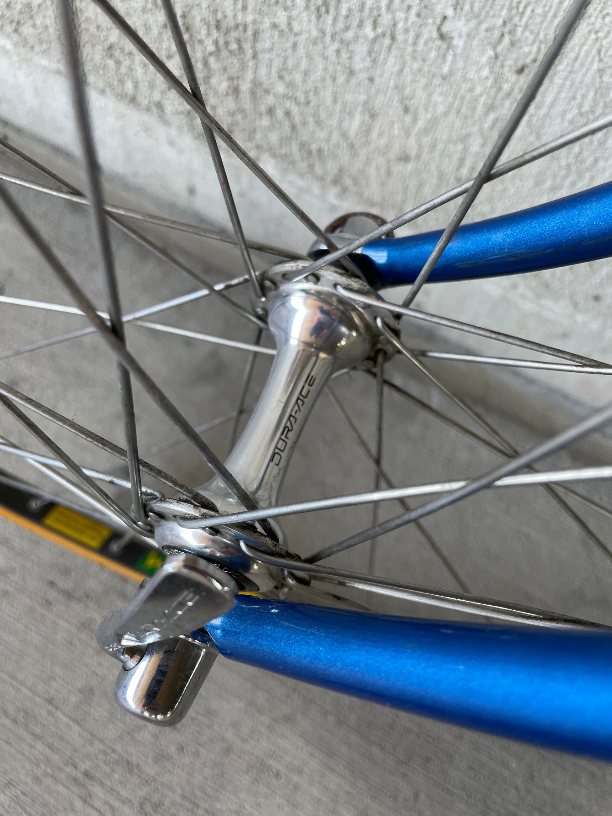 This early 1990's De Rosa Giro D'Italia is stunning! It comes equipped with a complete Shimano Dura-Ace 7400 group with a Cinelli bar and stem that feels snappy and precise. Brand new Specialized Turbo Cotton tires have been installed along with new bar tape and cables/housing. It's in overall great condition but shows sign of use. It has some paint chips but no dents or cracks. When I got the bike, the fork dropouts were pretty badly bent but they were re-aligned. You can see in the upper part of the fork that the paint splintered from whatever bent the dropouts (I assume). It's a great riding bike that is bound to turn heads!