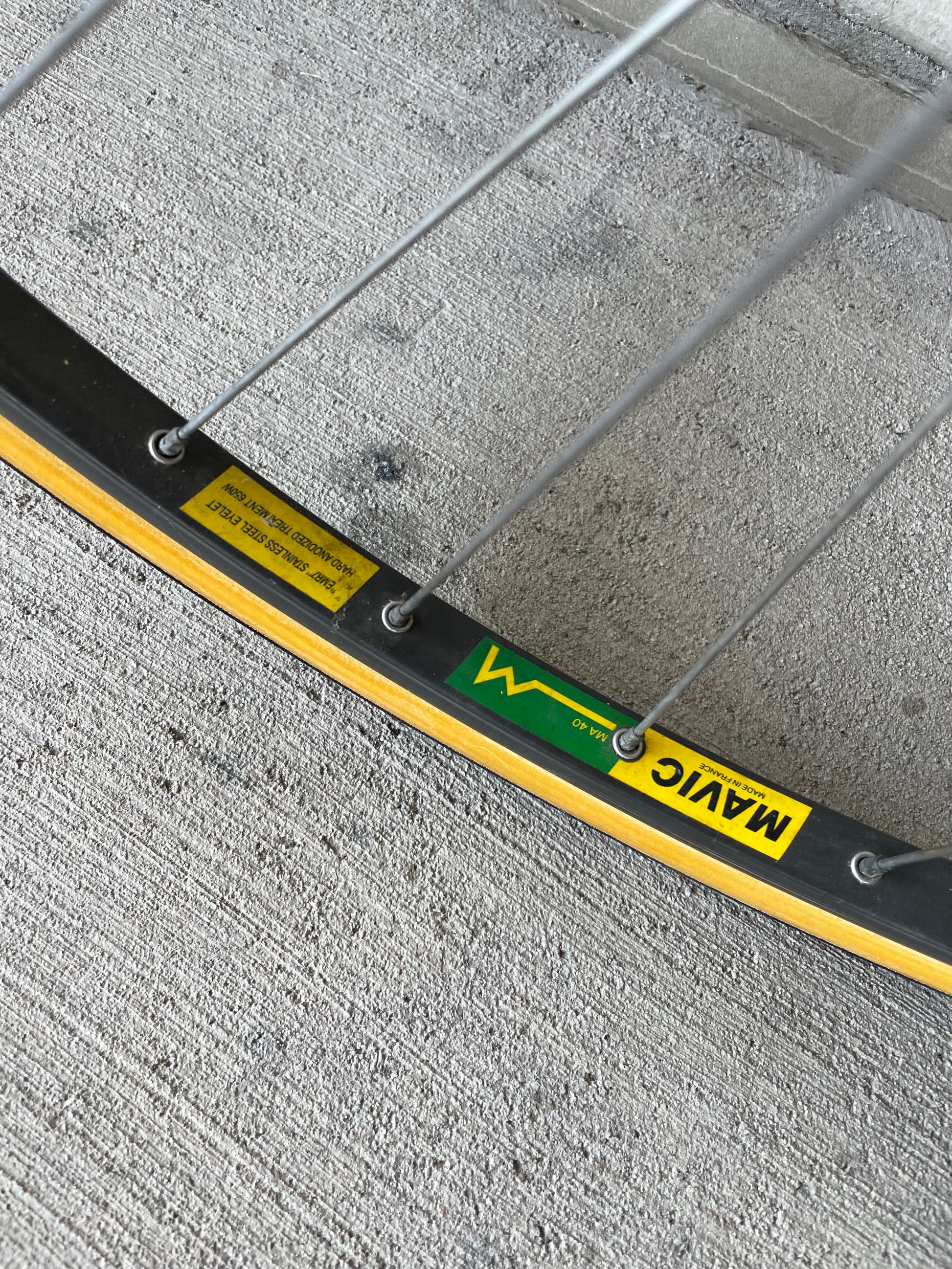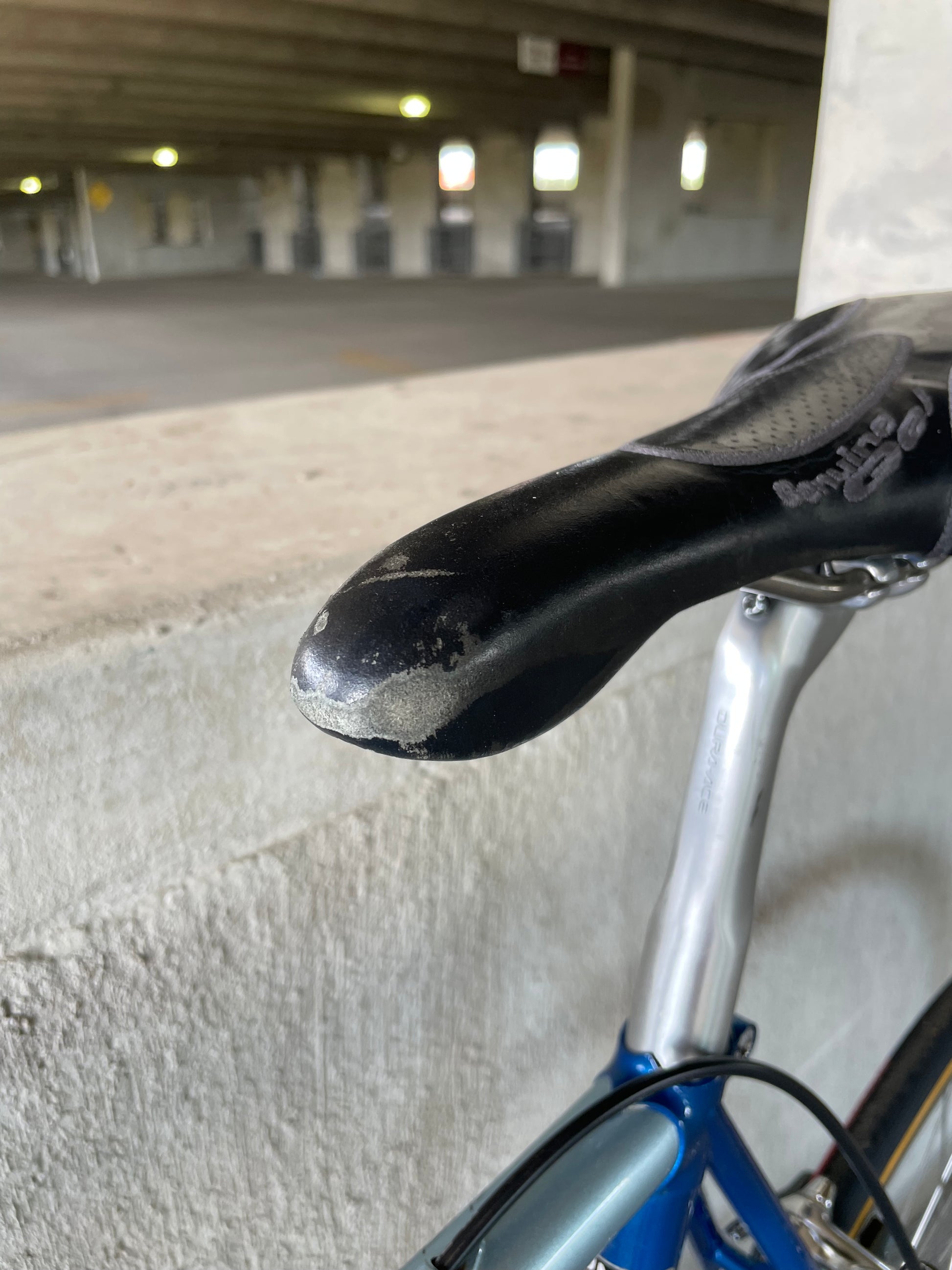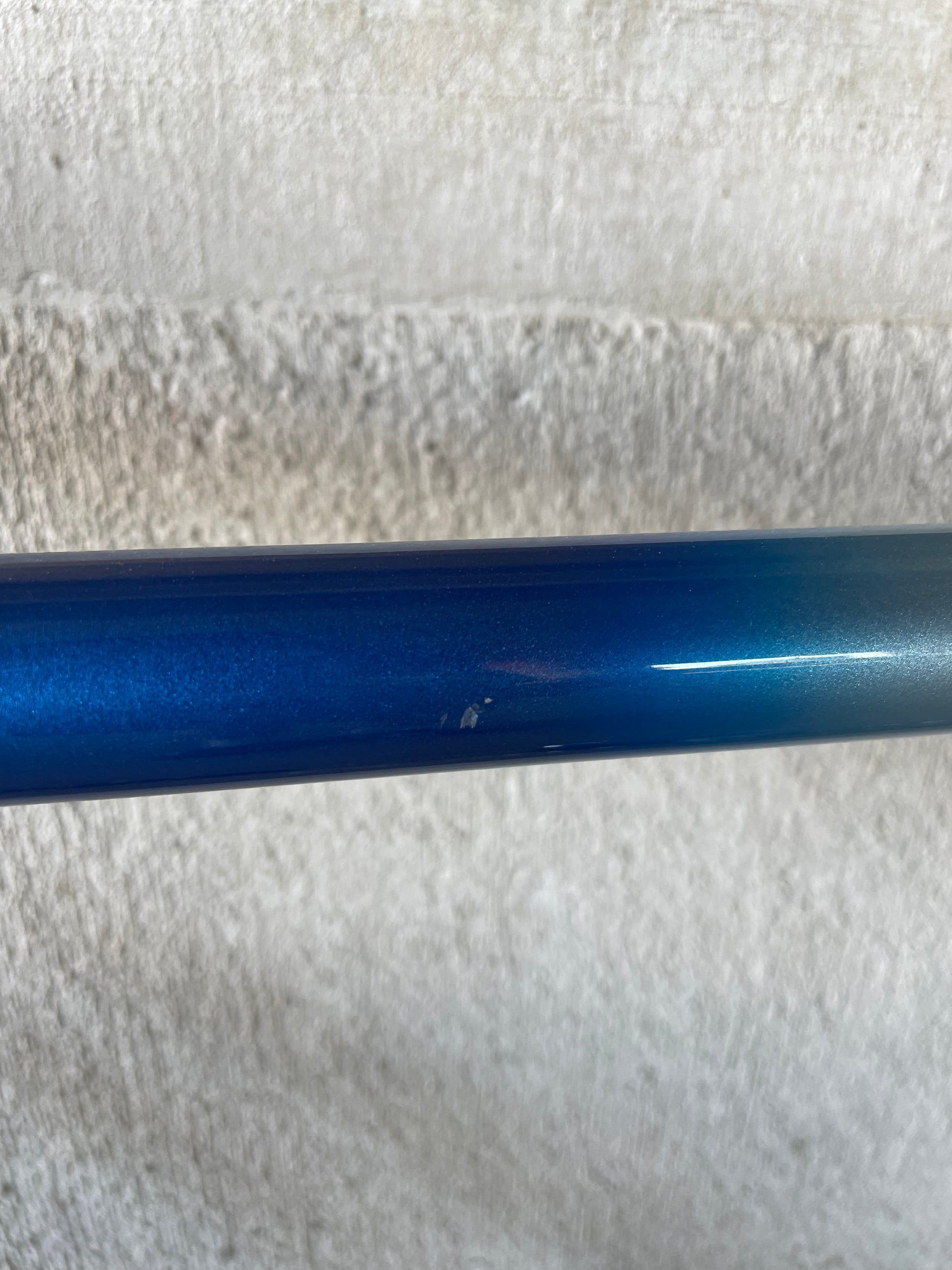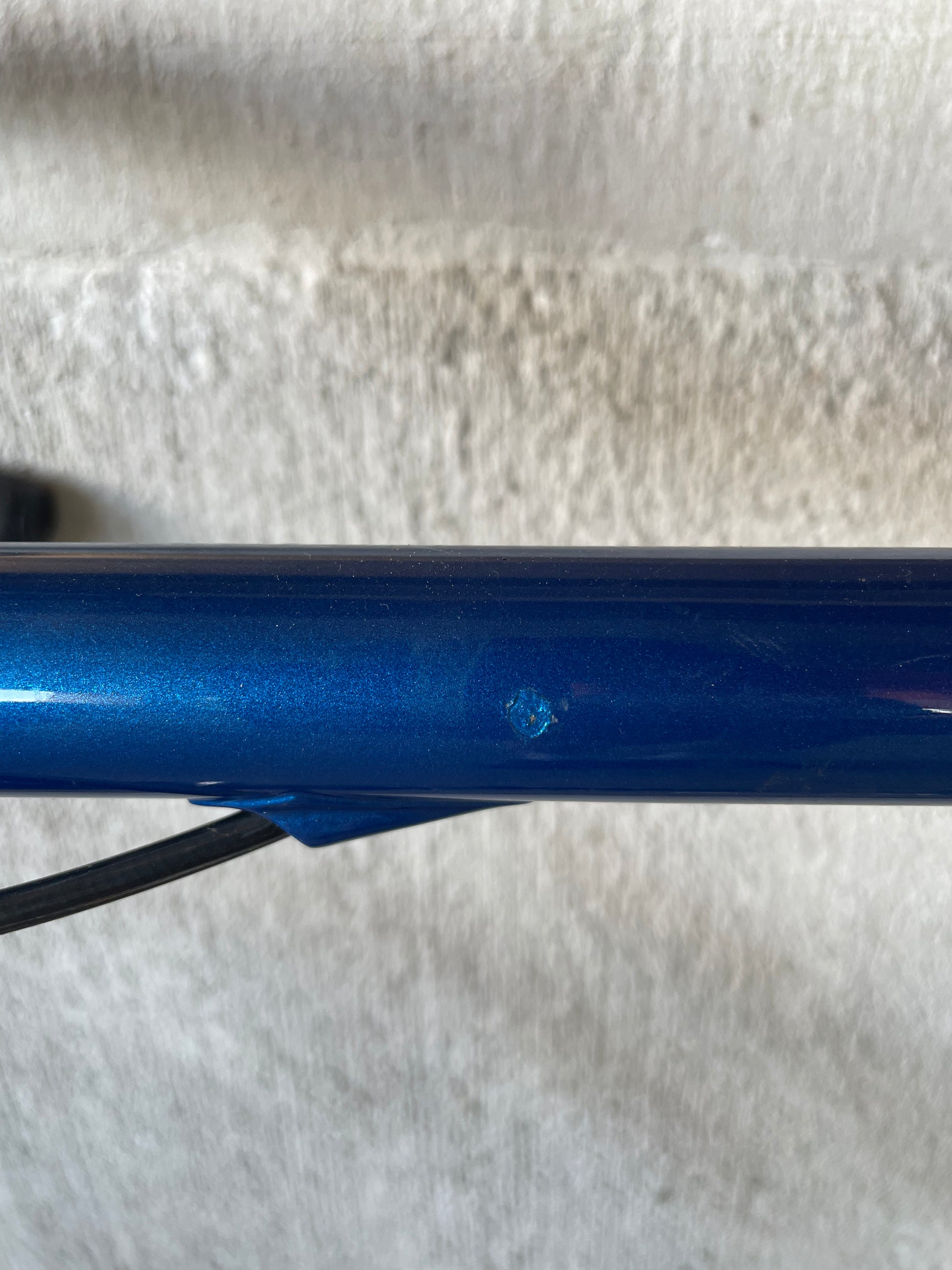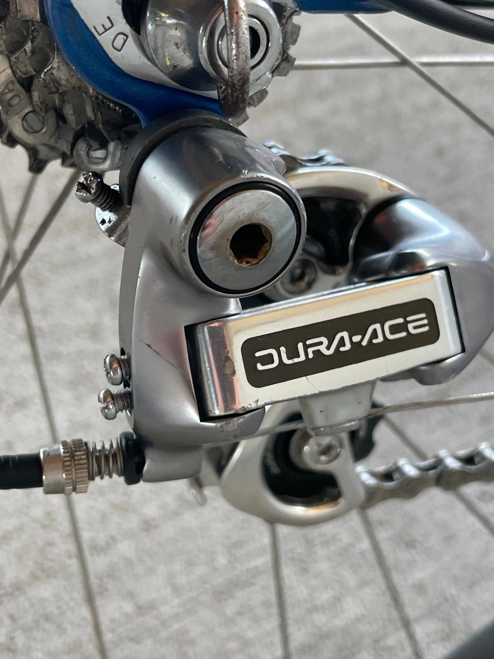 This early 1990's De Rosa Giro D'Italia is stunning! It comes equipped with a complete Shimano Dura-Ace 7400 group with a Cinelli bar and stem that feels snappy and precise. Brand new Specialized Turbo Cotton tires have been installed along with new bar tape and cables/housing. It's in overall great condition but shows sign of use. It has some paint chips but no dents or cracks. When I got the bike, the fork dropouts were pretty badly bent but they were re-aligned. You can see in the upper part of the fork that the paint splintered from whatever bent the dropouts (I assume). It's a great riding bike that is bound to turn heads!
