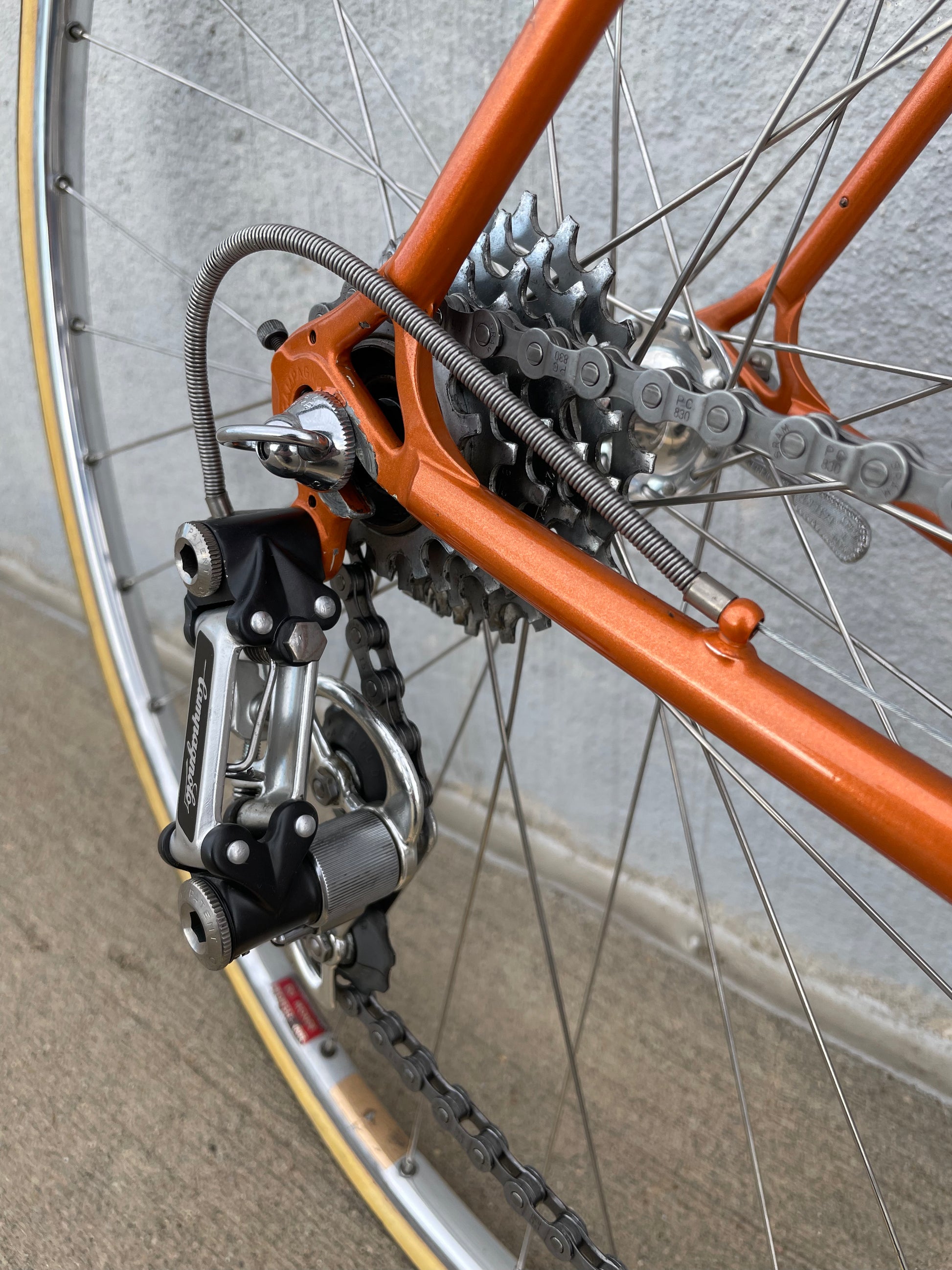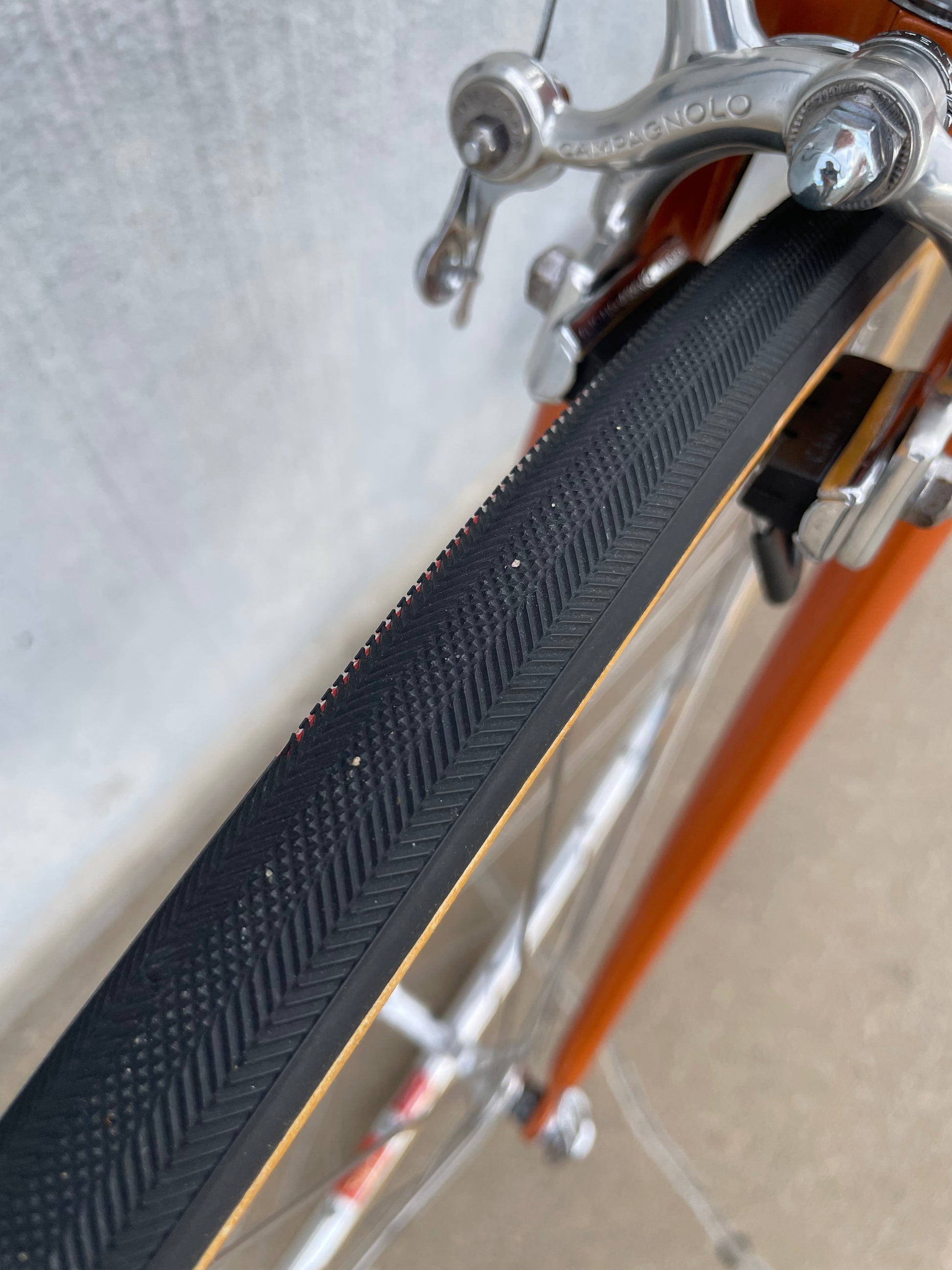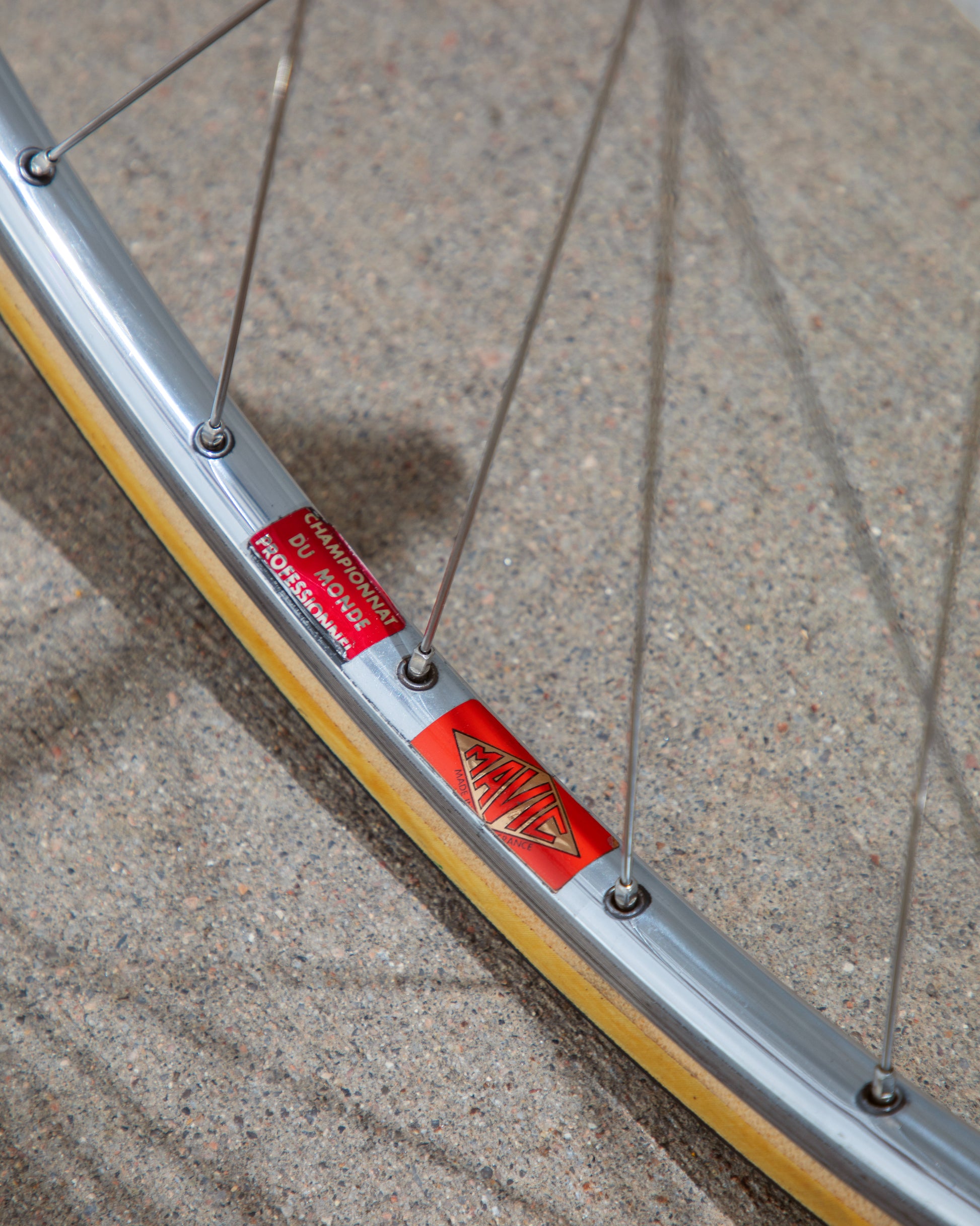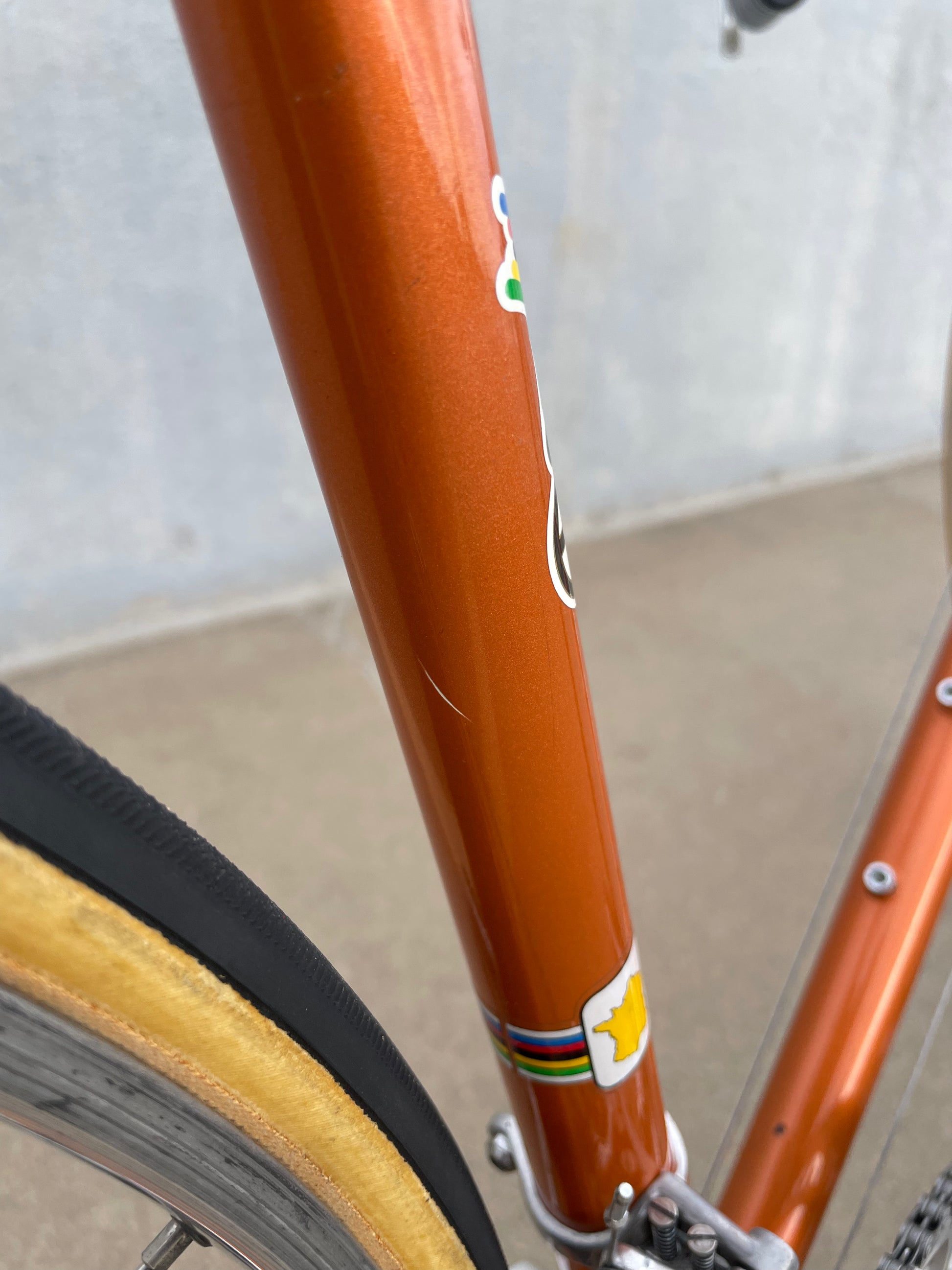 The bike has been gone through but shows sign of use. The frame has a few paint chips but no dents, bends, or cracks. The hubs have been polished and serviced along with the rims, however I would recommend keeping these wheels as show pieces. The tires have not been glued on. The rear wheel has some dishing problems. If you intend to ride this bike, which you should, throw on some 6 speed clinchers and you're set. These old Mavics are beautiful, but they have lived their life. Bottom bracket and headset have been serviced. New cables and housing have been installed. Frame was polished and all parts were given a good clean. New chain, brake hoods, and Benotto bar tape!