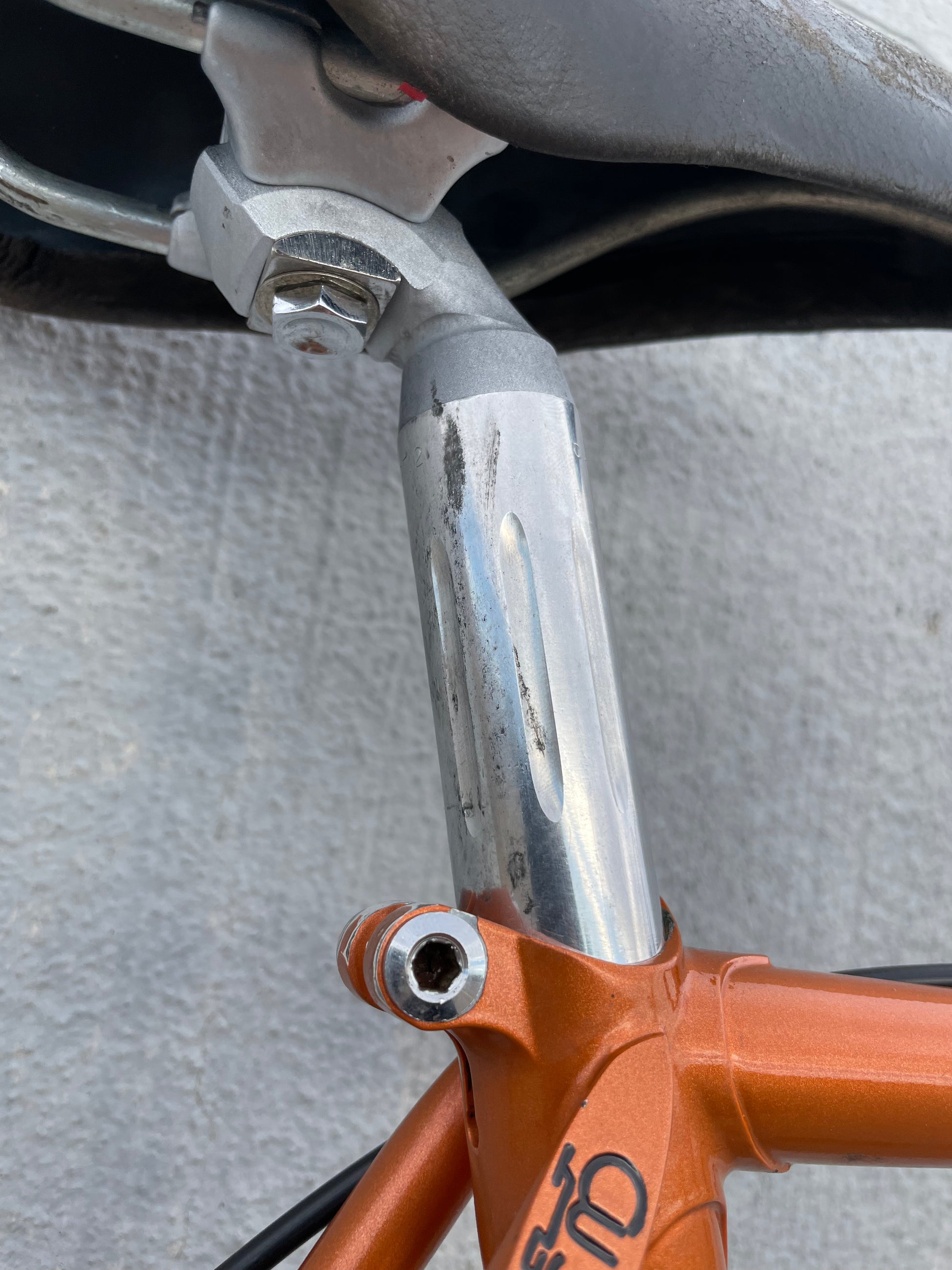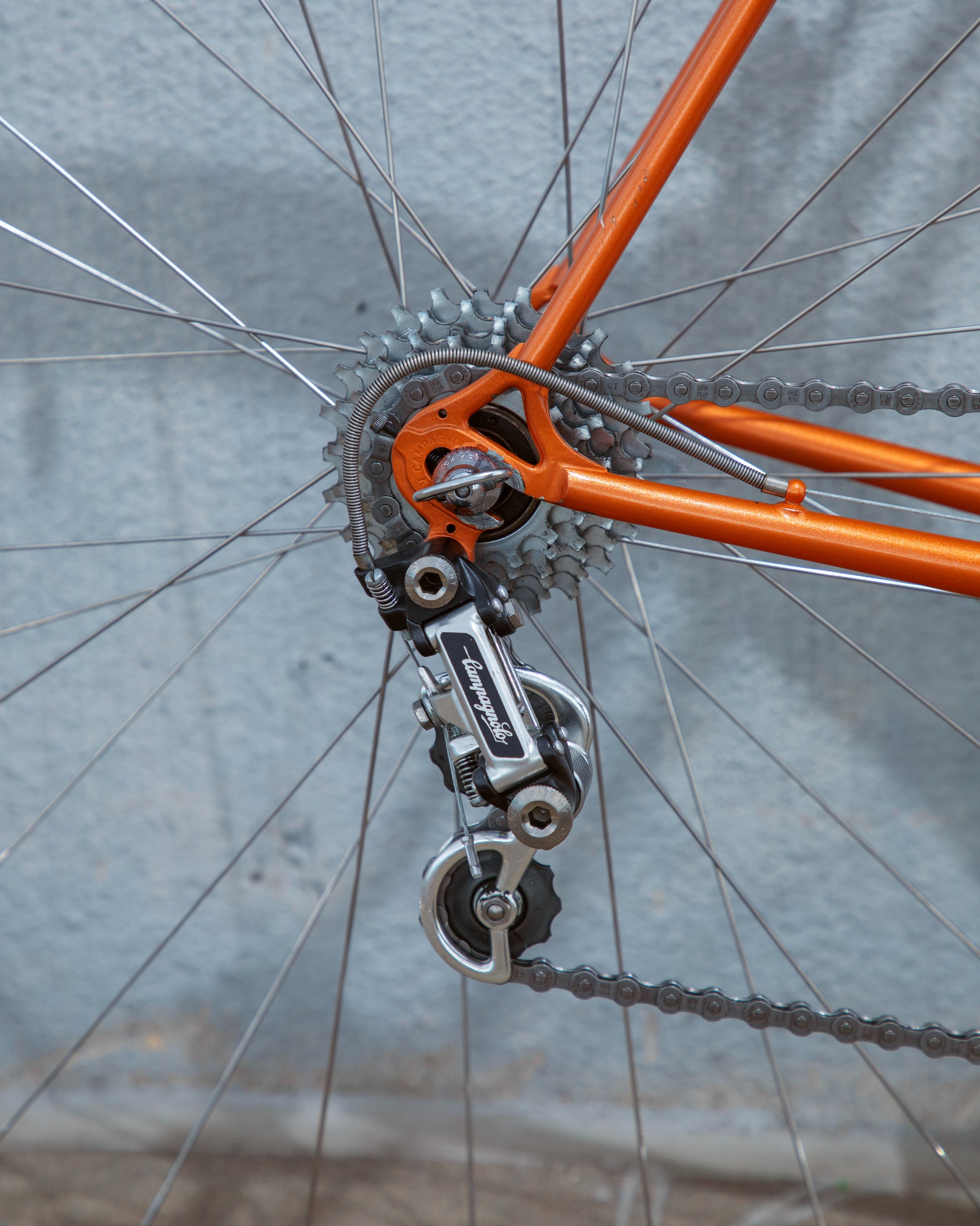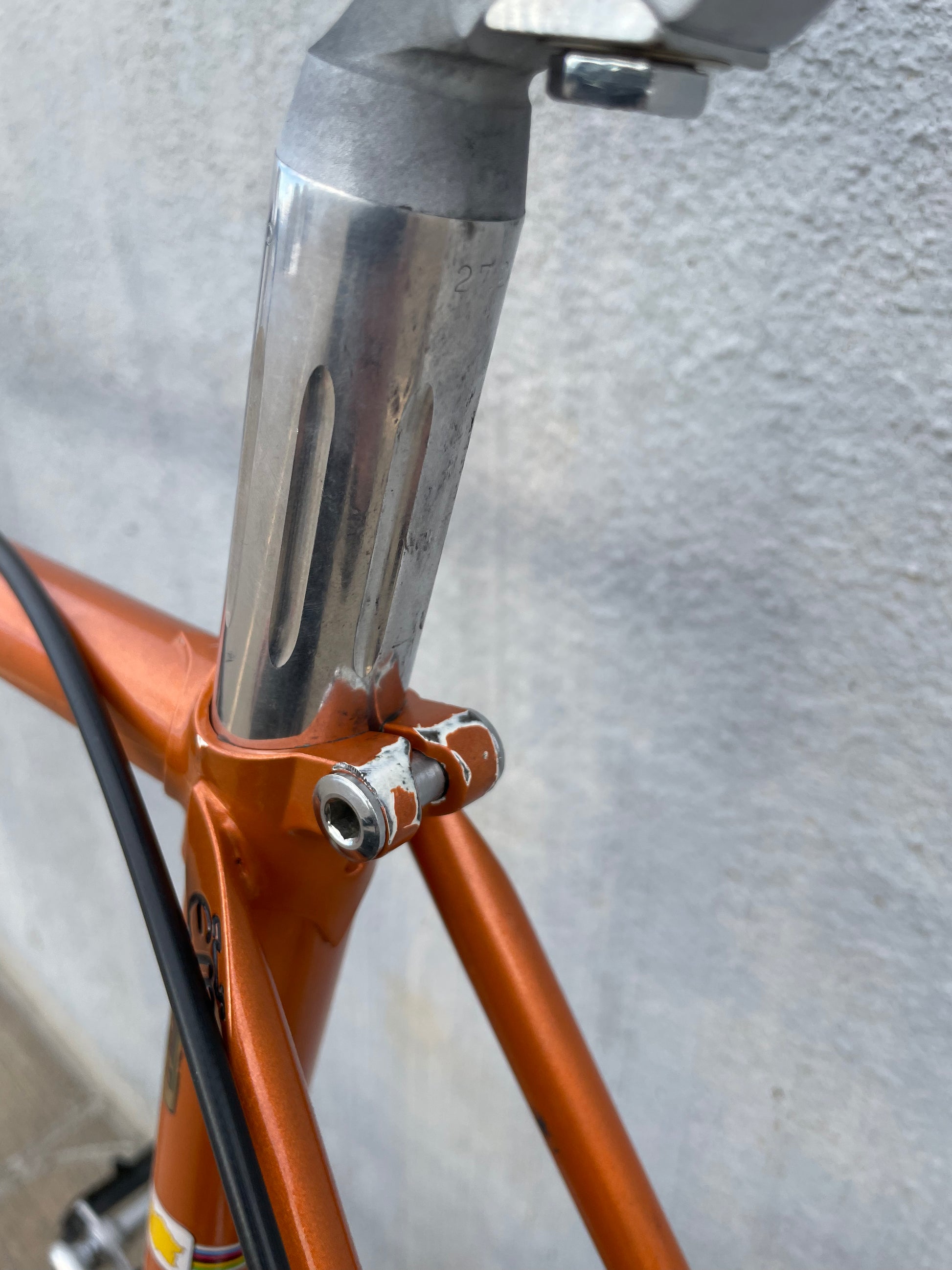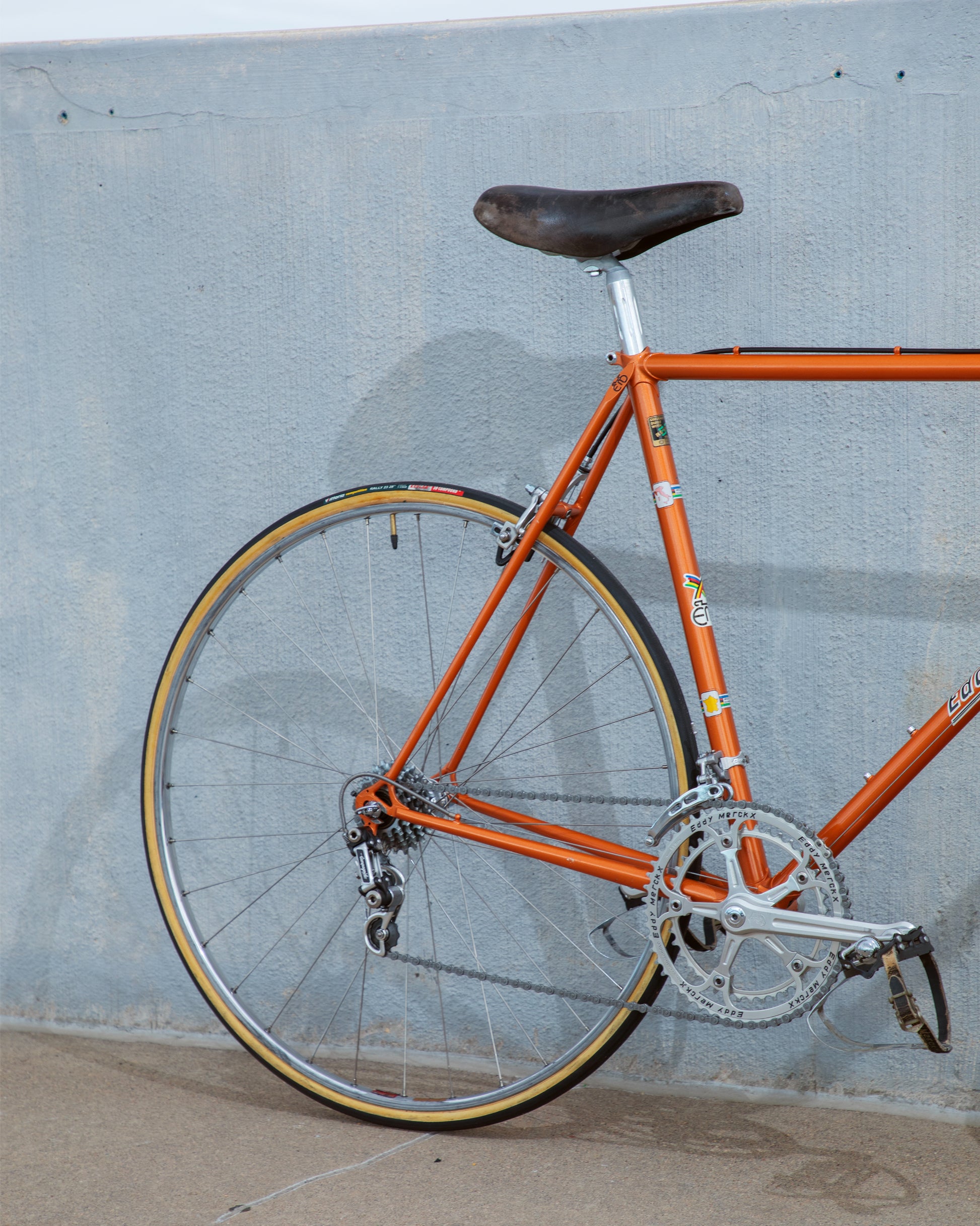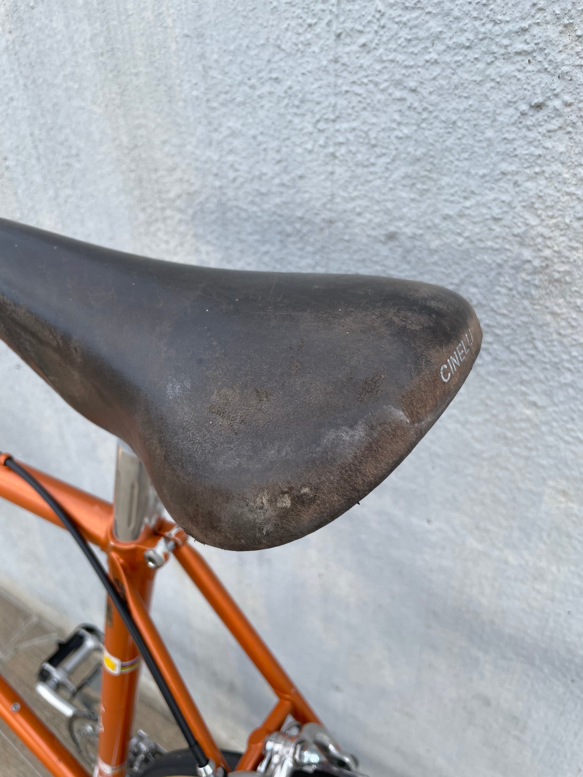 The bike has been gone through but shows sign of use. The frame has a few paint chips but no dents, bends, or cracks. The hubs have been polished and serviced along with the rims, however I would recommend keeping these wheels as show pieces. The tires have not been glued on. The rear wheel has some dishing problems. If you intend to ride this bike, which you should, throw on some 6 speed clinchers and you're set. These old Mavics are beautiful, but they have lived their life. Bottom bracket and headset have been serviced. New cables and housing have been installed. Frame was polished and all parts were given a good clean. New chain, brake hoods, and Benotto bar tape!