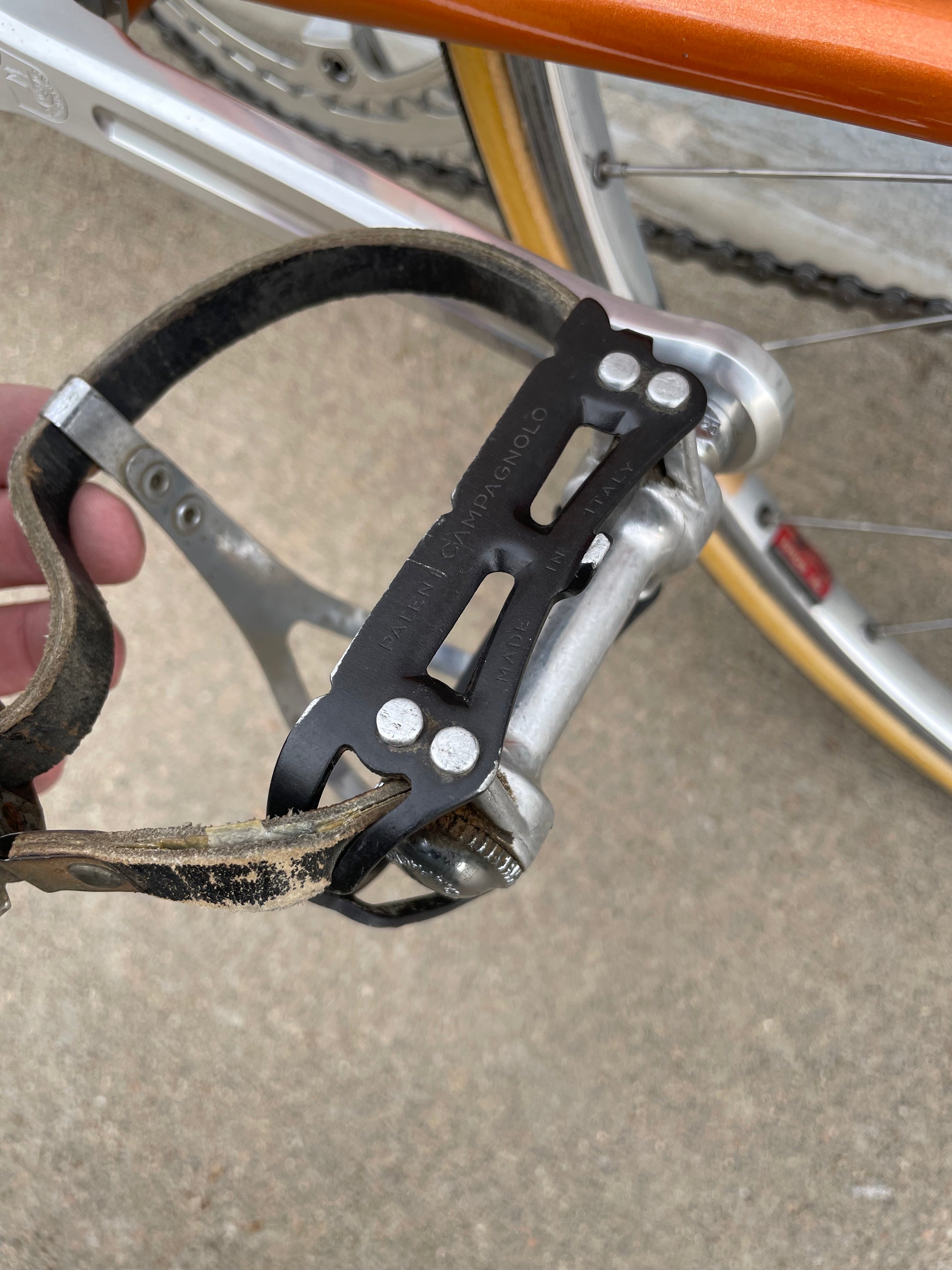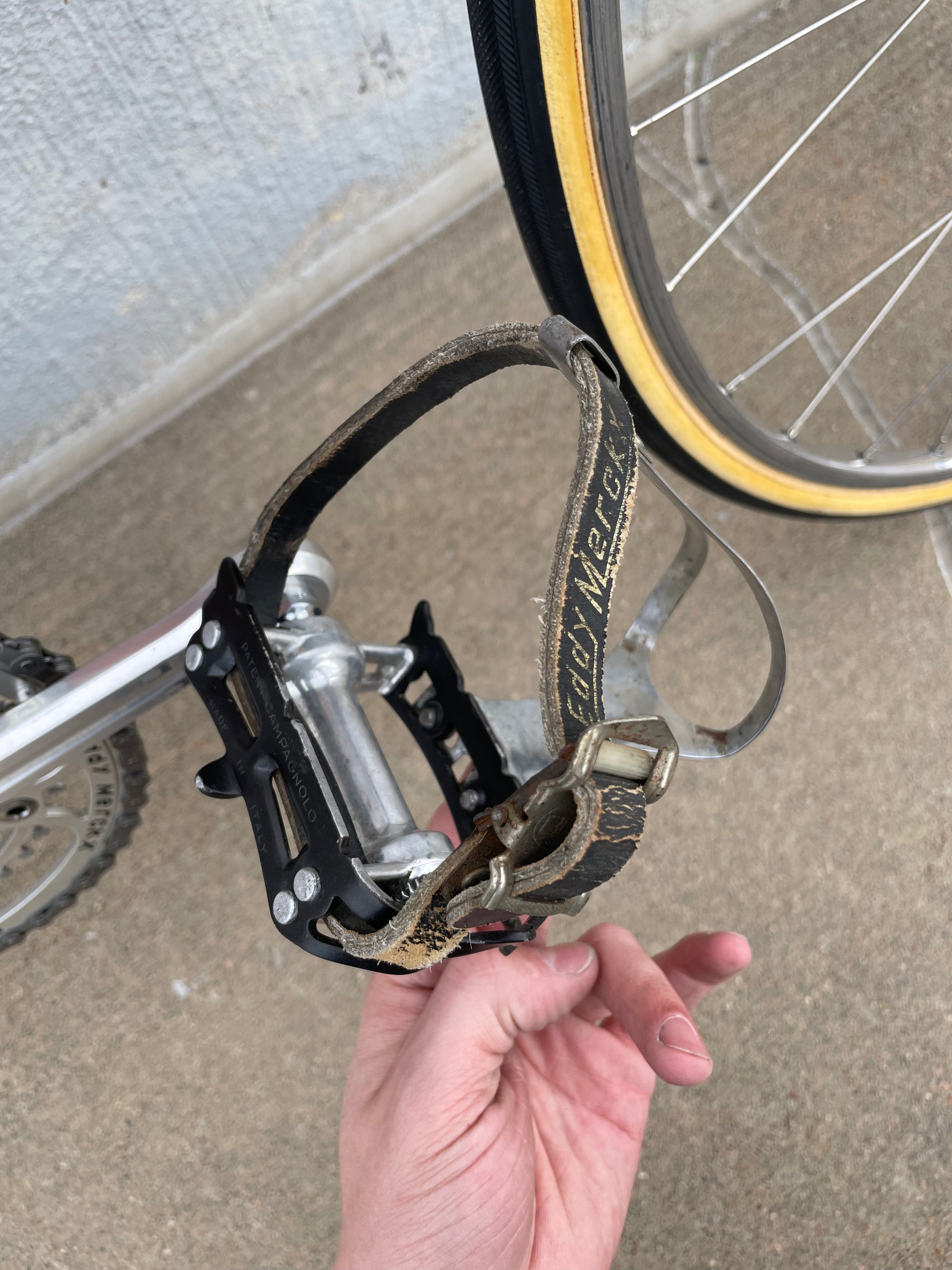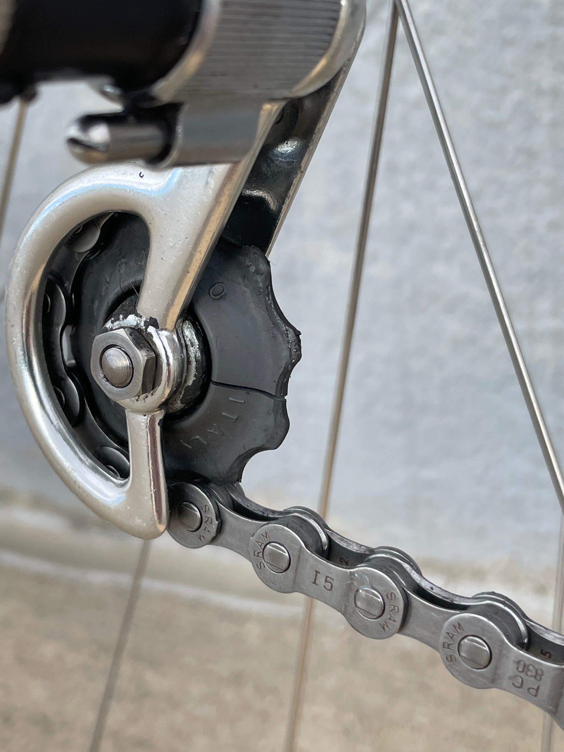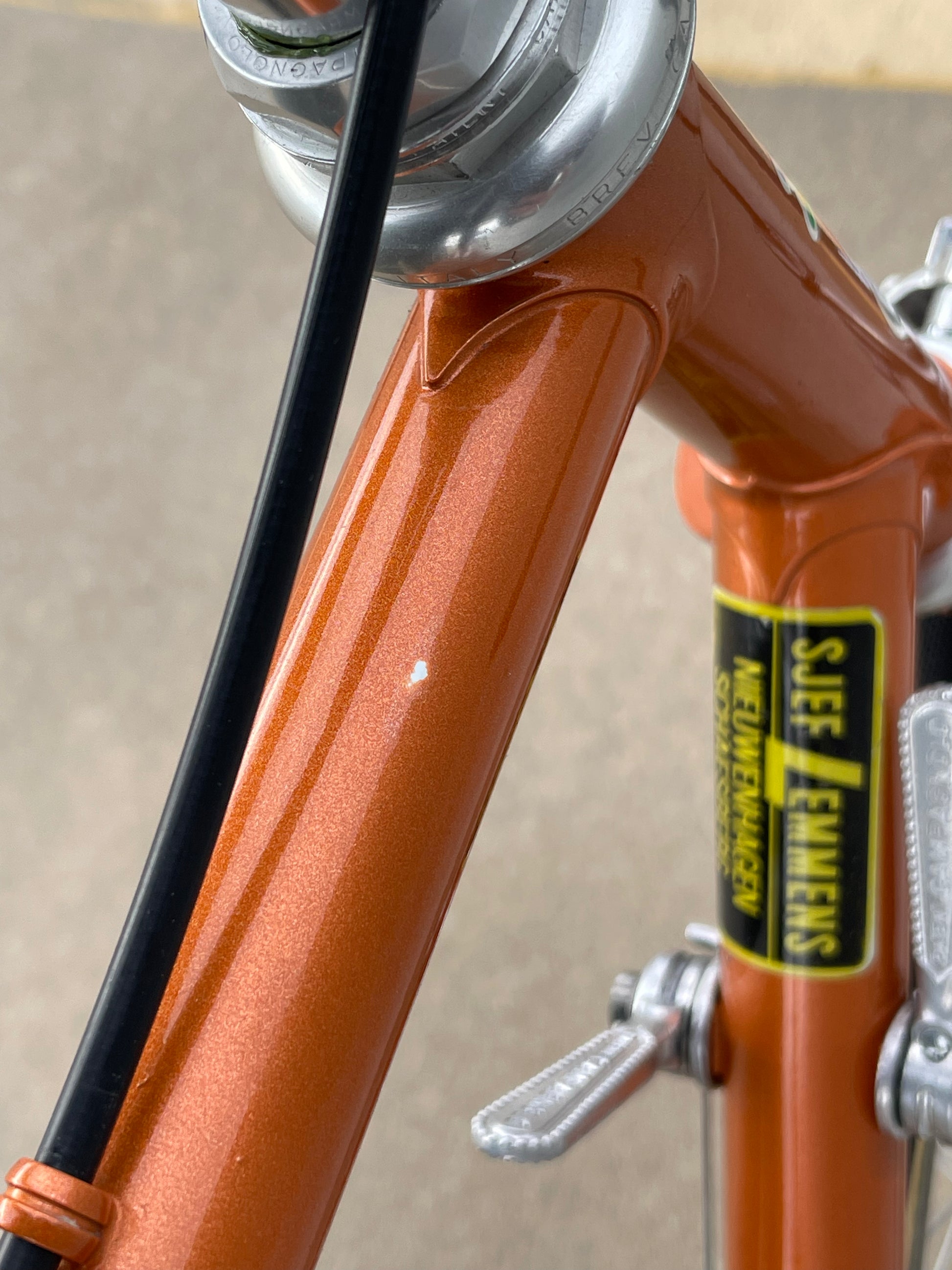 The bike has been gone through but shows sign of use. The frame has a few paint chips but no dents, bends, or cracks. The hubs have been polished and serviced along with the rims, however I would recommend keeping these wheels as show pieces. The tires have not been glued on. The rear wheel has some dishing problems. If you intend to ride this bike, which you should, throw on some 6 speed clinchers and you're set. These old Mavics are beautiful, but they have lived their life. Bottom bracket and headset have been serviced. New cables and housing have been installed. Frame was polished and all parts were given a good clean. New chain, brake hoods, and Benotto bar tape!