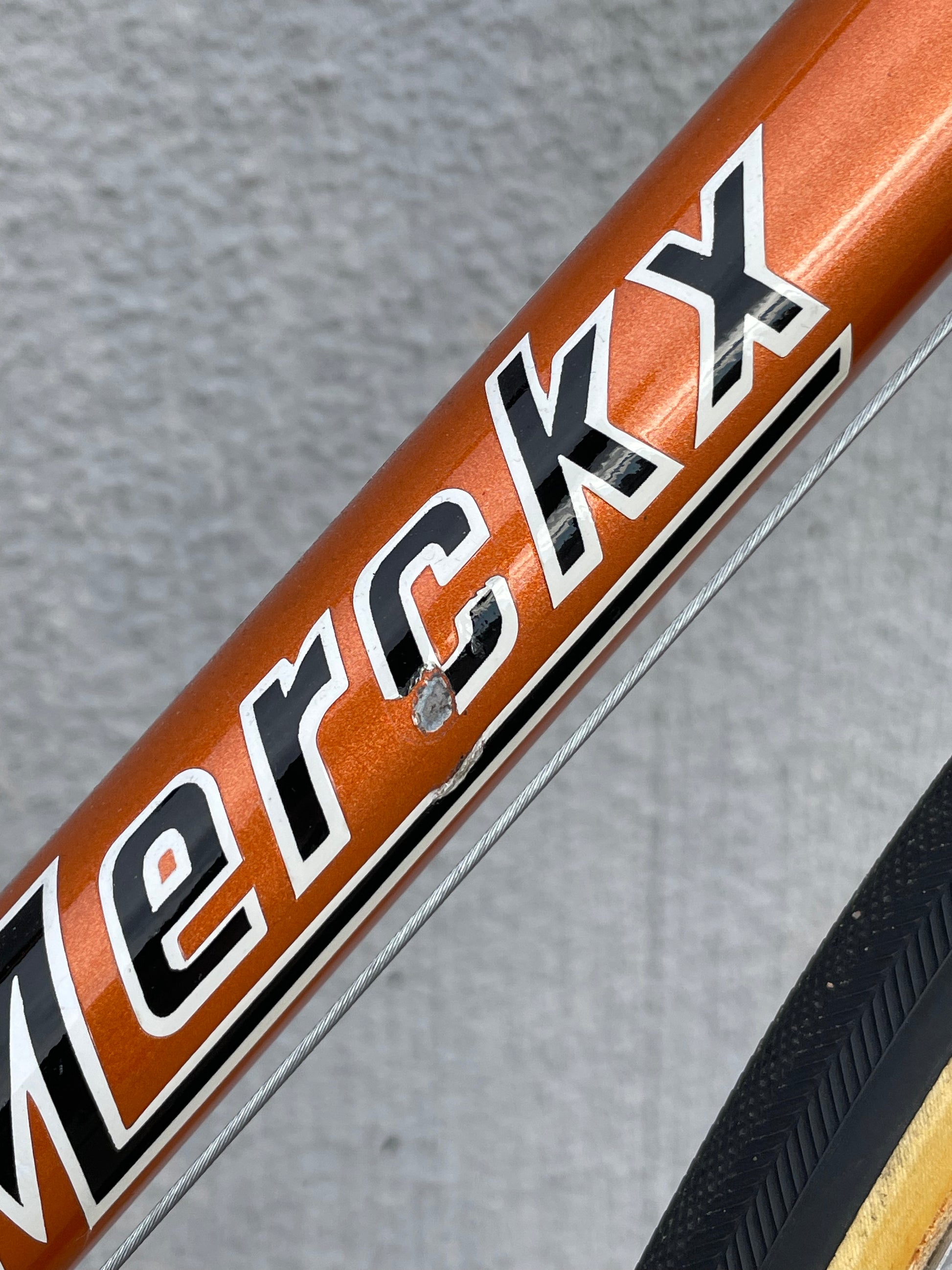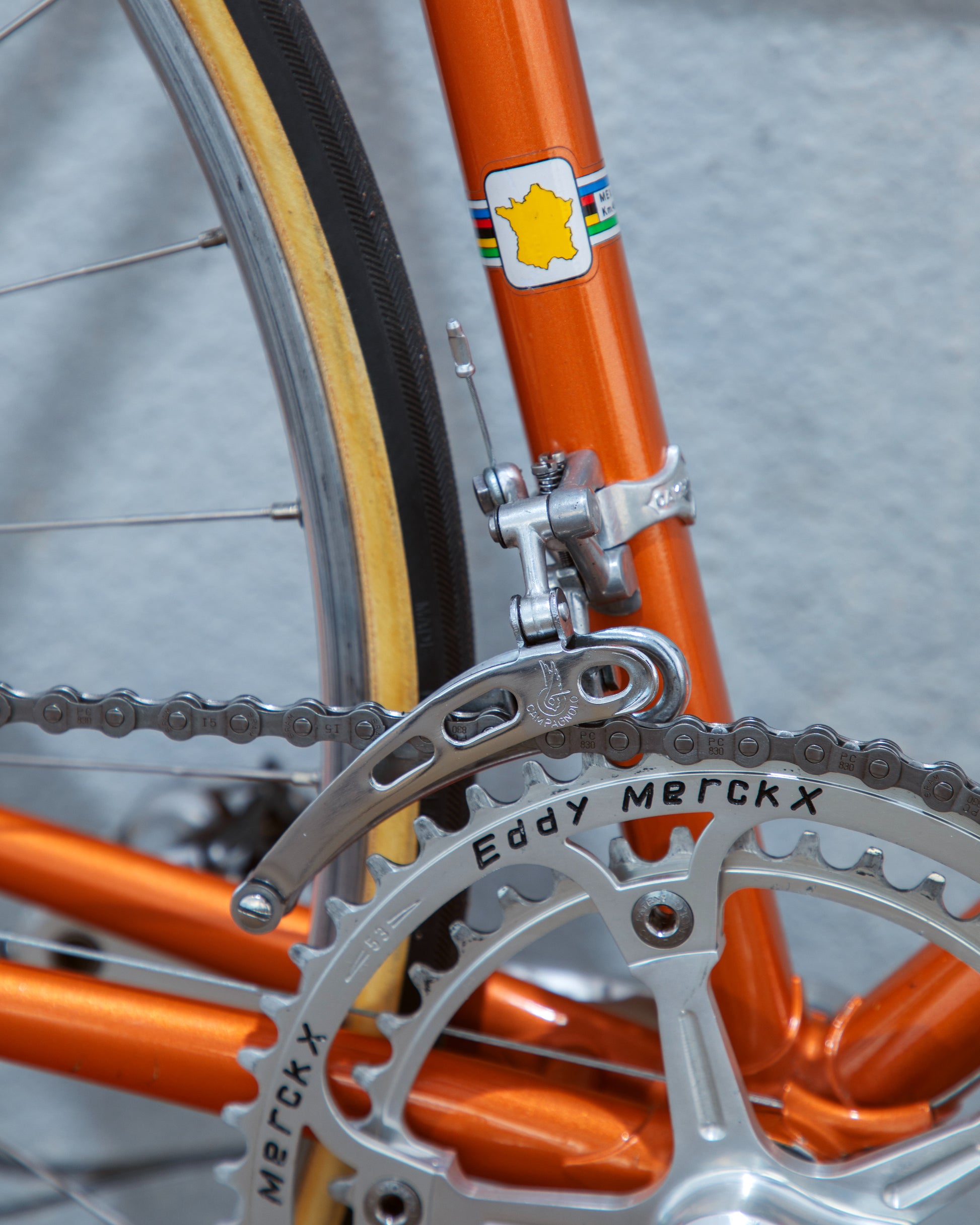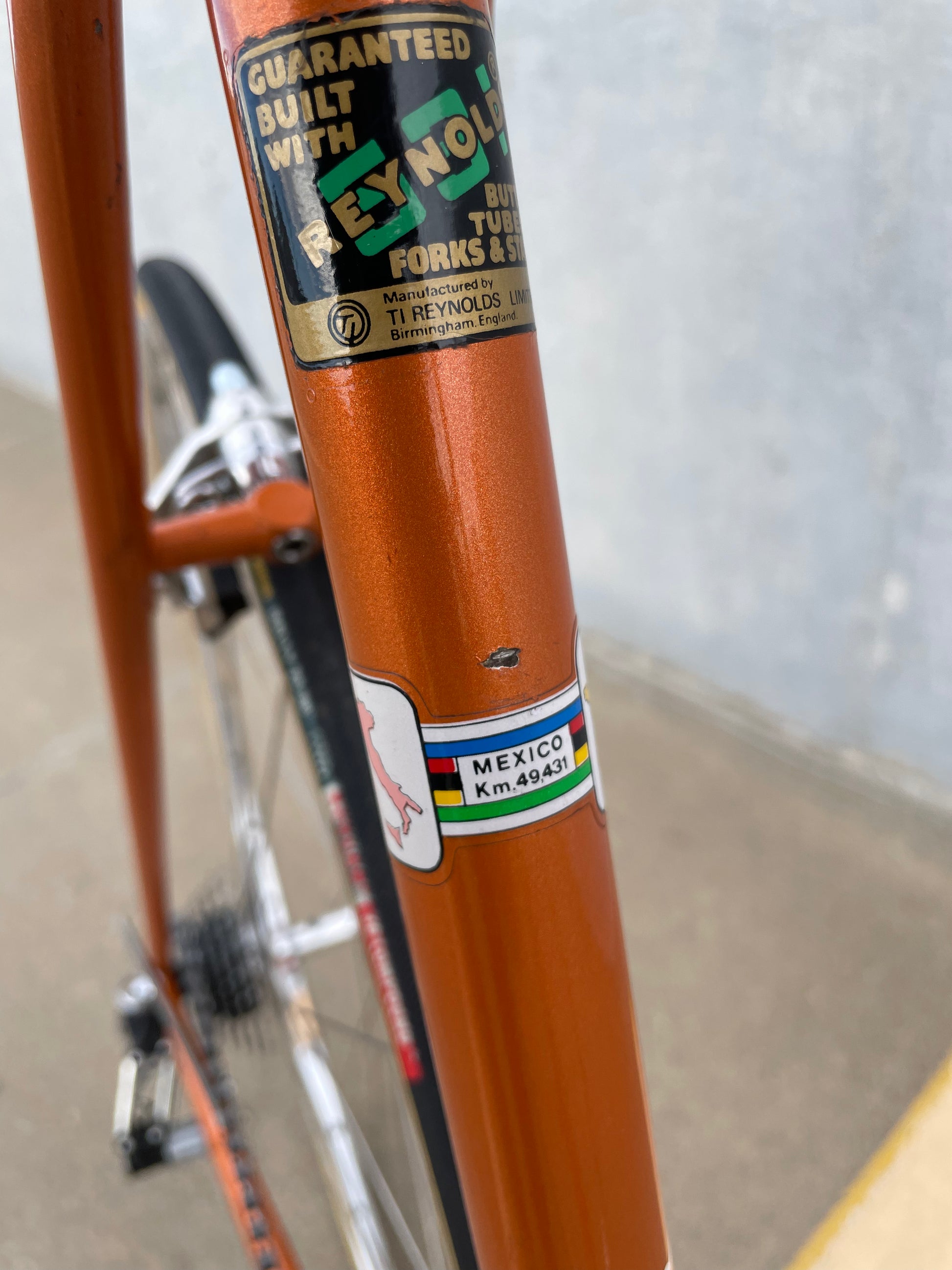 This Merckx is an absolute gem. It's the pinnacle of early 80's cycling. The frame is made from Reynolds 531 and is fitted with a complete Campagnolo Super Record Groupset. Most of the parts have also been pantographed, which adds a lot of flare! The serial number (A5R E2507) indicates the bike is a 55cm and made with Reynolds tubing. It also indicates the bike was made between 1981 and 1984. The groupset is dated 1980.