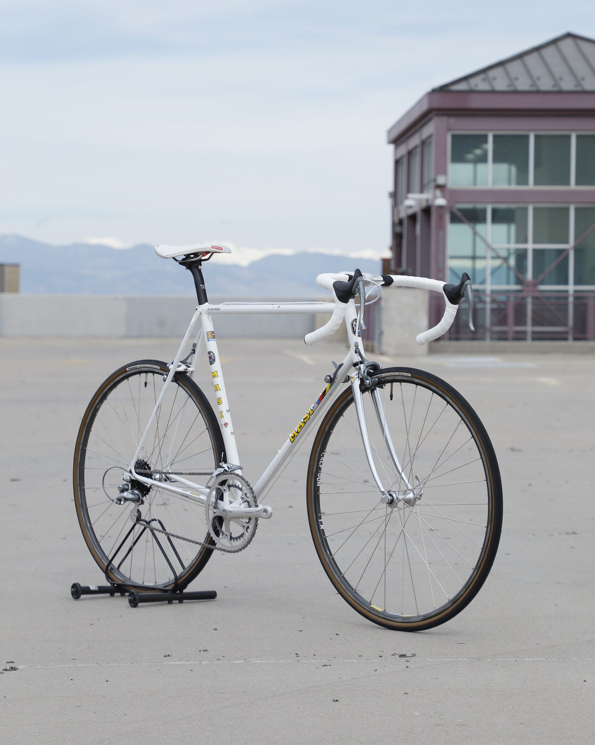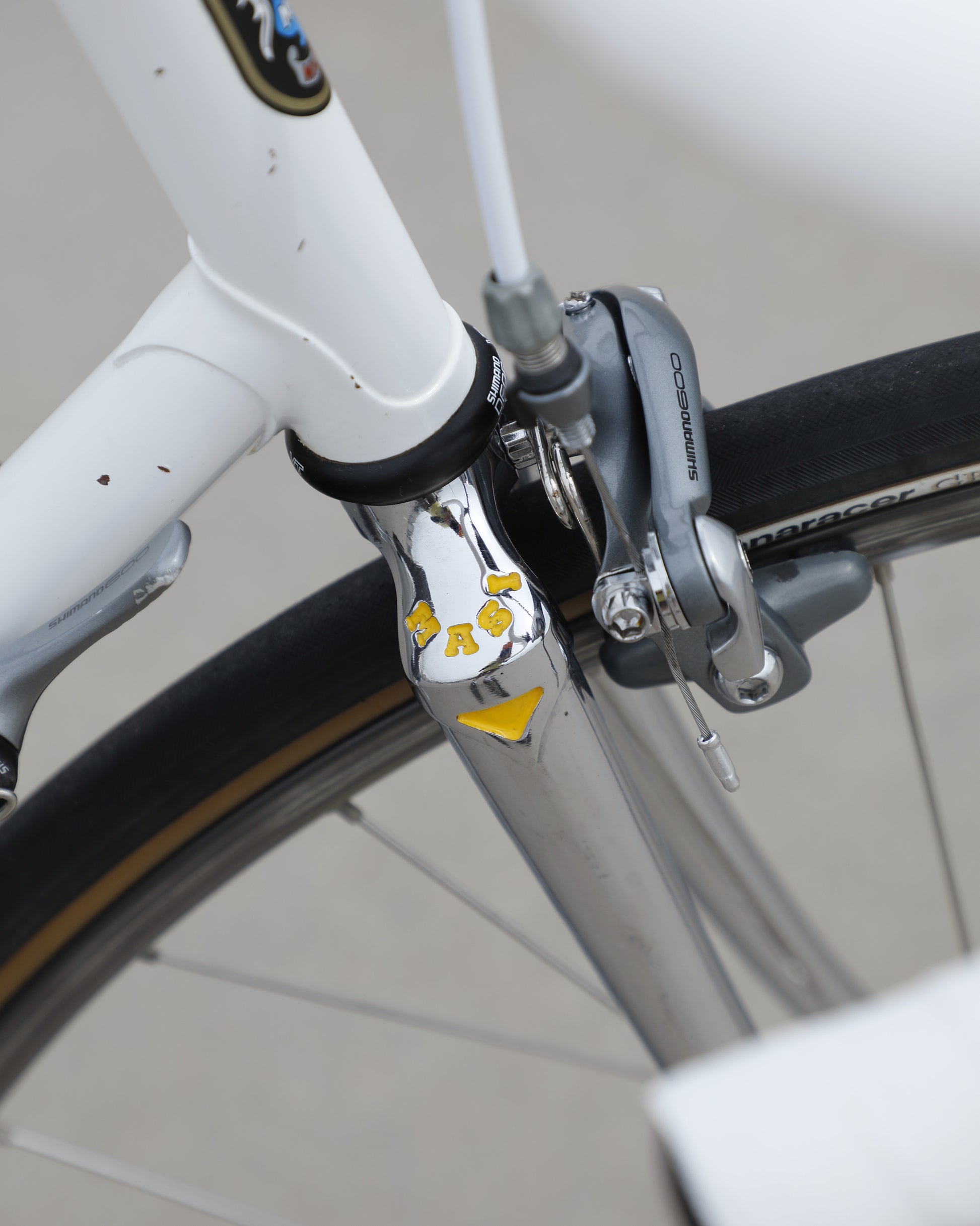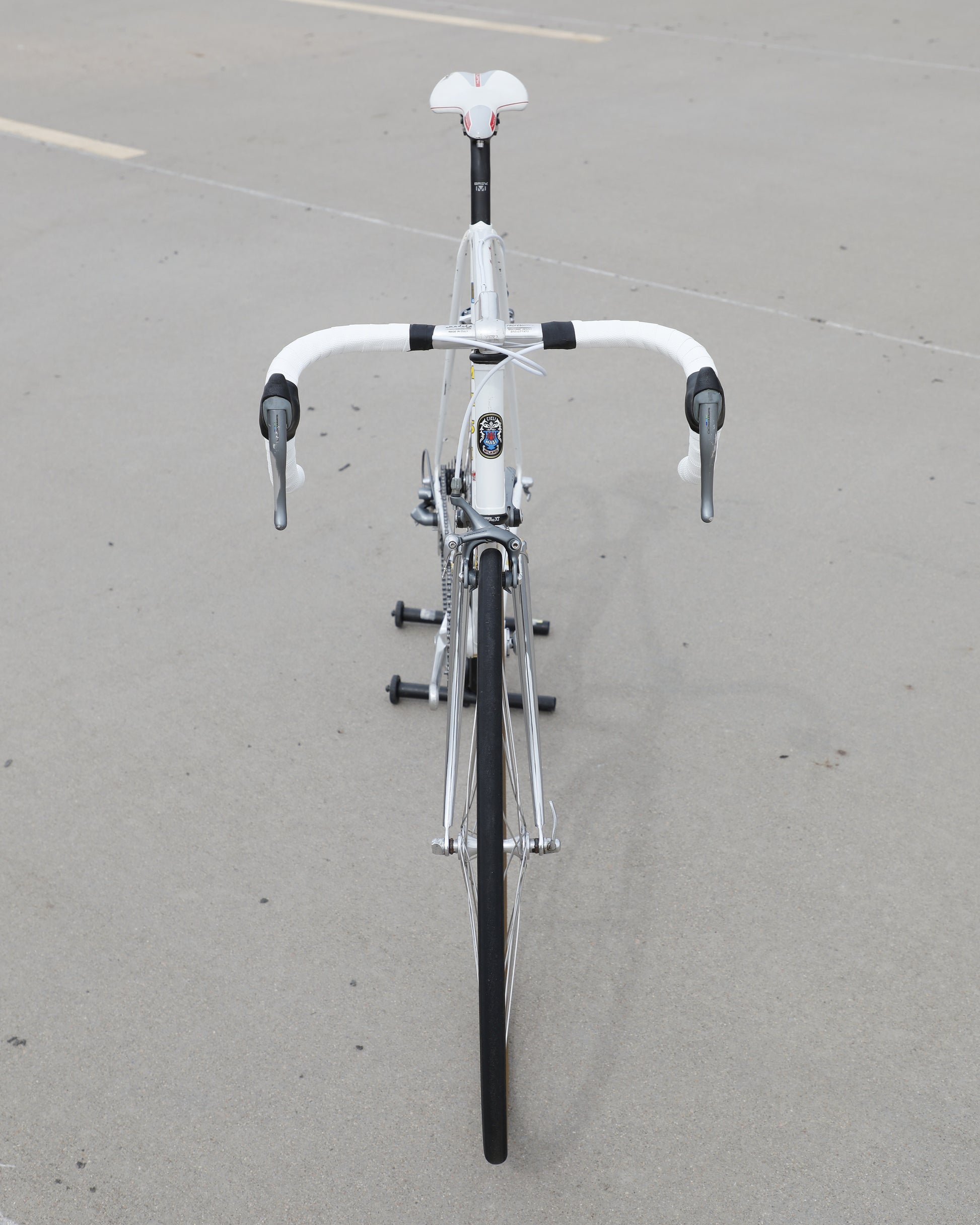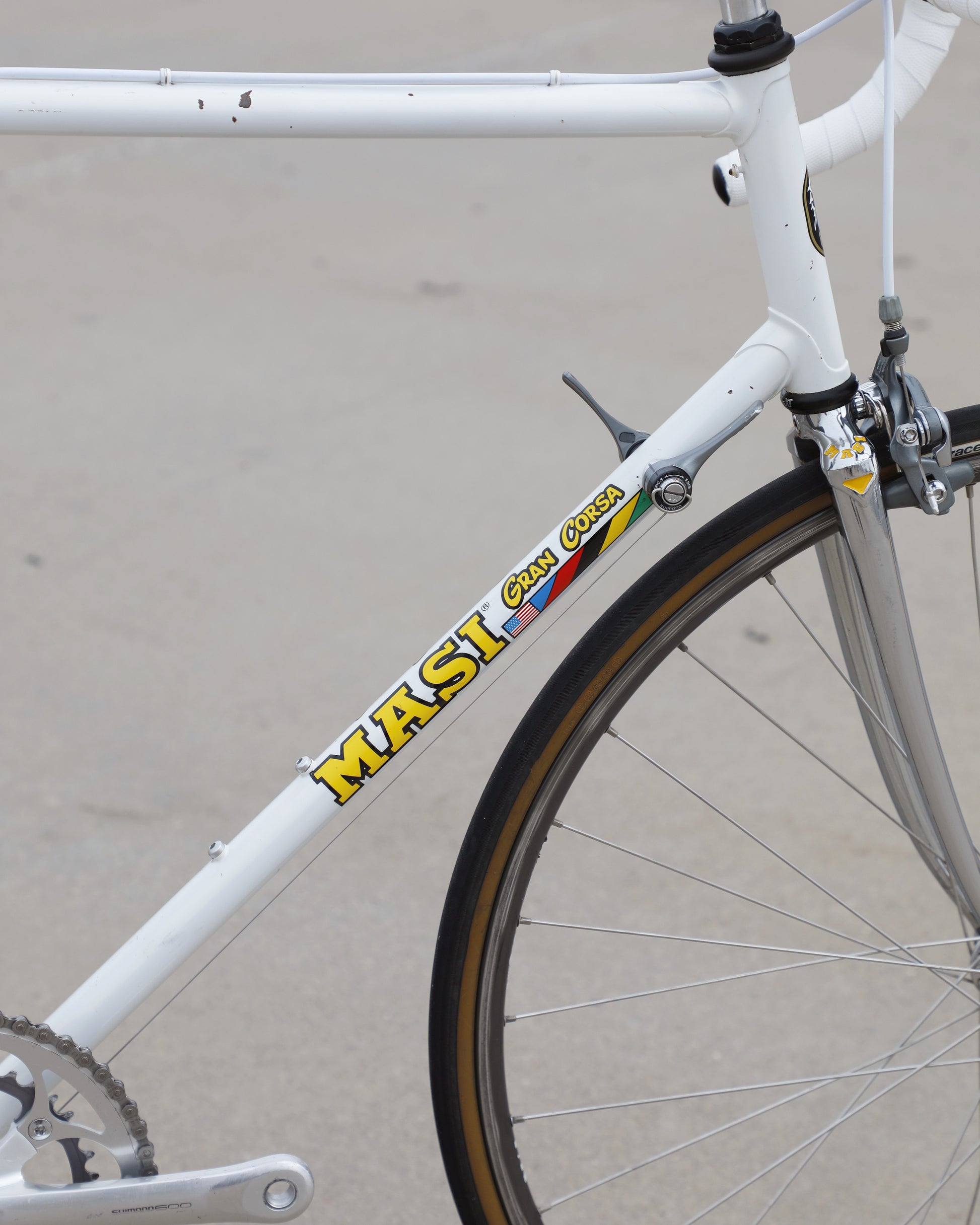 This Masi Gran Corsa is made from the sublime Columbus tubeset and is finished in a beautiful, pearl white. It was a former team bike It's in good condition but shows sign of use. There are no dents, cracks, or bends in the frame. There are some paint chips scattered throughout. Some of the areas were "touched up," but the paint match isn't great. It's a good rider! It comes equipped with a full Shimano 600 tri-color groupset that feels awesome! The large ring shows some wear but is still ridable. Miss-match wheelset but they look very similar. The saddle also has some scuffs. New bar tape was installed and everything has been tuned up! It's a gorgeous, great riding bike.