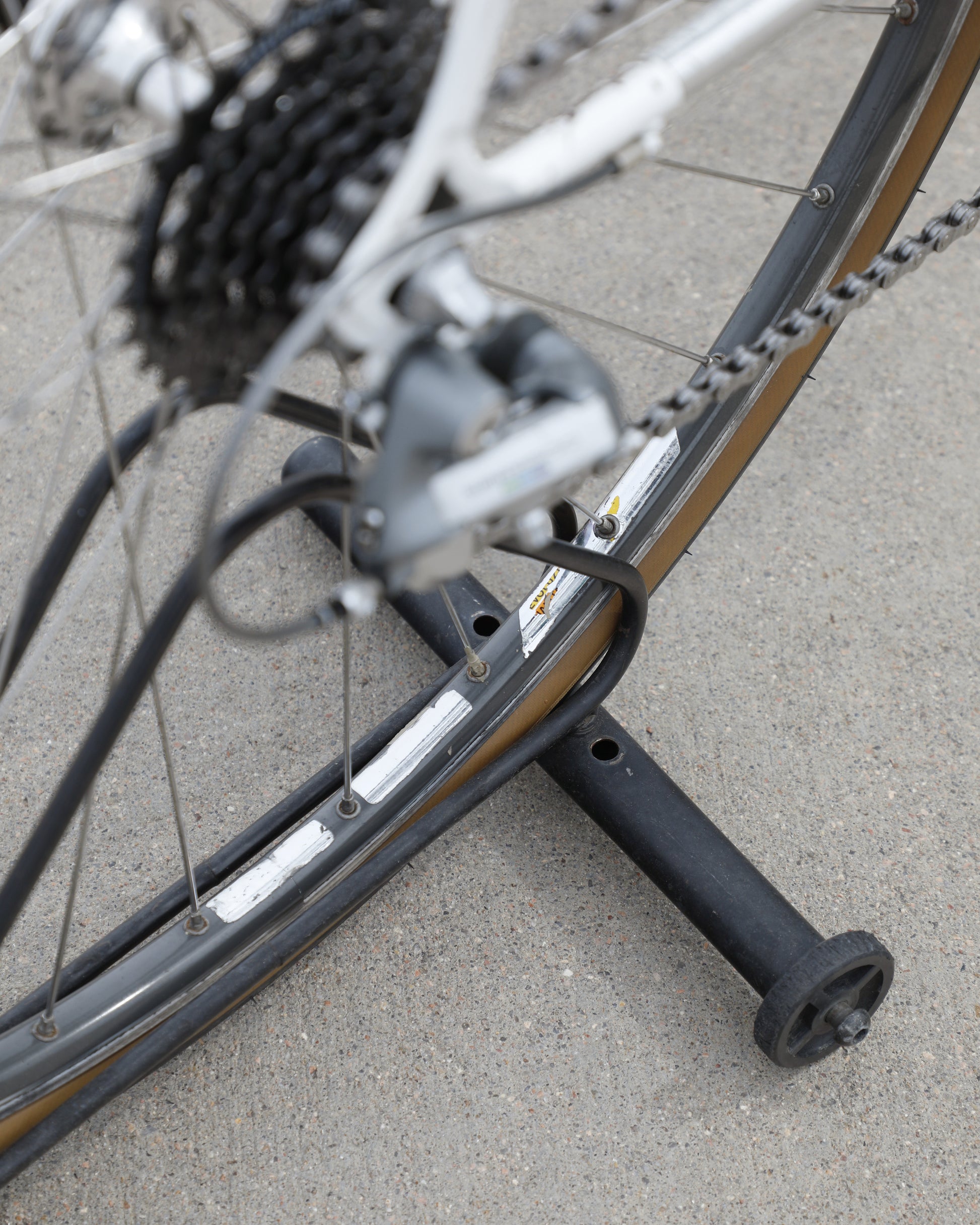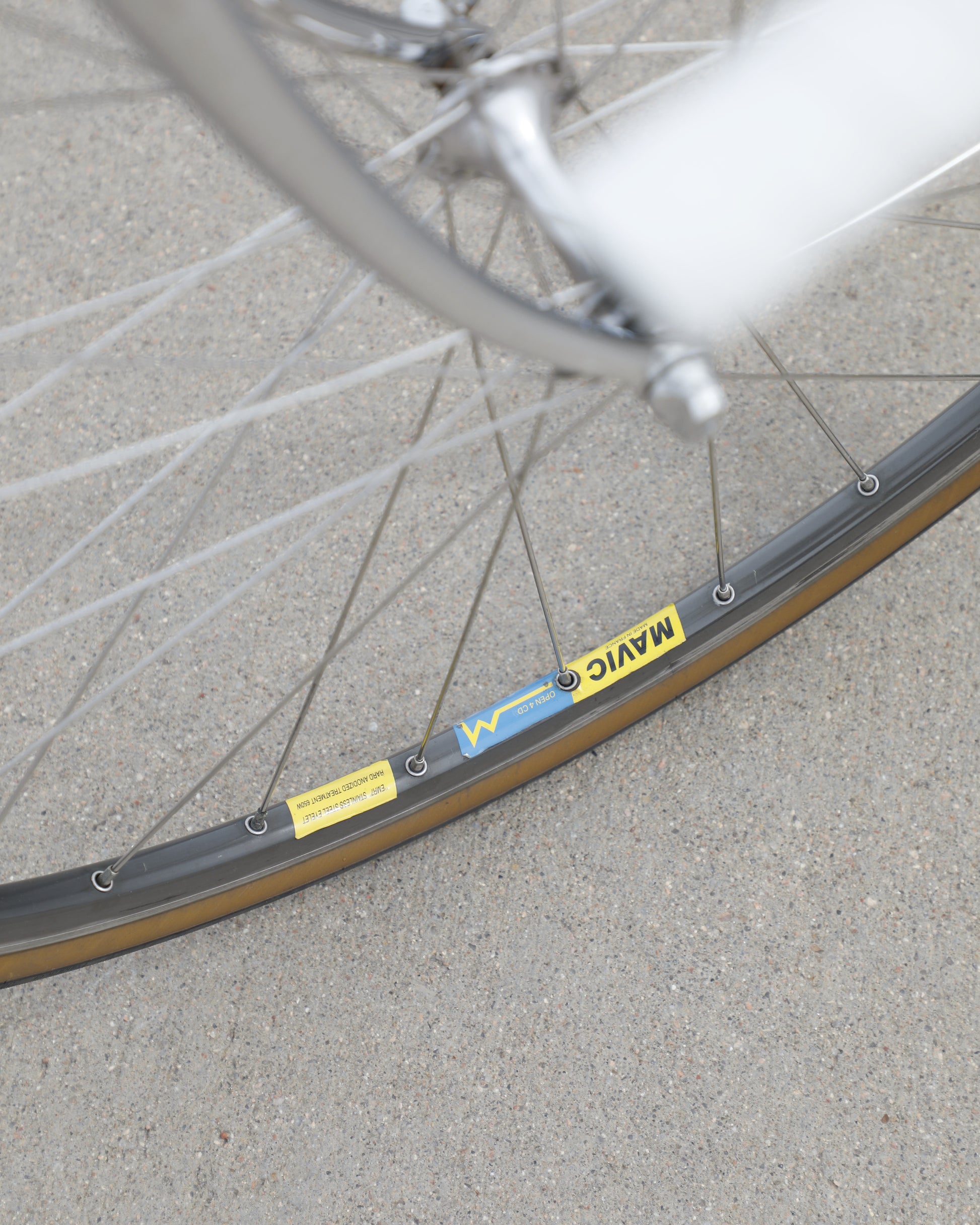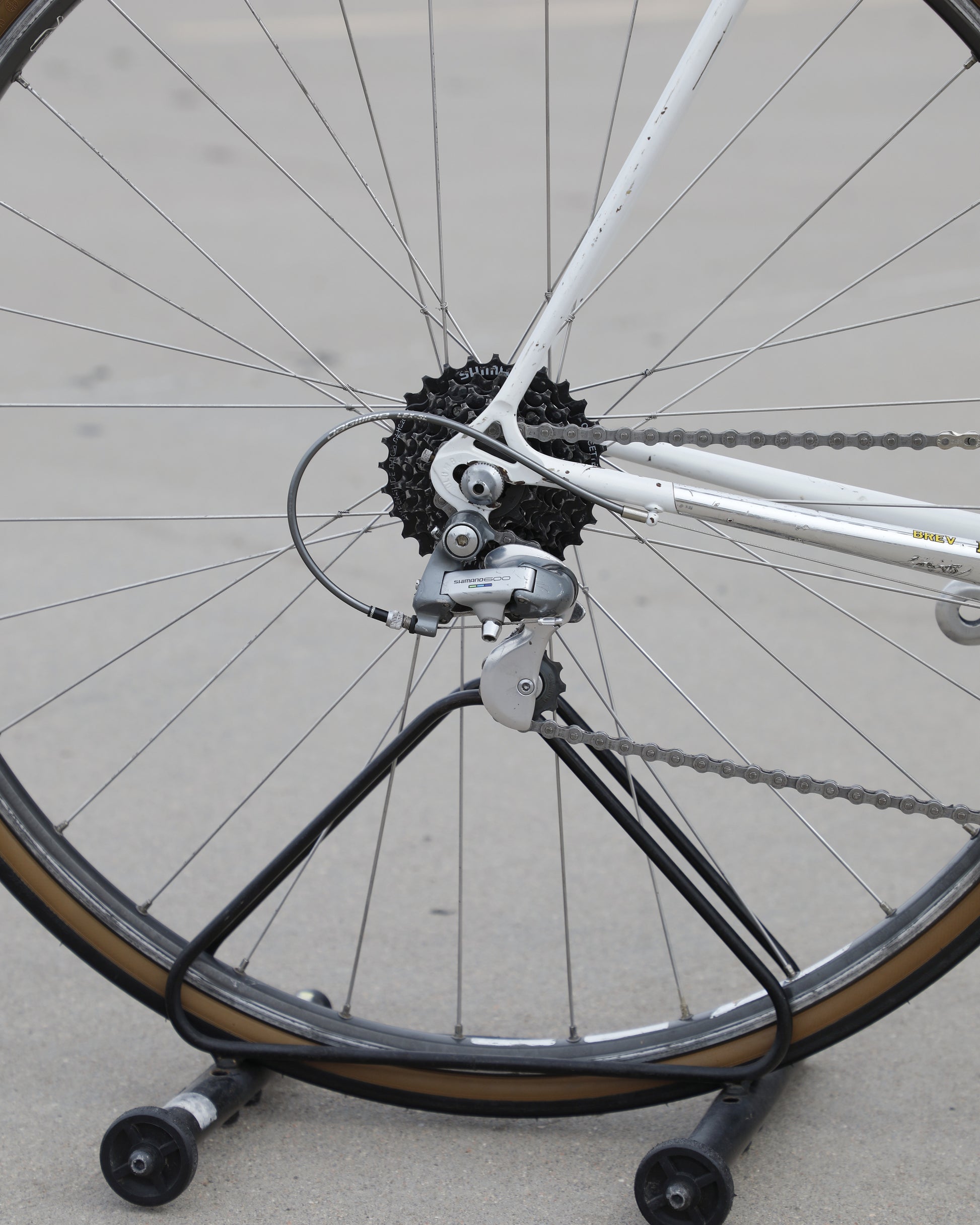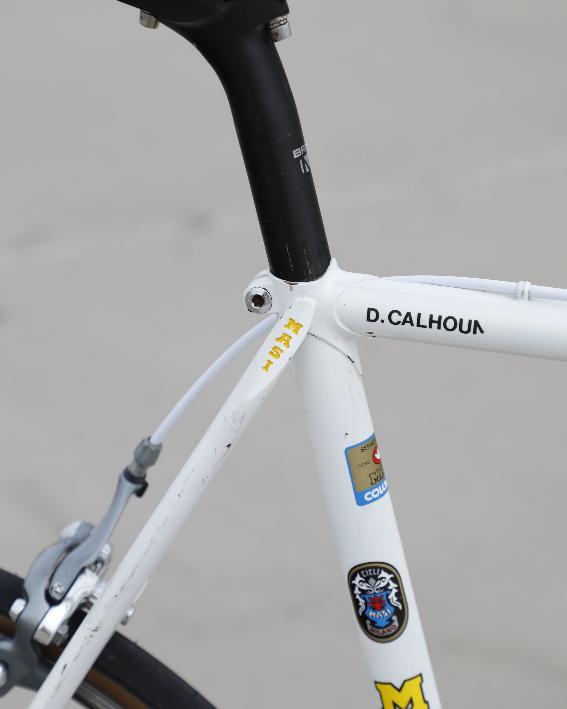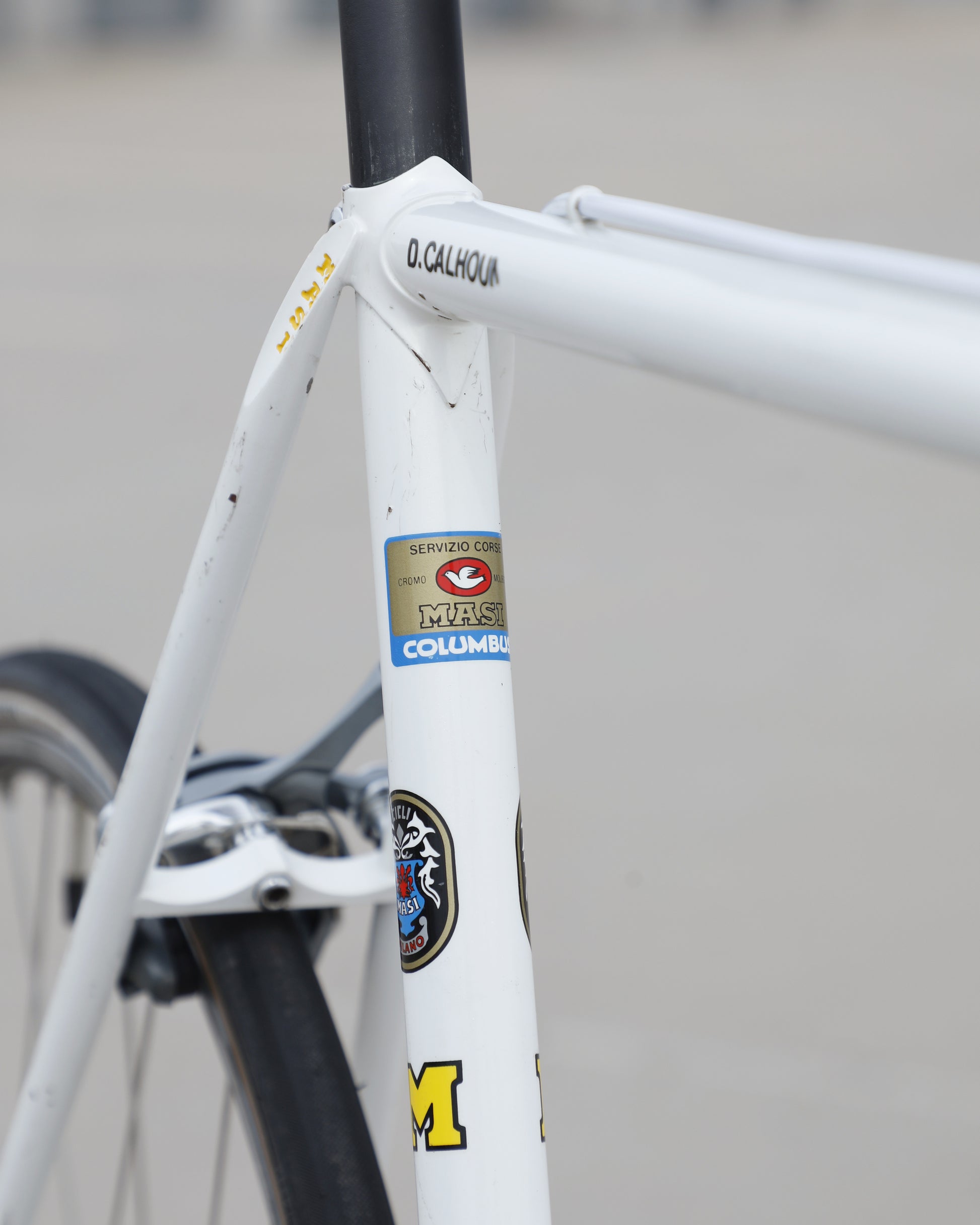 This Masi Gran Corsa is made from the sublime Columbus tubeset and is finished in a beautiful, pearl white. It was a former team bike It's in good condition but shows sign of use. There are no dents, cracks, or bends in the frame. There are some paint chips scattered throughout. Some of the areas were "touched up," but the paint match isn't great. It's a good rider! It comes equipped with a full Shimano 600 tri-color groupset that feels awesome! The large ring shows some wear but is still ridable. Miss-match wheelset but they look very similar. The saddle also has some scuffs. New bar tape was installed and everything has been tuned up! It's a gorgeous, great riding bike.