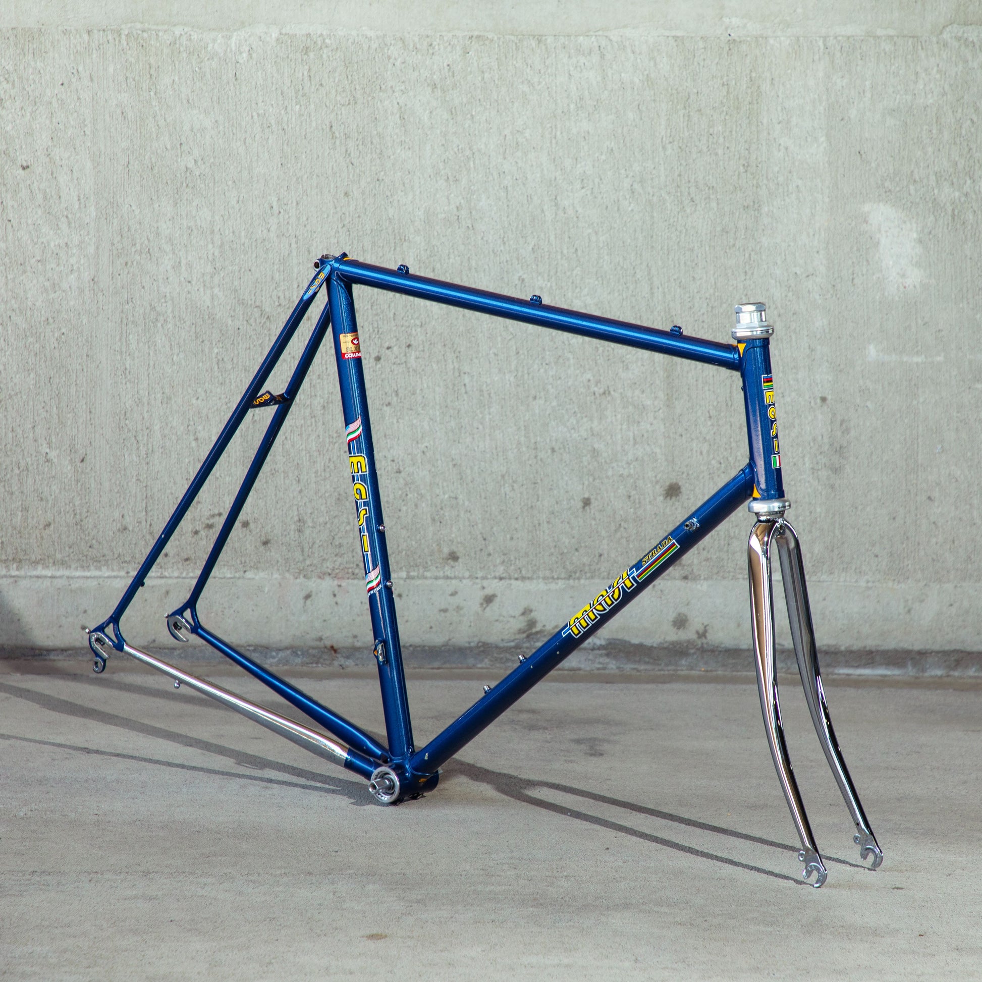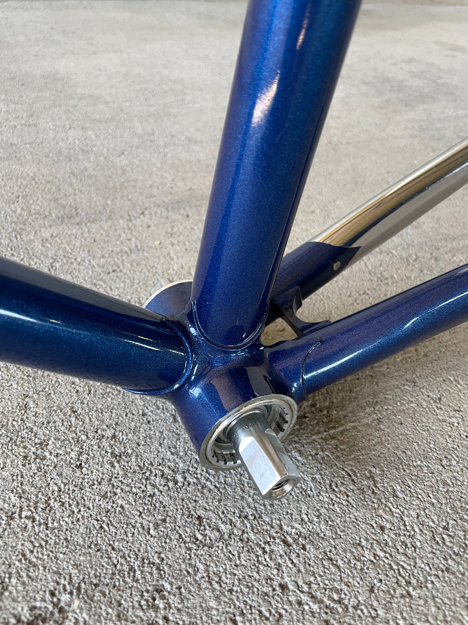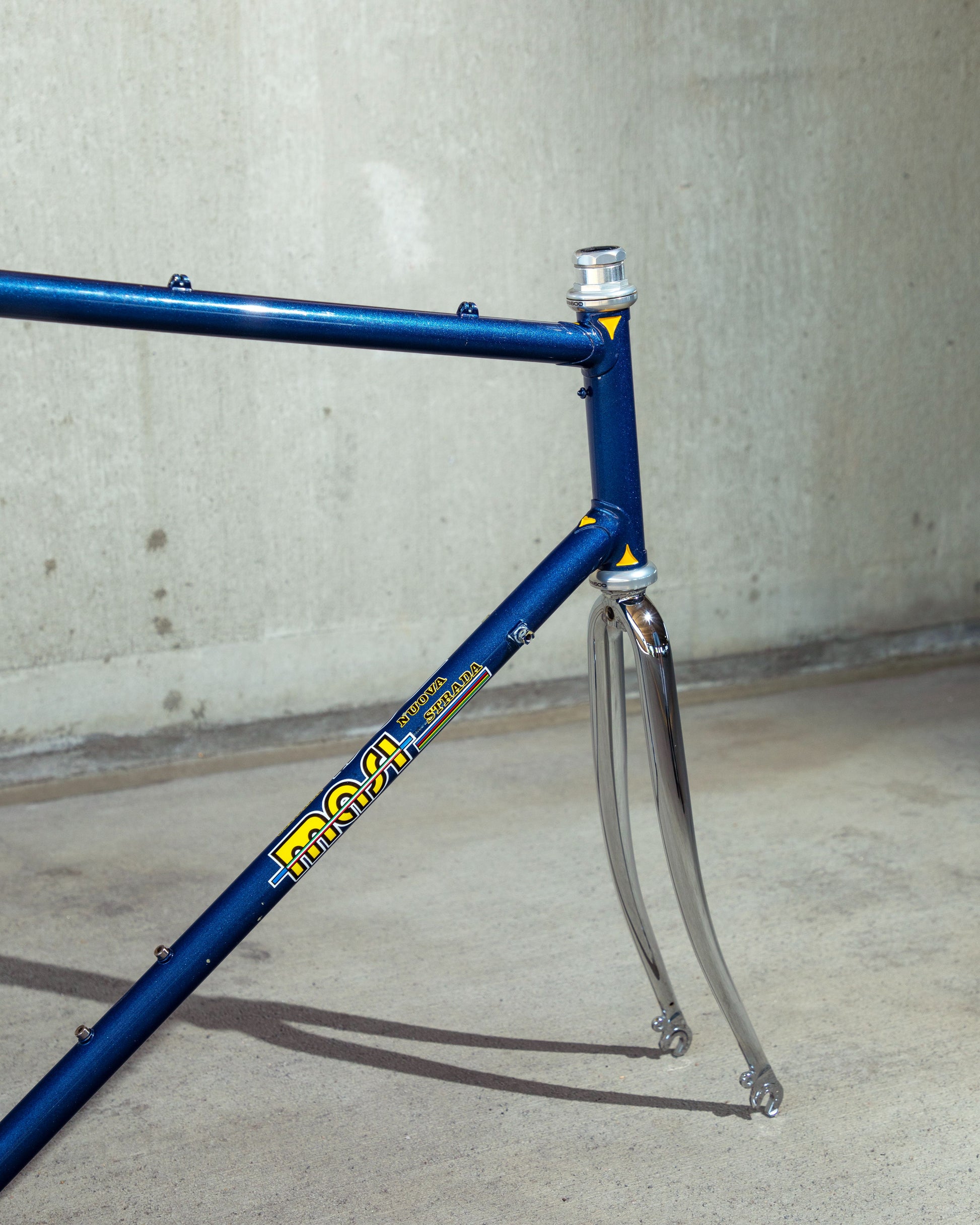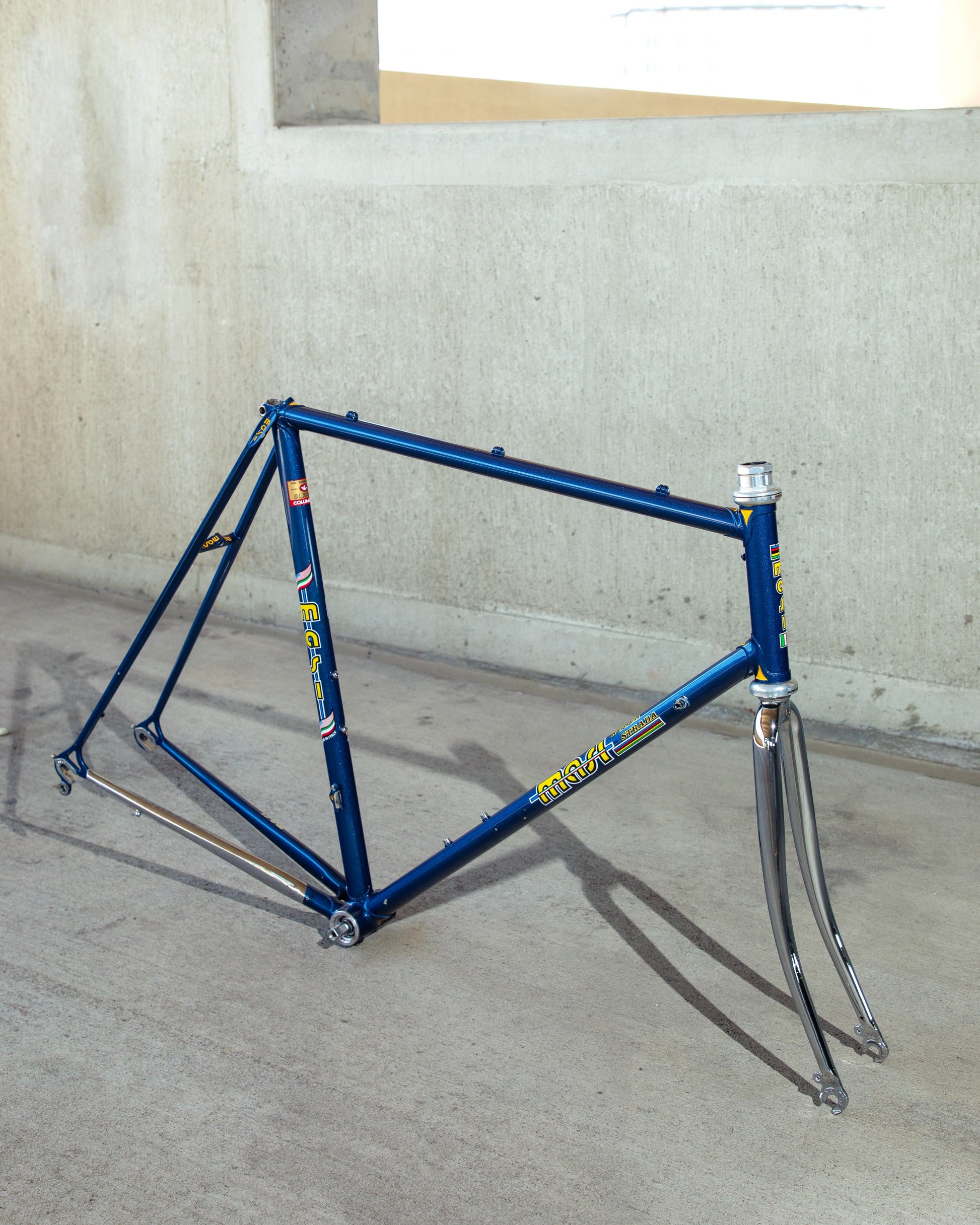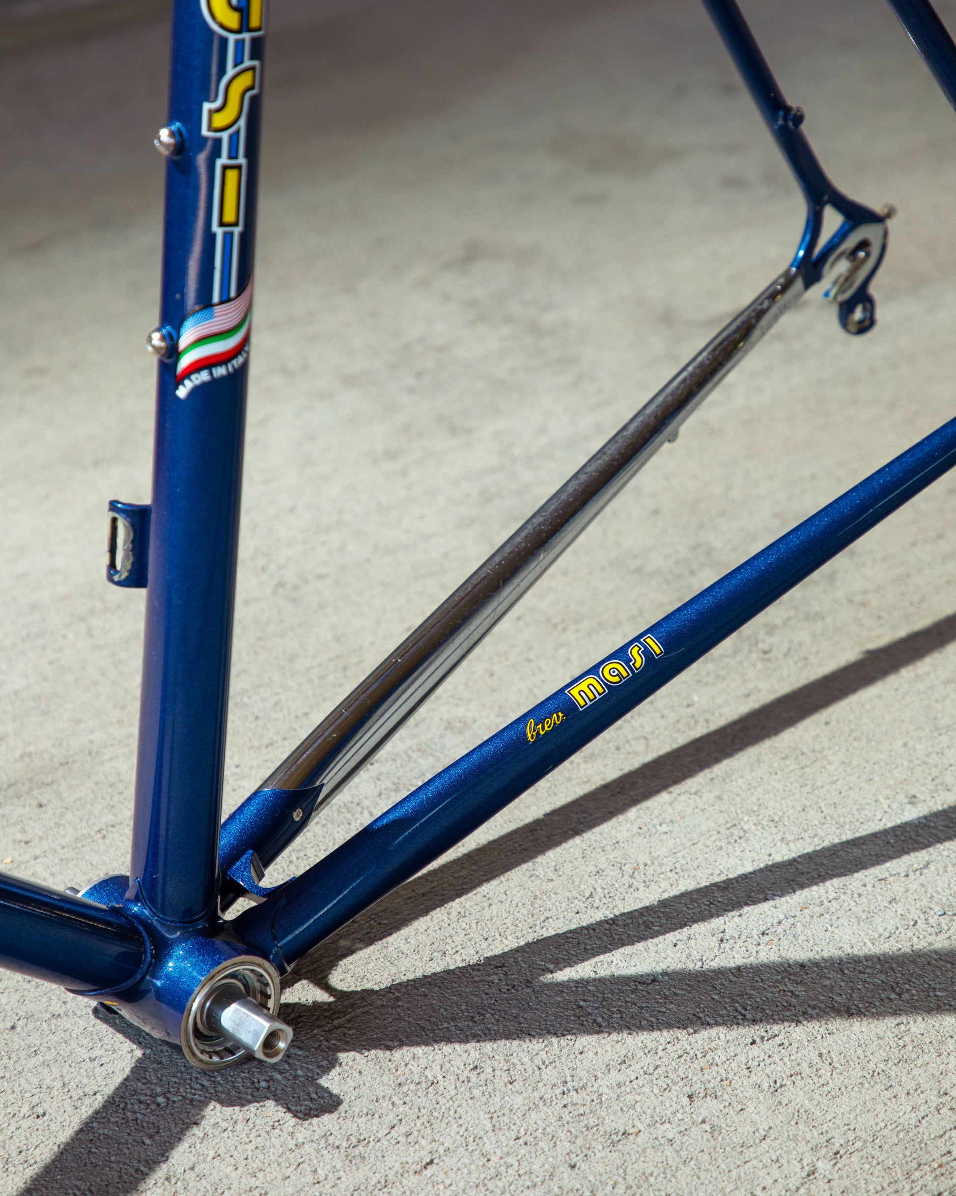 This Masi Nuovo Strada frame comes finished in a deep, metallic blue with contrasting chrome fork. It's Gorgeous! The more you look, the cooler the frame gets. It's full of subtle details like the engravings on the brake bridge and seat stay caps. It comes with a Shimano 600 headset and Dura-Ace bottom bracket, both feel great. I don't think the fork is original, and there's some paint that has started to crack on the head tube lugs so I assume the bike was in a small front end collision at some point in its life. The fork spins freely full 360 degrees so I don't think the frame is bent and deemed safe to ride. No dents!