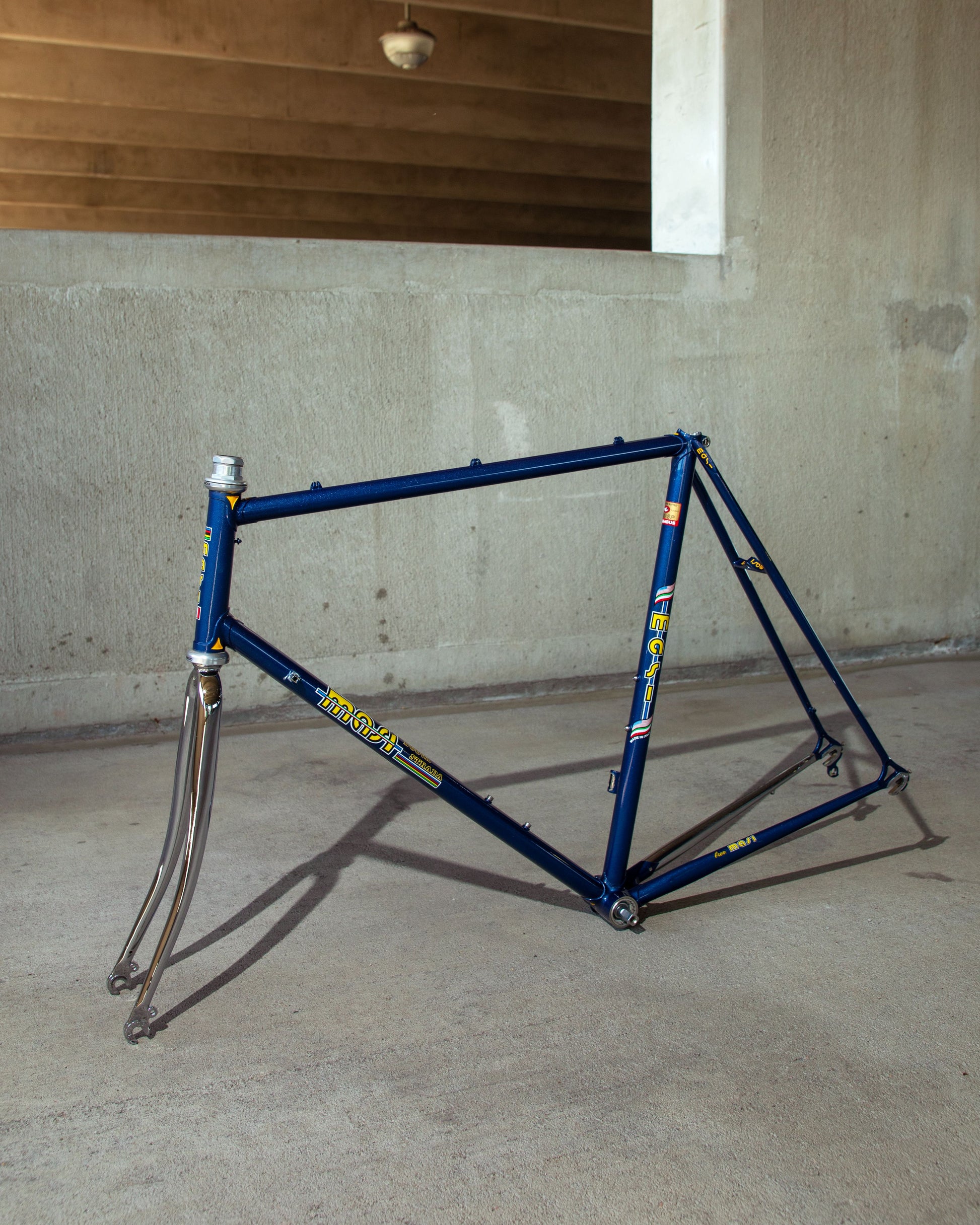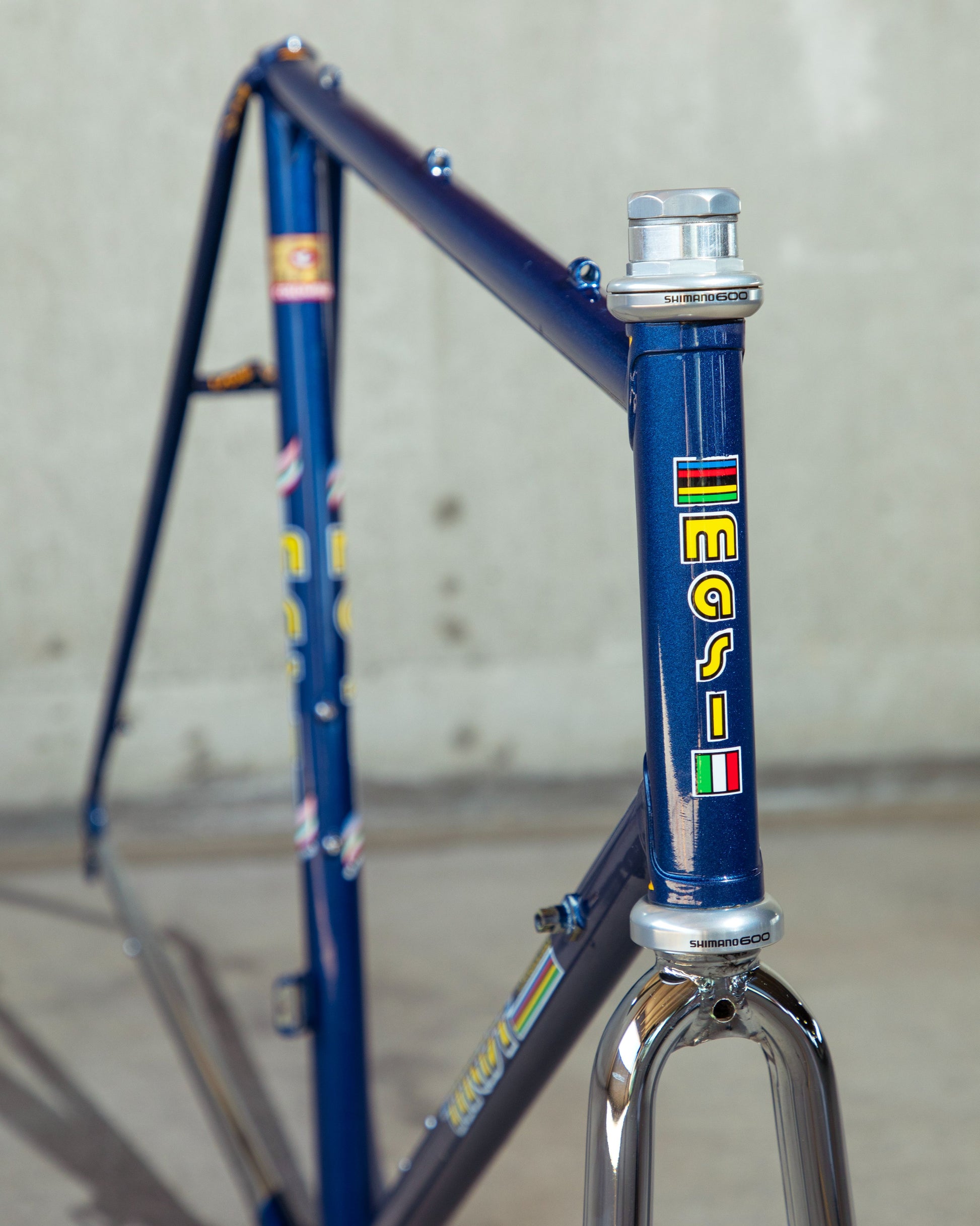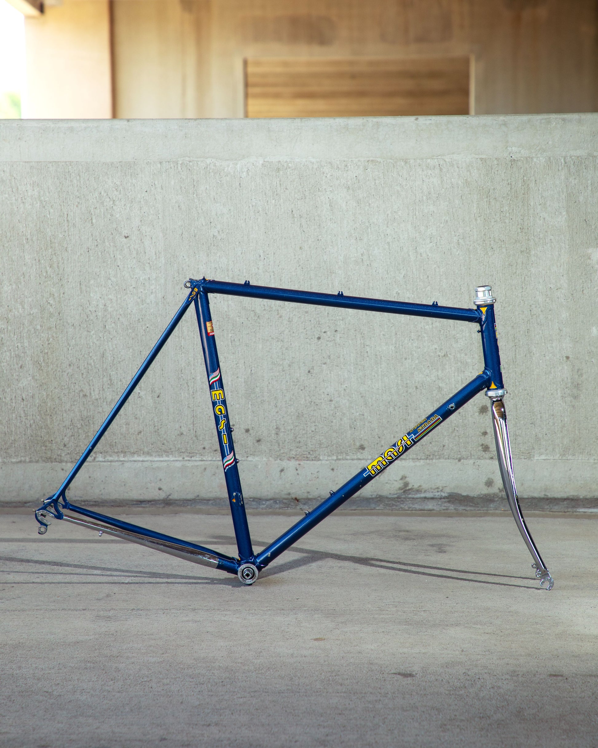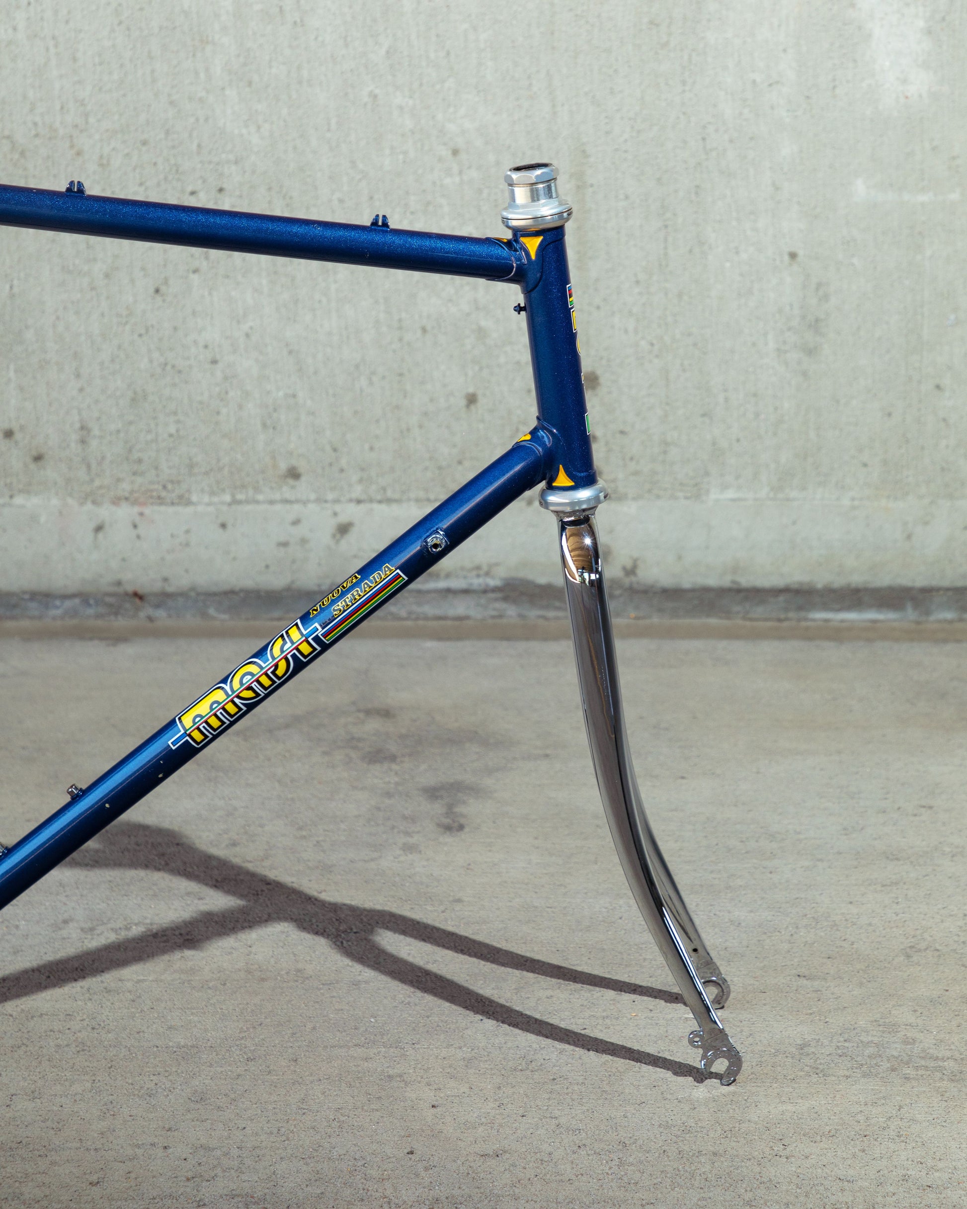 This Masi Nuovo Strada frame comes finished in a deep, metallic blue with contrasting chrome fork. It's Gorgeous! The more you look, the cooler the frame gets. It's full of subtle details like the engravings on the brake bridge and seat stay caps. It comes with a Shimano 600 headset and Dura-Ace bottom bracket, both feel great. I don't think the fork is original, and there's some paint that has started to crack on the head tube lugs so I assume the bike was in a small front end collision at some point in its life. The fork spins freely full 360 degrees so I don't think the frame is bent and deemed safe to ride. No dents!
