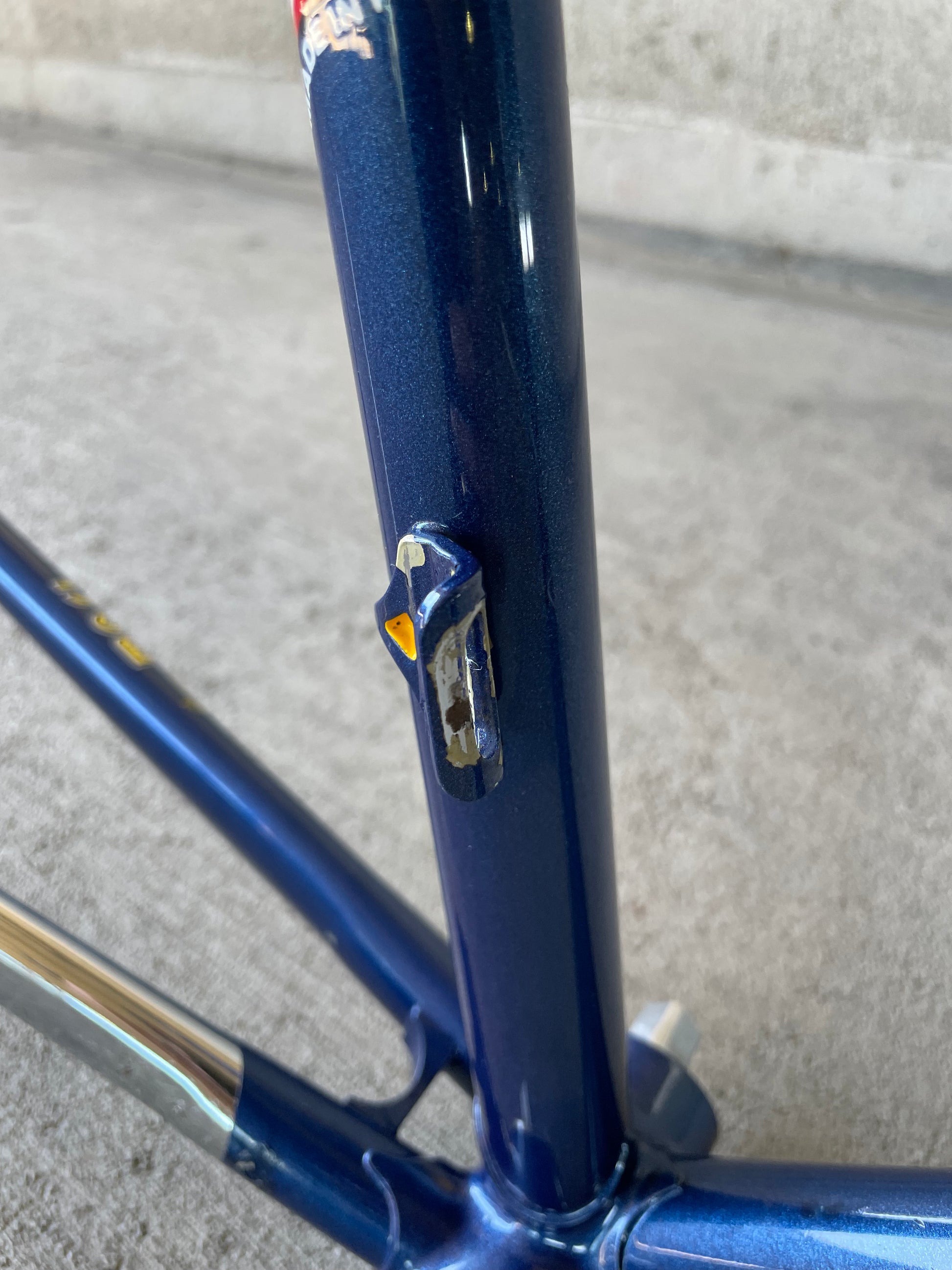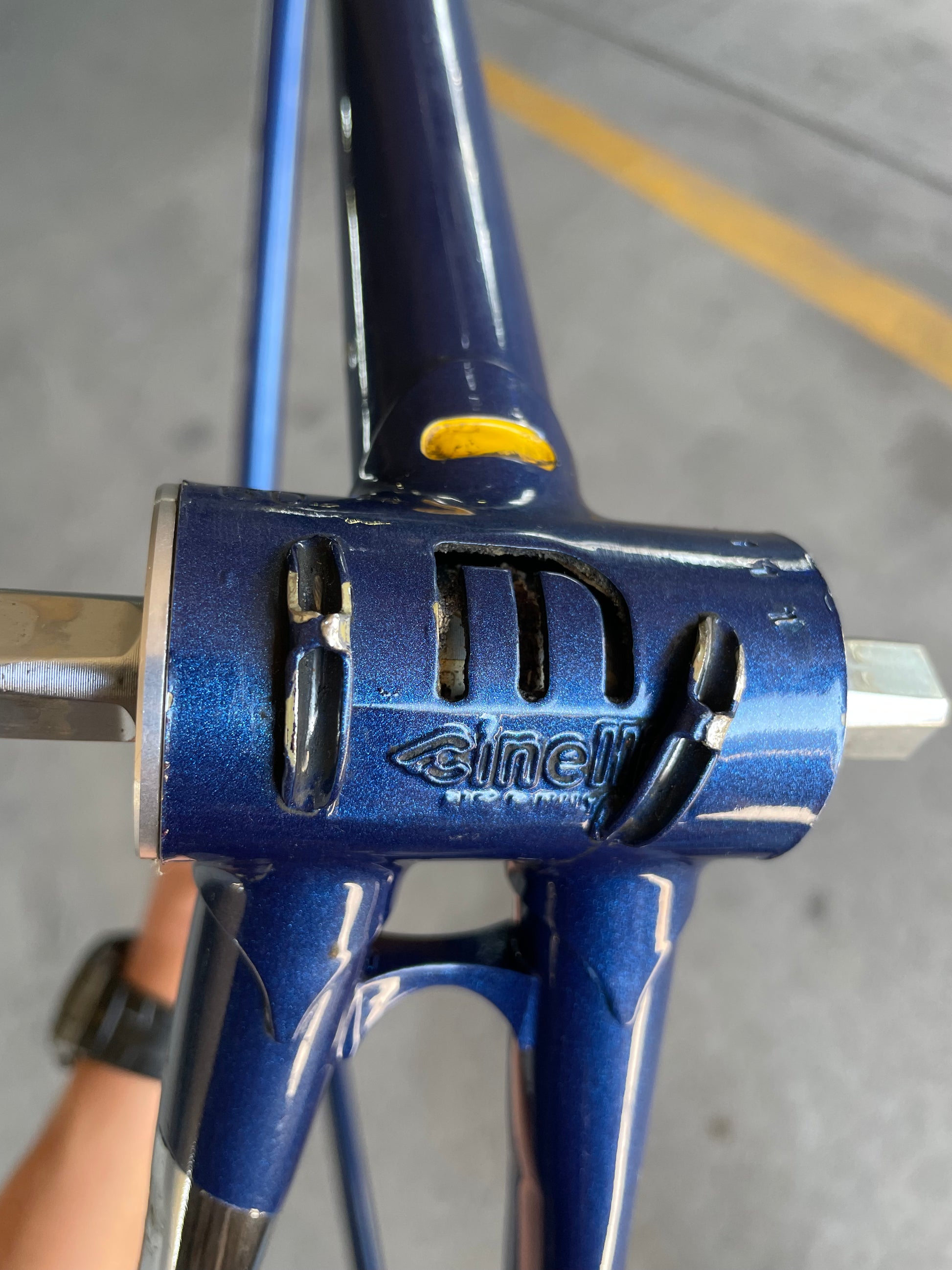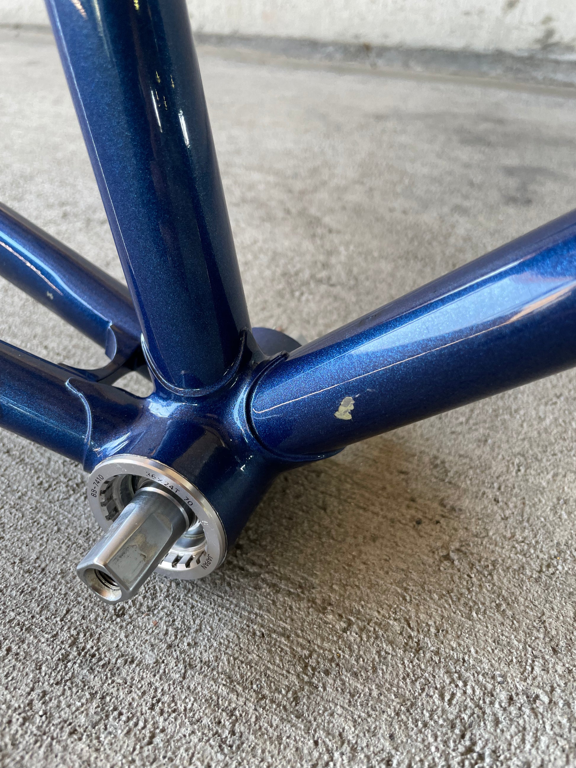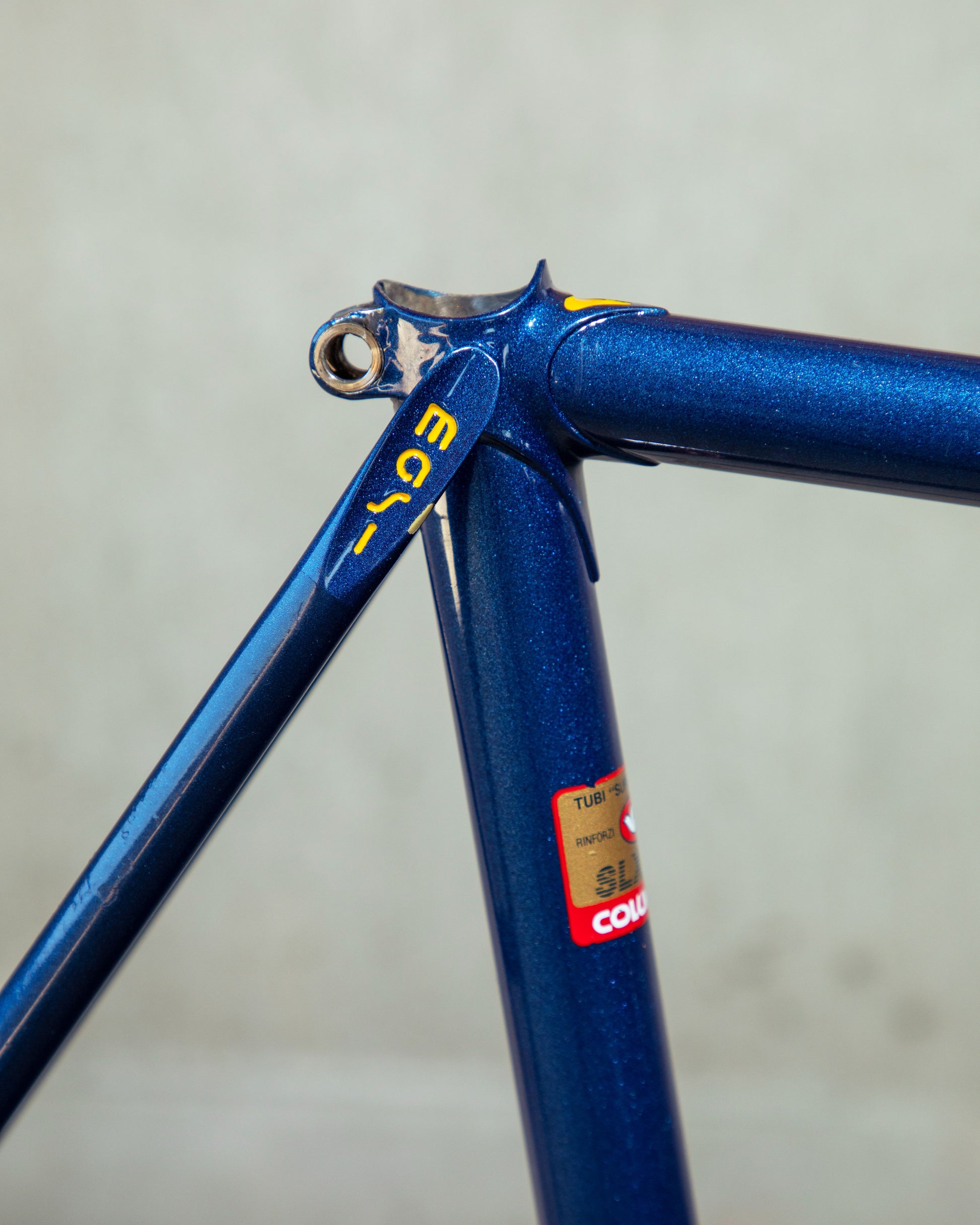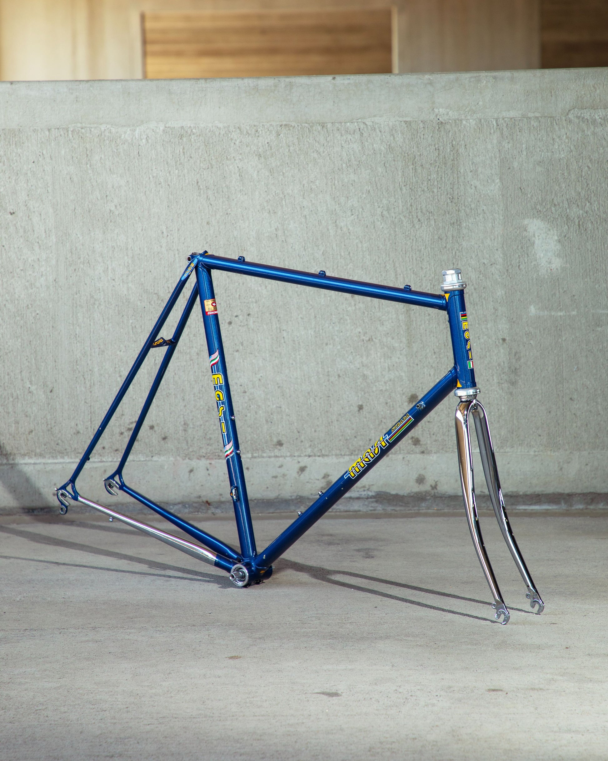 This Masi Nuovo Strada frame comes finished in a deep, metallic blue with contrasting chrome fork. It's Gorgeous! The more you look, the cooler the frame gets. It's full of subtle details like the engravings on the brake bridge and seat stay caps. It comes with a Shimano 600 headset and Dura-Ace bottom bracket, both feel great. I don't think the fork is original, and there's some paint that has started to crack on the head tube lugs so I assume the bike was in a small front end collision at some point in its life. The fork spins freely full 360 degrees so I don't think the frame is bent and deemed safe to ride. No dents!