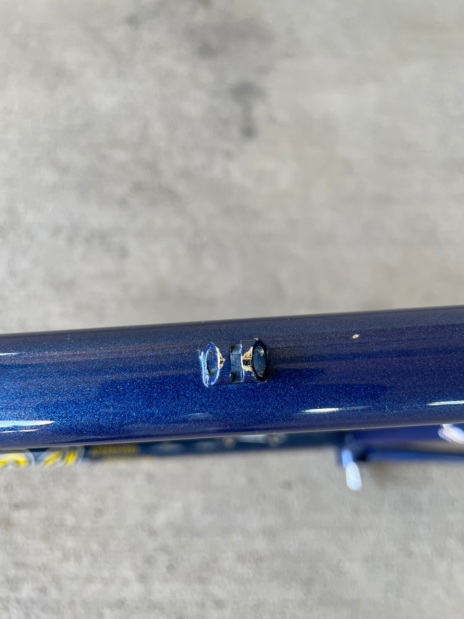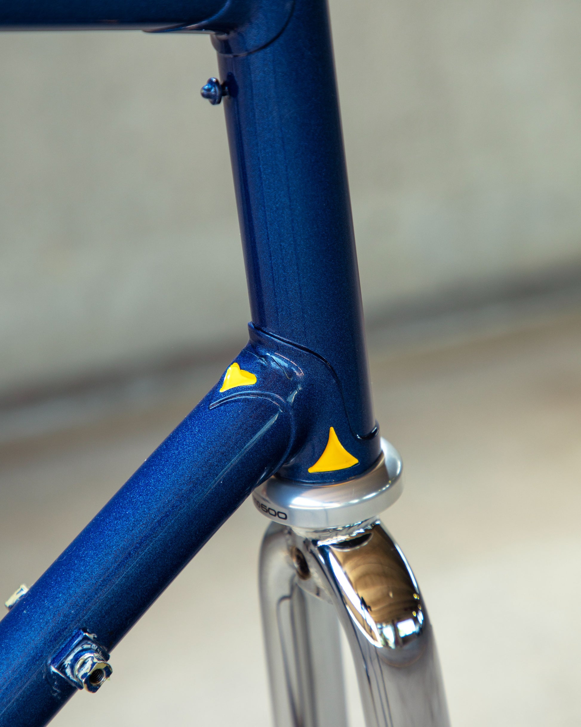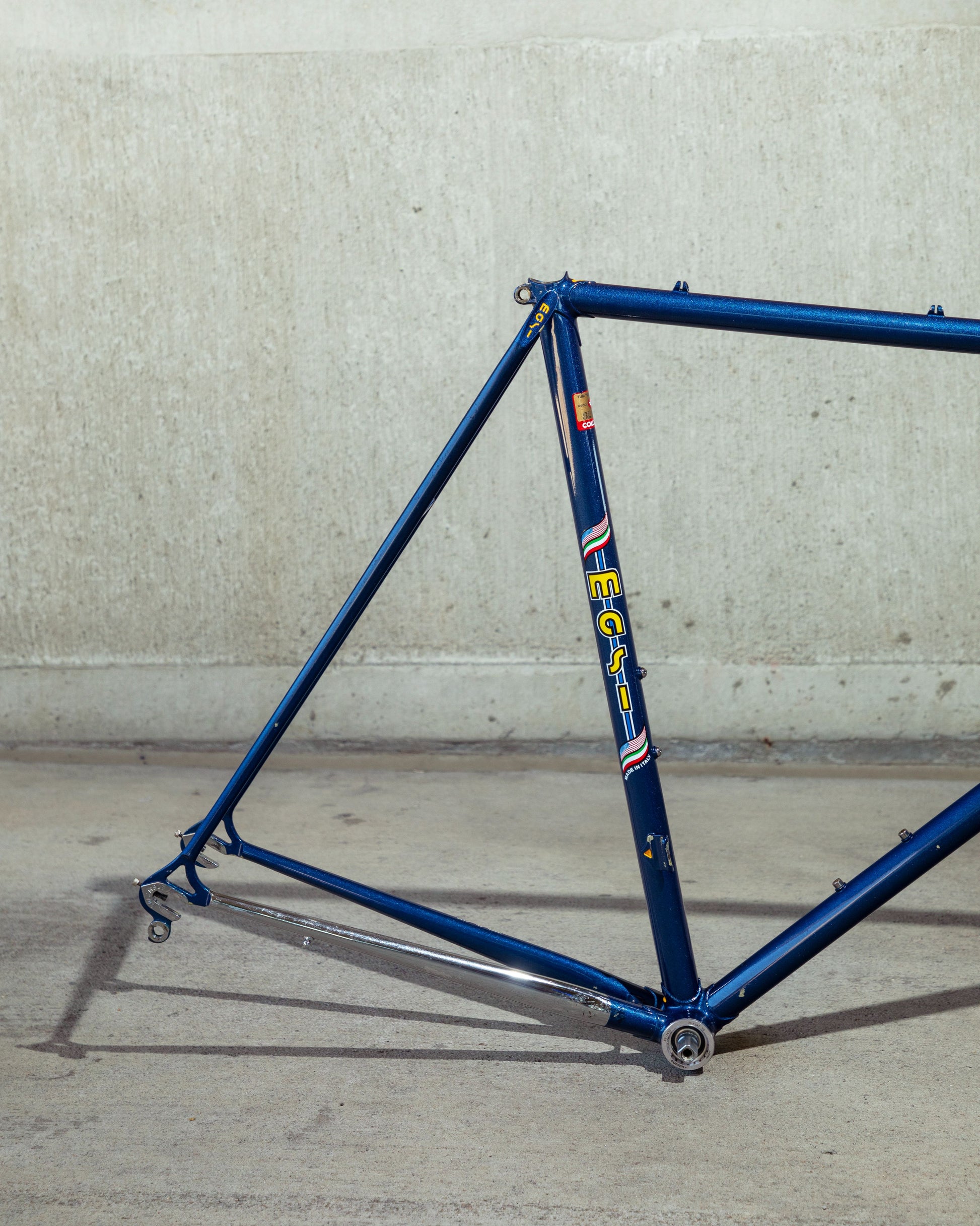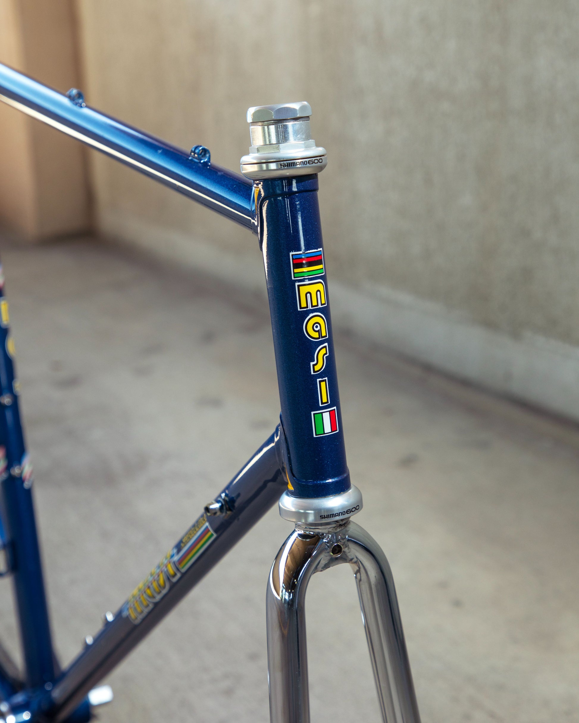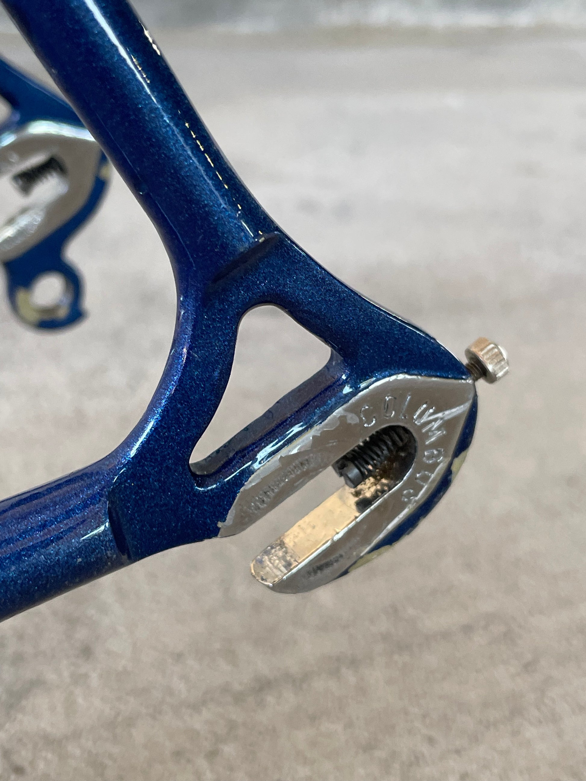 This Masi Nuovo Strada frame comes finished in a deep, metallic blue with contrasting chrome fork. It's Gorgeous! The more you look, the cooler the frame gets. It's full of subtle details like the engravings on the brake bridge and seat stay caps. It comes with a Shimano 600 headset and Dura-Ace bottom bracket, both feel great. I don't think the fork is original, and there's some paint that has started to crack on the head tube lugs so I assume the bike was in a small front end collision at some point in its life. The fork spins freely full 360 degrees so I don't think the frame is bent and deemed safe to ride. No dents!