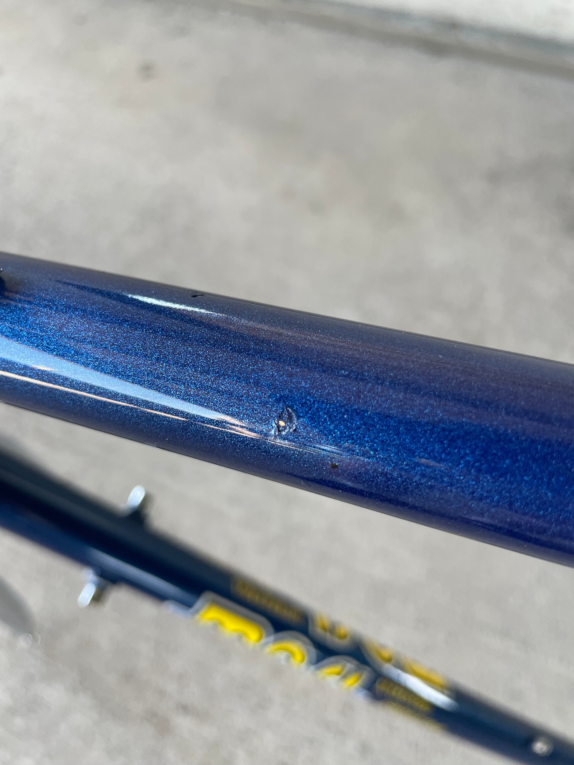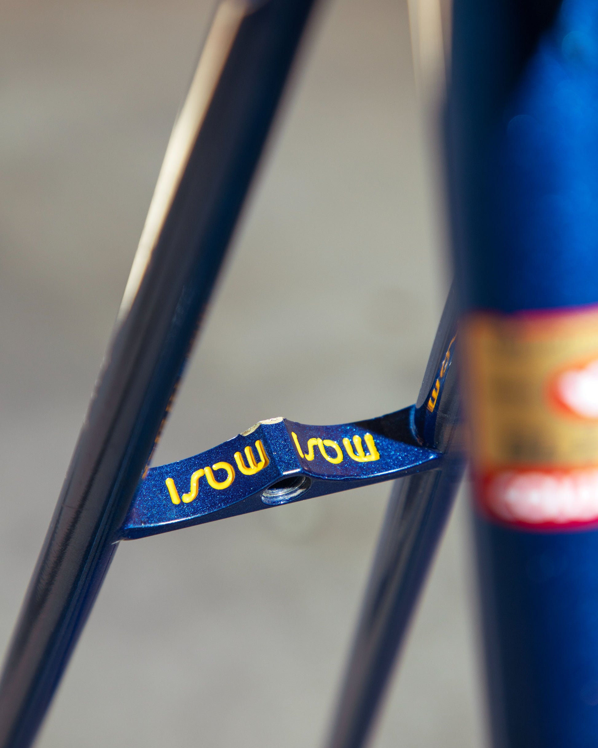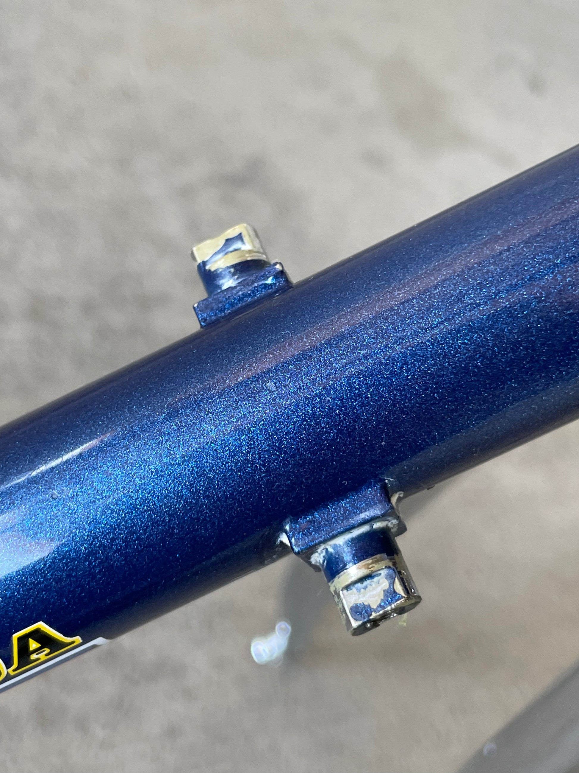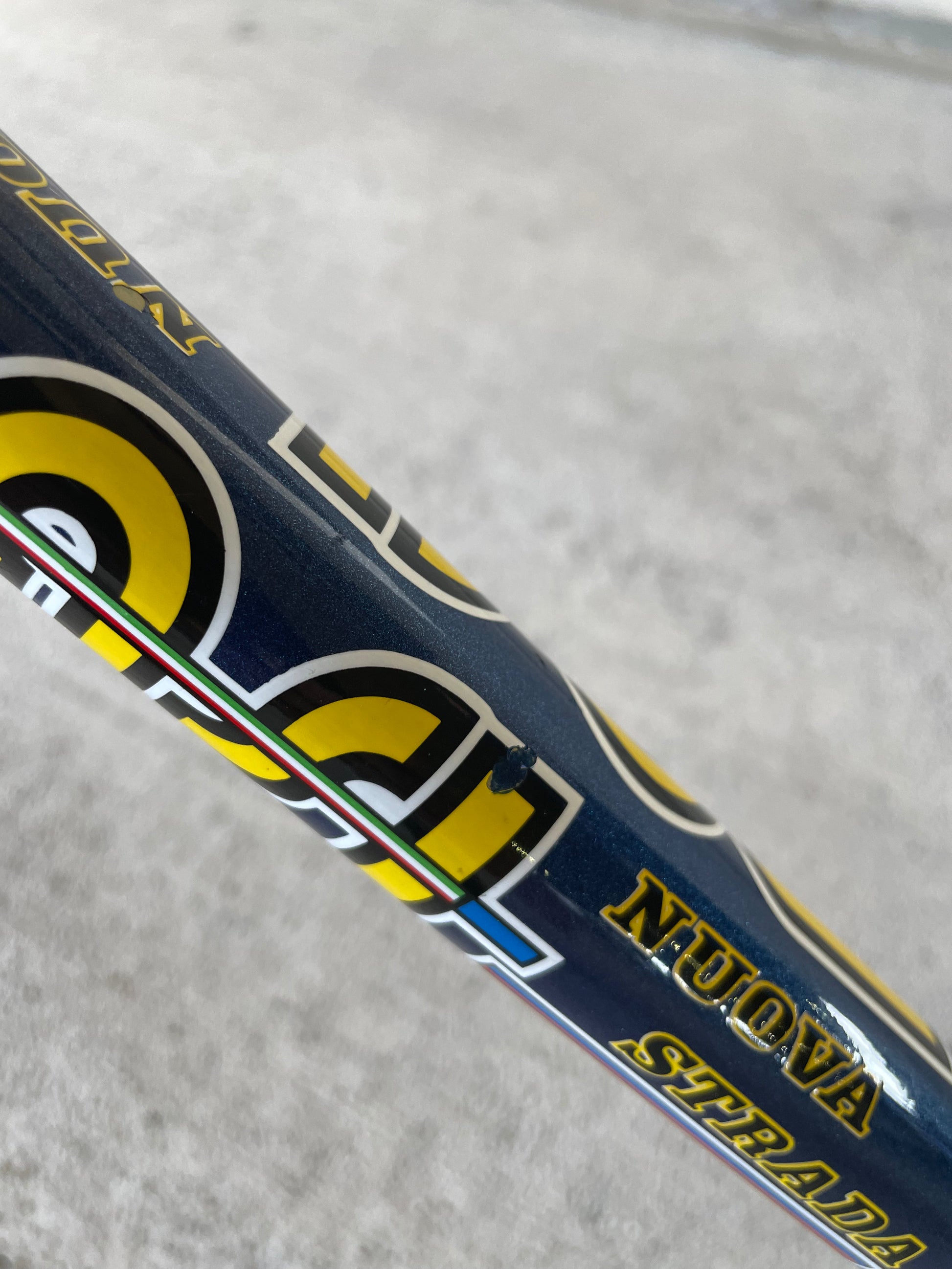 This Masi Nuovo Strada frame comes finished in a deep, metallic blue with contrasting chrome fork. It's Gorgeous! The more you look, the cooler the frame gets. It's full of subtle details like the engravings on the brake bridge and seat stay caps. It comes with a Shimano 600 headset and Dura-Ace bottom bracket, both feel great. I don't think the fork is original, and there's some paint that has started to crack on the head tube lugs so I assume the bike was in a small front end collision at some point in its life. The fork spins freely full 360 degrees so I don't think the frame is bent and deemed safe to ride. No dents!