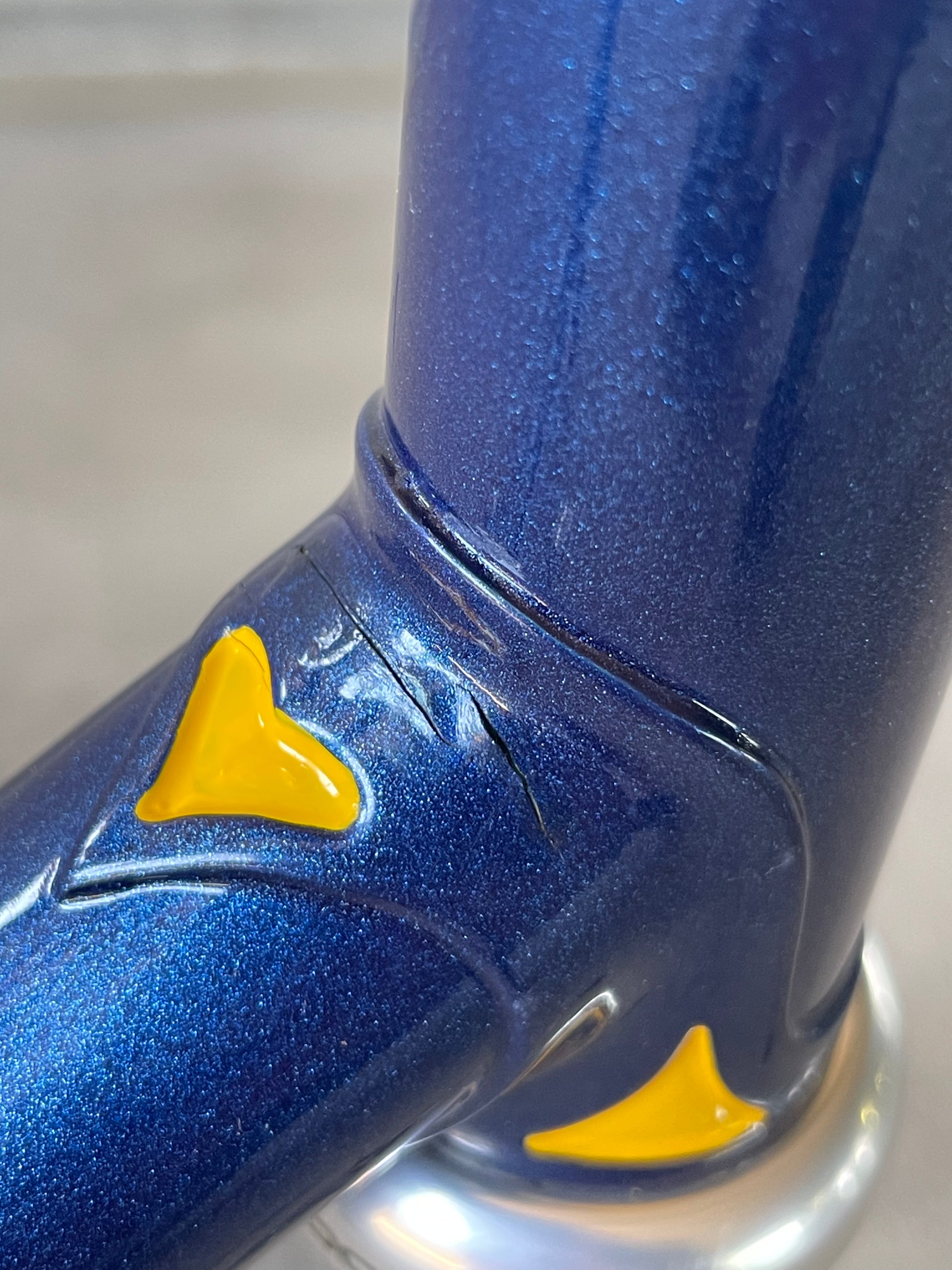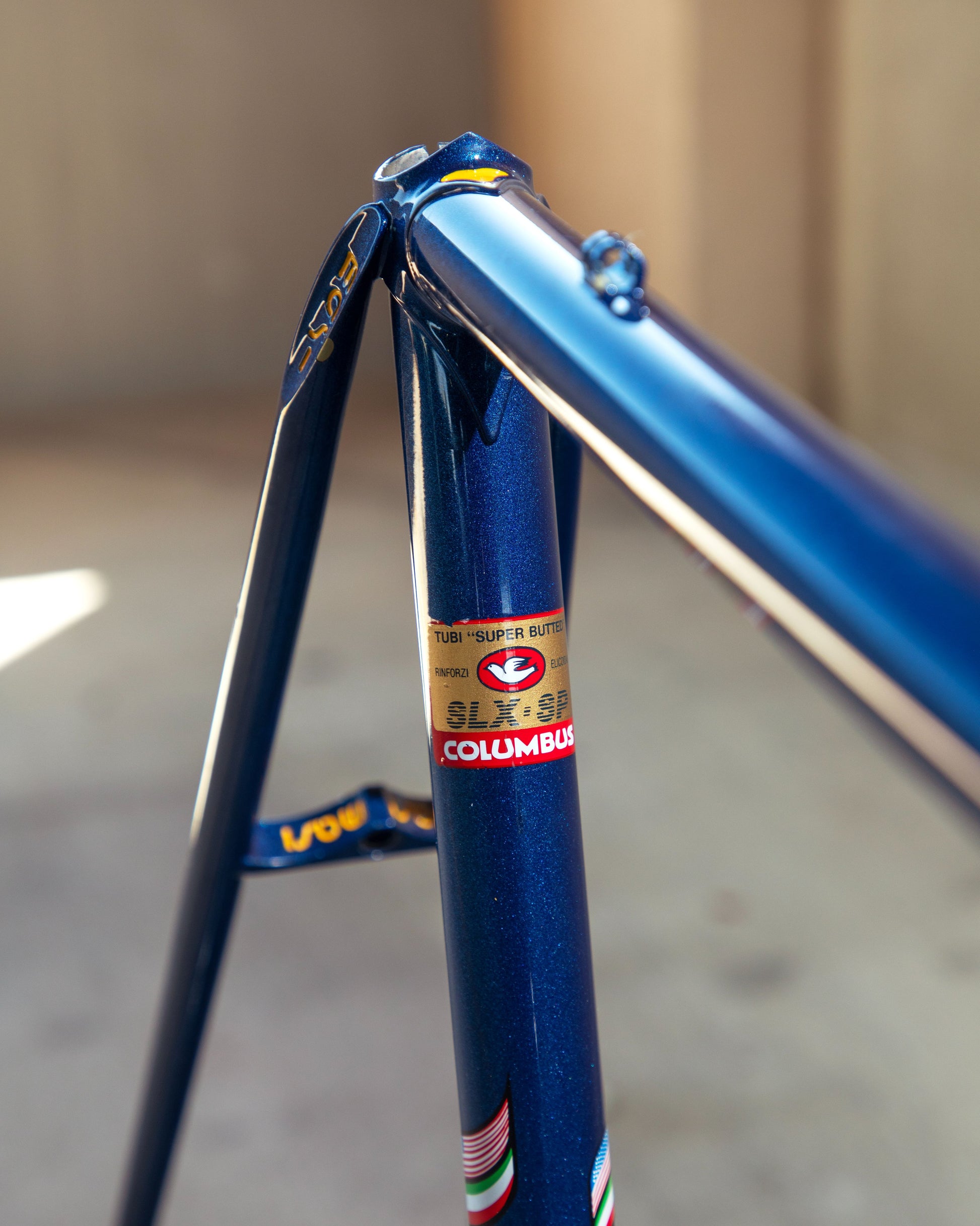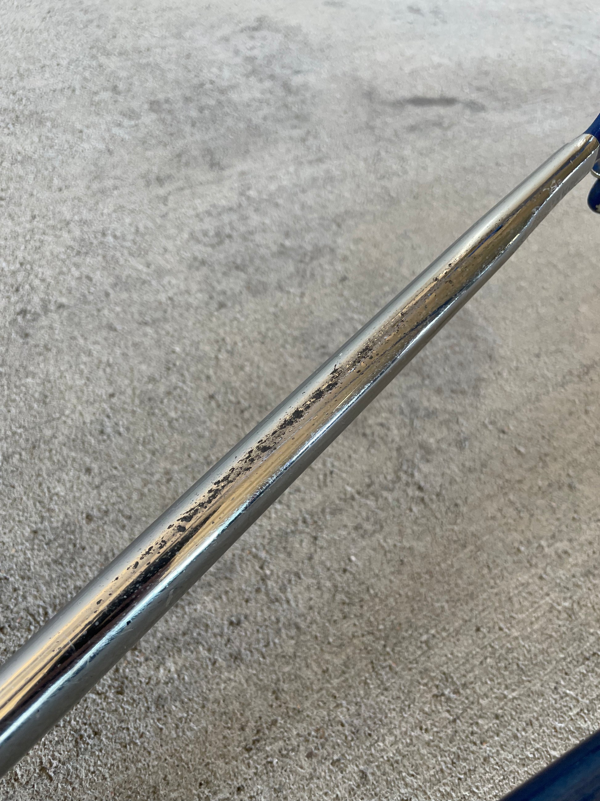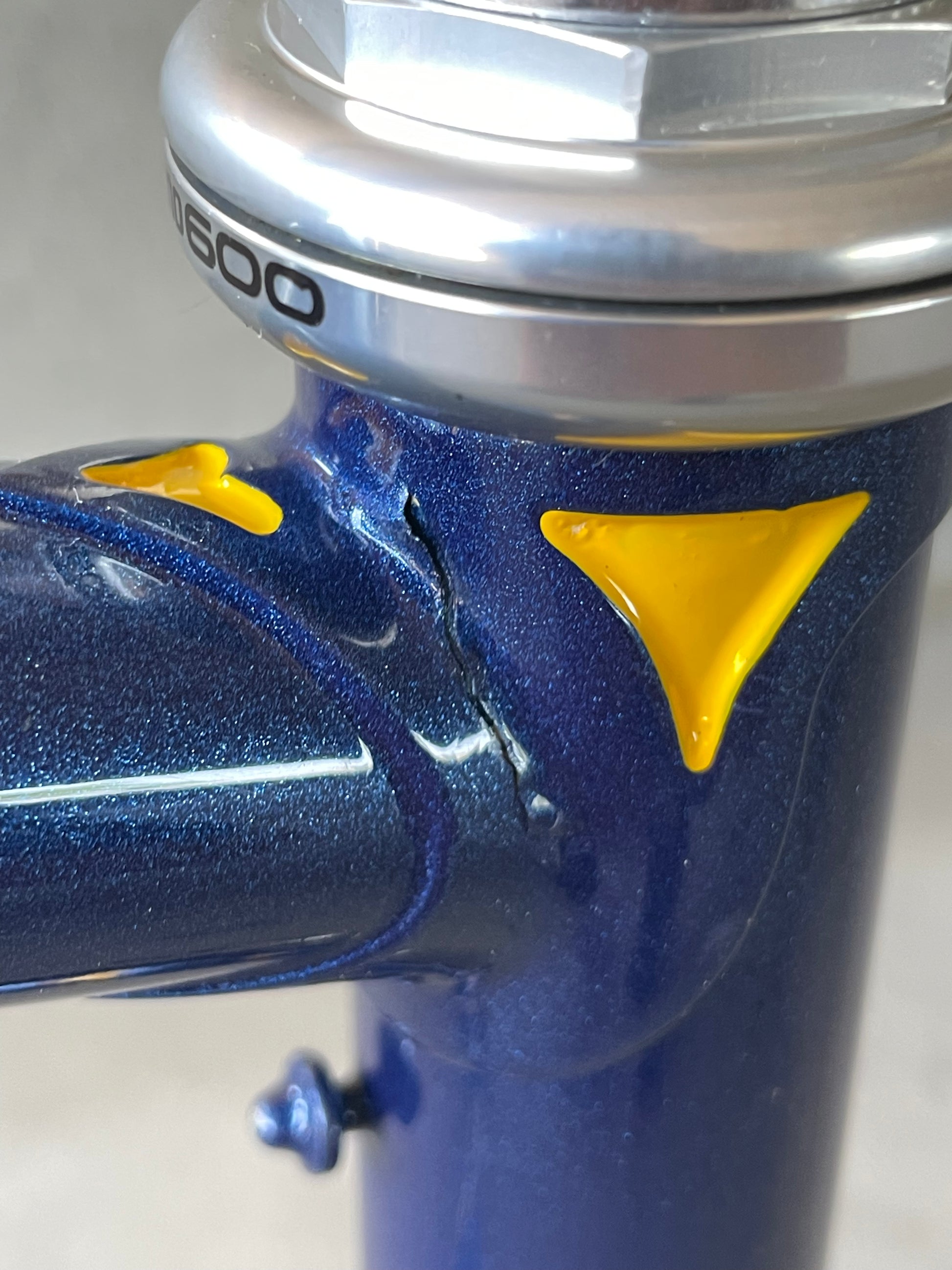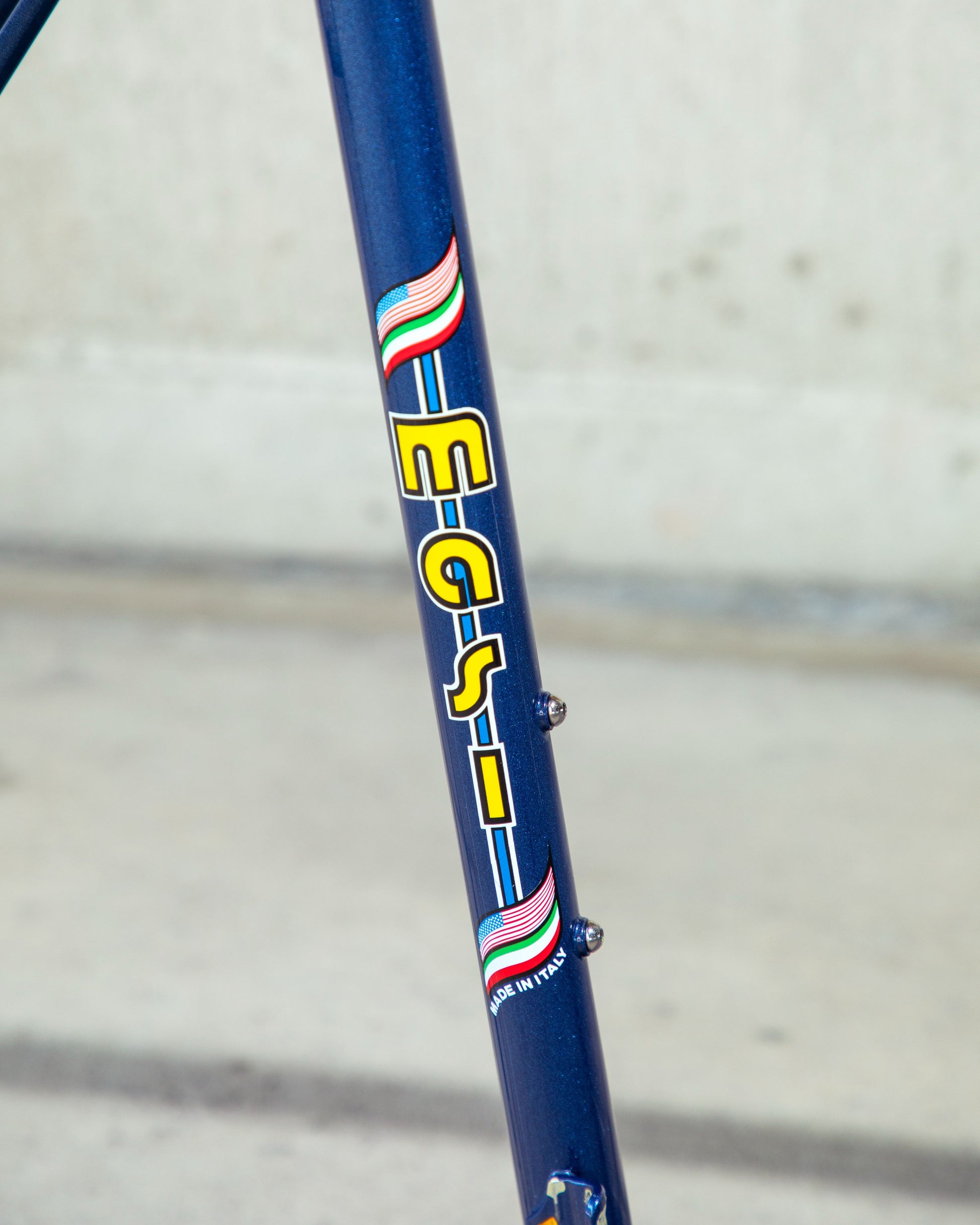 This Masi Nuovo Strada frame comes finished in a deep, metallic blue with contrasting chrome fork. It's Gorgeous! The more you look, the cooler the frame gets. It's full of subtle details like the engravings on the brake bridge and seat stay caps. It comes with a Shimano 600 headset and Dura-Ace bottom bracket, both feel great. I don't think the fork is original, and there's some paint that has started to crack on the head tube lugs so I assume the bike was in a small front end collision at some point in its life. The fork spins freely full 360 degrees so I don't think the frame is bent and deemed safe to ride. No dents!