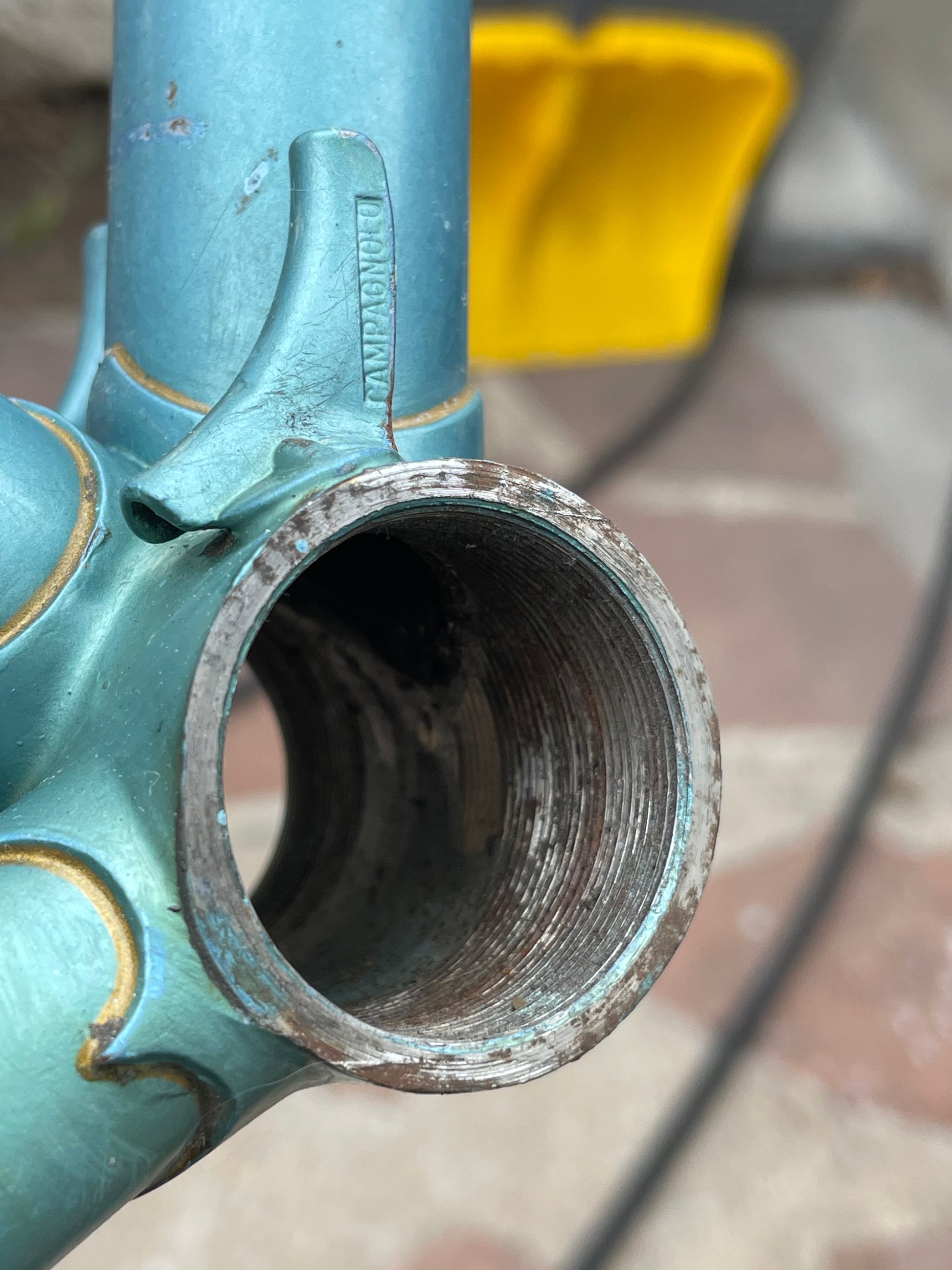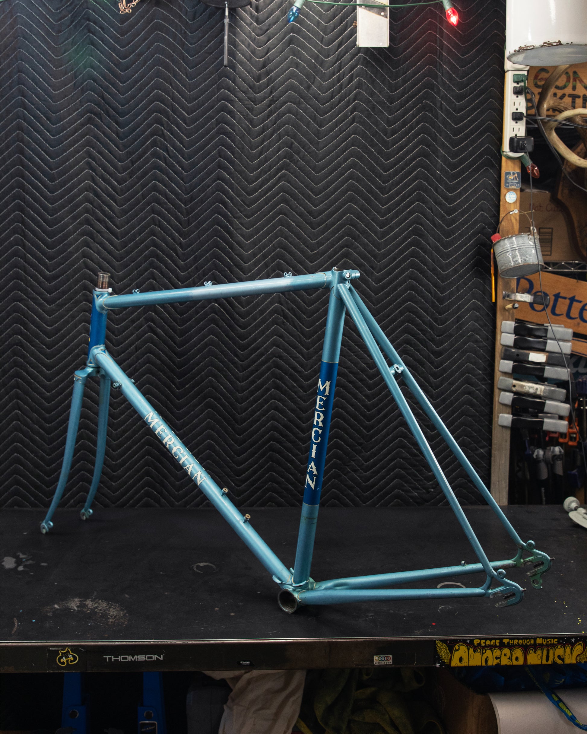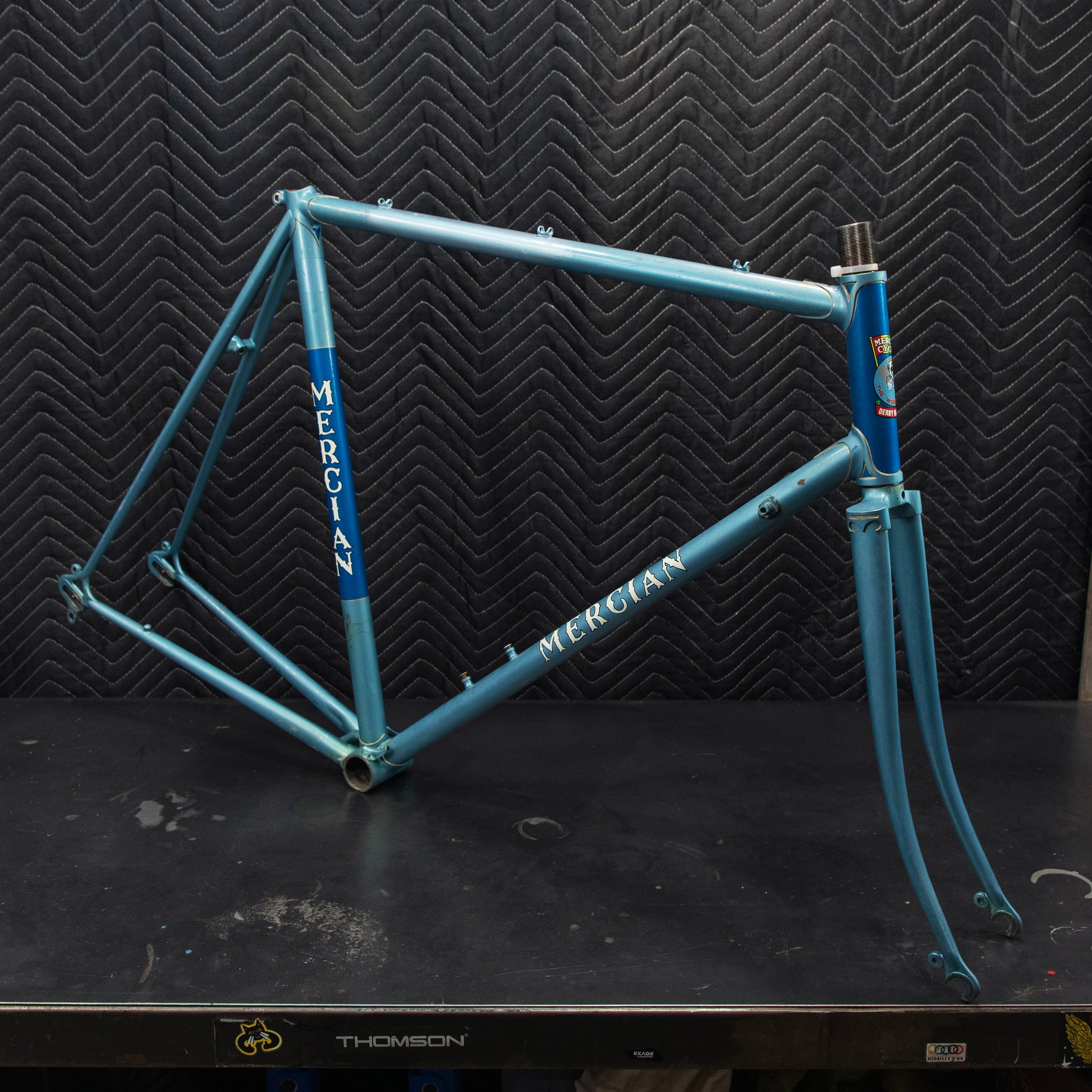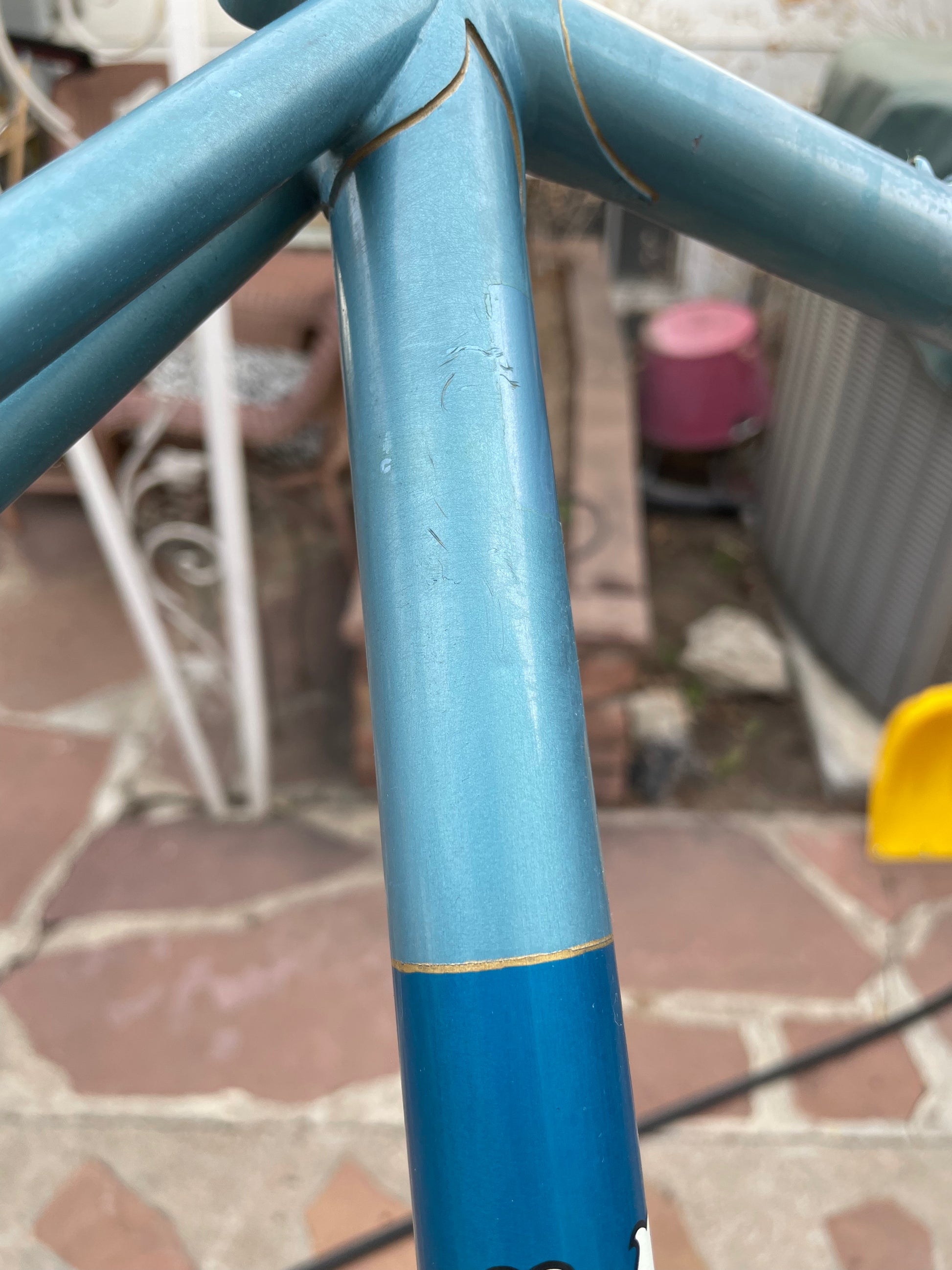 This vintage Mercian is gorgeous! The two tone blue is simple yet eye catching. It's in good condition, but shows sign of use. It had a dent in the top tube, but it was professionally repaired and then painted. The color match isn't perfect, but it's close. No cracks or bends. The bottom bracket threads are dirty but in good condition and not stripped. 531 tubing. Campagnolo dropouts. This was a very high end bike new.