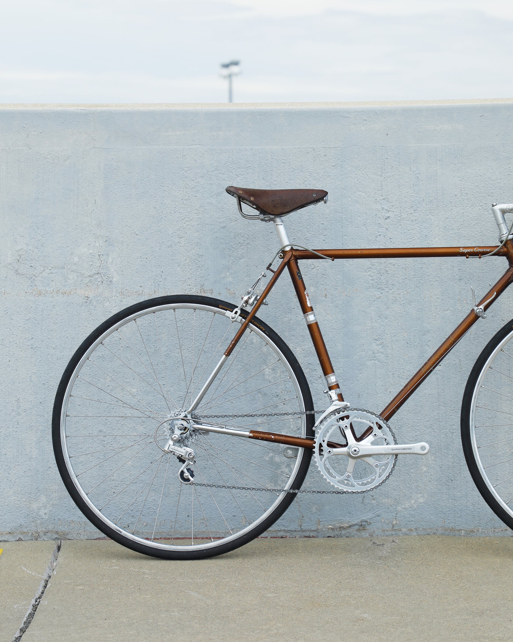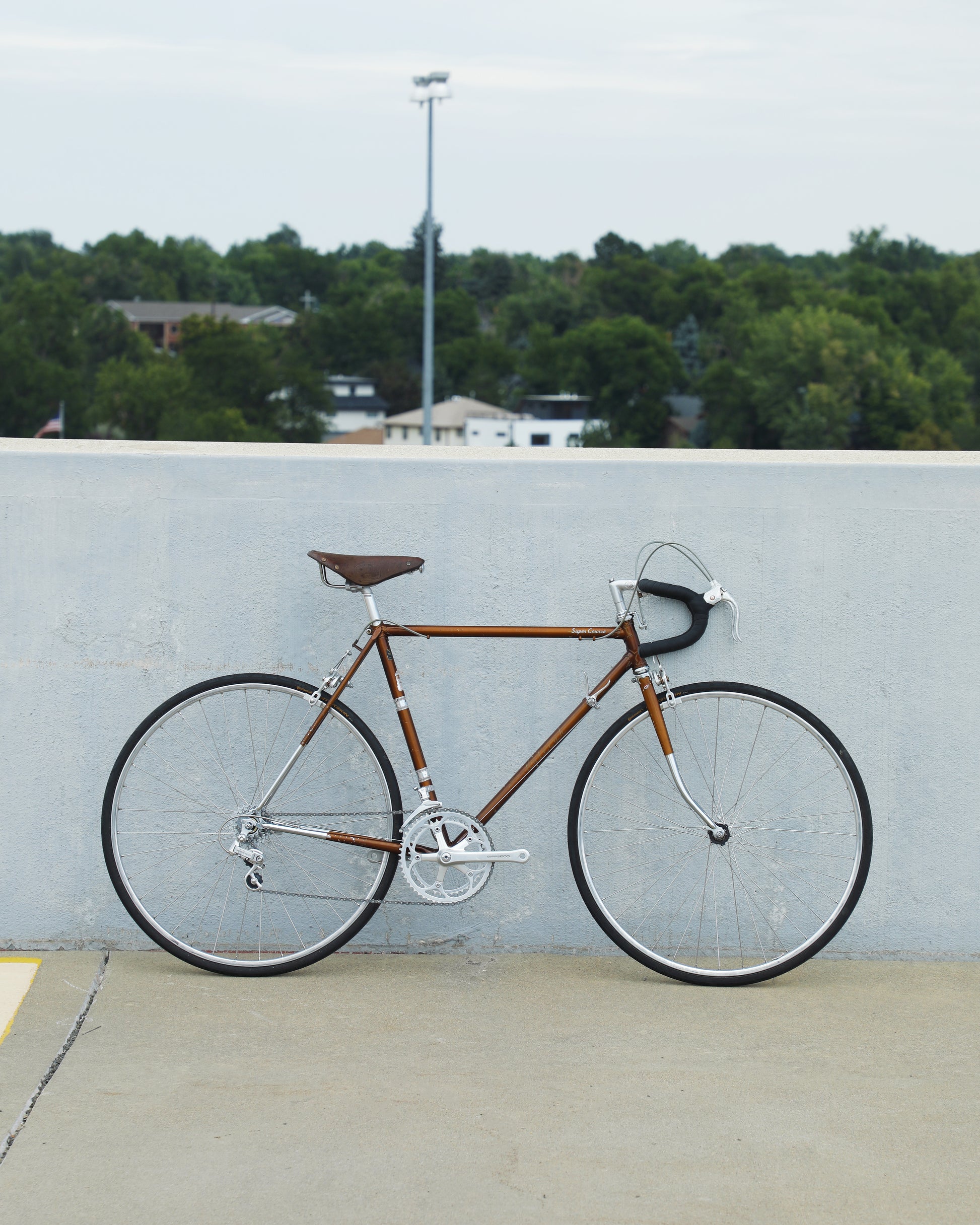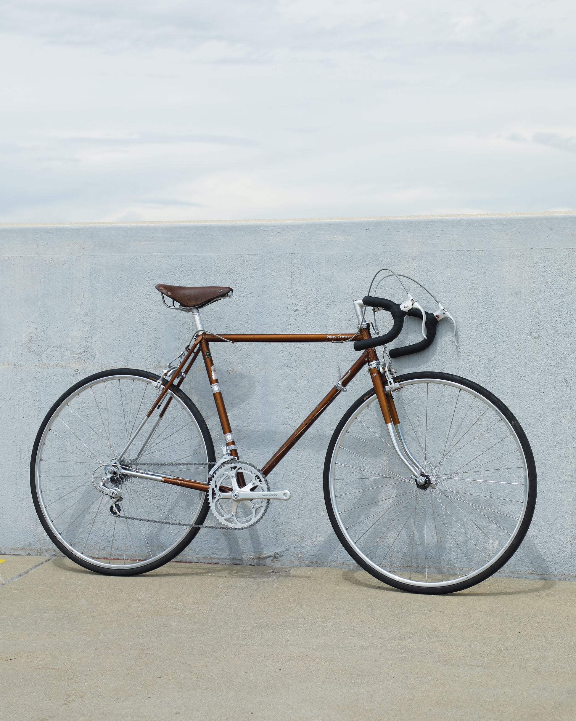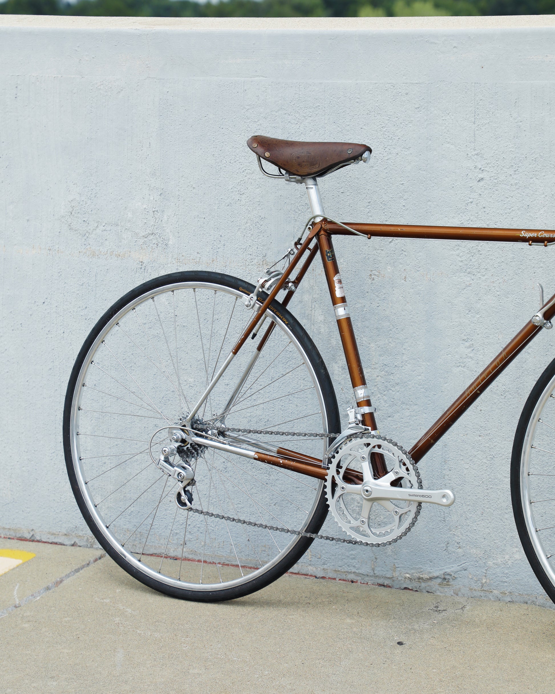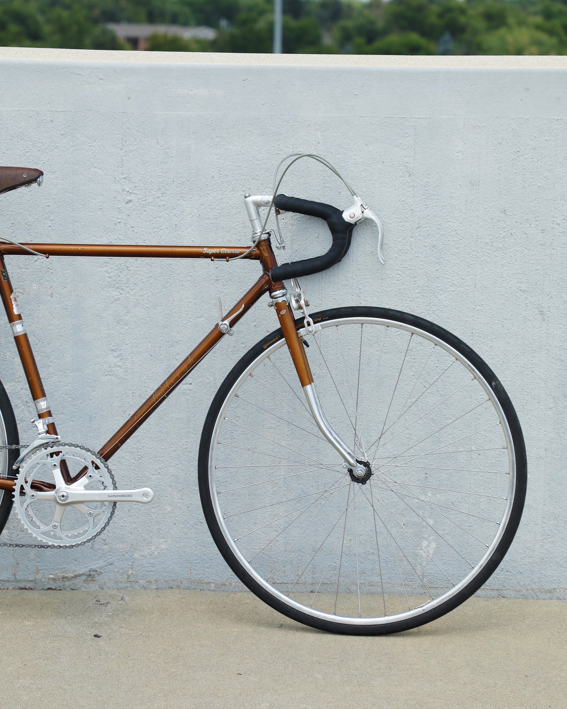 The Raleigh Super Course was one of the first mass produced "high end" bike. The main triangle is made with straight gauge Reynolds 531 tubing, which was mostly used on more high end bikes at the time. This early 1970's model is finished in a beautiful bronze. It also features some newer upgrades with the Shimano 600 front and rear derailleurs, crankset, and bottom bracket. This bike is in pretty good condition but it shows sign of use. There are some paint chips and scrapes here and there but no dents, bends, or cracks. It's a great rider!