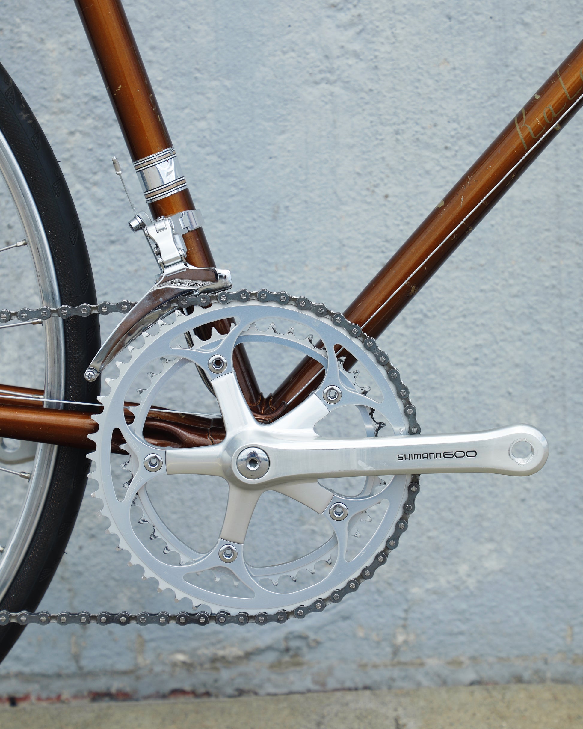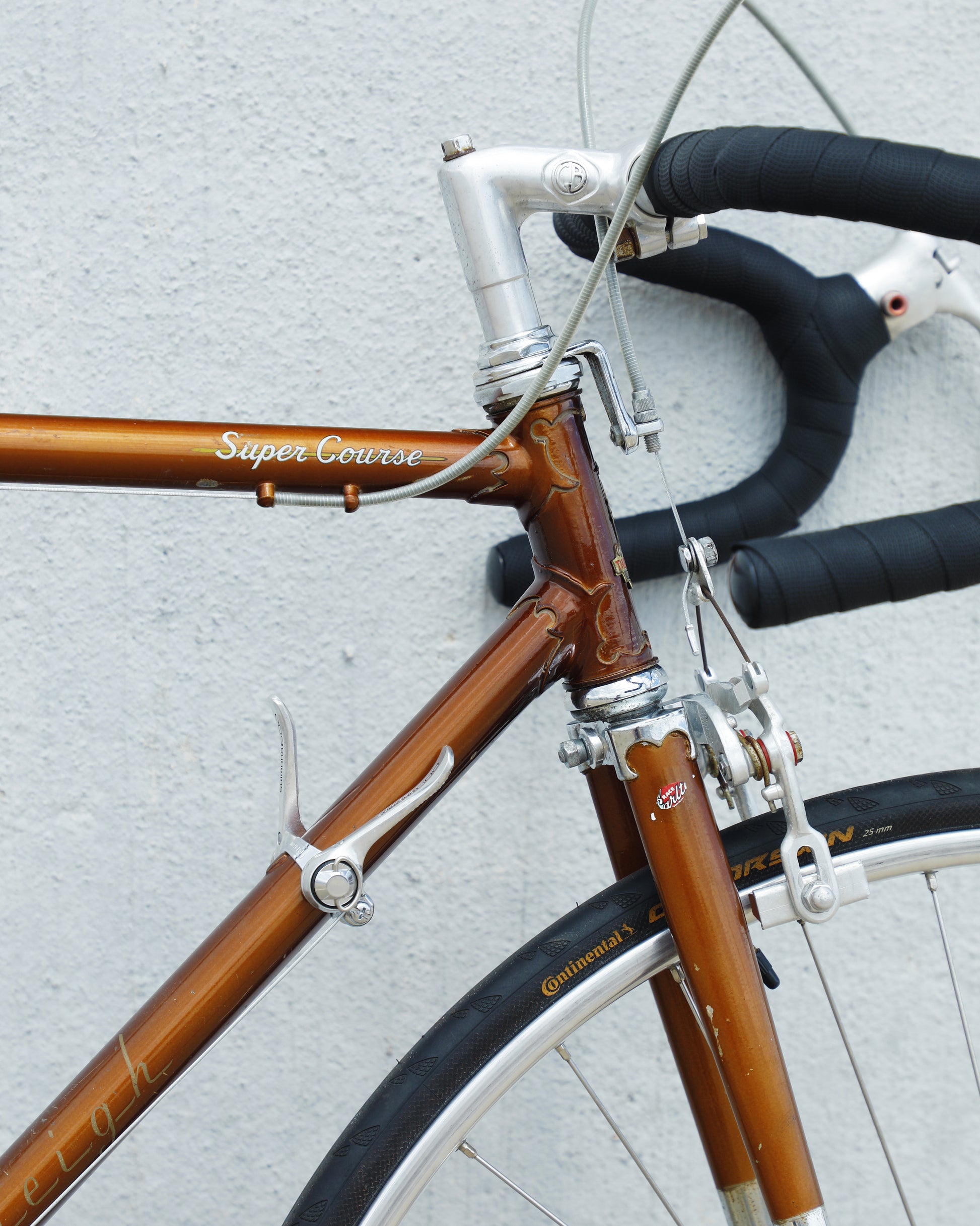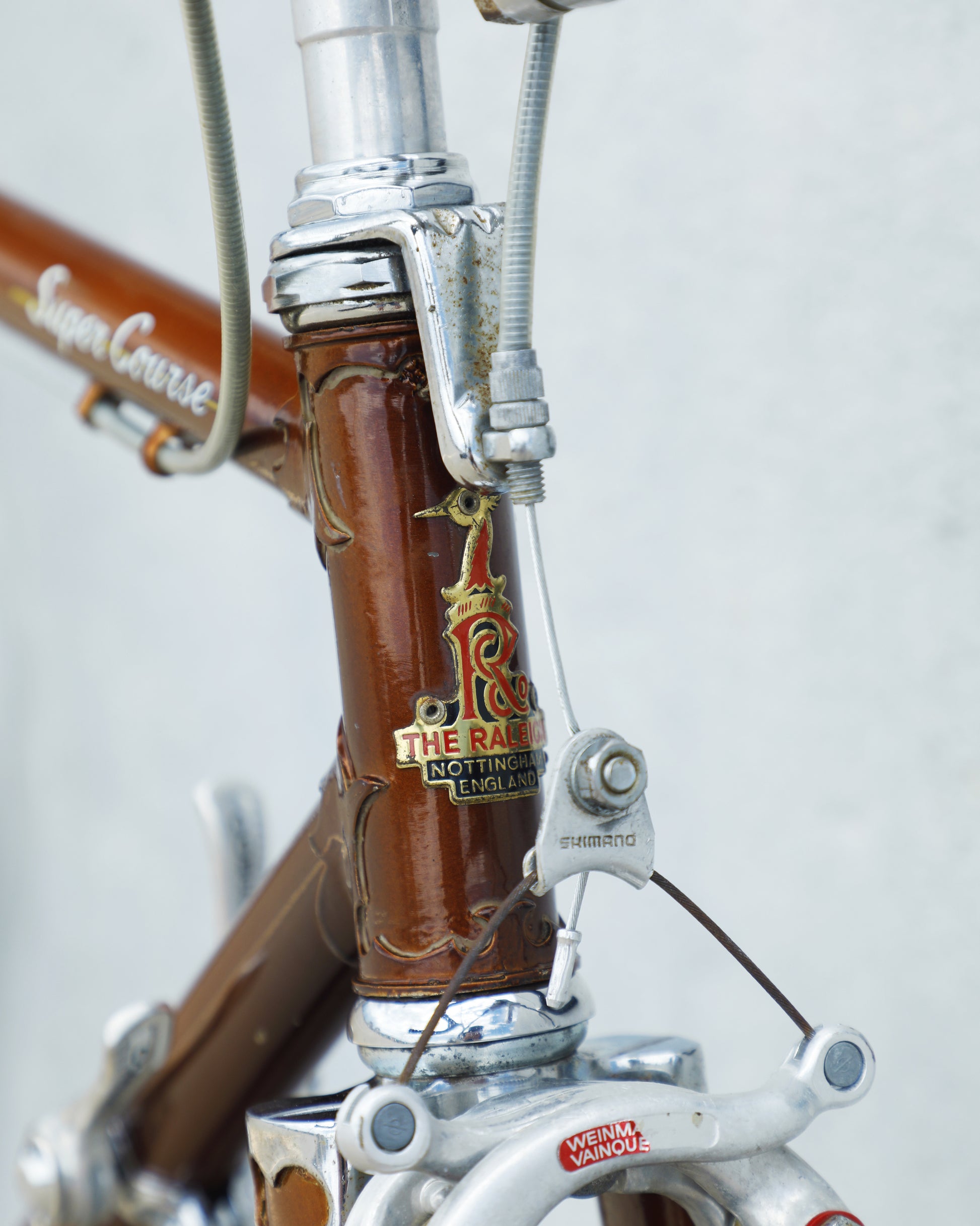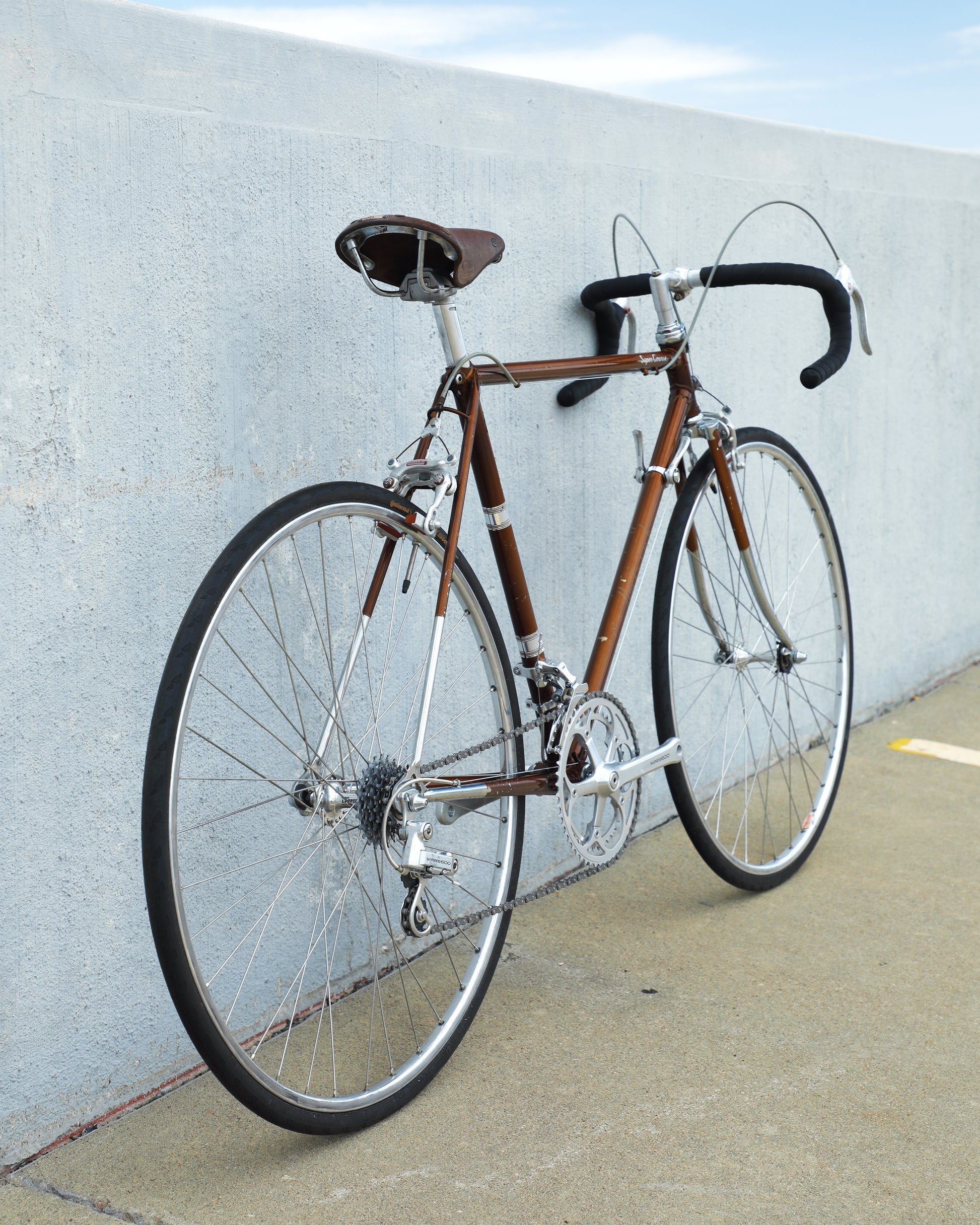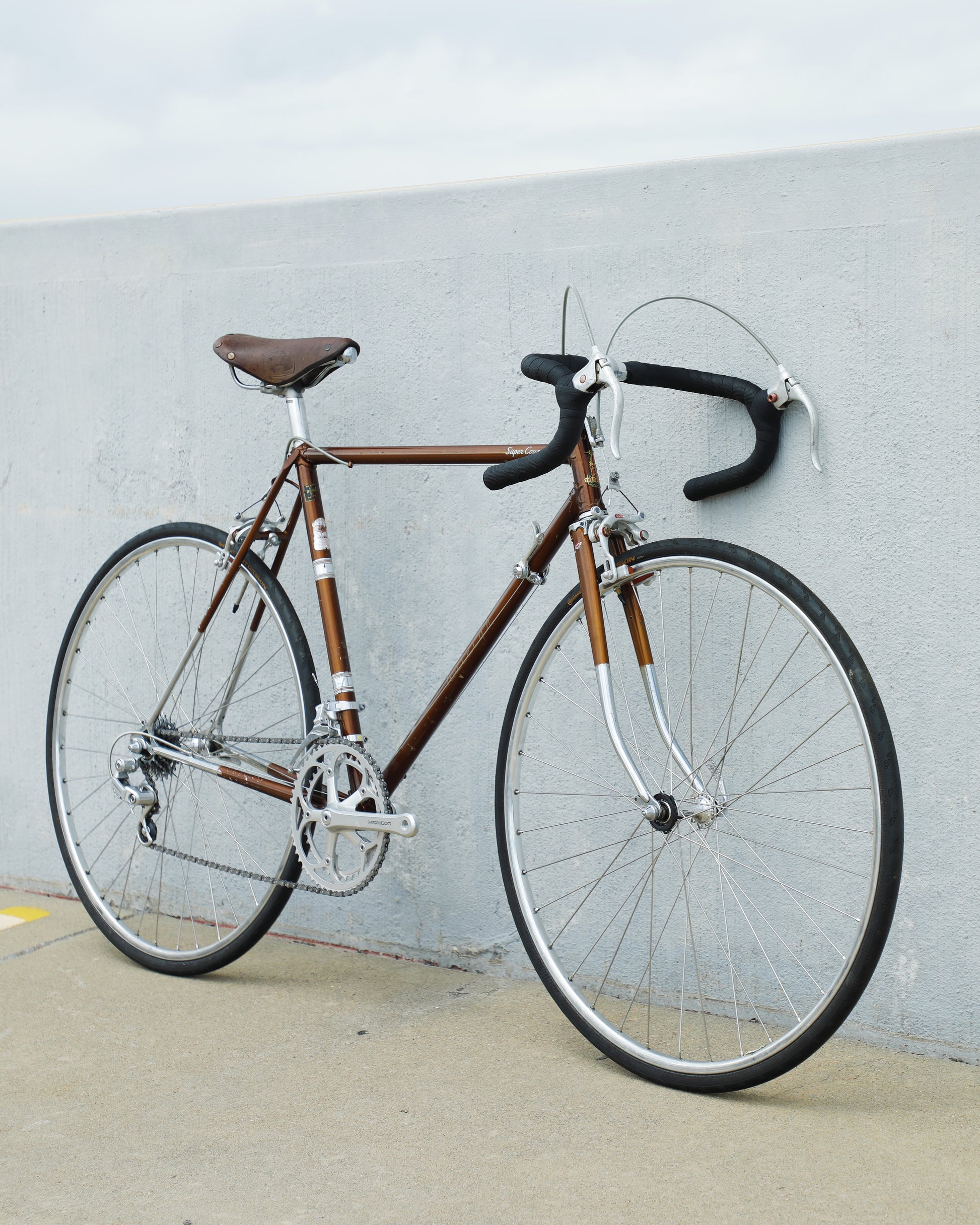 The Raleigh Super Course was one of the first mass produced "high end" bike. The main triangle is made with straight gauge Reynolds 531 tubing, which was mostly used on more high end bikes at the time. This early 1970's model is finished in a beautiful bronze. It also features some newer upgrades with the Shimano 600 front and rear derailleurs, crankset, and bottom bracket. This bike is in pretty good condition but it shows sign of use. There are some paint chips and scrapes here and there but no dents, bends, or cracks. It's a great rider!