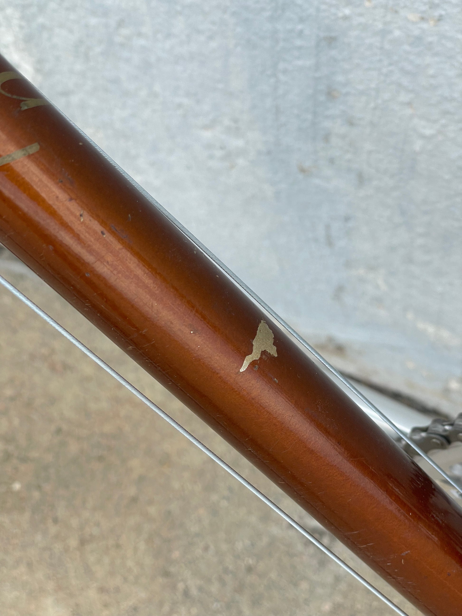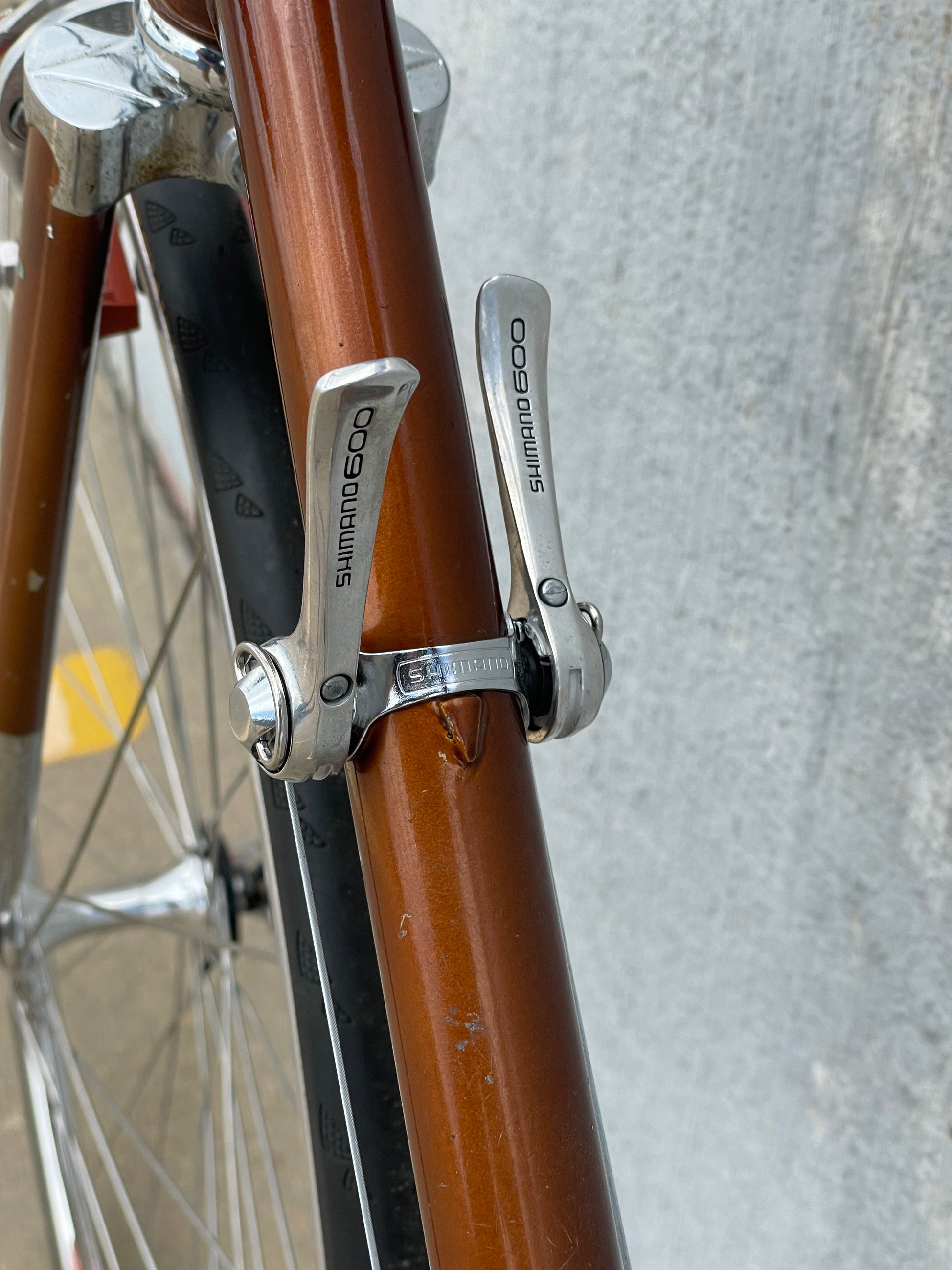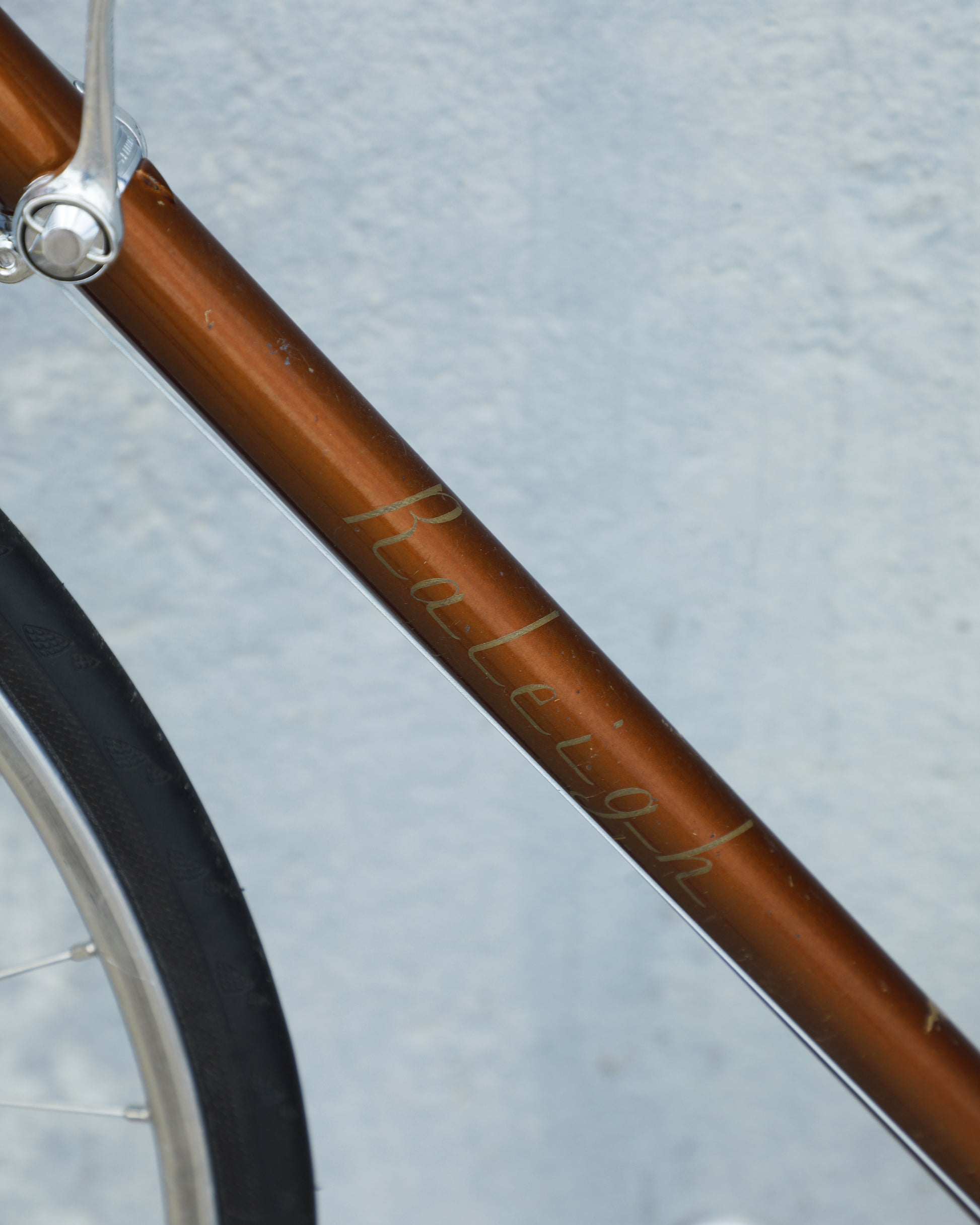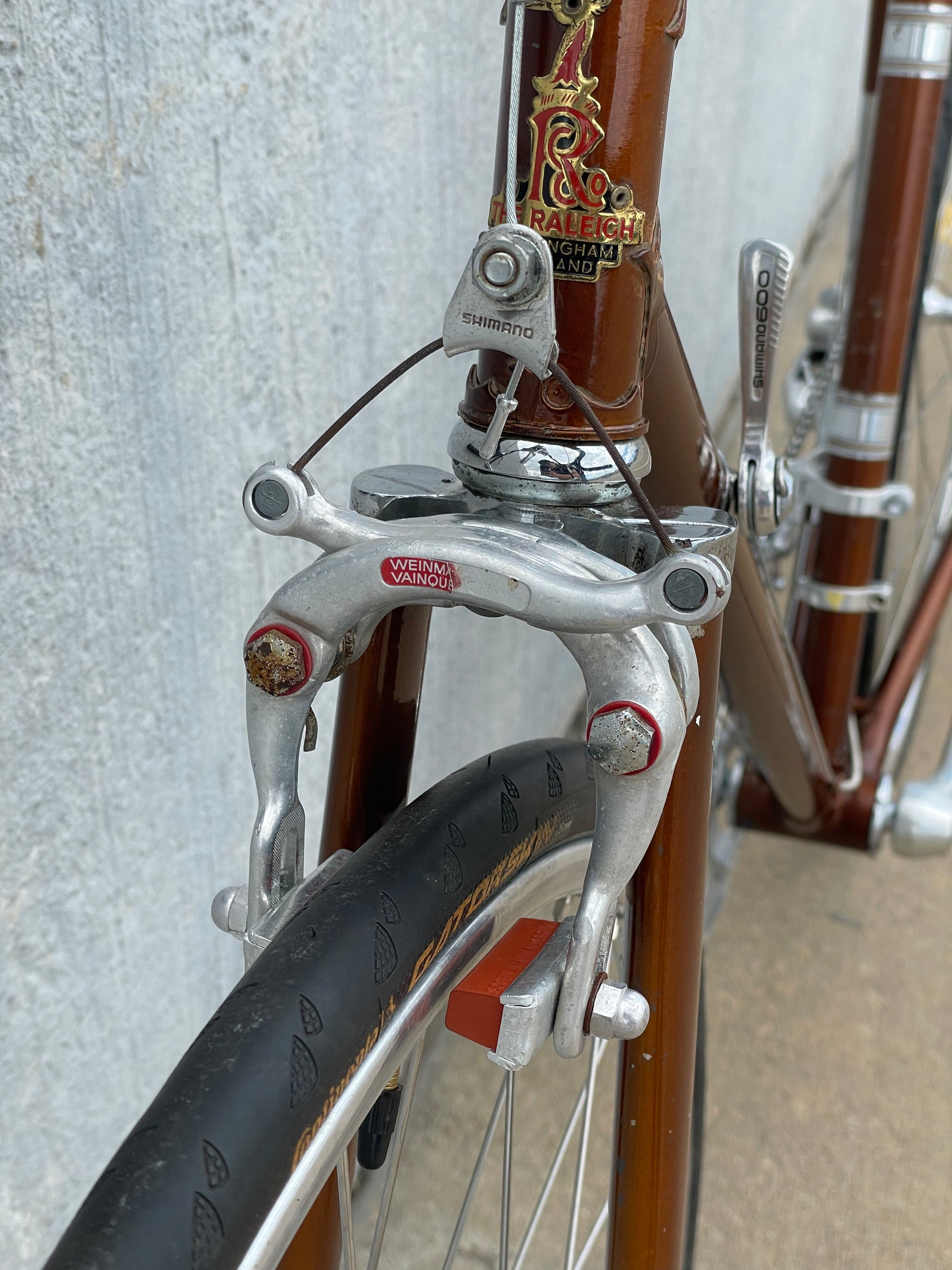 The Raleigh Super Course was one of the first mass produced "high end" bike. The main triangle is made with straight gauge Reynolds 531 tubing, which was mostly used on more high end bikes at the time. This early 1970's model is finished in a beautiful bronze. It also features some newer upgrades with the Shimano 600 front and rear derailleurs, crankset, and bottom bracket. This bike is in pretty good condition but it shows sign of use. There are some paint chips and scrapes here and there but no dents, bends, or cracks. It's a great rider!