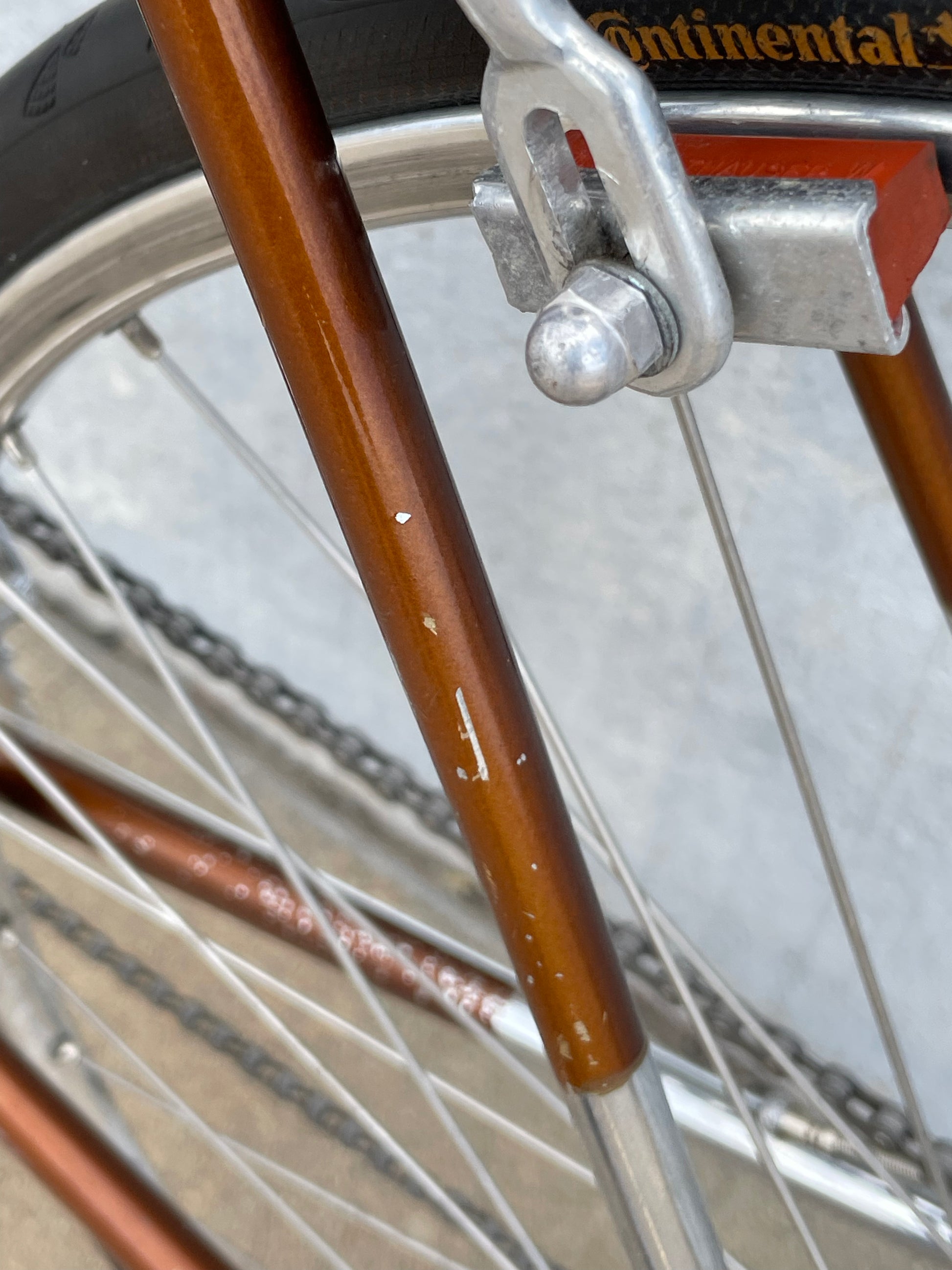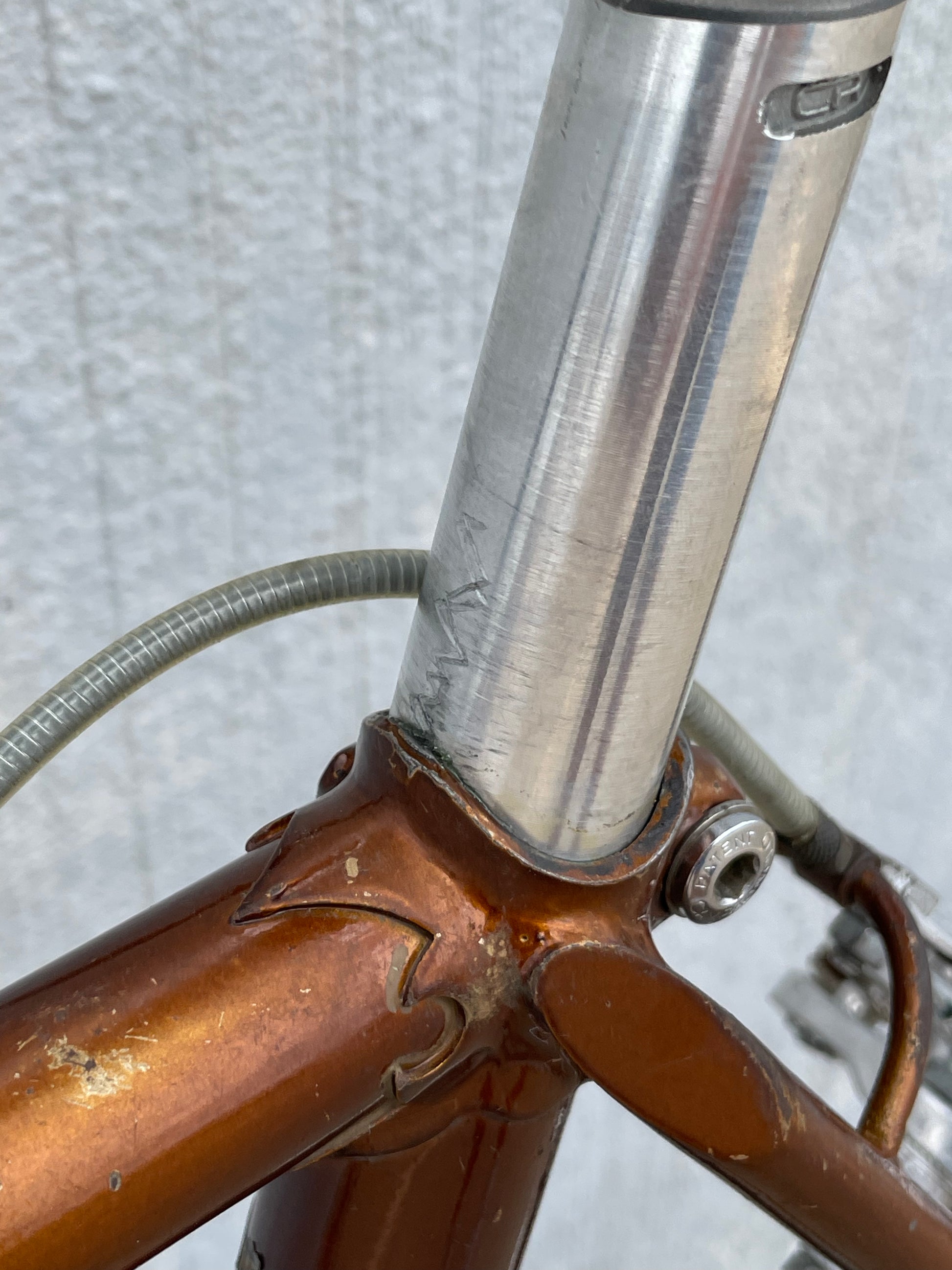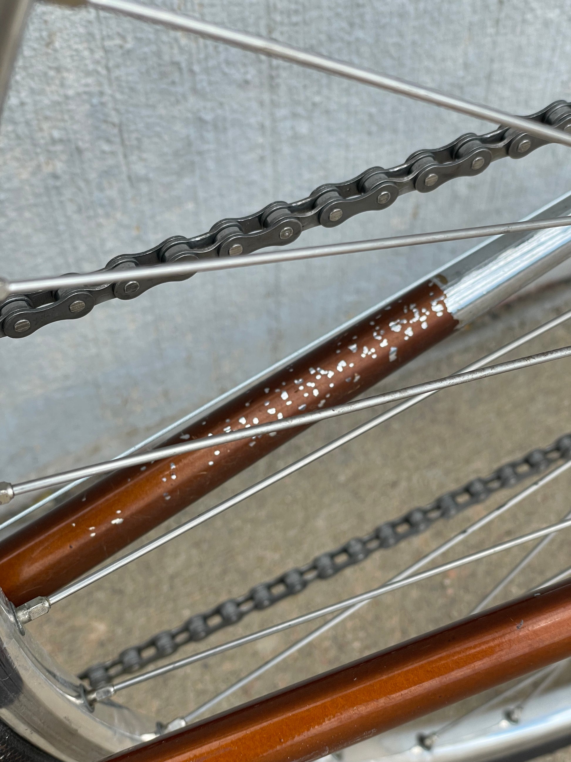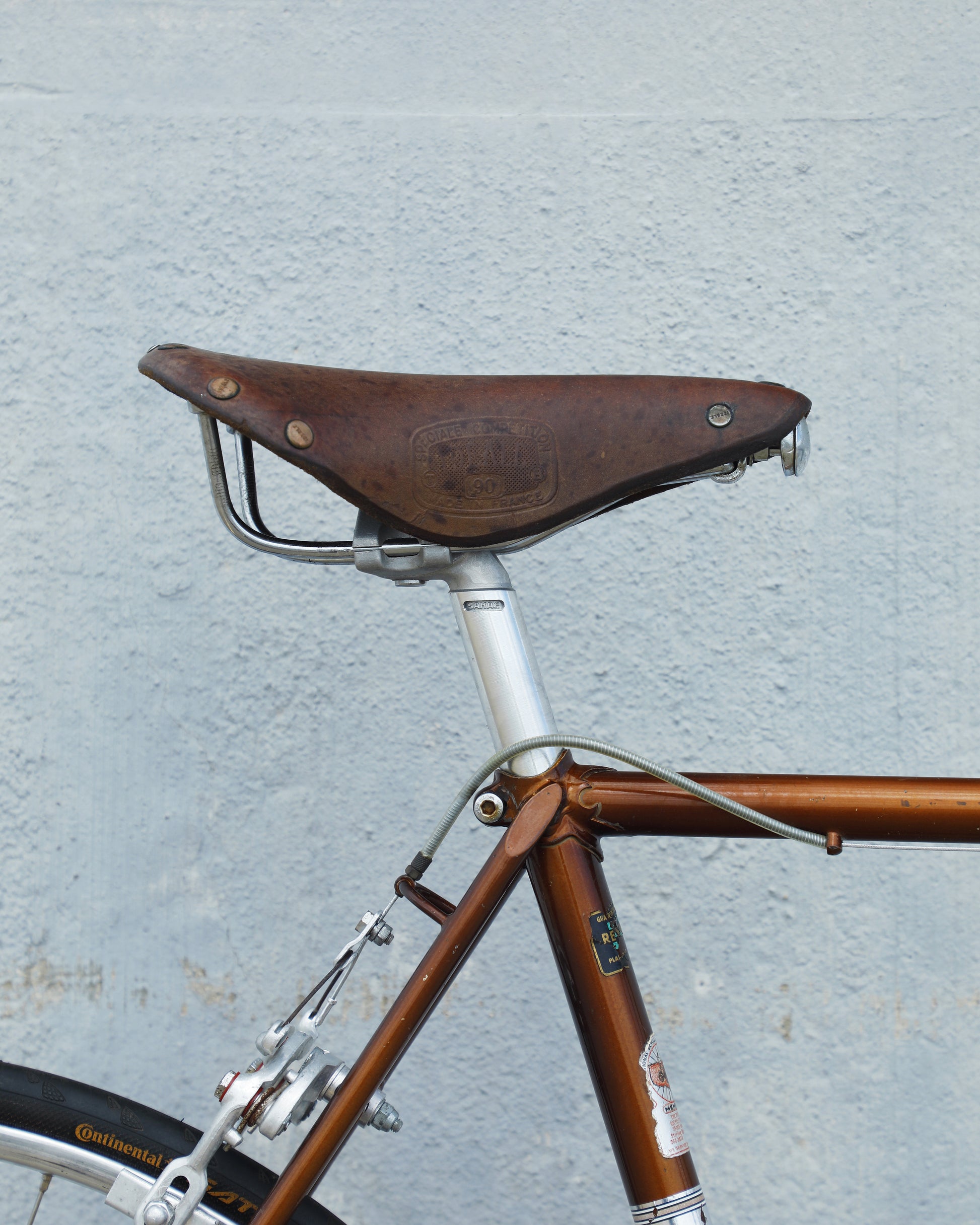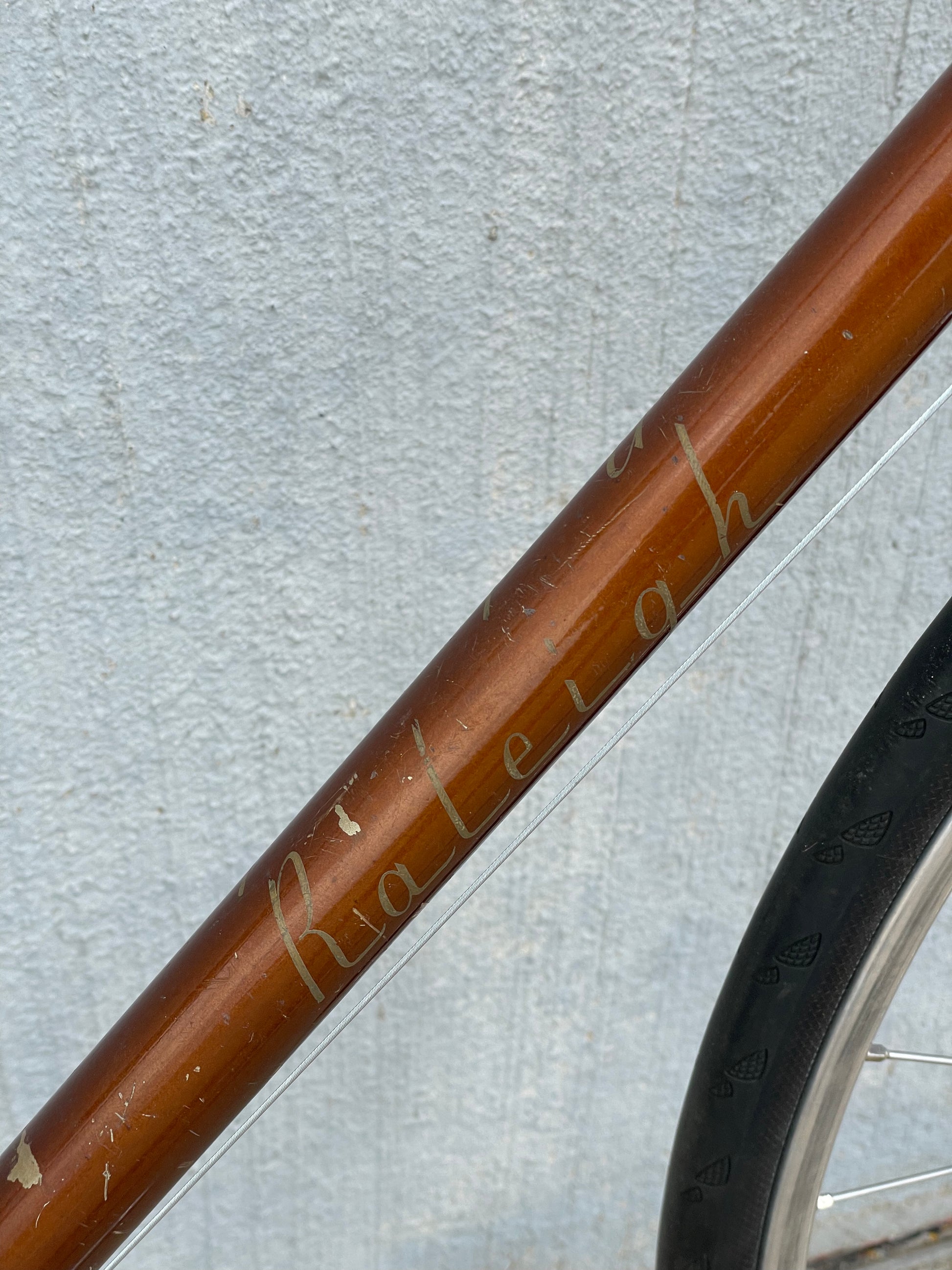 The Raleigh Super Course was one of the first mass produced "high end" bike. The main triangle is made with straight gauge Reynolds 531 tubing, which was mostly used on more high end bikes at the time. This early 1970's model is finished in a beautiful bronze. It also features some newer upgrades with the Shimano 600 front and rear derailleurs, crankset, and bottom bracket. This bike is in pretty good condition but it shows sign of use. There are some paint chips and scrapes here and there but no dents, bends, or cracks. It's a great rider!