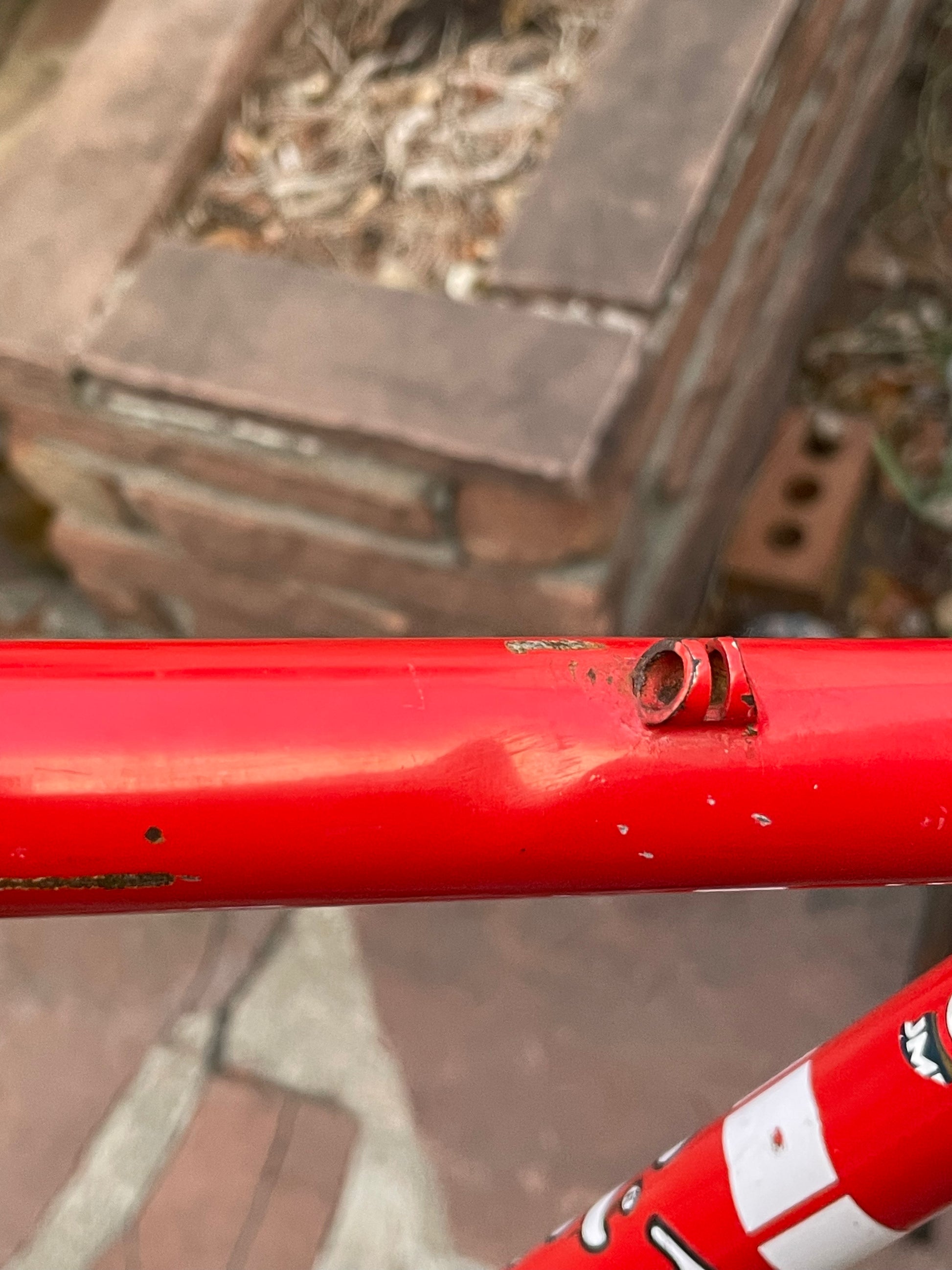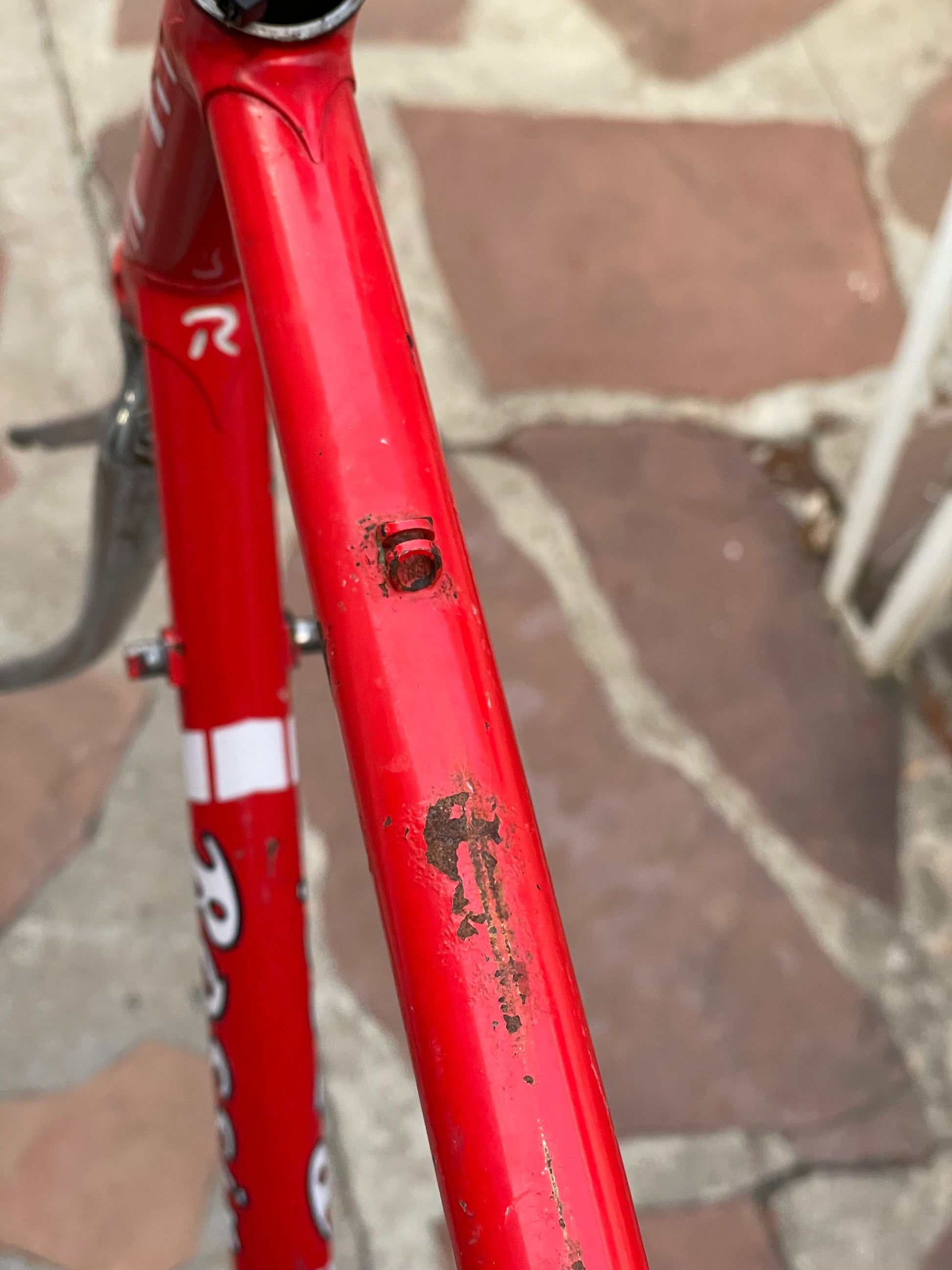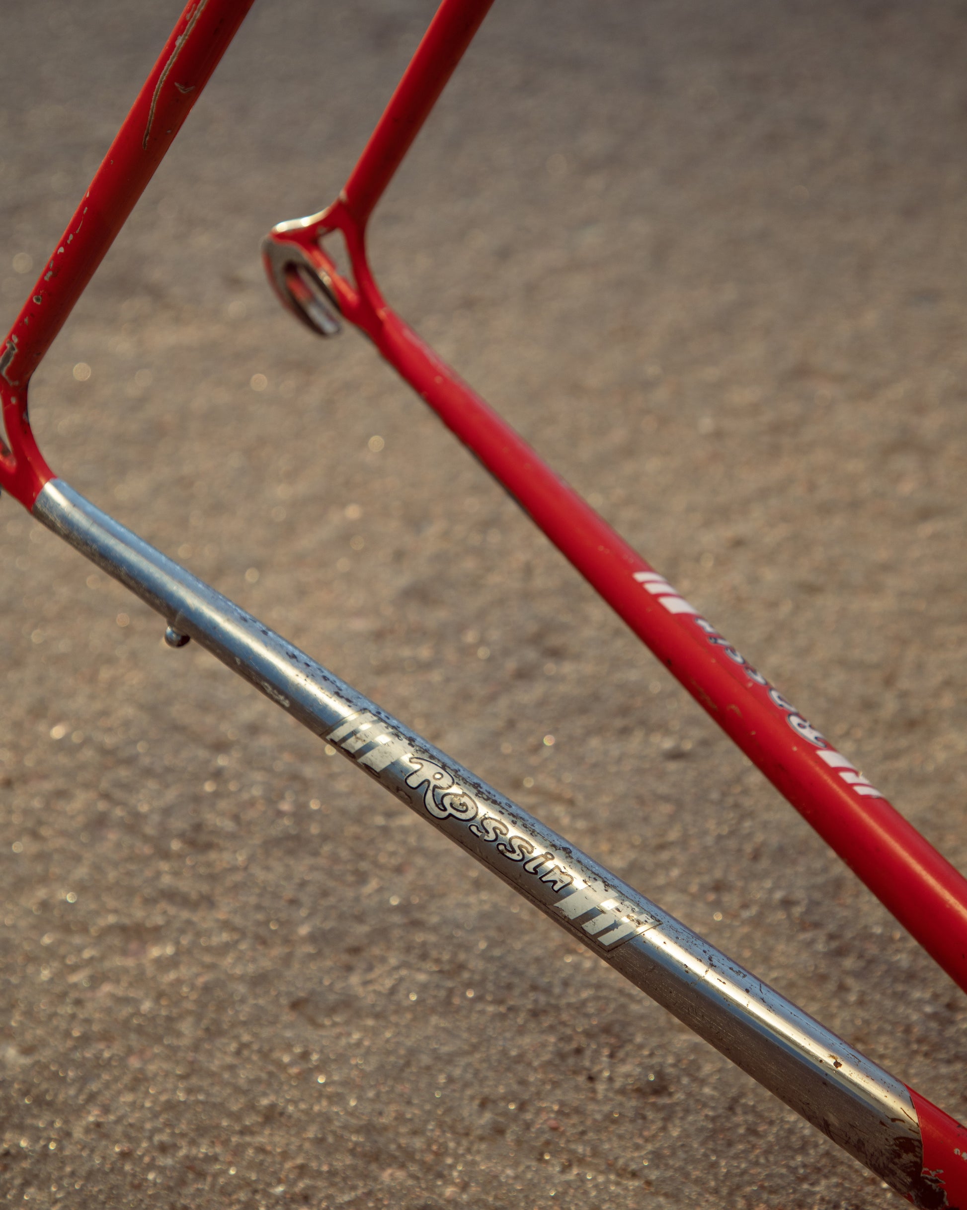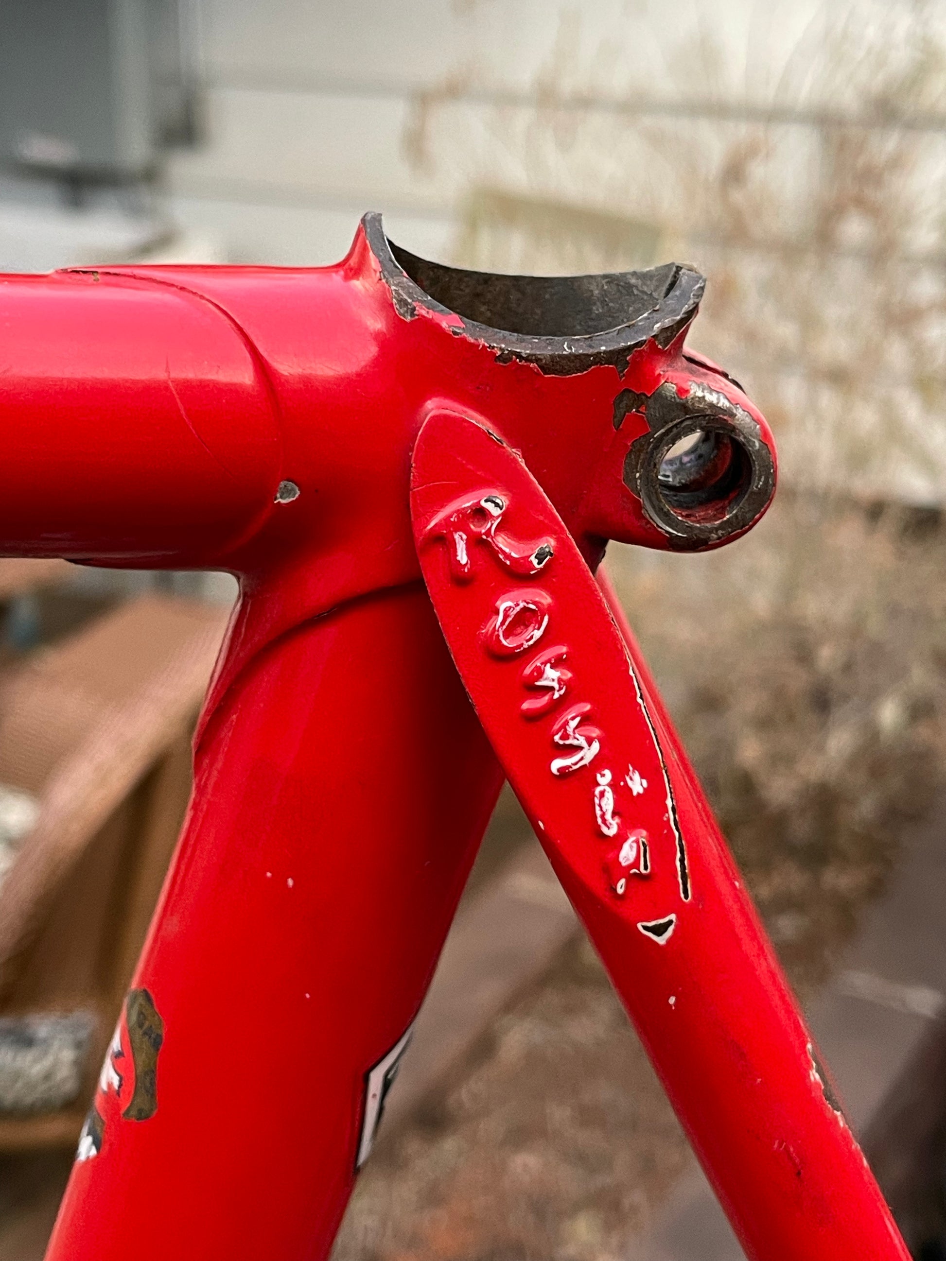 This Rossin Super Record has been well loved. The paint has seen better days and some areas on both the frame and fork are starting to oxidize. There is a small dent on the top tube (see photo). Finally, the drive side bottom bracket cup is pretty well stuck on there. Although these attributes might lower the value of the frame, it doesn't change the fact that its vintage Italian steel. This would be a great restoration contender, or build it up like this with some more modern parts!
