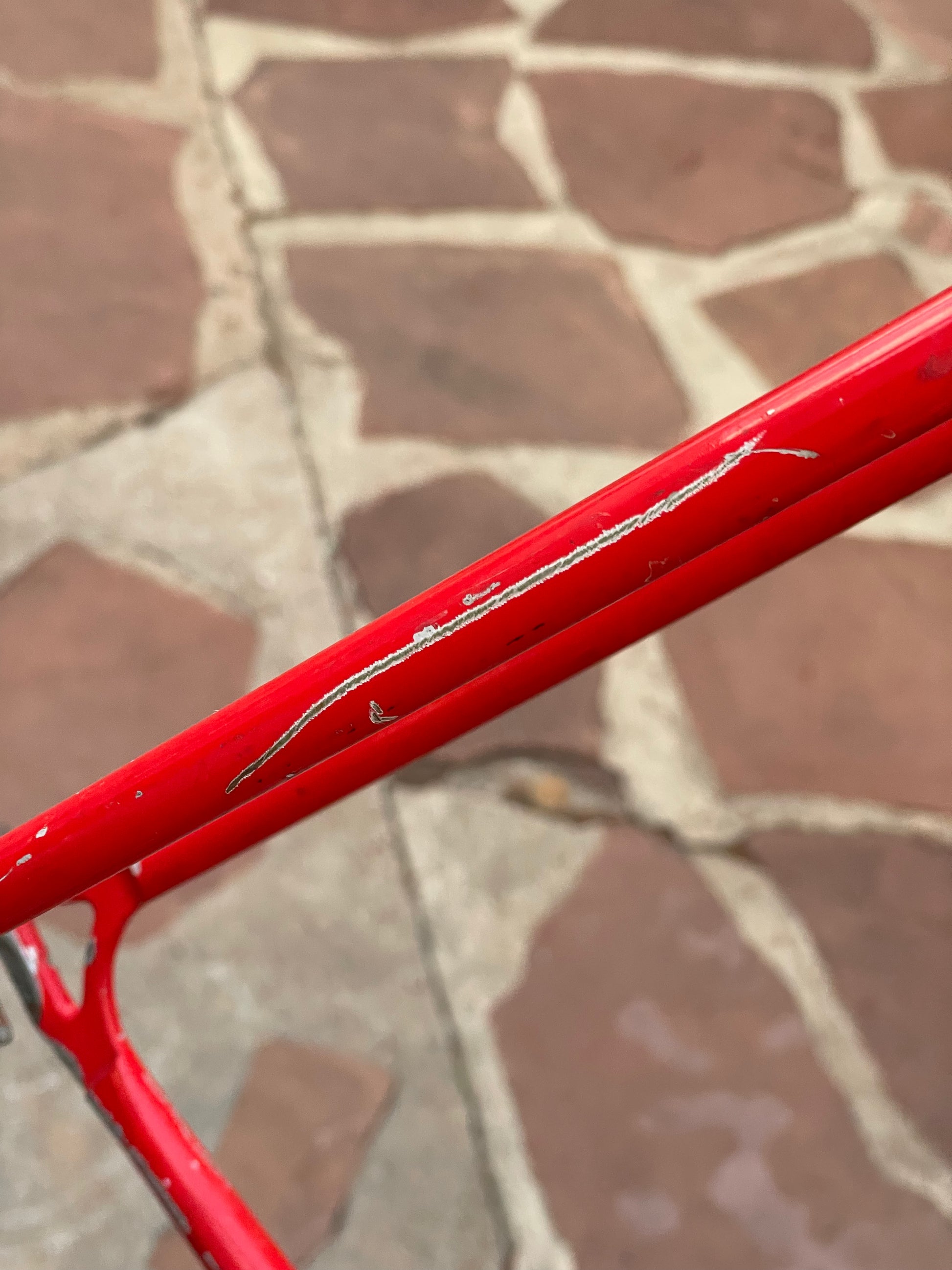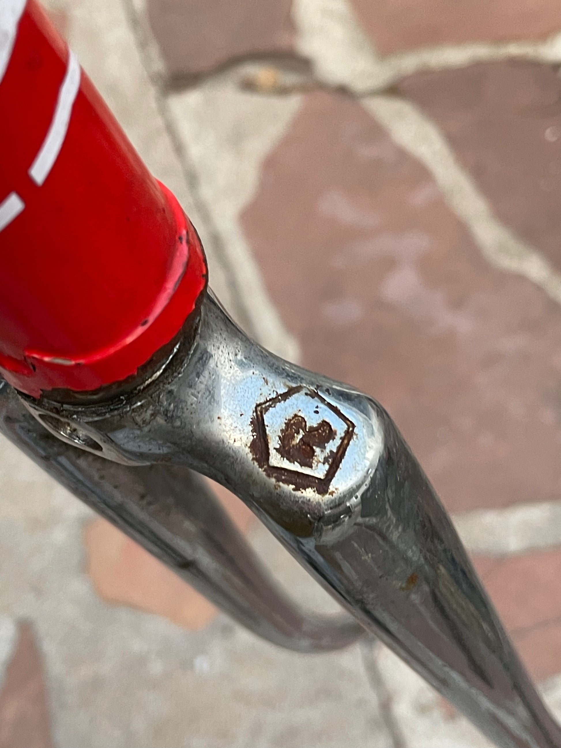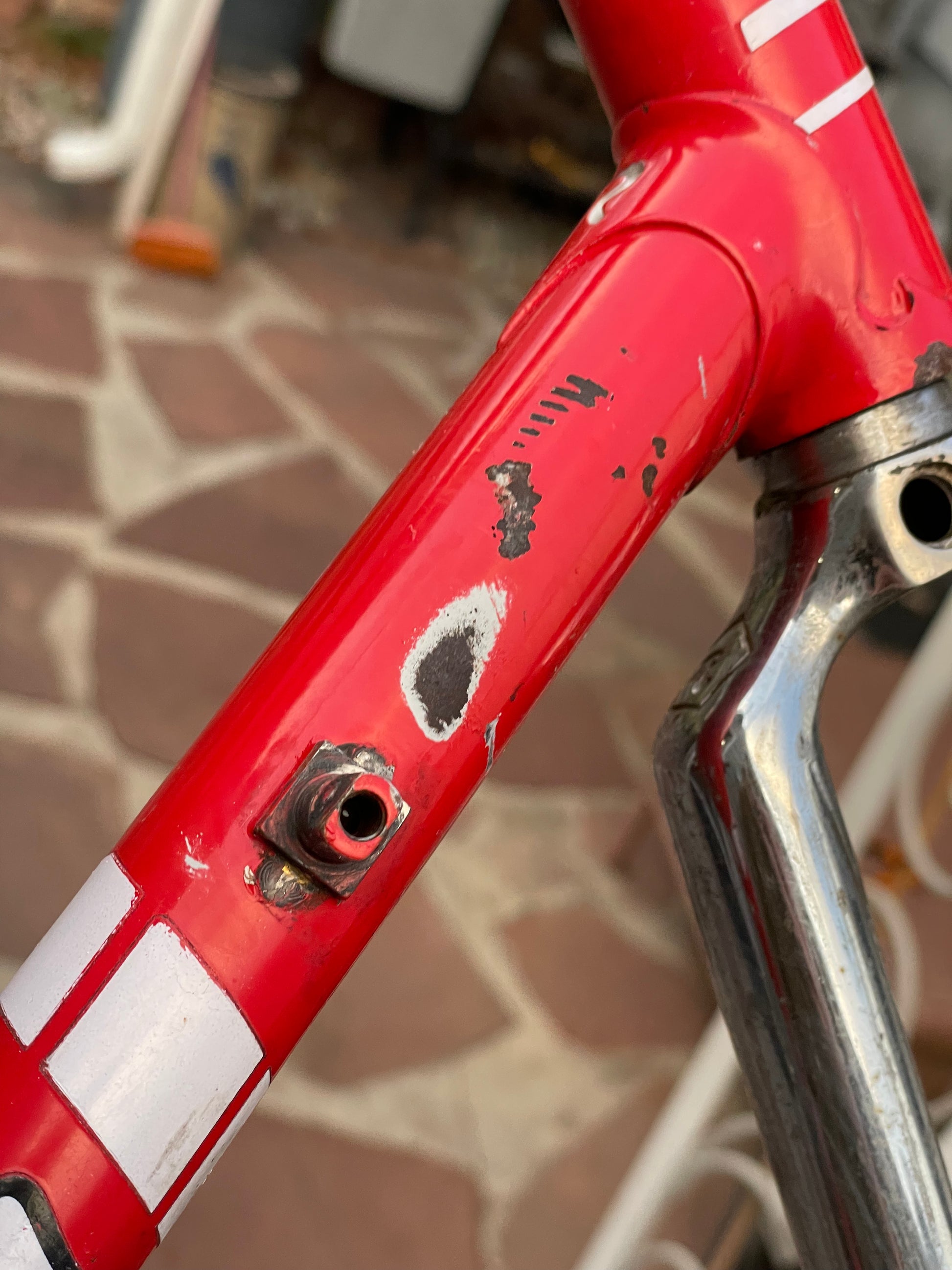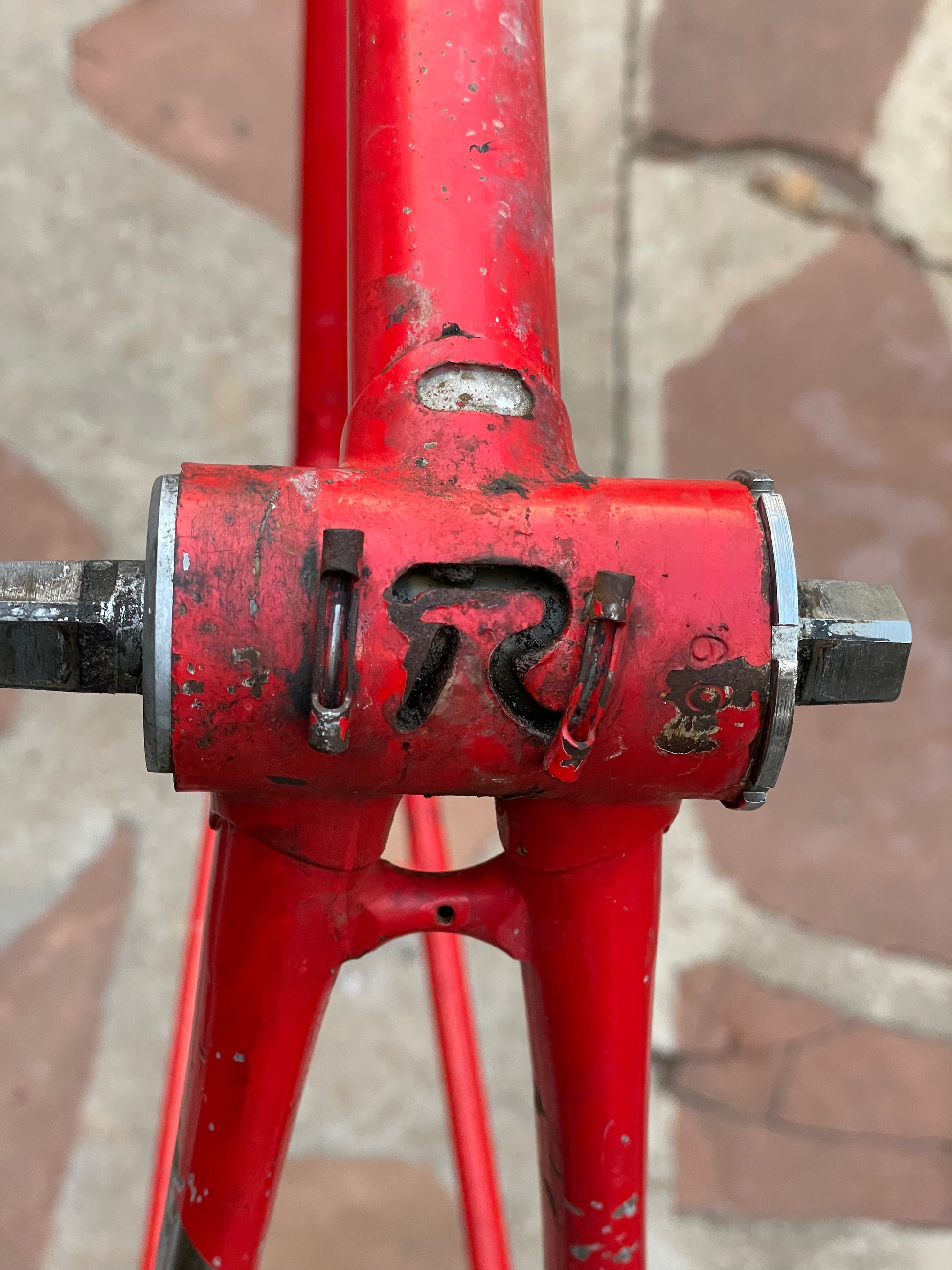 This Rossin Super Record has been well loved. The paint has seen better days and some areas on both the frame and fork are starting to oxidize. There is a small dent on the top tube (see photo). Finally, the drive side bottom bracket cup is pretty well stuck on there. Although these attributes might lower the value of the frame, it doesn't change the fact that its vintage Italian steel. This would be a great restoration contender, or build it up like this with some more modern parts!