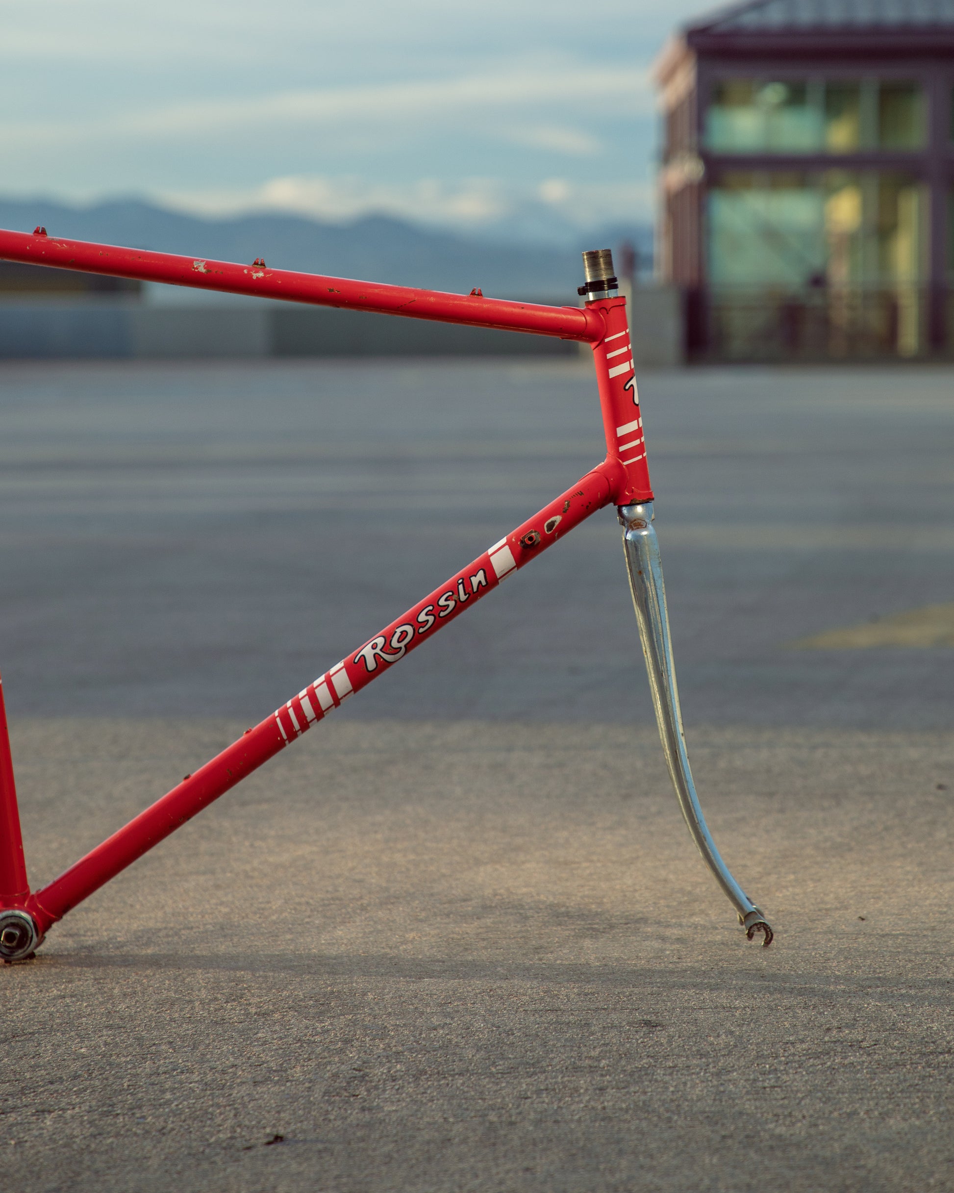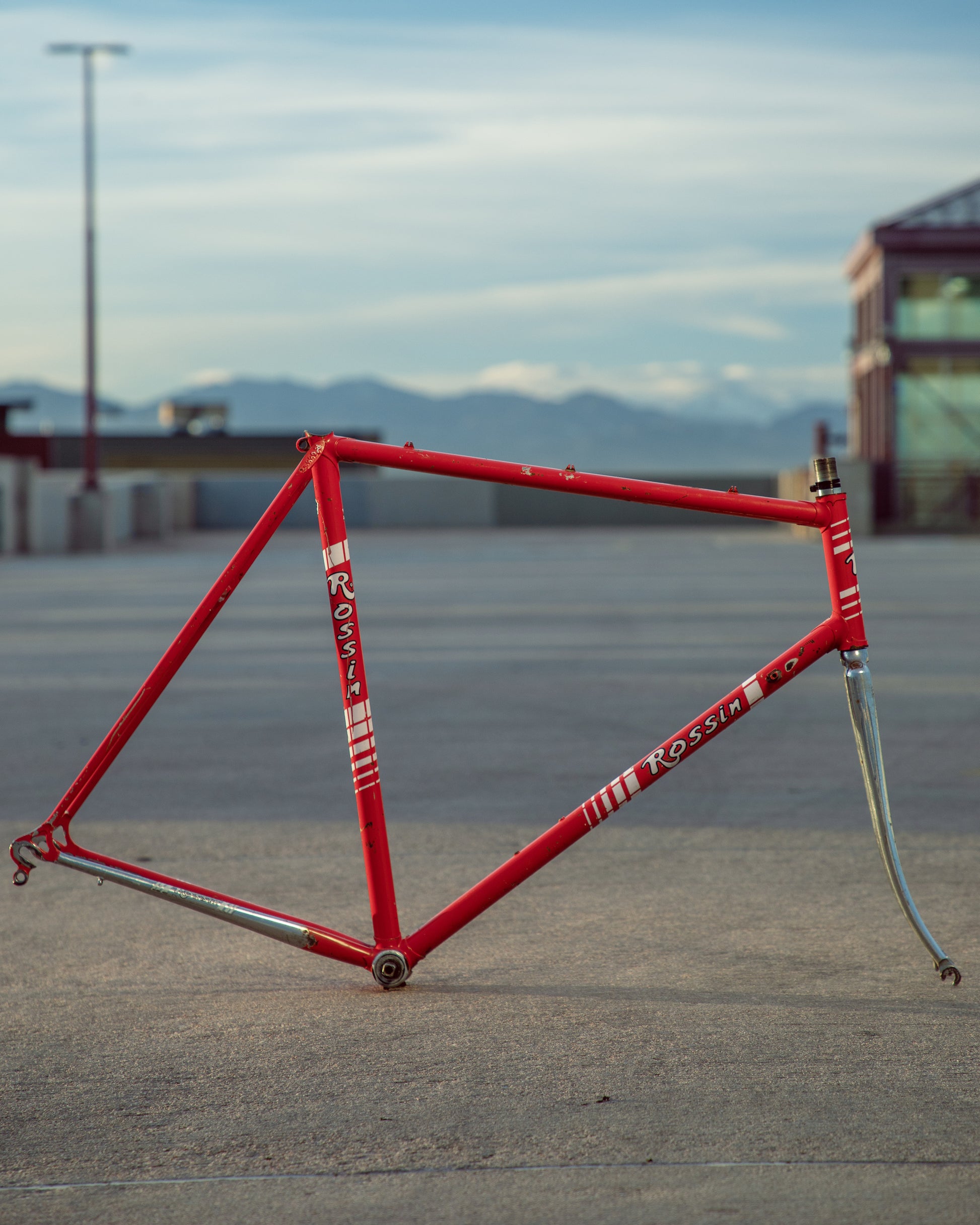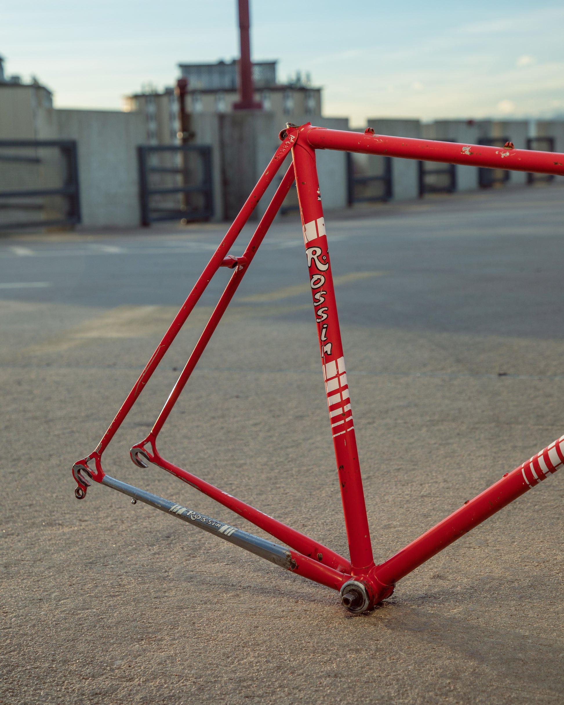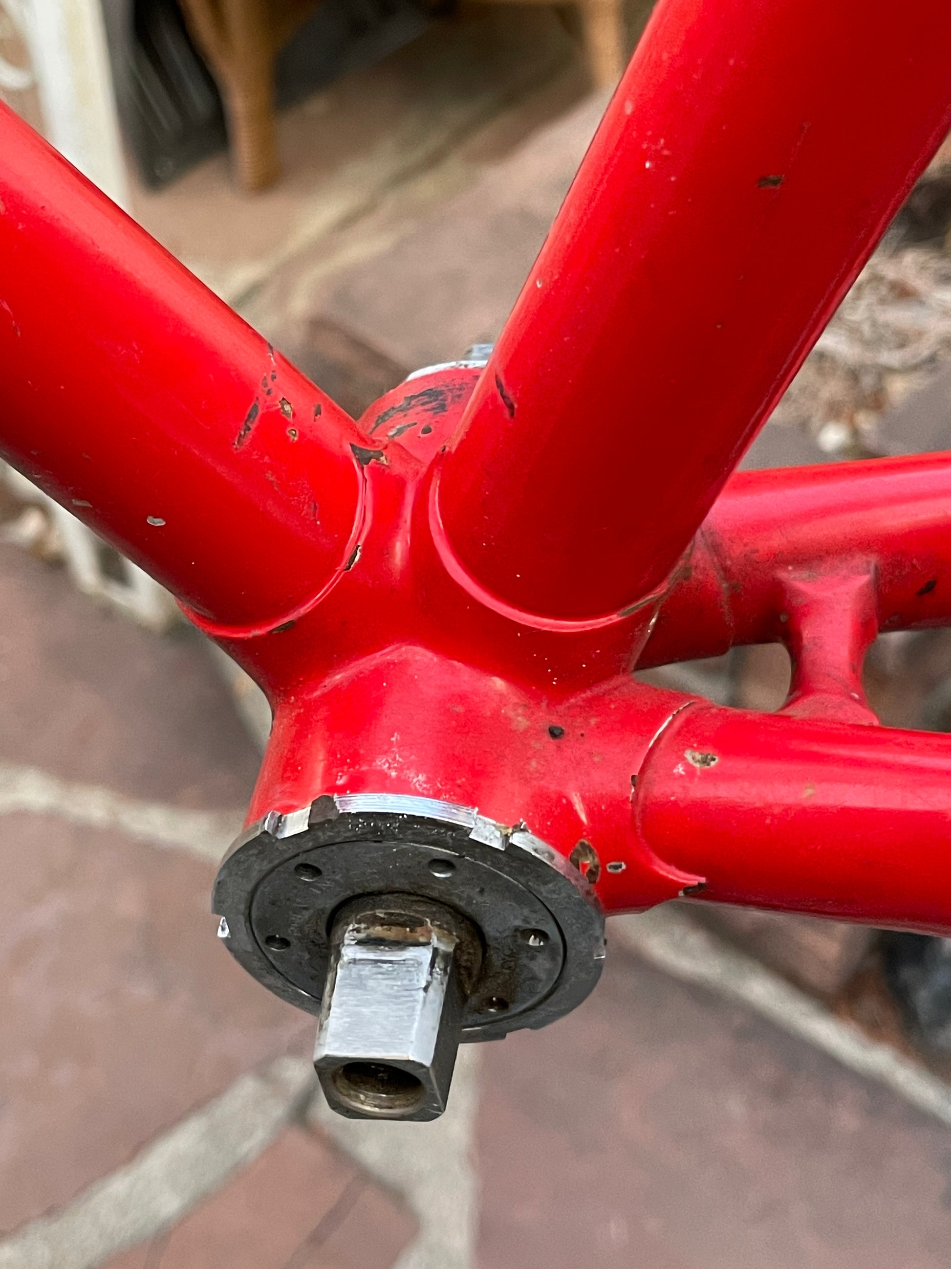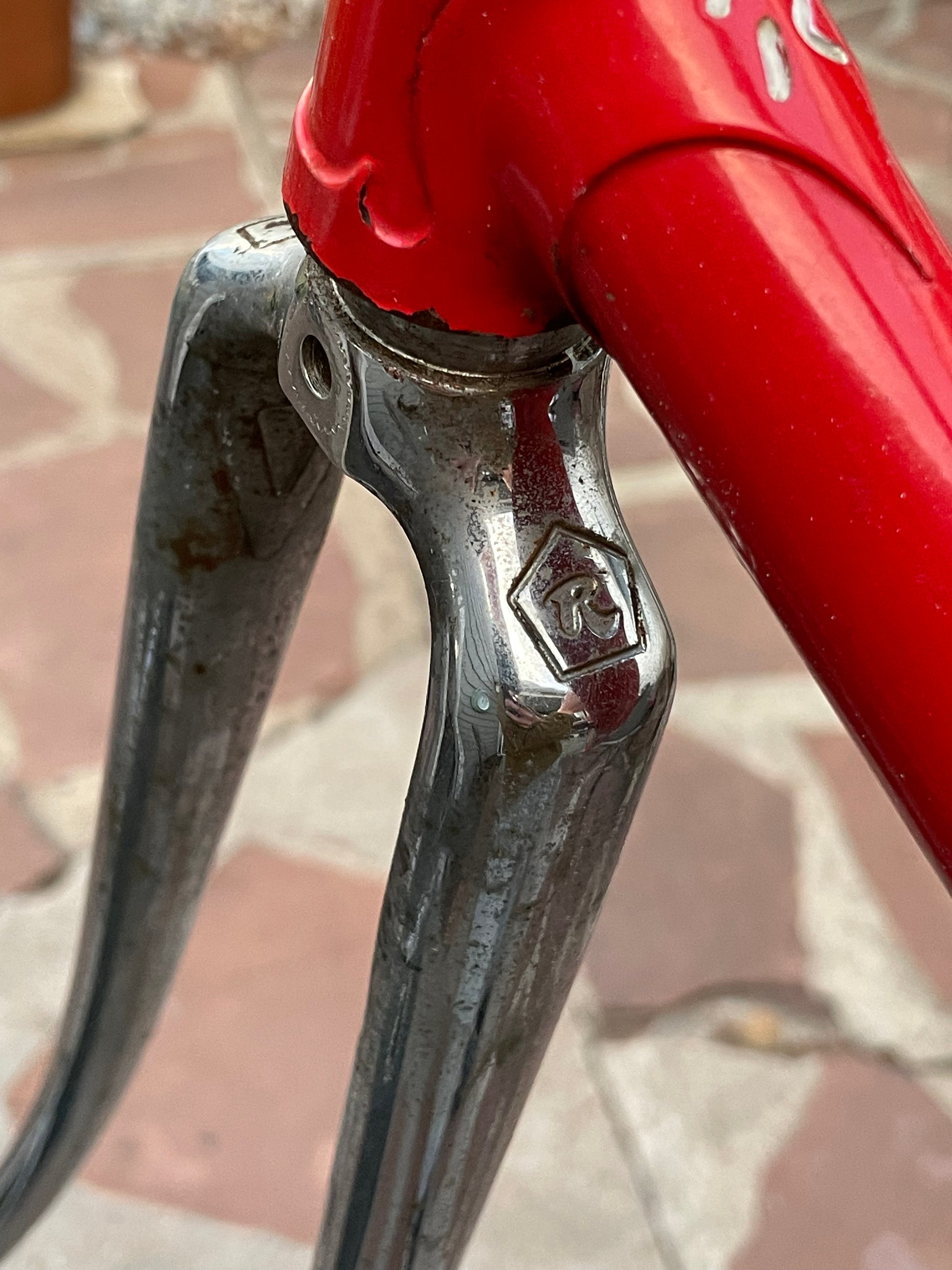 This Rossin Super Record has been well loved. The paint has seen better days and some areas on both the frame and fork are starting to oxidize. There is a small dent on the top tube (see photo). Finally, the drive side bottom bracket cup is pretty well stuck on there. Although these attributes might lower the value of the frame, it doesn't change the fact that its vintage Italian steel. This would be a great restoration contender, or build it up like this with some more modern parts!