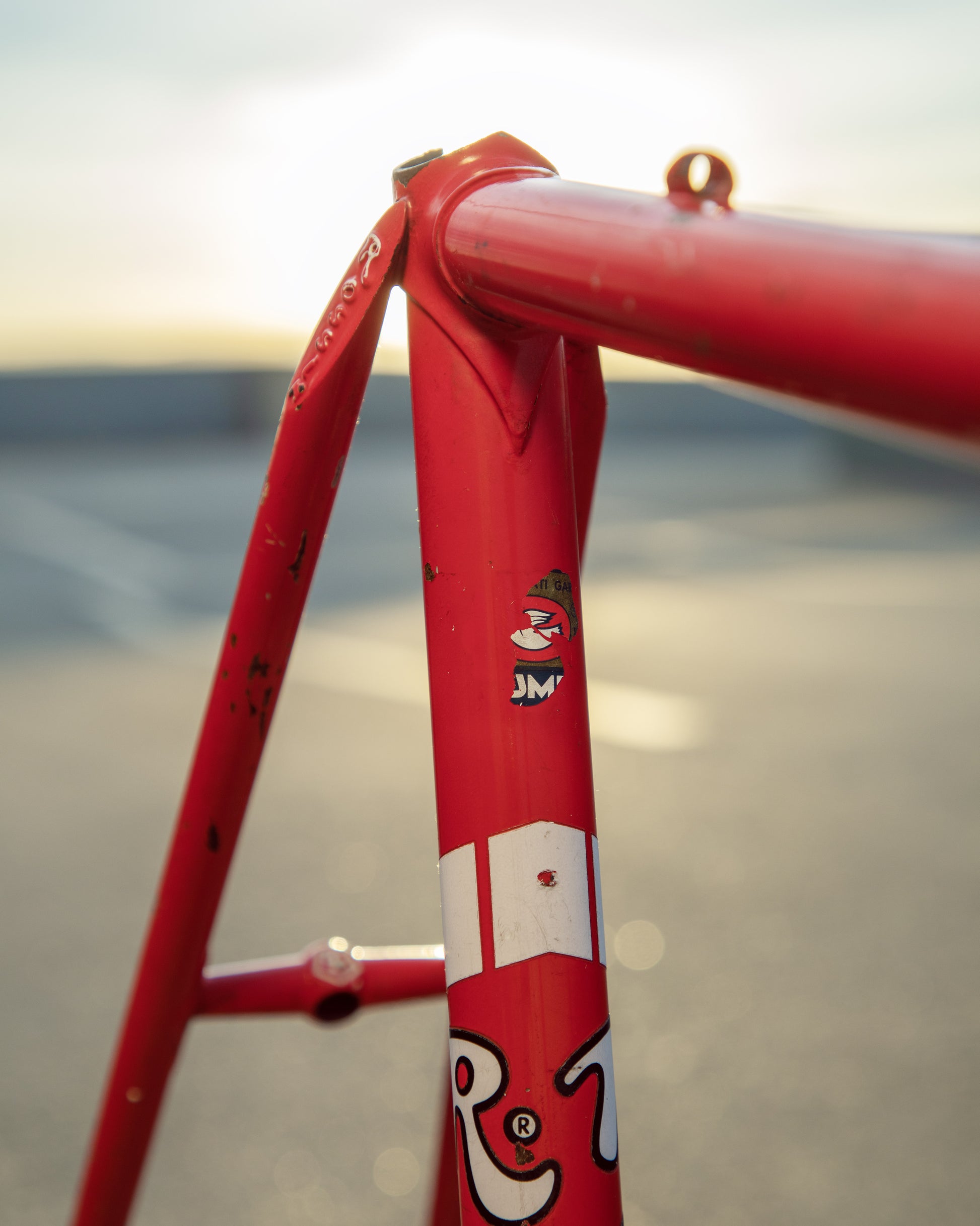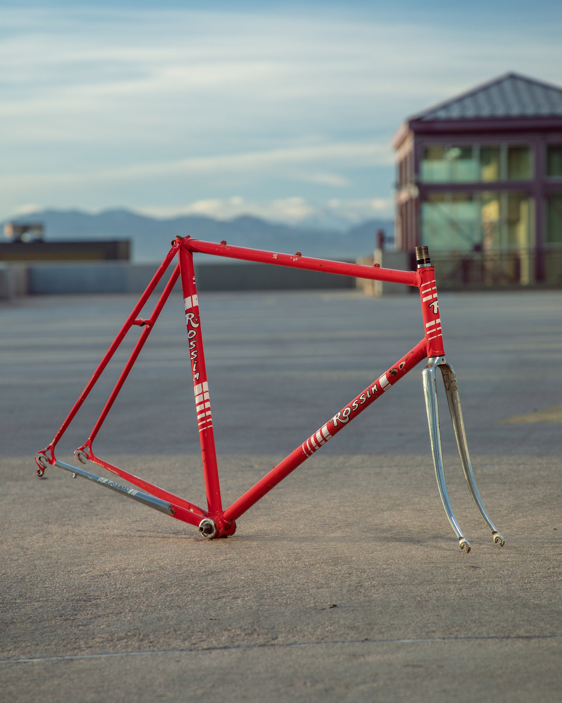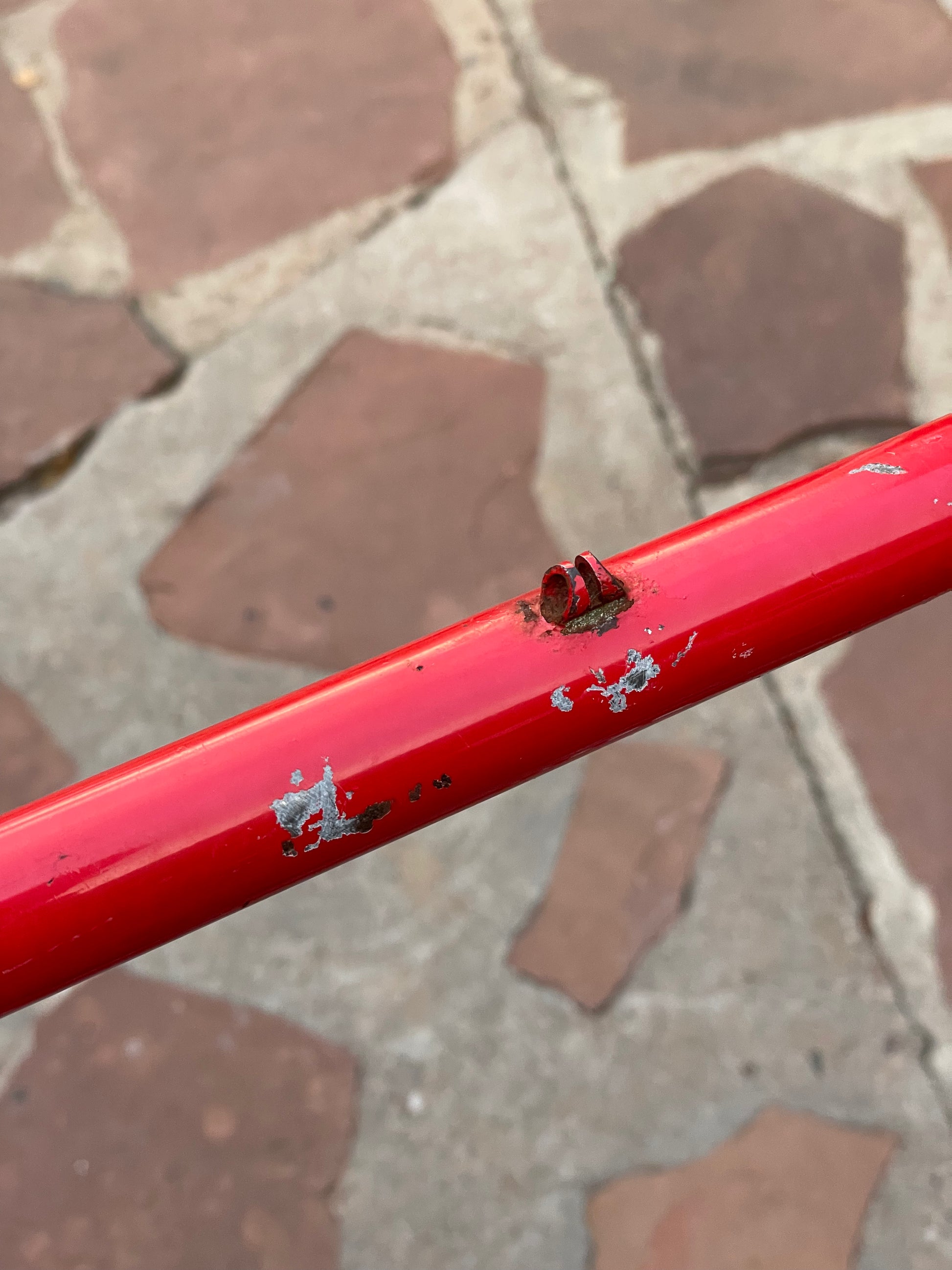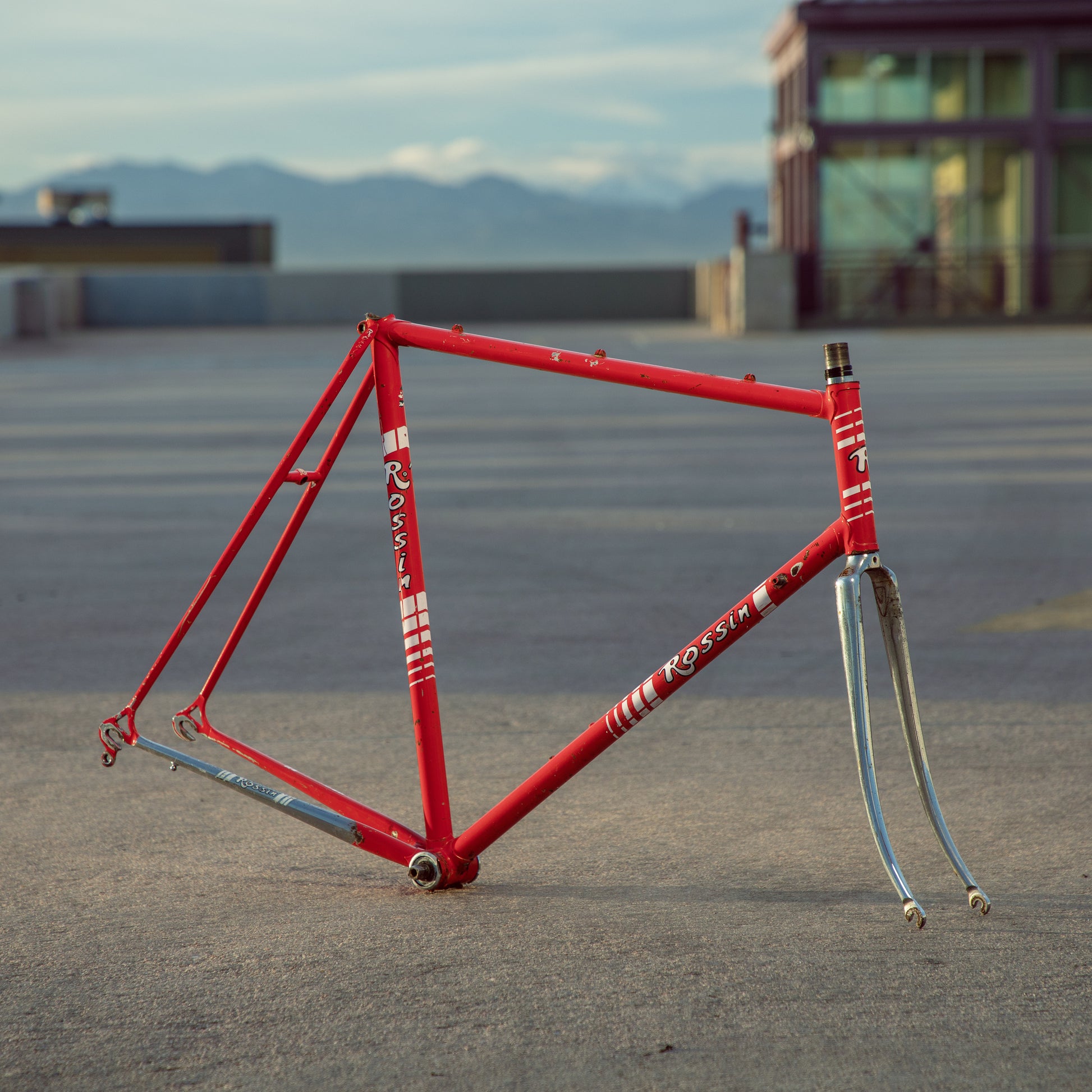 This Rossin Super Record has been well loved. The paint has seen better days and some areas on both the frame and fork are starting to oxidize. There is a small dent on the top tube (see photo). Finally, the drive side bottom bracket cup is pretty well stuck on there. Although these attributes might lower the value of the frame, it doesn't change the fact that its vintage Italian steel. This would be a great restoration contender, or build it up like this with some more modern parts!