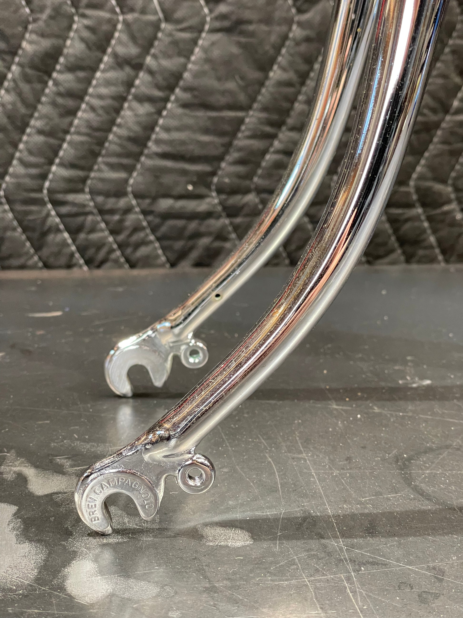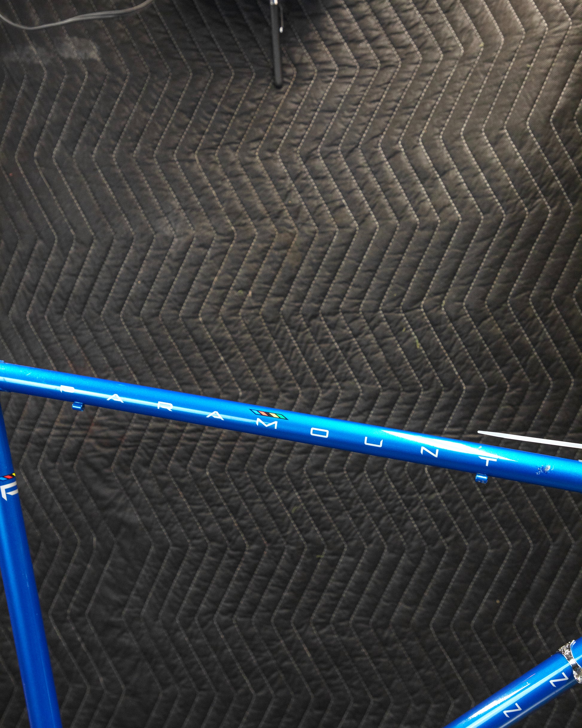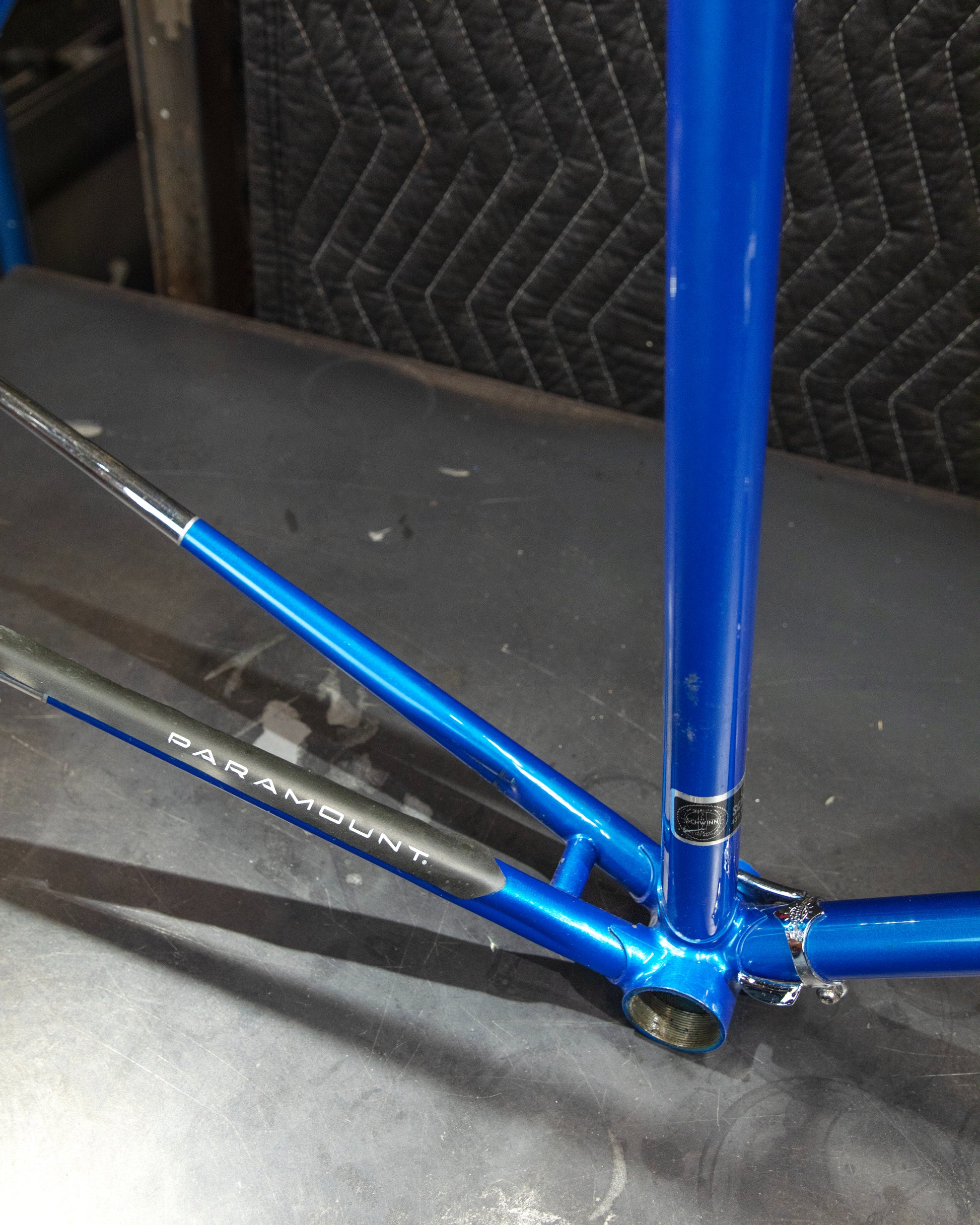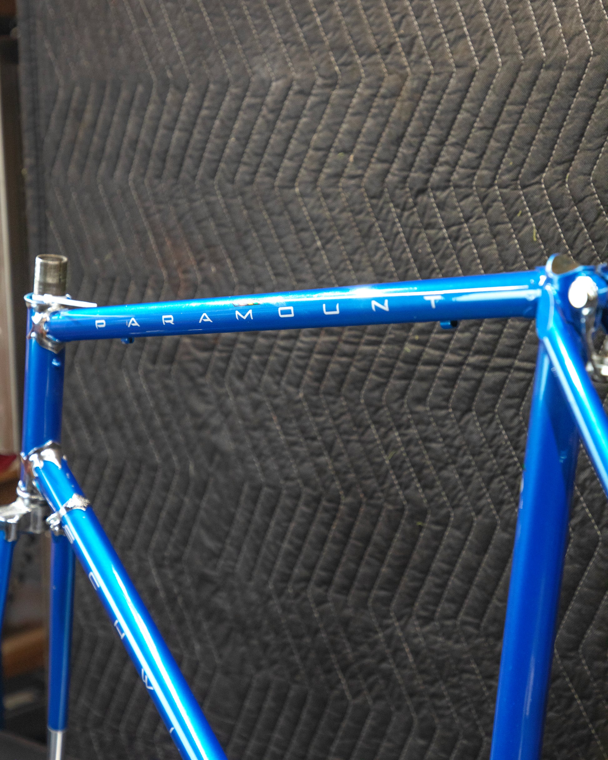This 70's Paramount is beautiful! It has the classic, chrome Nervex lugs. It was repainted at Waterford some time ago and has updated decals. No headset or bottom bracket included. The head badge is missing and it has a few paint chips here and there. No dents, bends, or cracks. The threads in the bottom bracket and steer tube look great. Straight frame ready to be built up!