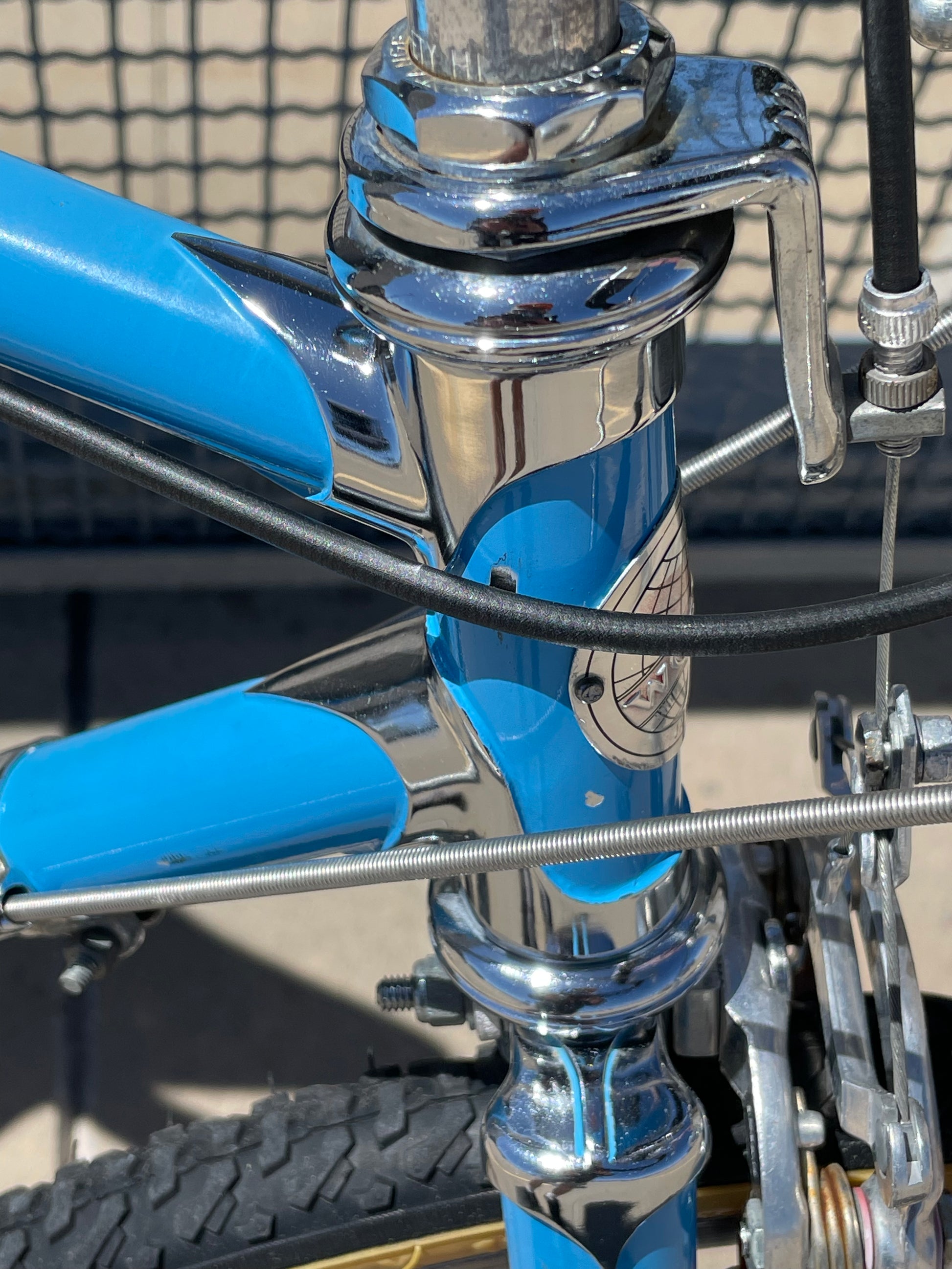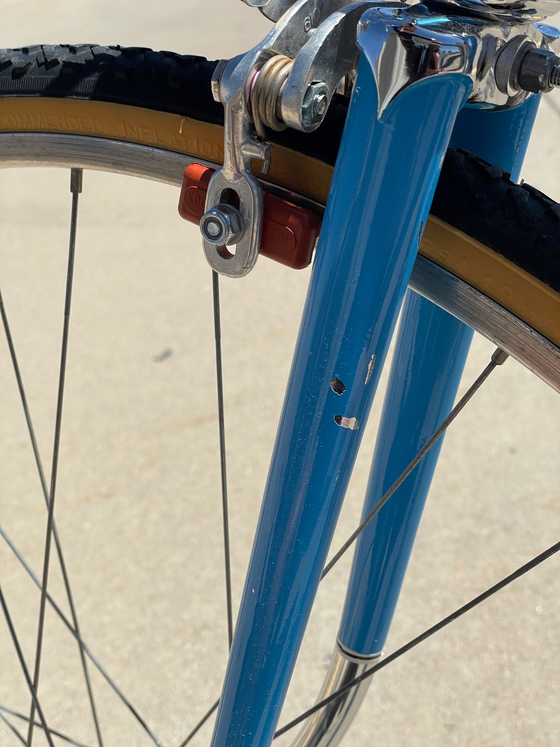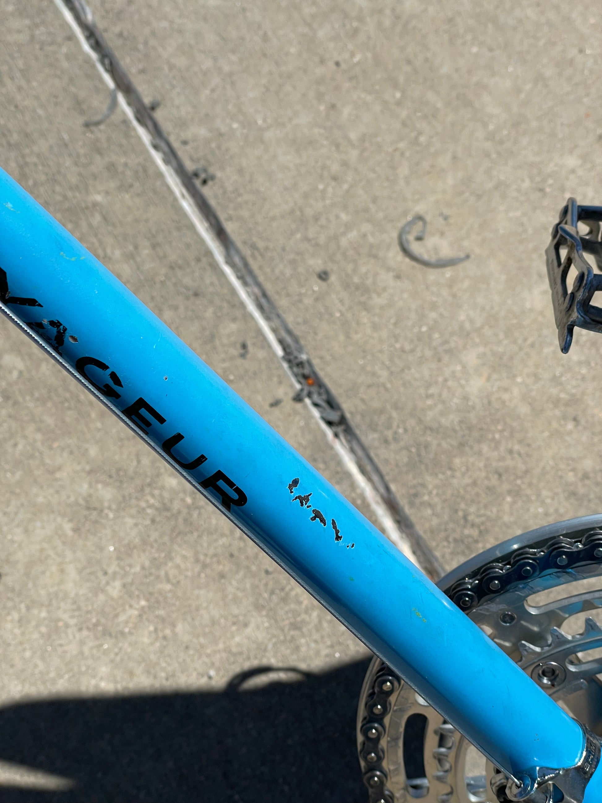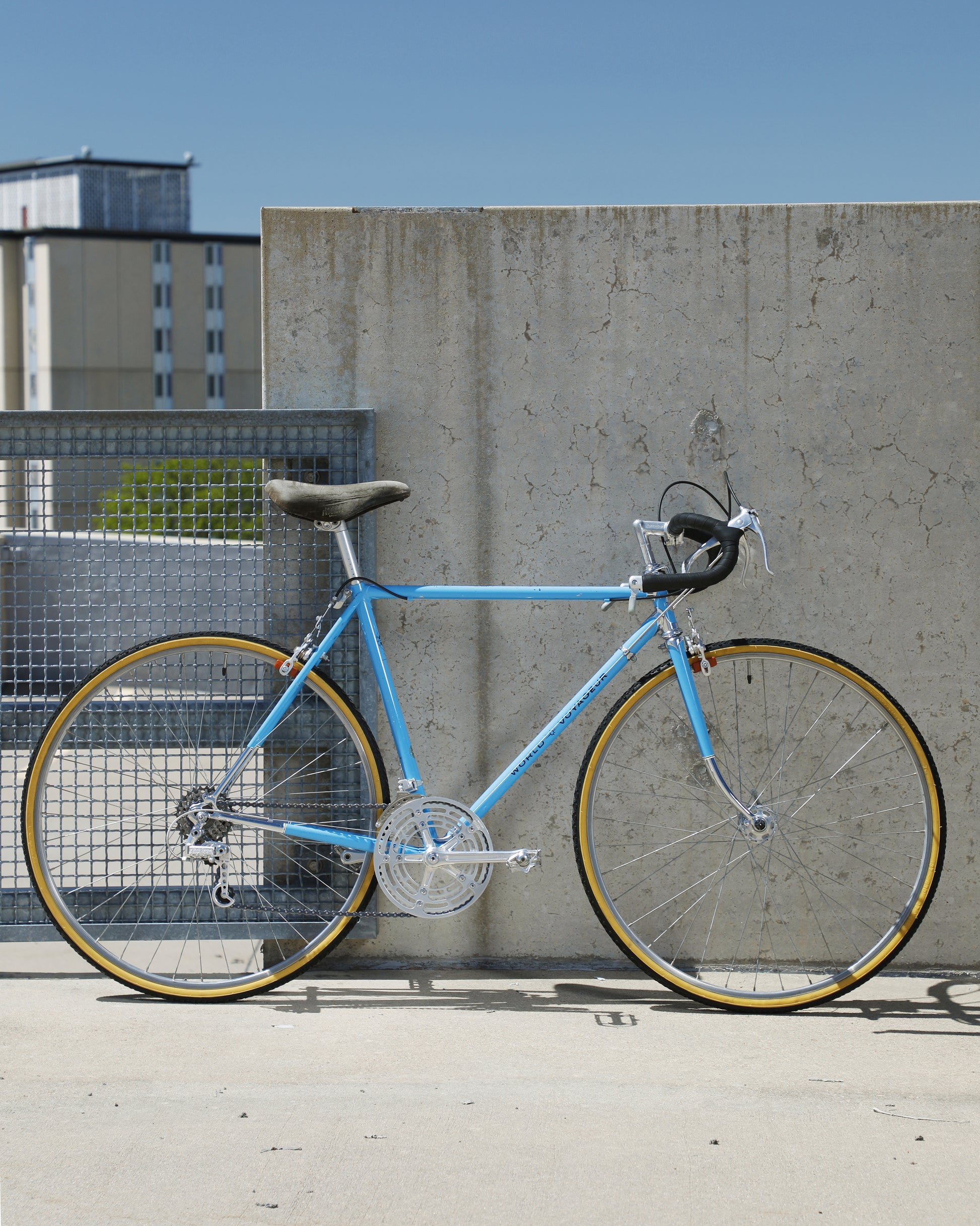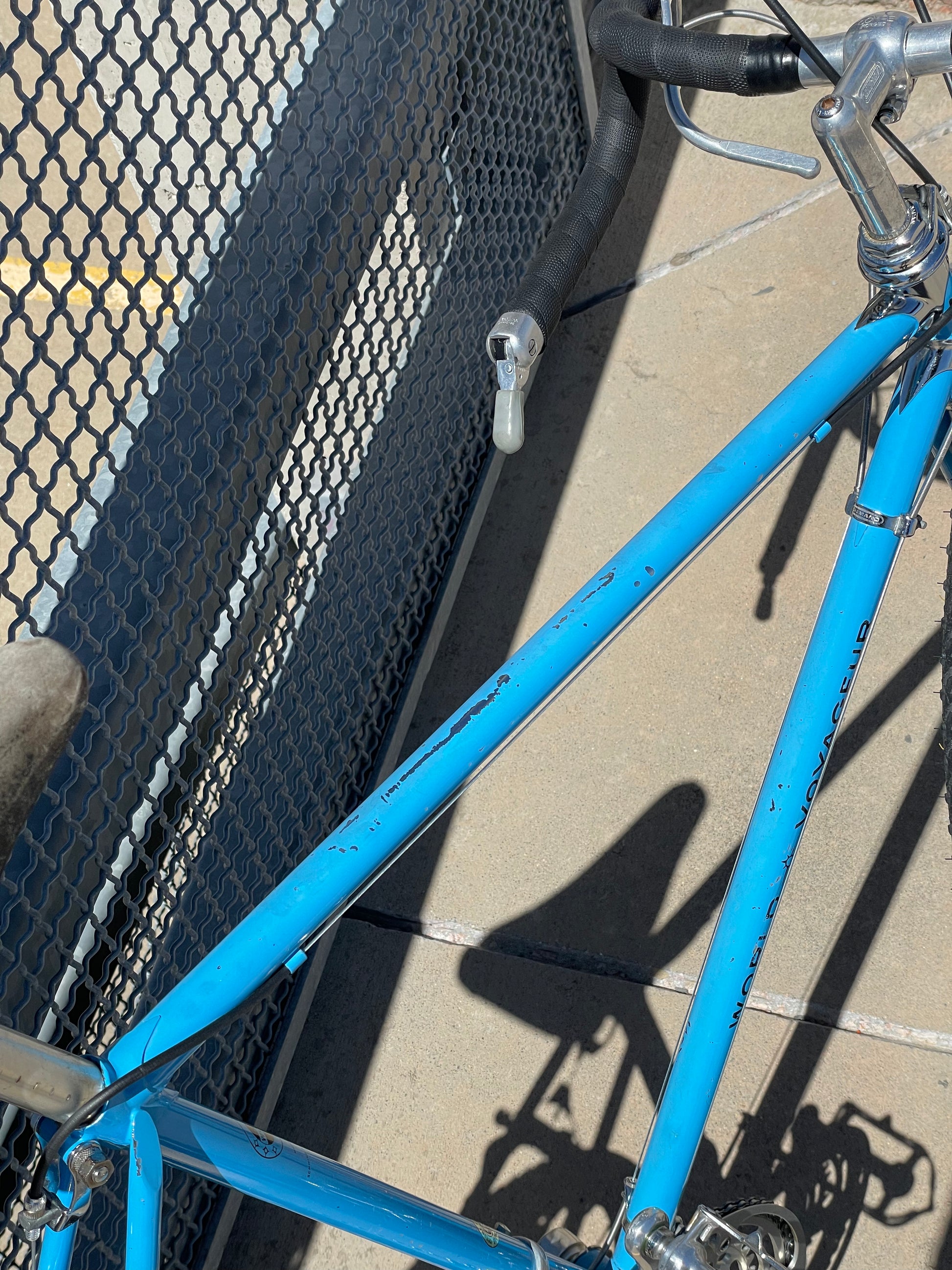 This 1970's Schwinn Voyageur is stunning! The chrome accents with the light blue paint are a match made in heaven. This bike is mostly original! It comes equipped with first gen Dura-Ace and Schwinn Approved parts (Suntour). This bike is in good conndition but shows sign of use. The frame has some paint chips here and there (mostly on the top tube), bur no dents, bends, or cracks. New shift and brake cables have been installed along with new bar tape. It's a beautiful rider that will surly get you compliments while out and about.