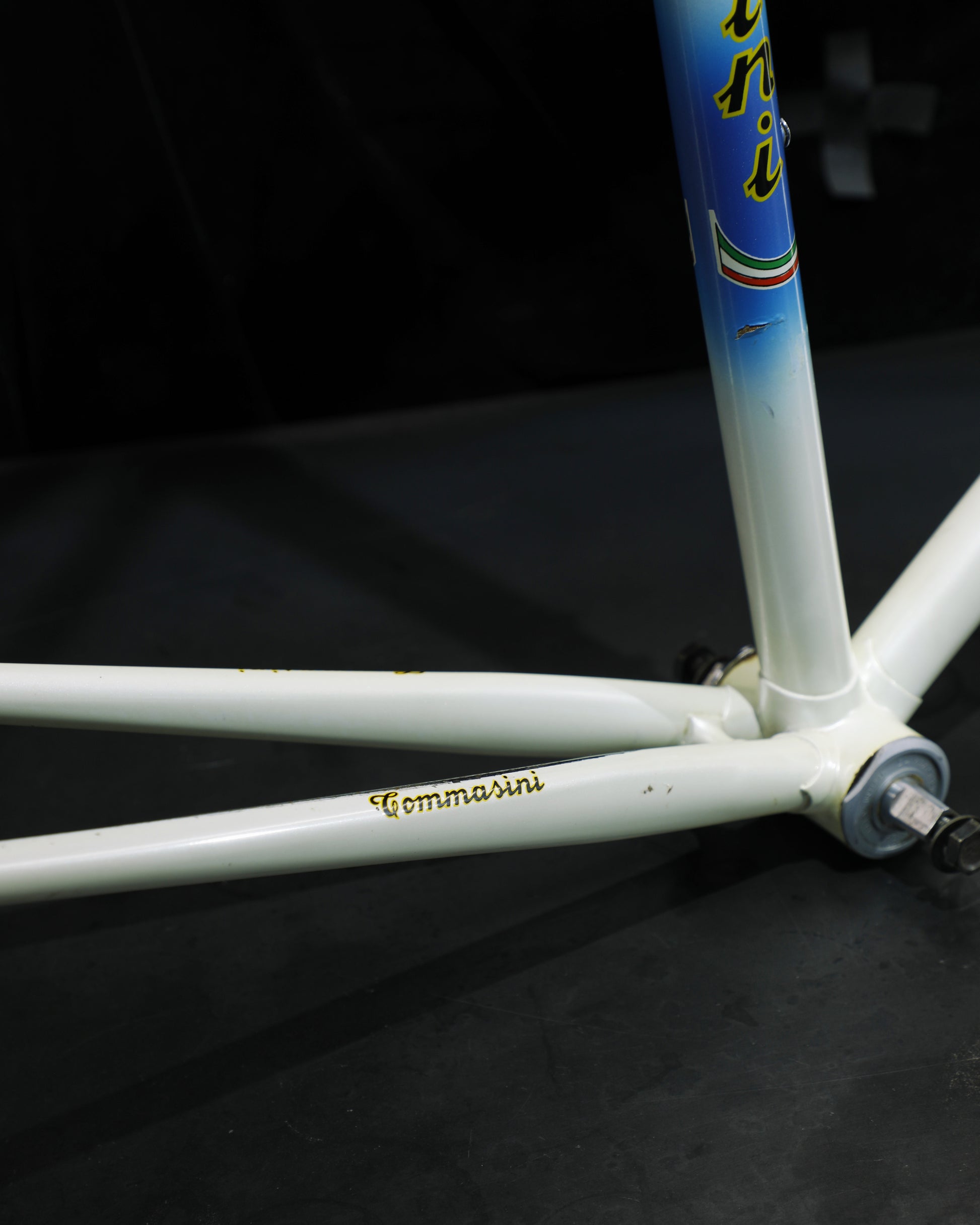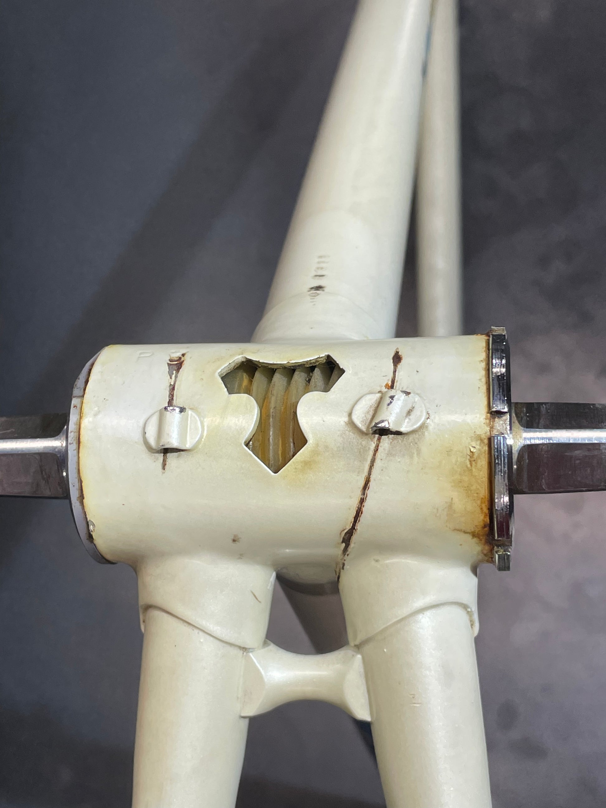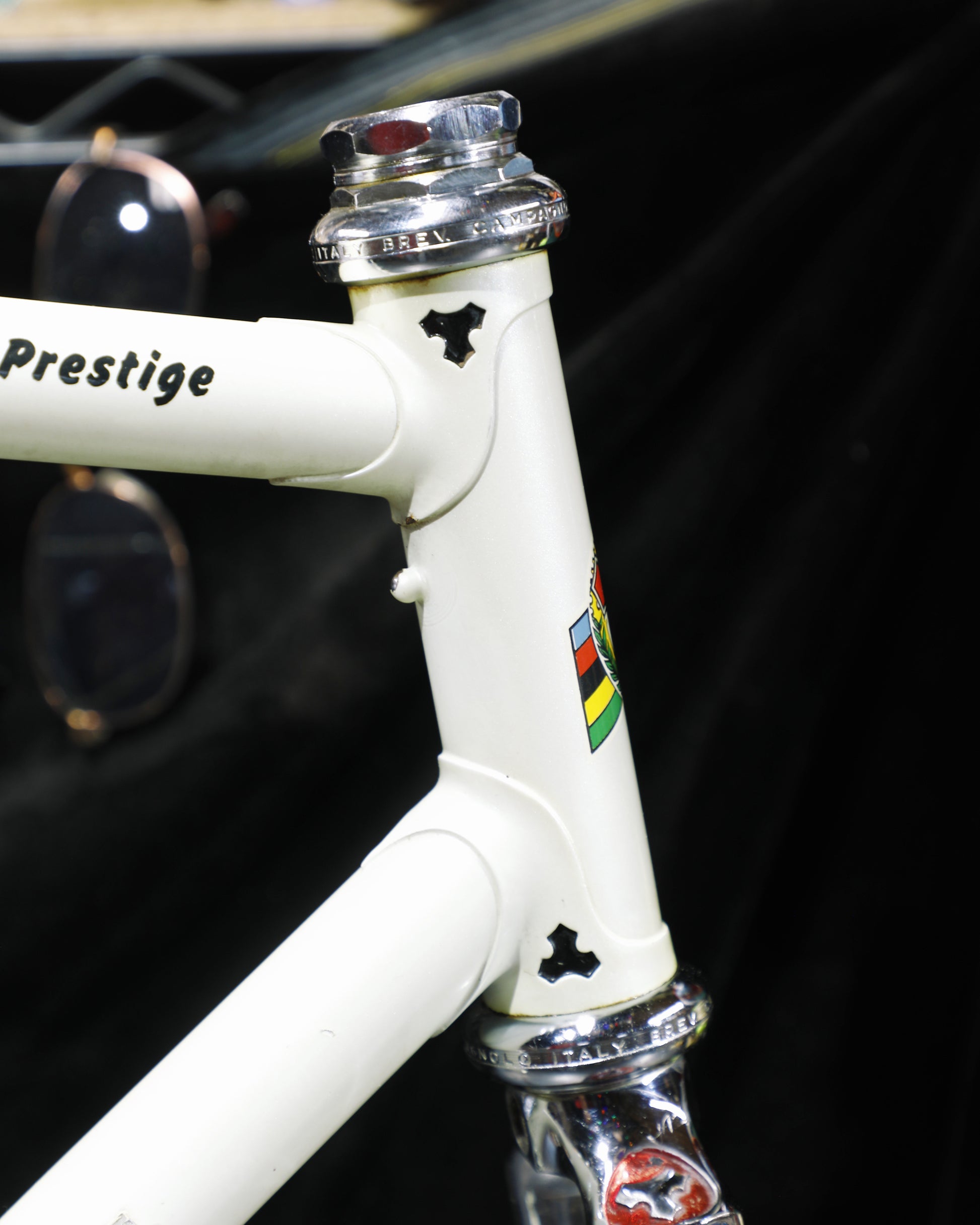 This Prestige frame is in excellent condition but shows some sign of use. There are just a few paint blemishes - no dents, cracks, or bends! It's a stunning frame. Comes with Campagnolo headset and bottom bracket, both of which have not been serviced or taken apart. They both have great feel.