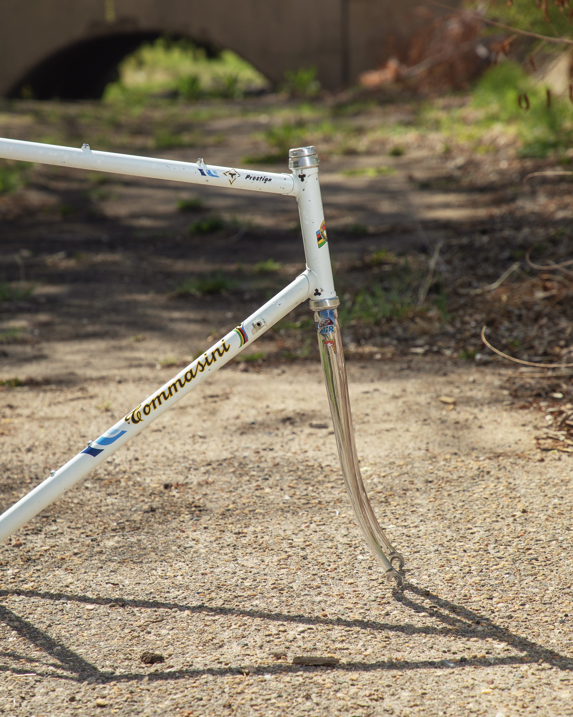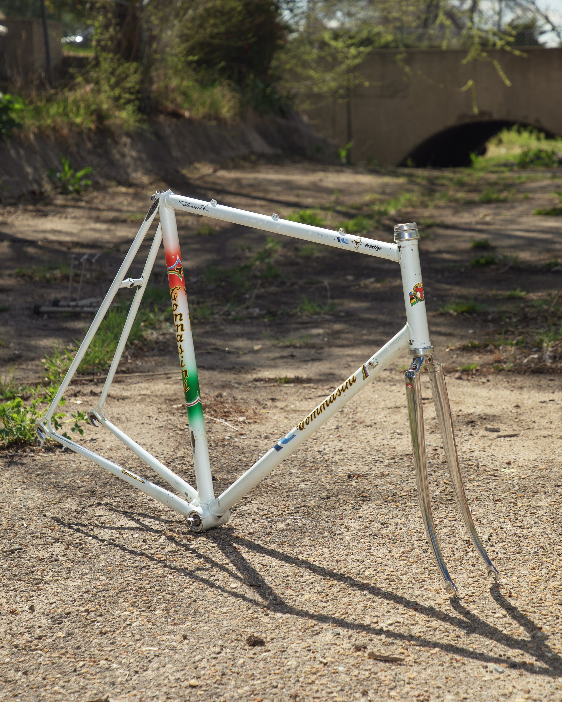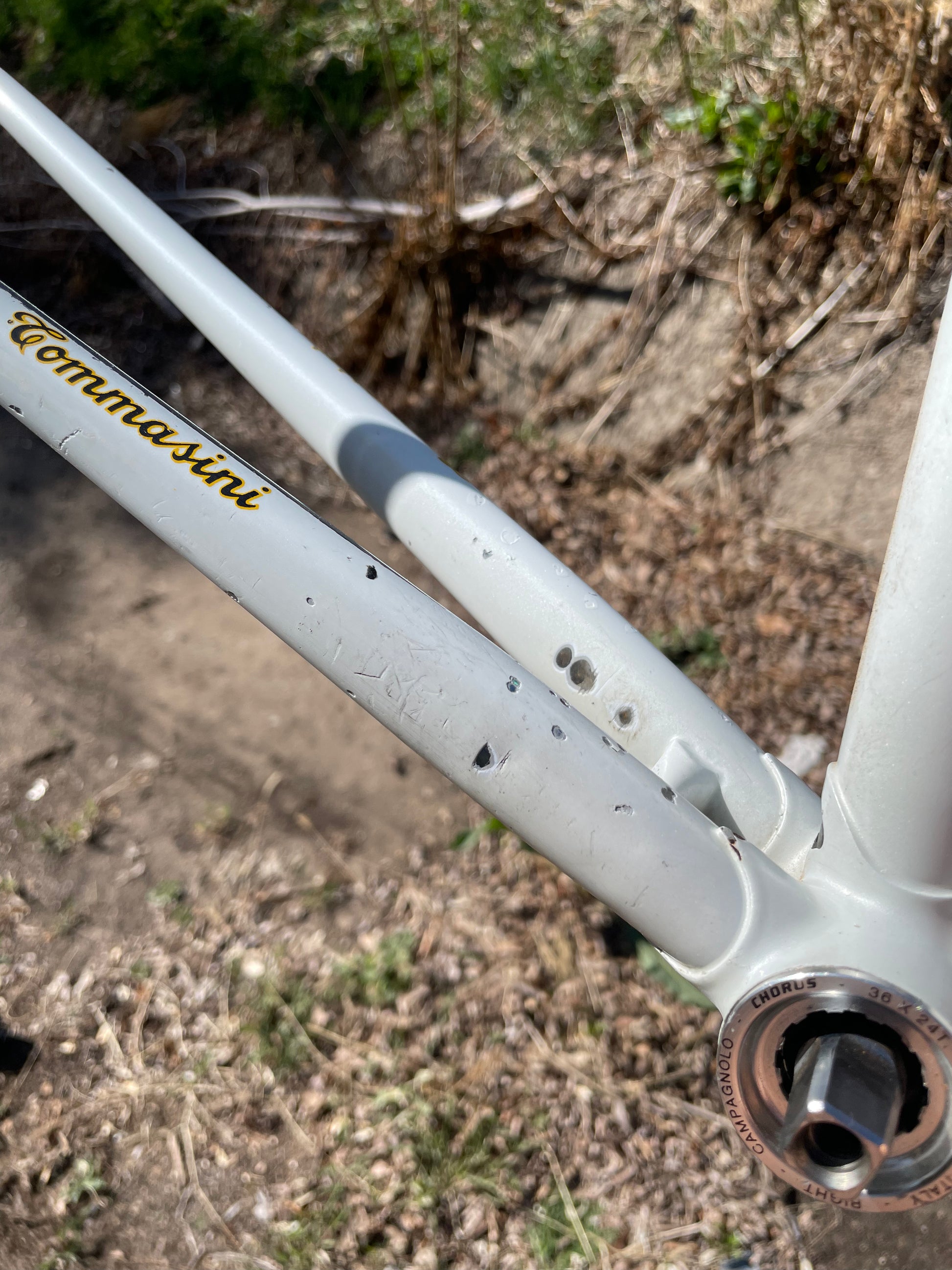 This Tommasini Prestige has been well loved and is looking for a new rider! The paint isn't in great condition. It has a lot of chips, most of which have been touched up by the previous owner. Apart from the condition of the paint, the frame looks great. No dents, bends, or cracks. Comes with a Camapgnolo headset and bottom bracket, both of which have good feel. Be the one to give this frame a second chance!