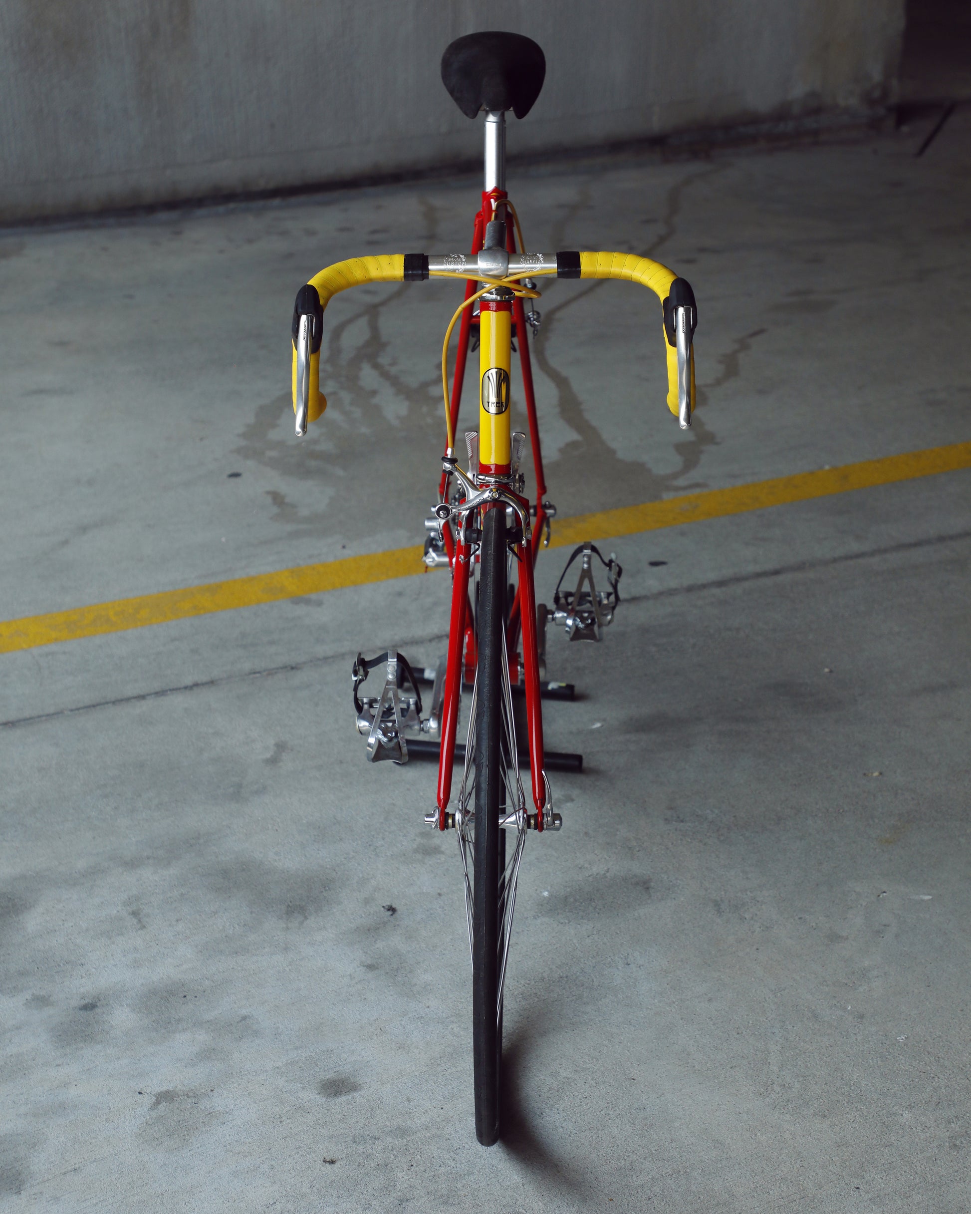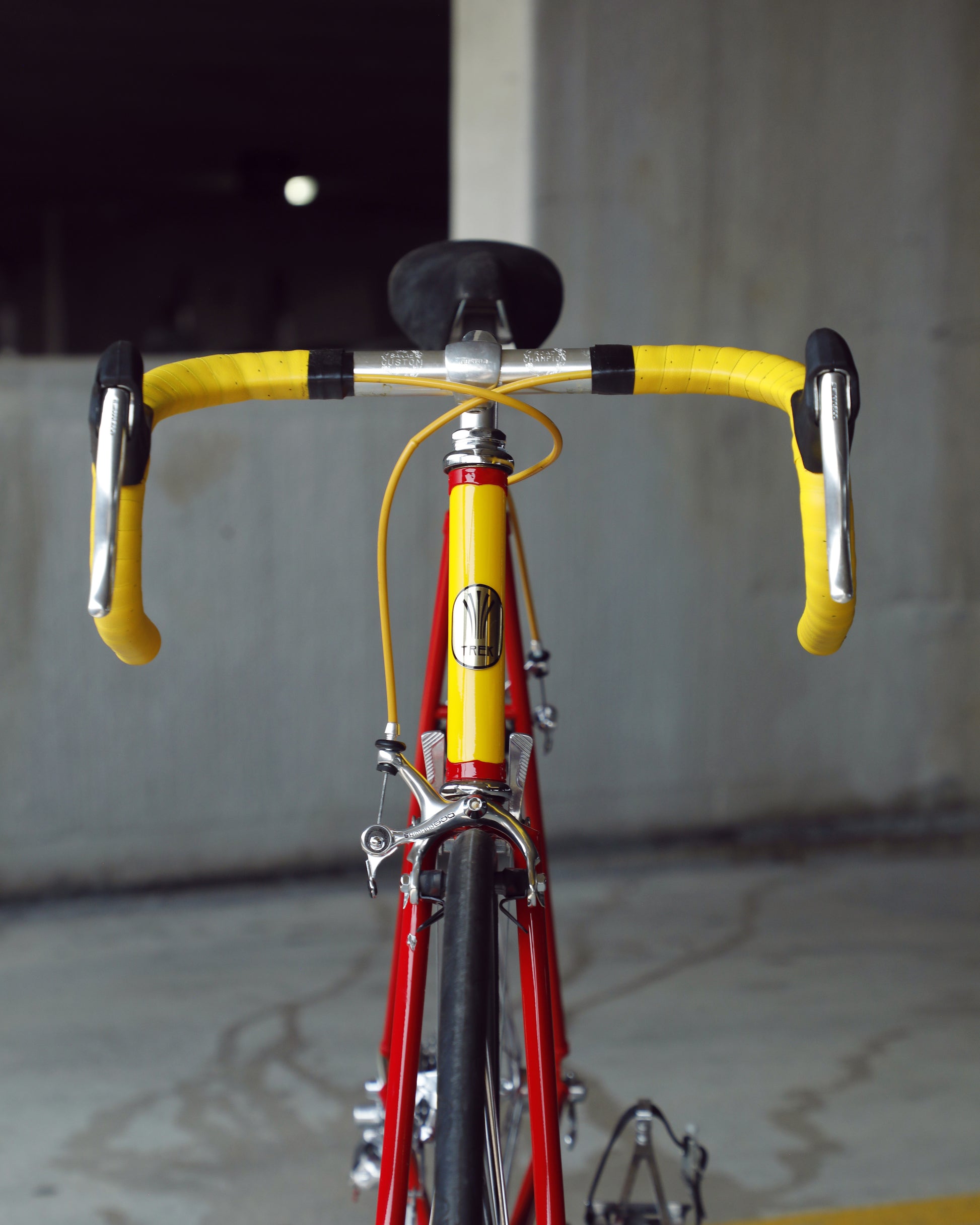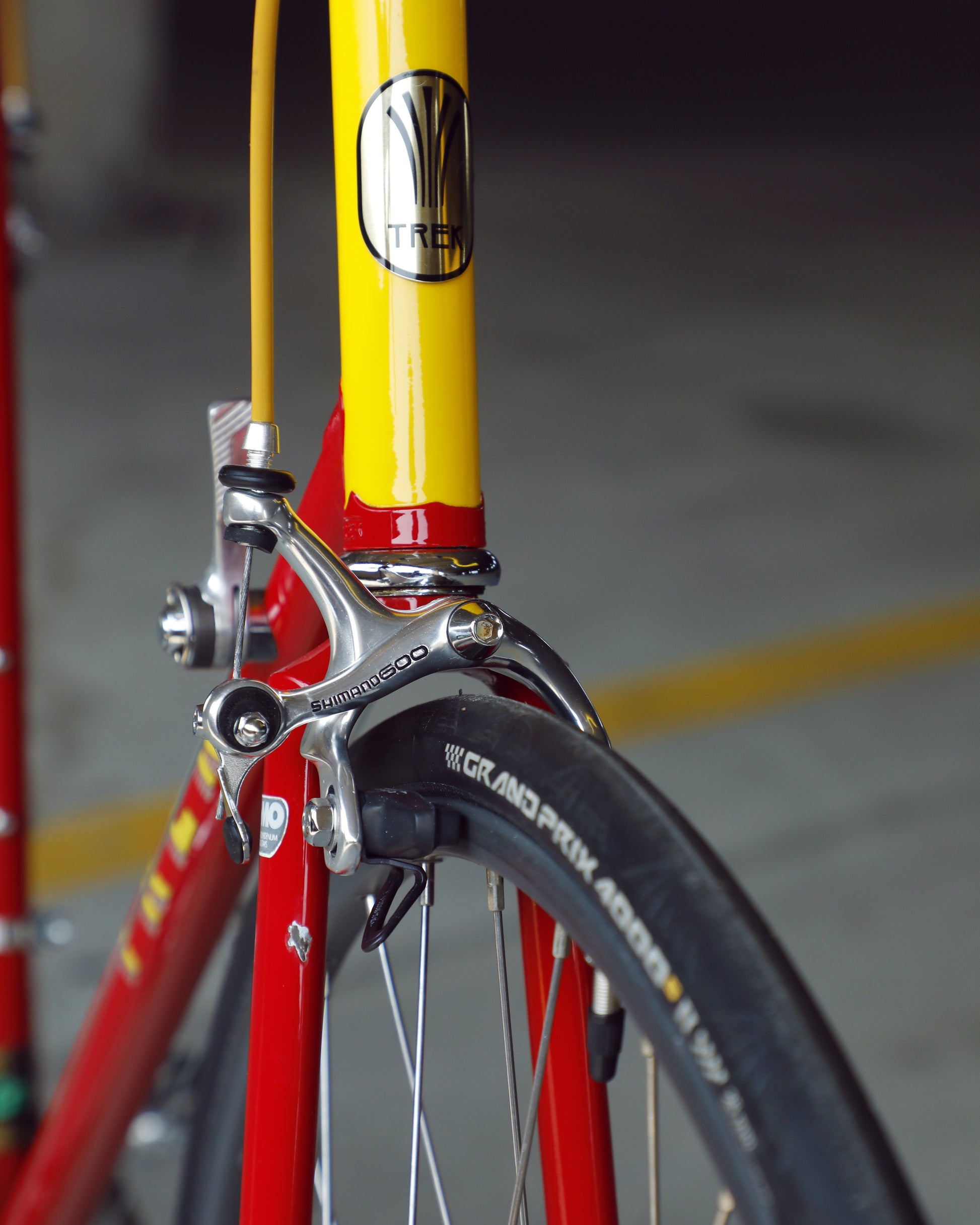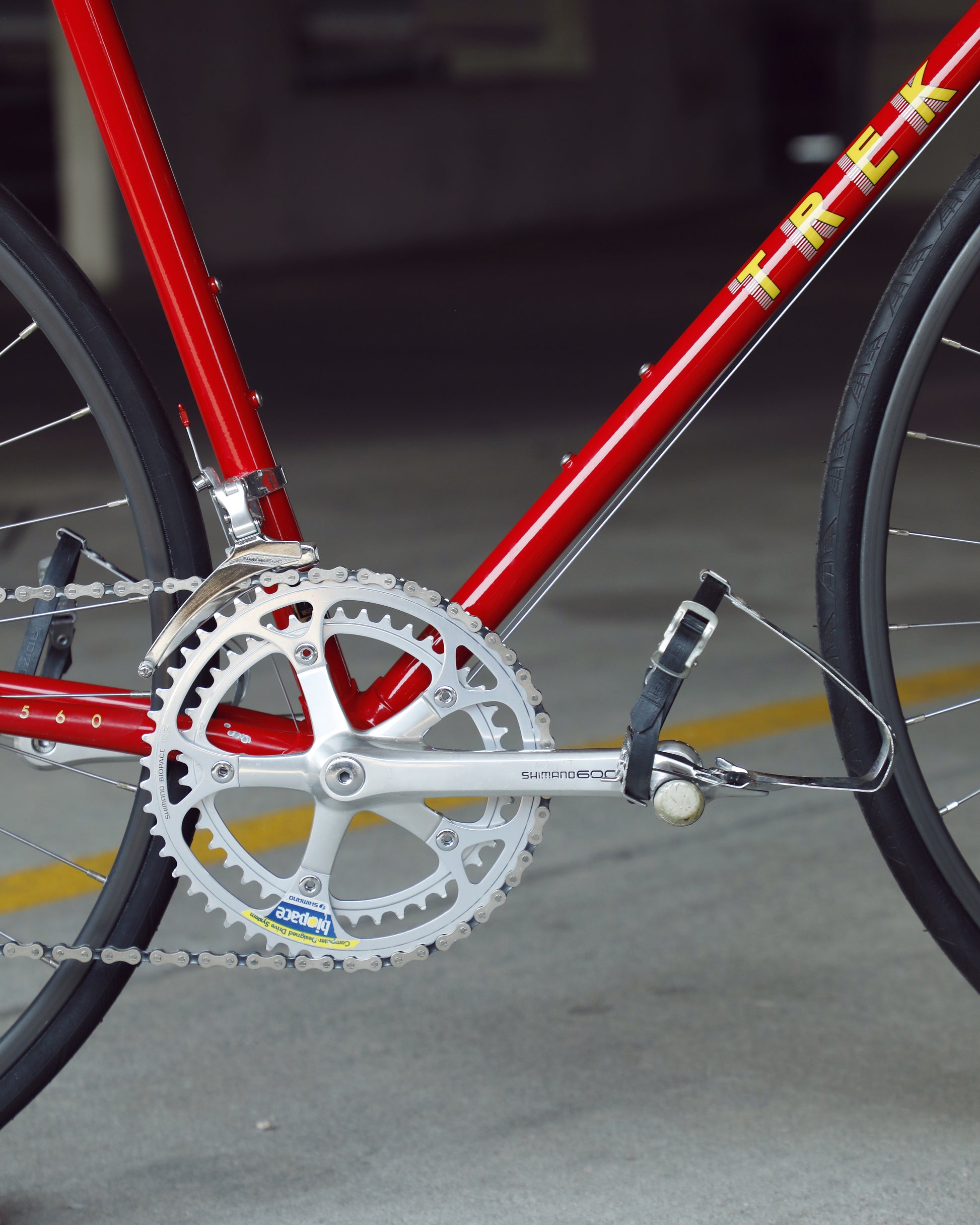 This Trek 560 Pro Series is finished in a very vibrant, ketchup and mustard color combo. It's in excellent condition, but does have a few paint chips here and there. The bartape is original but has been cleaned and the brake hoods have been replaced (the right hood has a small tear in it as the rubber is pretty soft). The saddle shows no sign of a crash and the Shimano 600 sis group is in excellent condition. The grease in the pedals is also very stick and I would recommend a quick rebuild if you plan to use them. The tires are also a mismatch set. It's dialed and ready to be enjoyed!