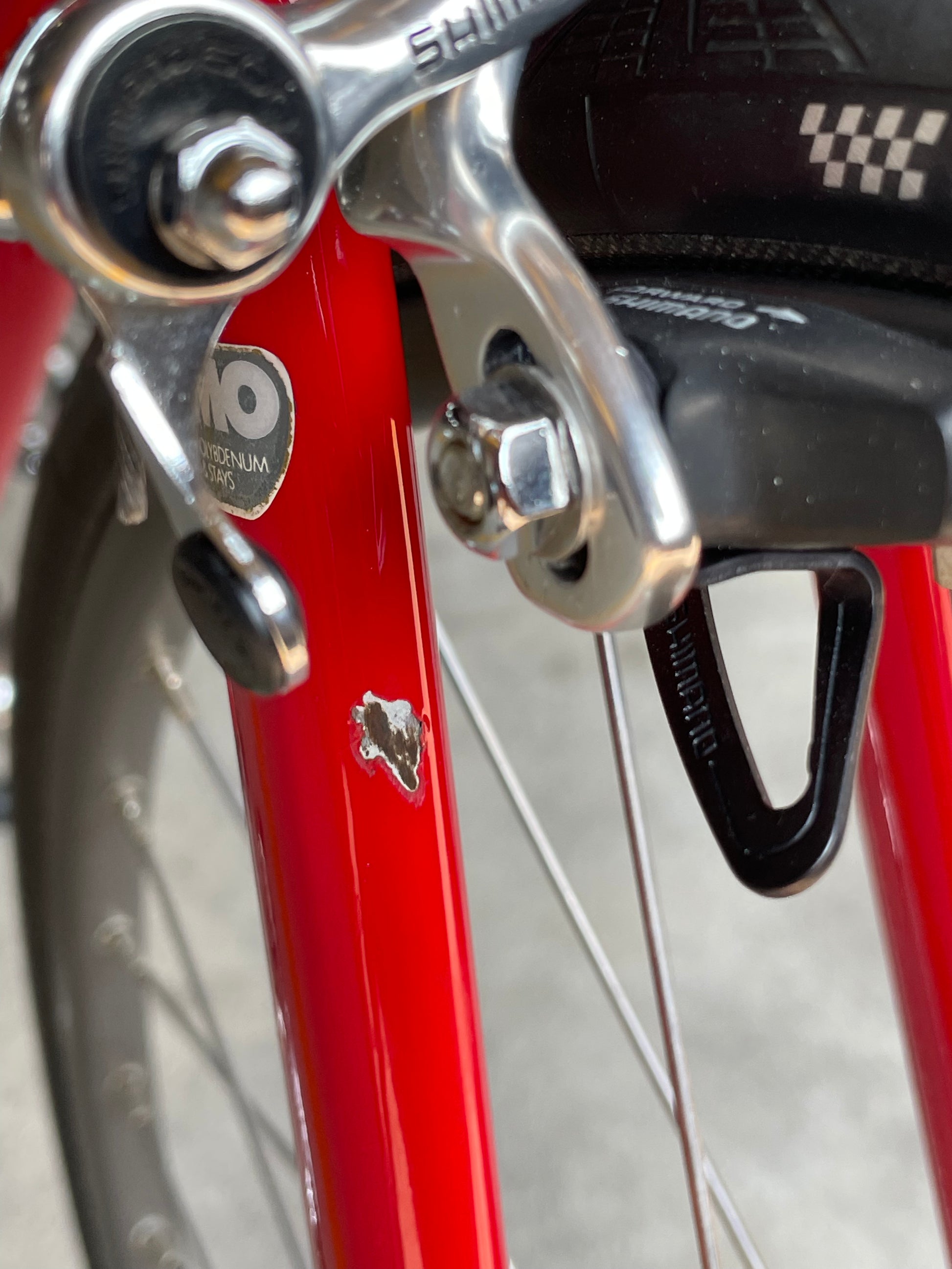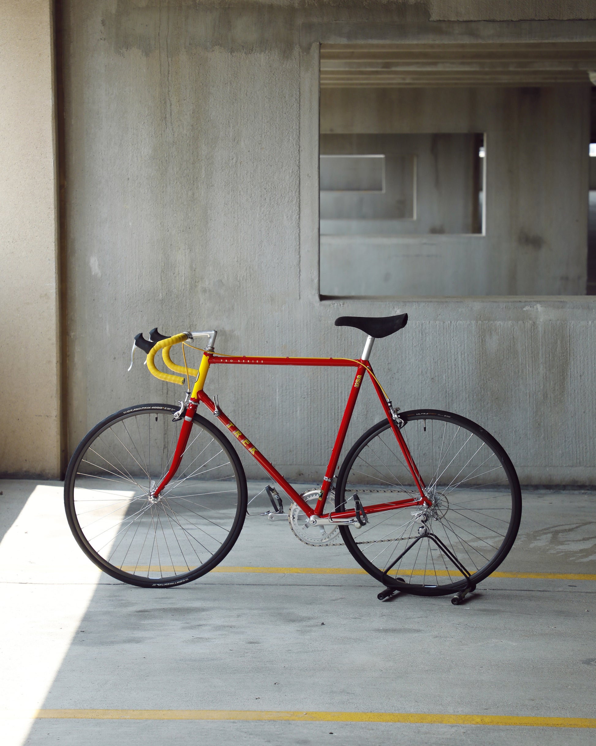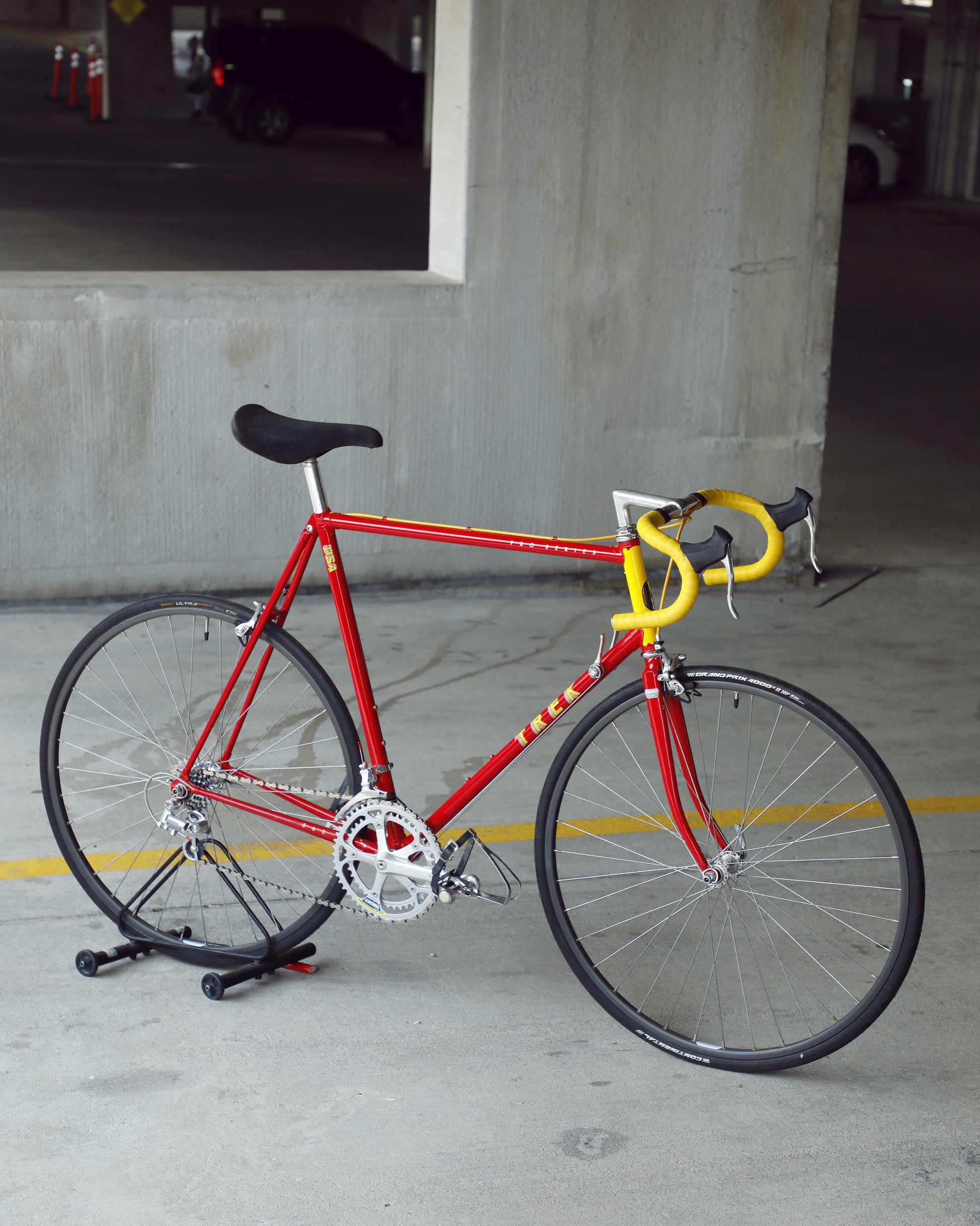 This Trek 560 Pro Series is finished in a very vibrant, ketchup and mustard color combo. It's in excellent condition, but does have a few paint chips here and there. The bartape is original but has been cleaned and the brake hoods have been replaced (the right hood has a small tear in it as the rubber is pretty soft). The saddle shows no sign of a crash and the Shimano 600 sis group is in excellent condition. The grease in the pedals is also very stick and I would recommend a quick rebuild if you plan to use them. The tires are also a mismatch set. It's dialed and ready to be enjoyed!