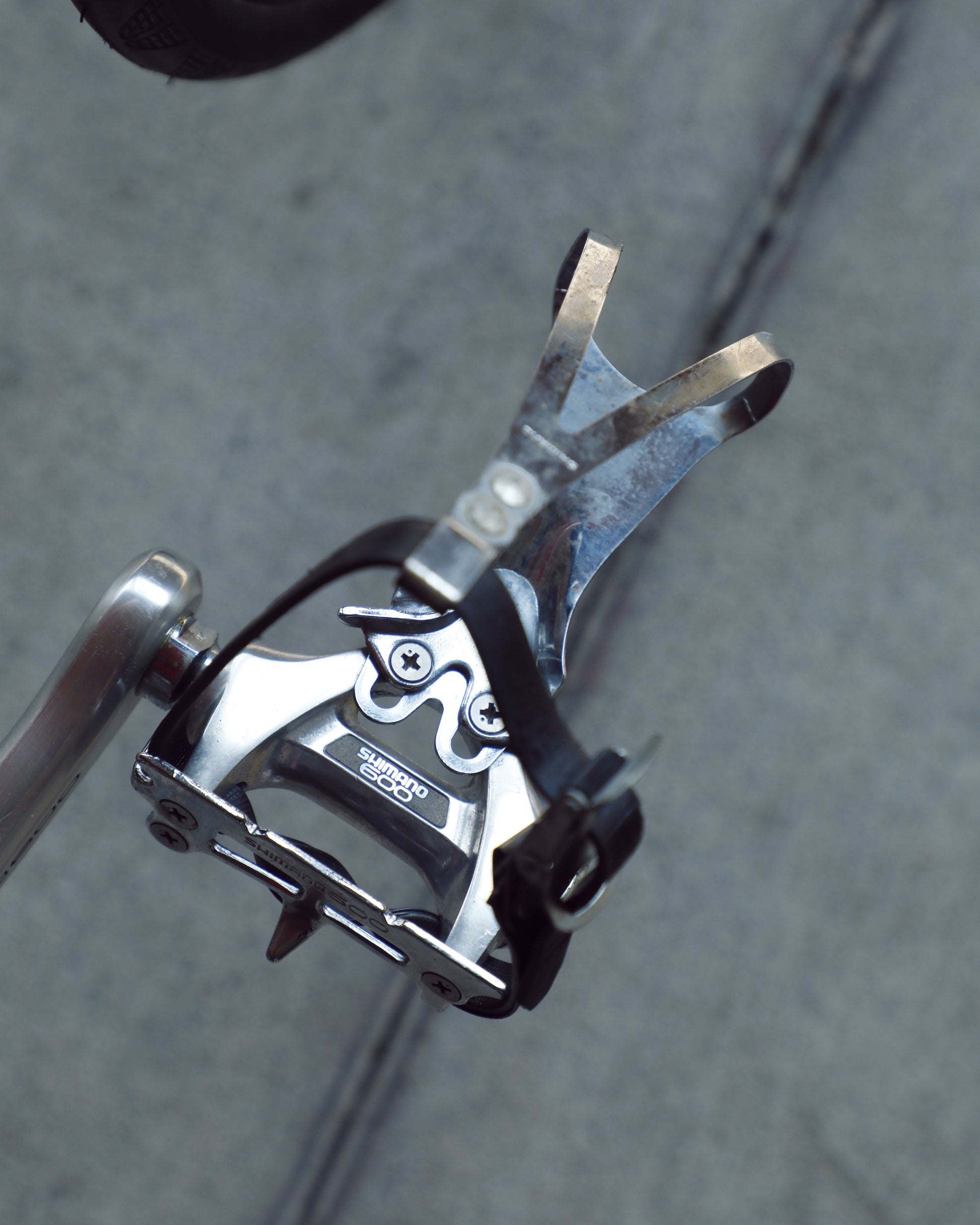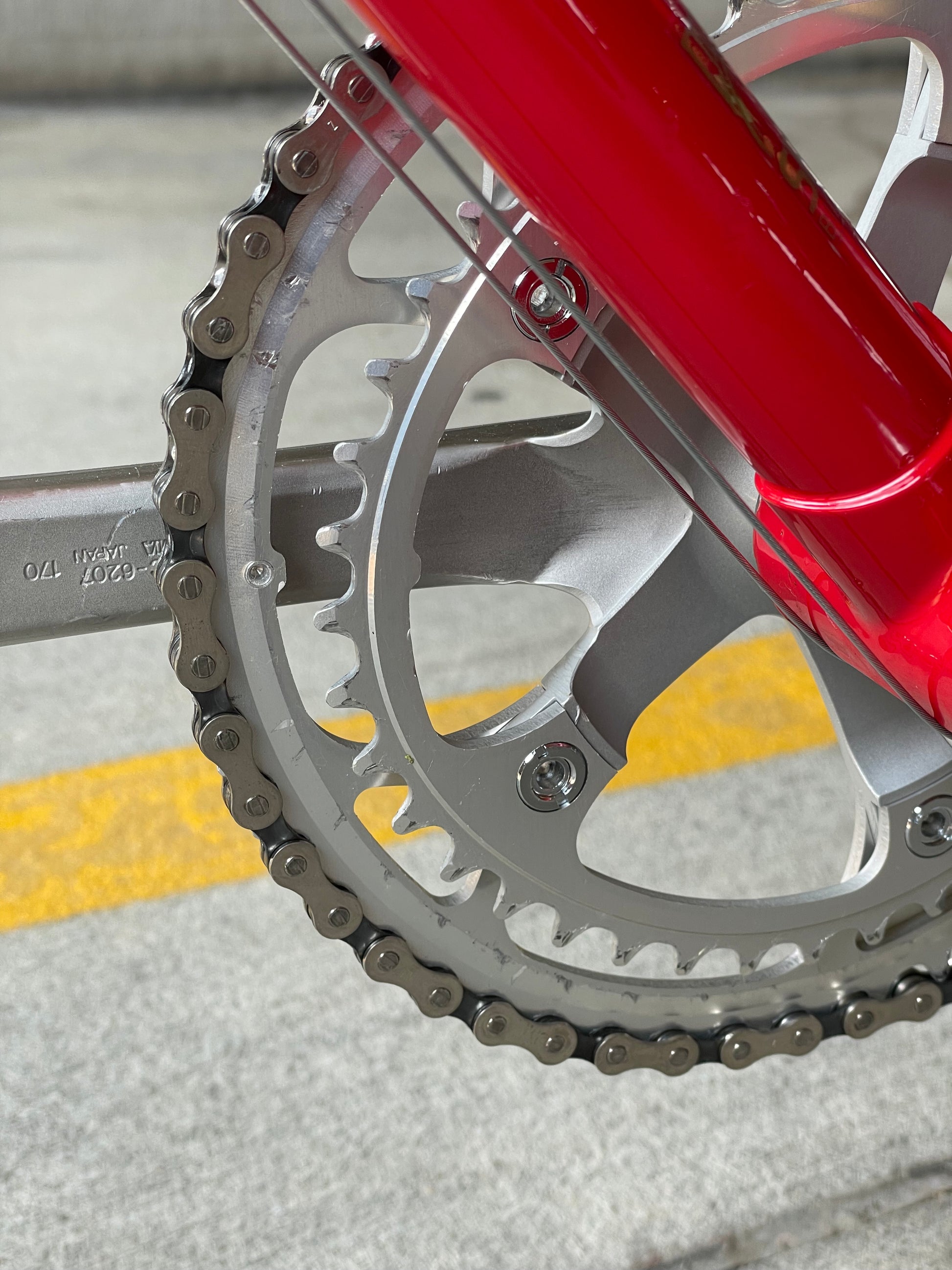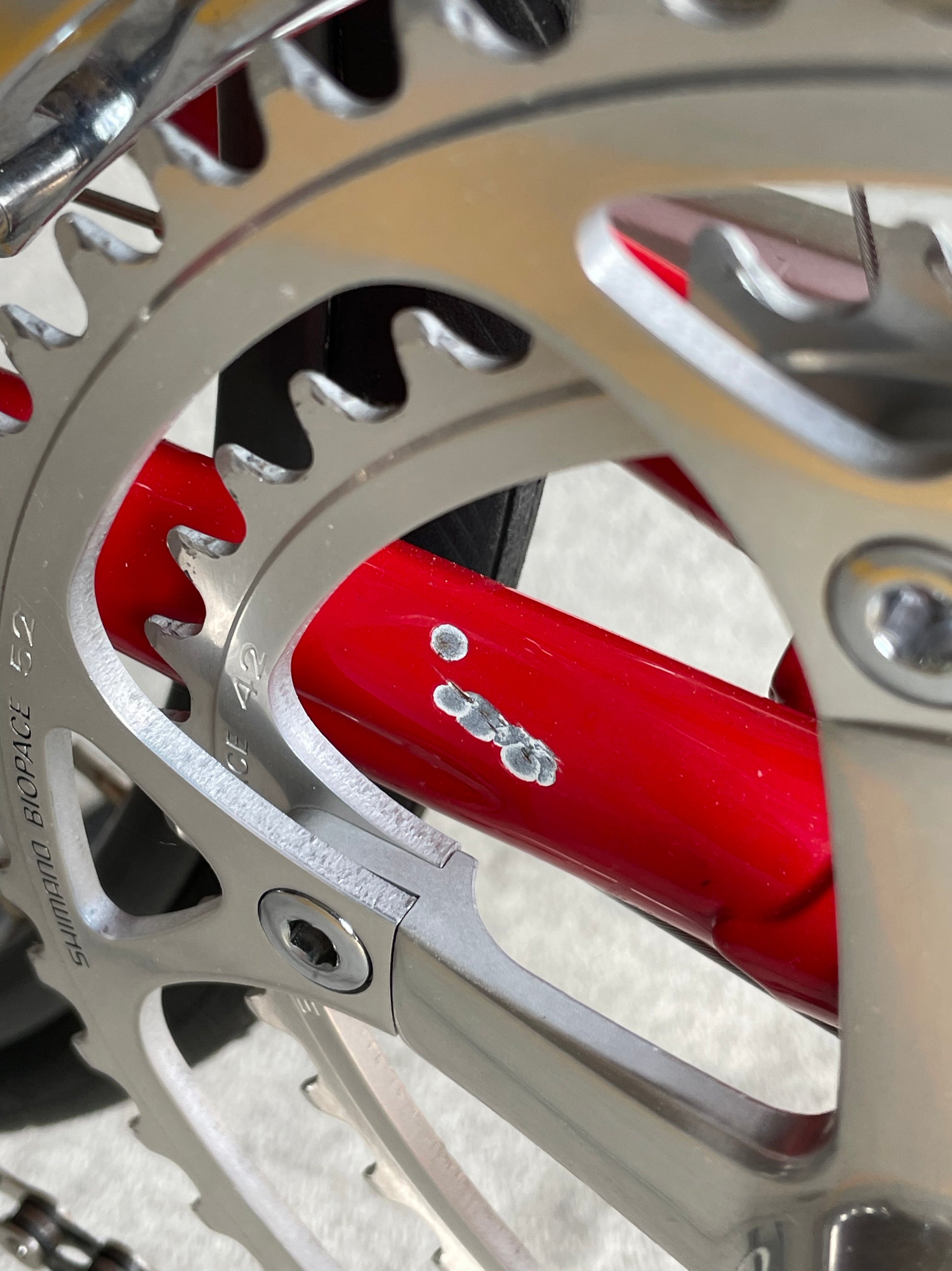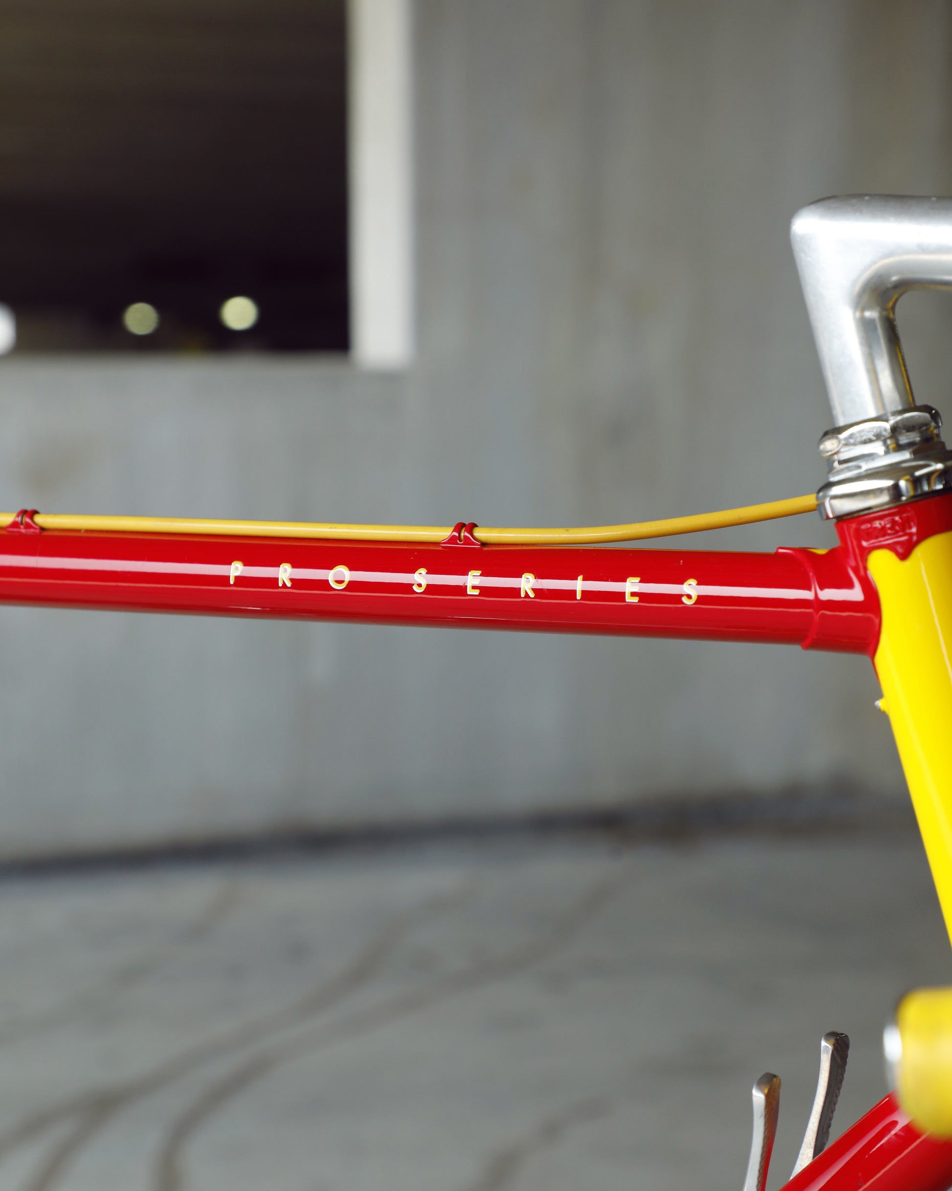 This Trek 560 Pro Series is finished in a very vibrant, ketchup and mustard color combo. It's in excellent condition, but does have a few paint chips here and there. The bartape is original but has been cleaned and the brake hoods have been replaced (the right hood has a small tear in it as the rubber is pretty soft). The saddle shows no sign of a crash and the Shimano 600 sis group is in excellent condition. The grease in the pedals is also very stick and I would recommend a quick rebuild if you plan to use them. The tires are also a mismatch set. It's dialed and ready to be enjoyed!